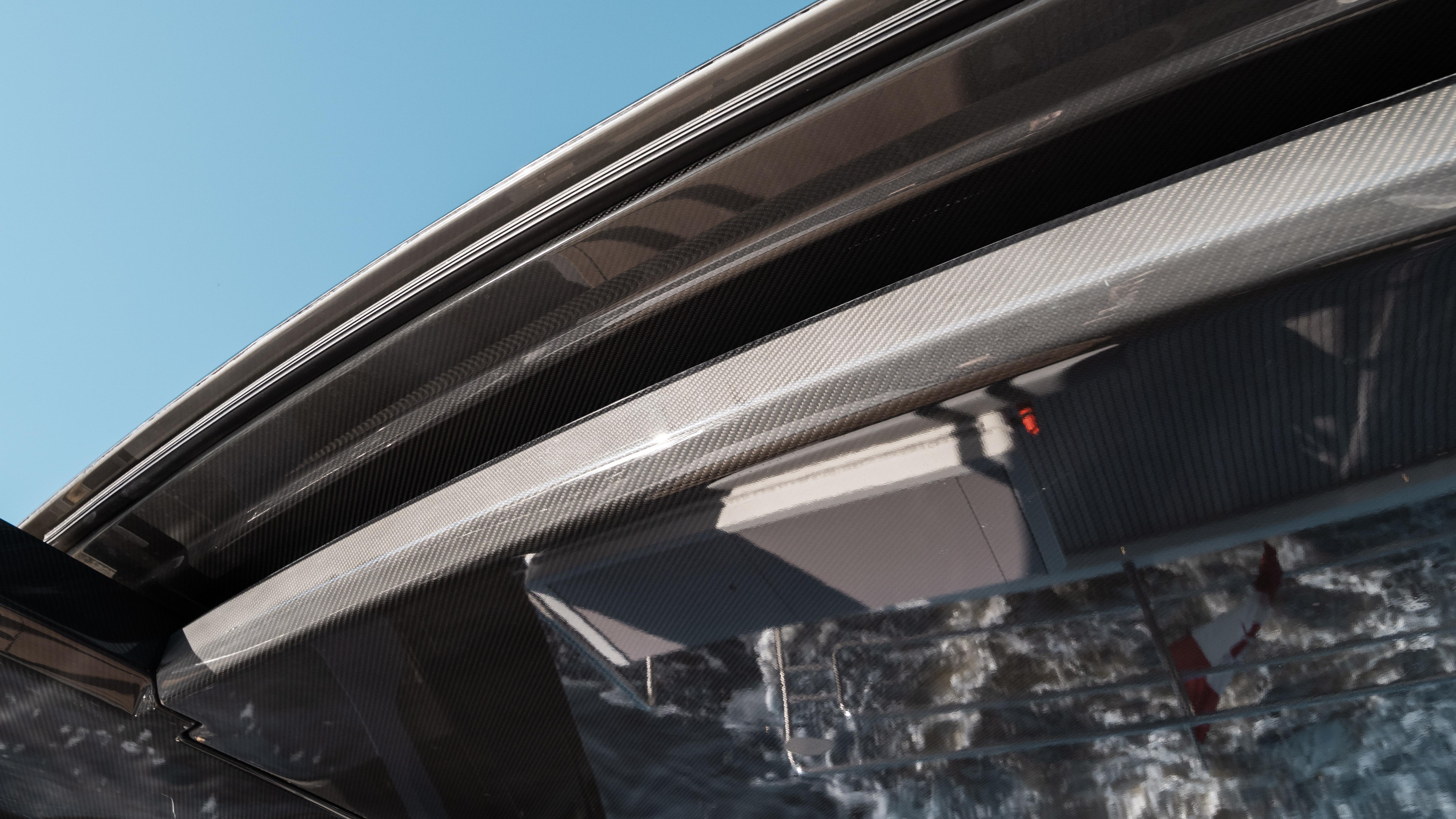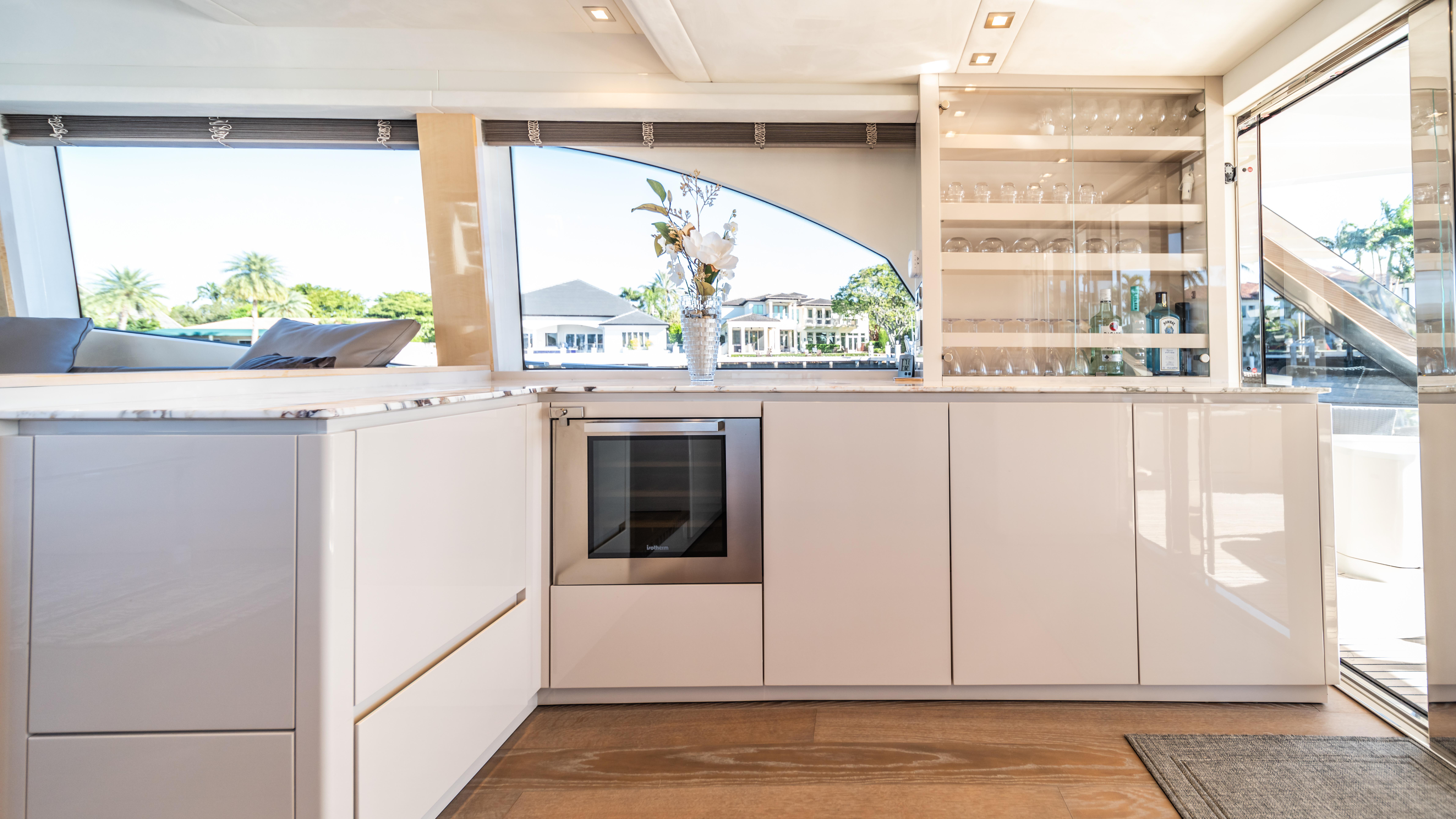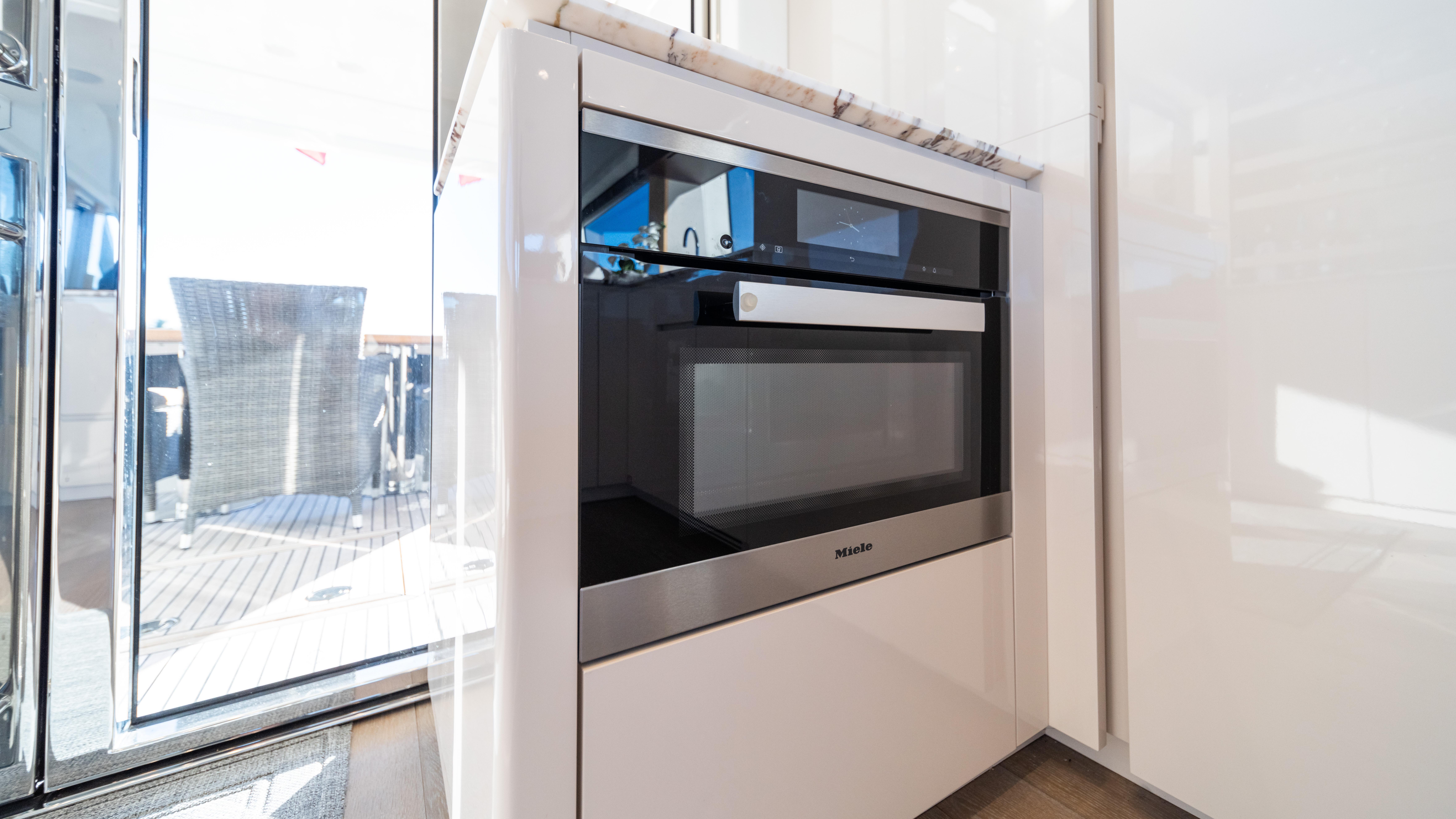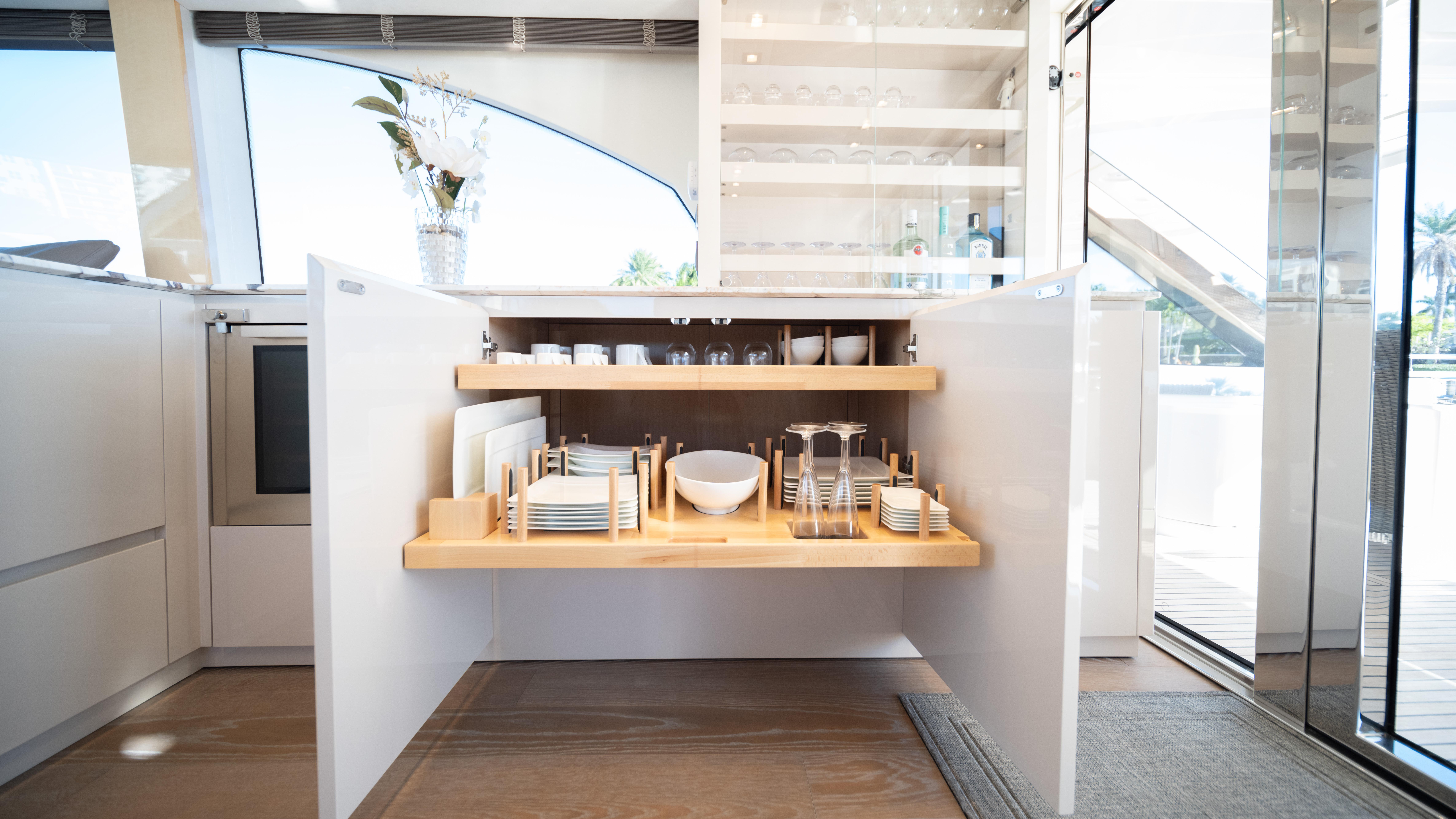 The bulwarks’ wide breaches enable a significant increase in terms of internal volumes and exposure to light. This is particularly highlighted on the main deck where the saloon presents an open space in between the galley aft and the living area located forward.