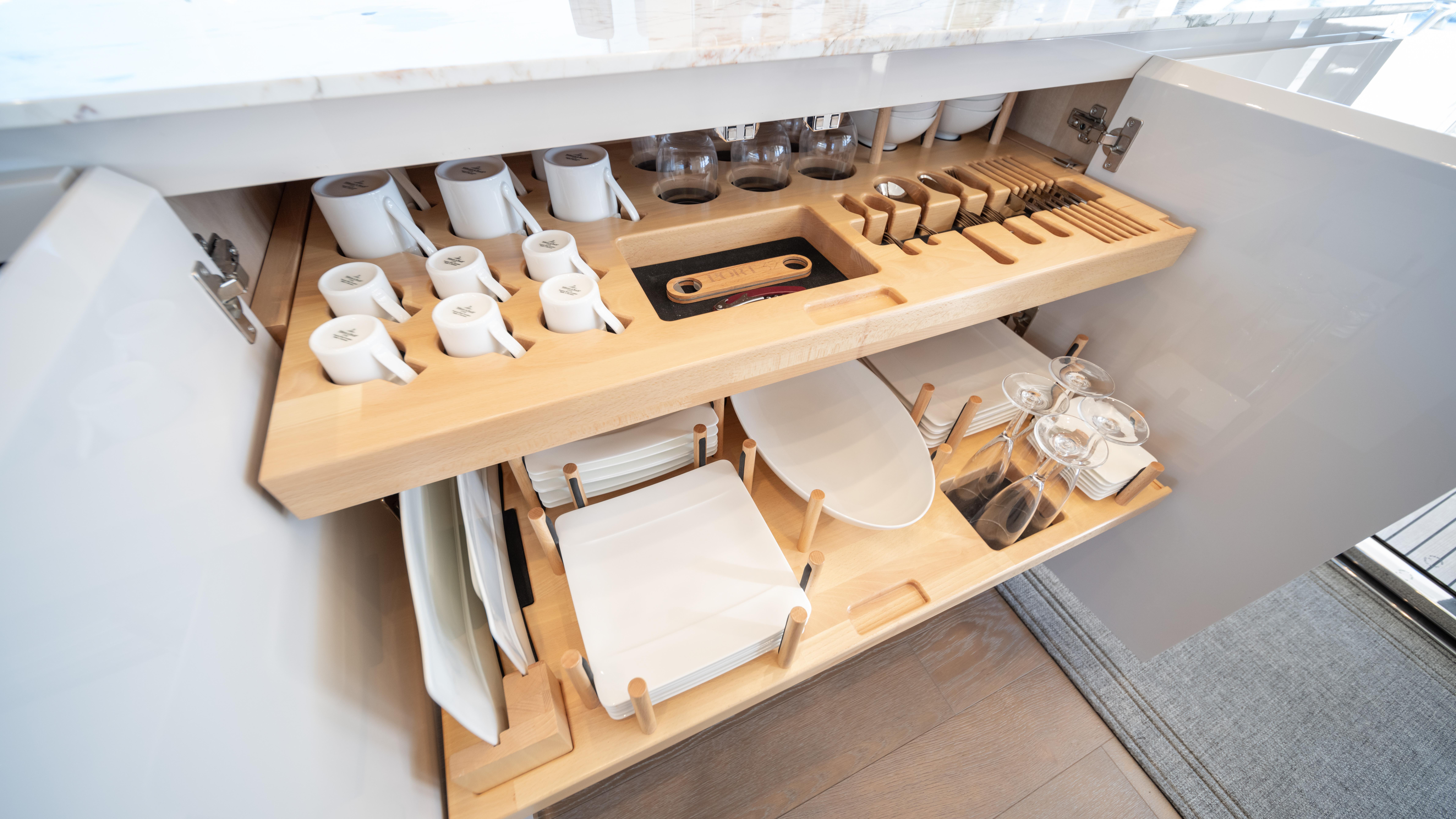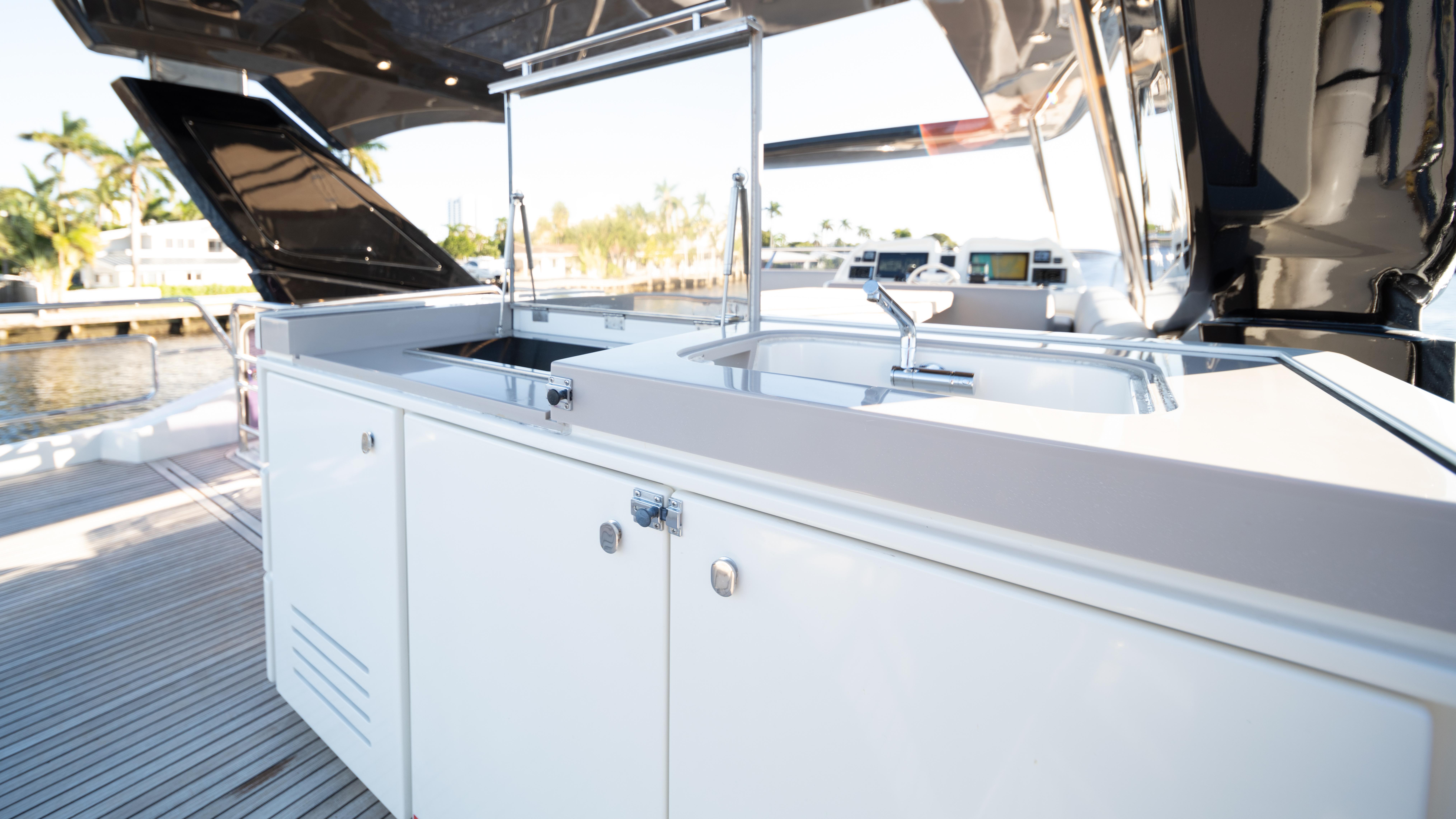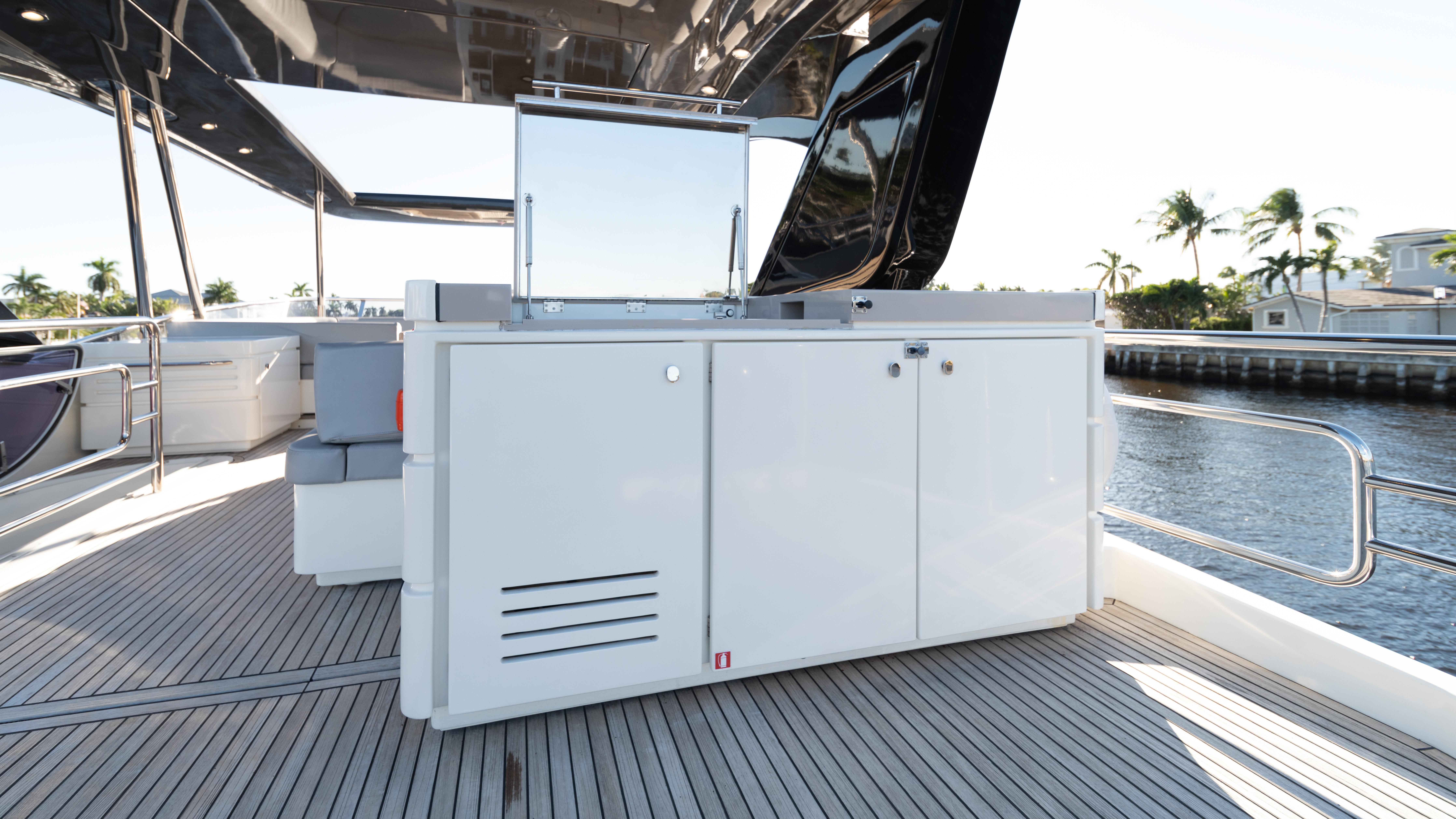 The bulwarks’ wide breaches enable a significant increase in terms of internal volumes and exposure to light. This is particularly highlighted on the main deck where the saloon presents an open space in between the galley aft and the living area located forward.