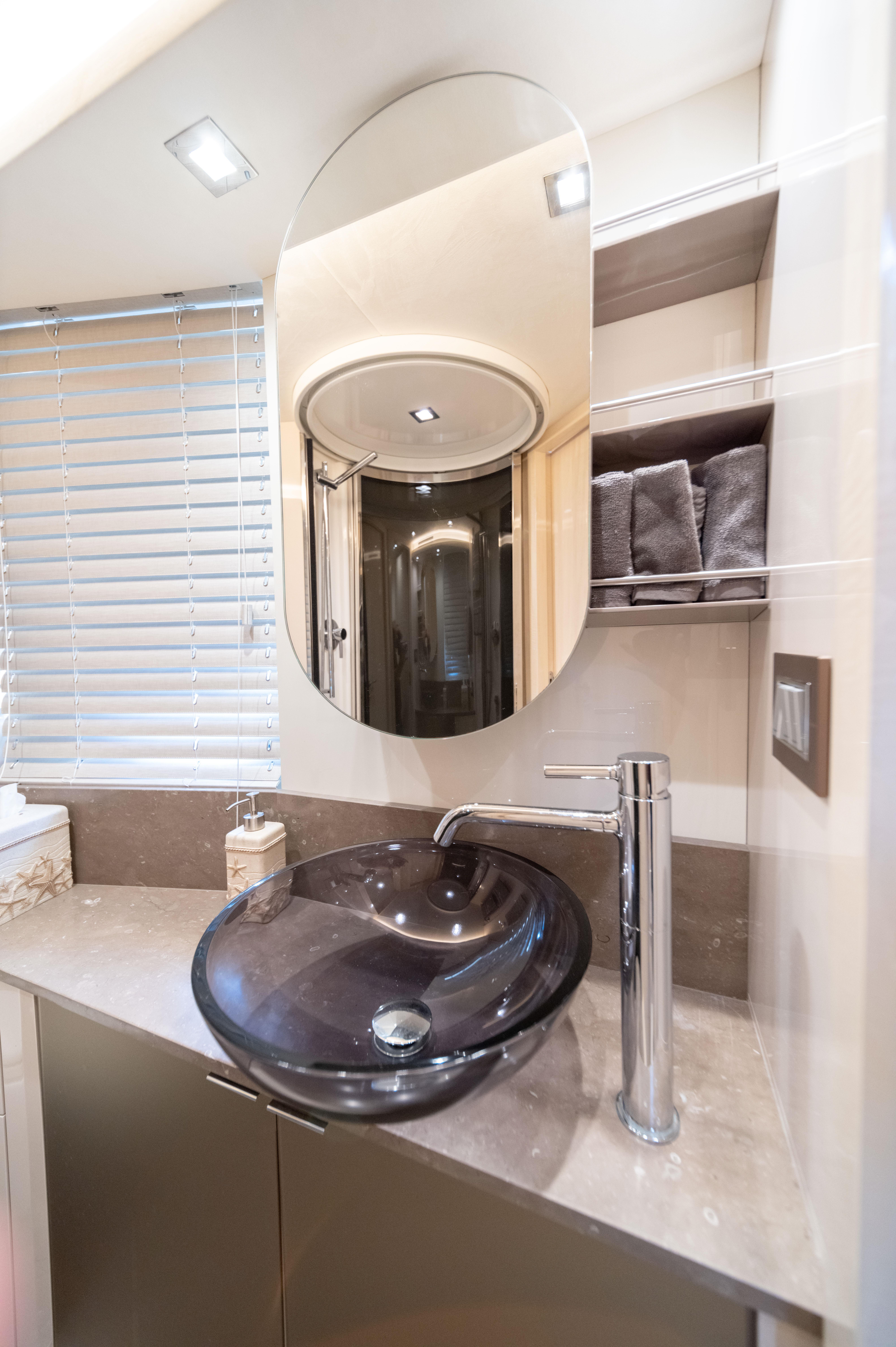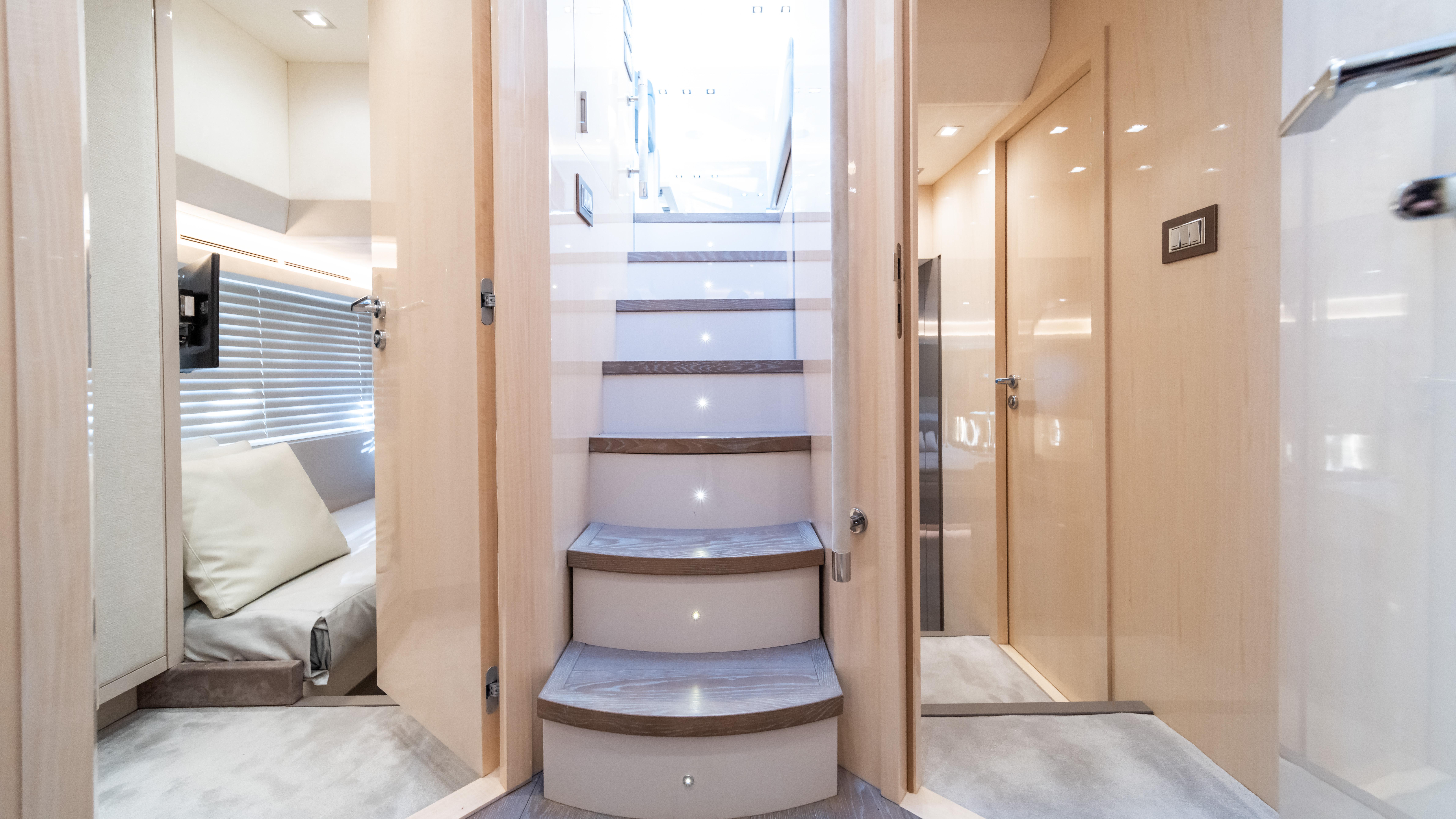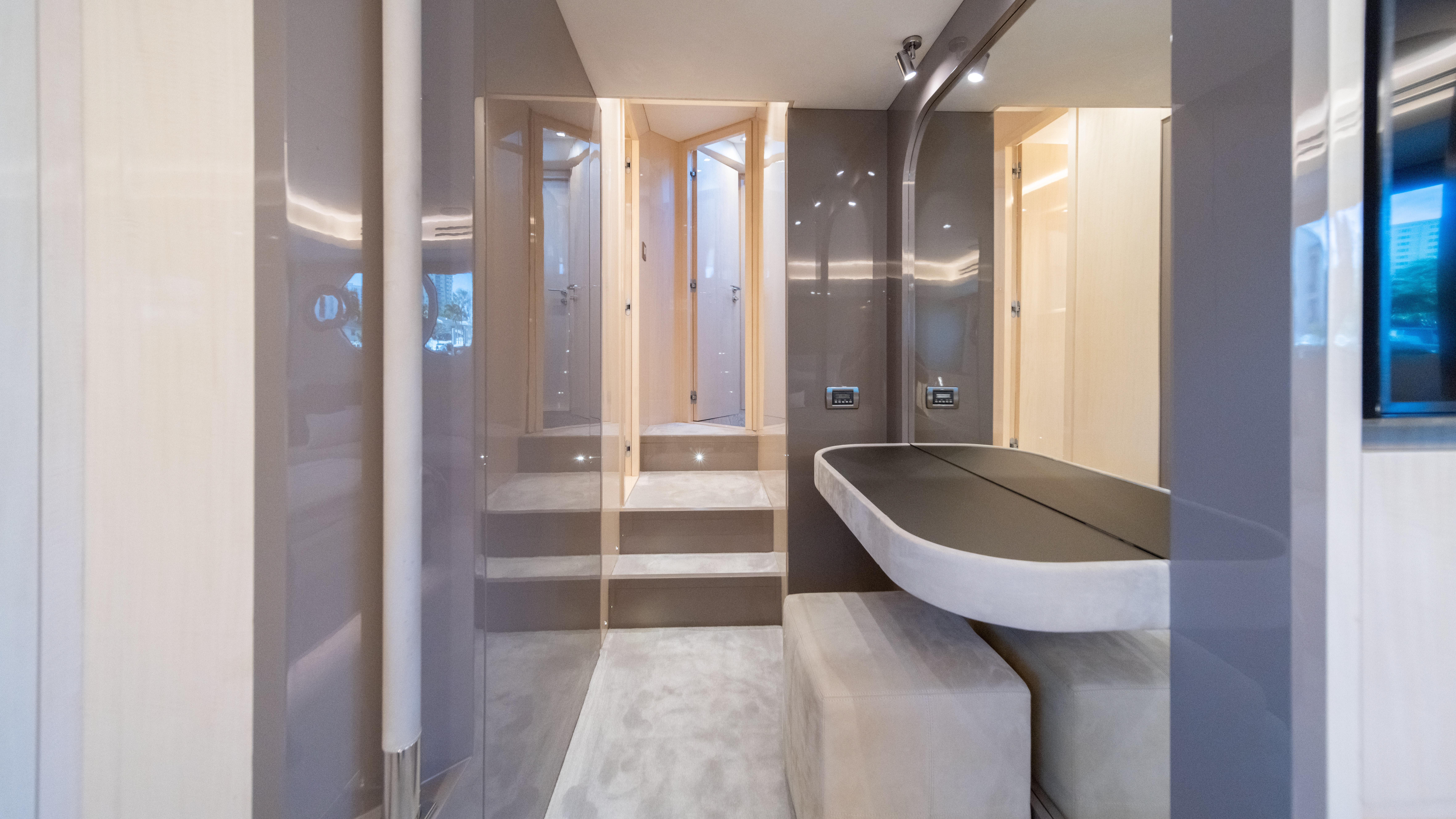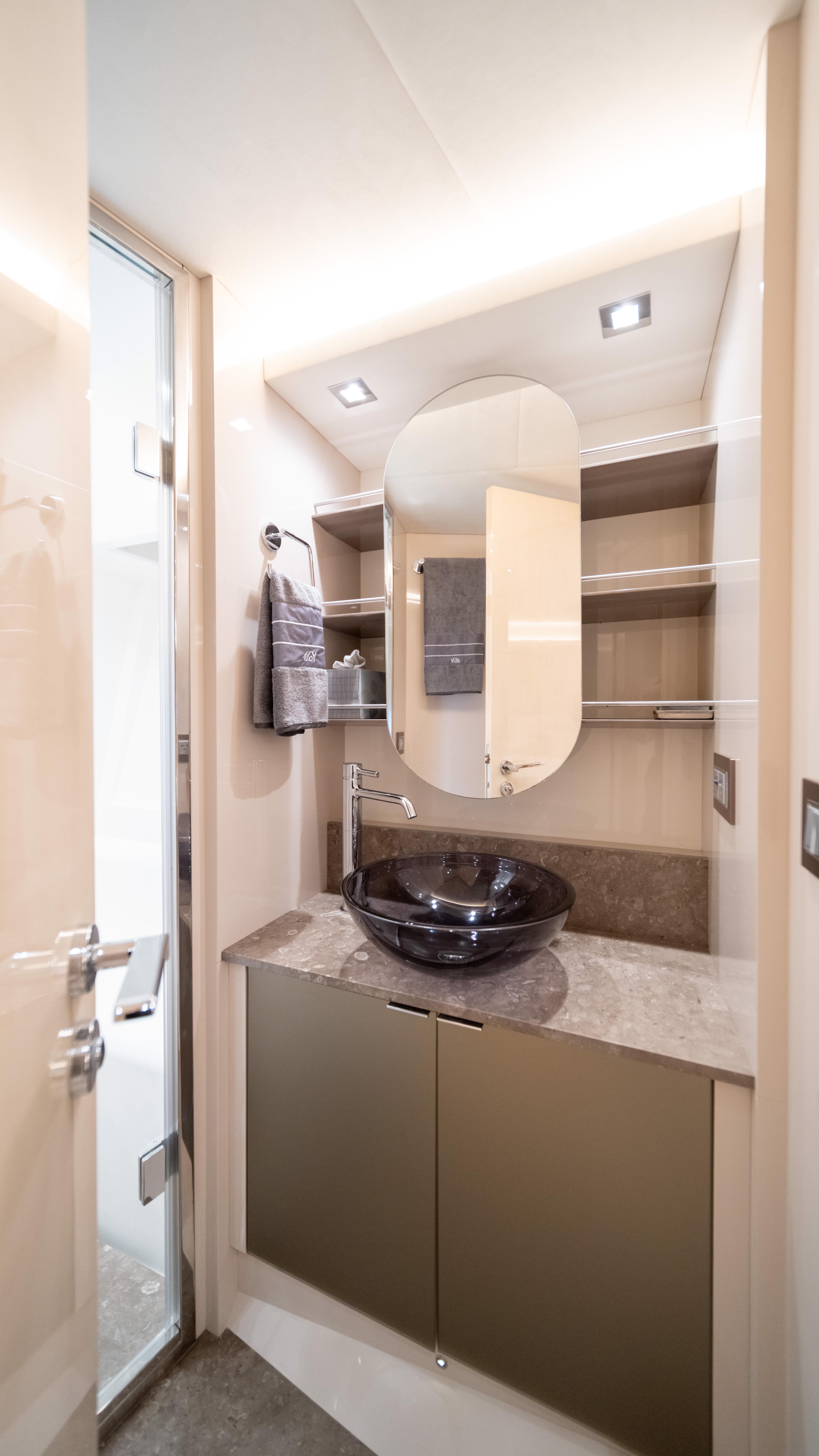 The MCY 66’s unique and sophisticated modern decor is a striking feature throughout the main saloon and all the cabins. High-end fabrics, natural stones and Italian leathers are just a few of the superior materials available on this yacht. Elegant glossy marble elements enriched by a light touch of copper are key defining features of the new MCY 66 interior design. The use of reflective materials, mirrors and lacquered wood, in combination with wide lateral windows enhance the brightness of natural light. In order to satisfy the owner’s needs and wishes, Monte Carlo Yachts offers complete customization of all interior design and layout features.
