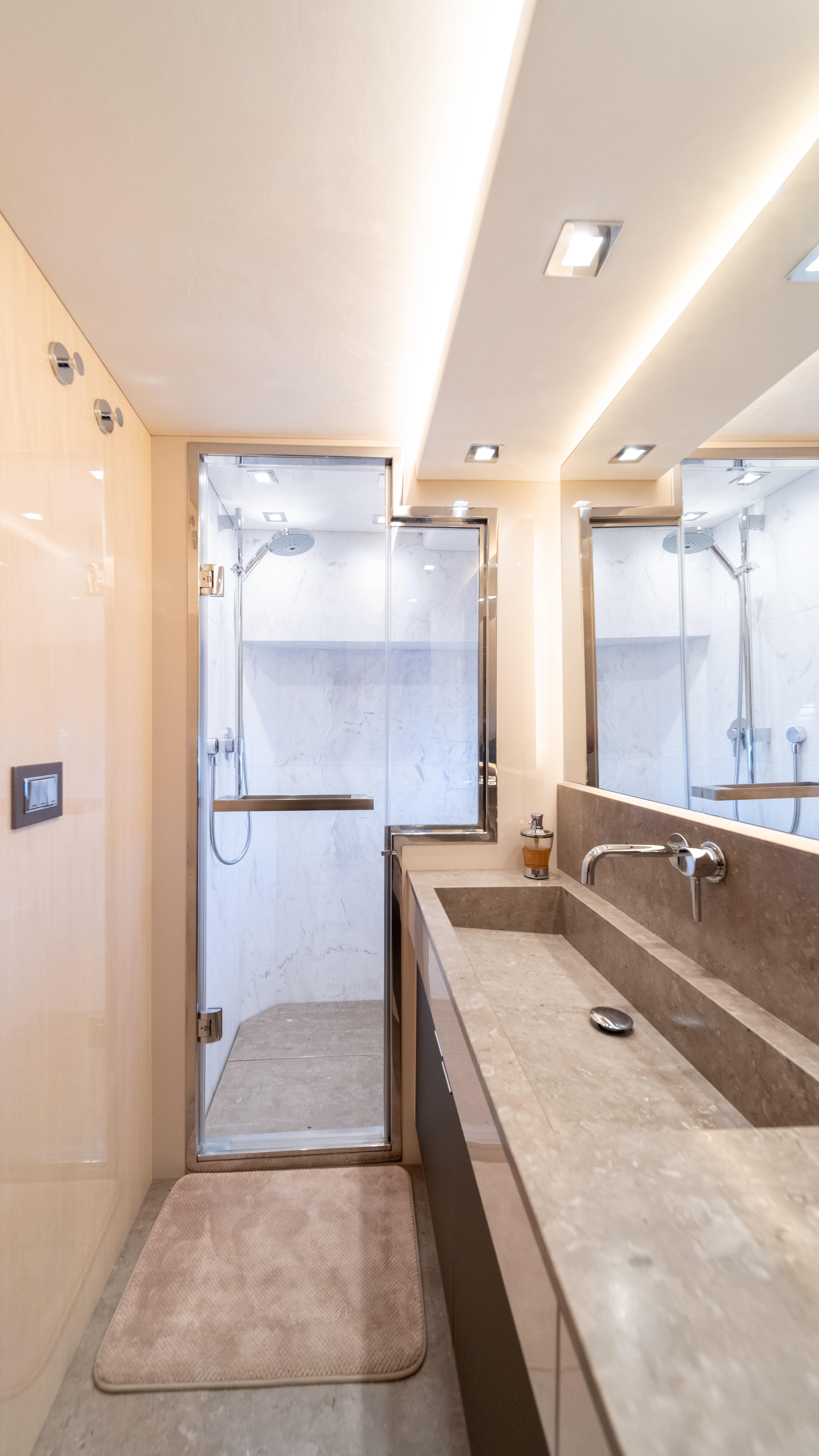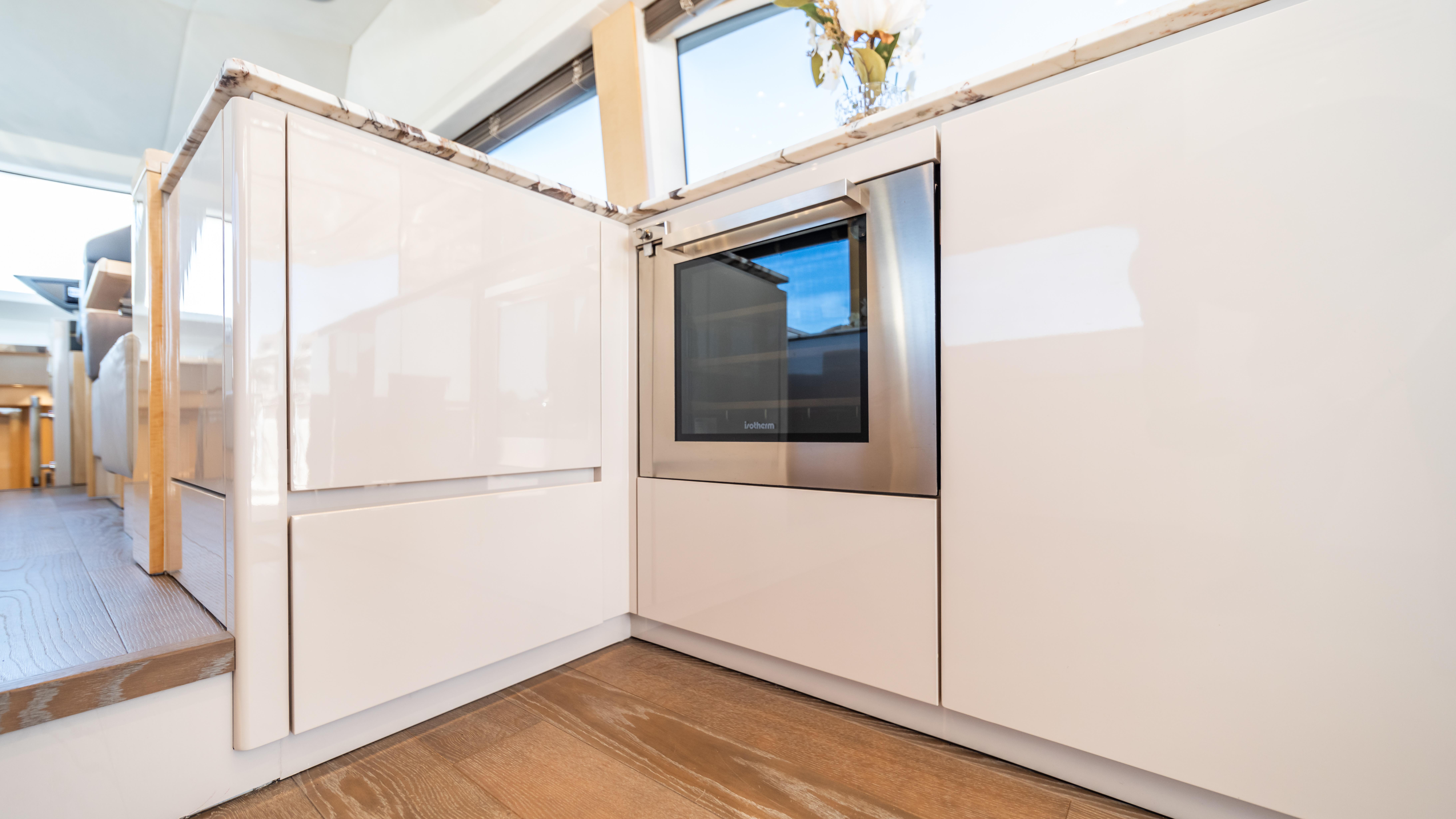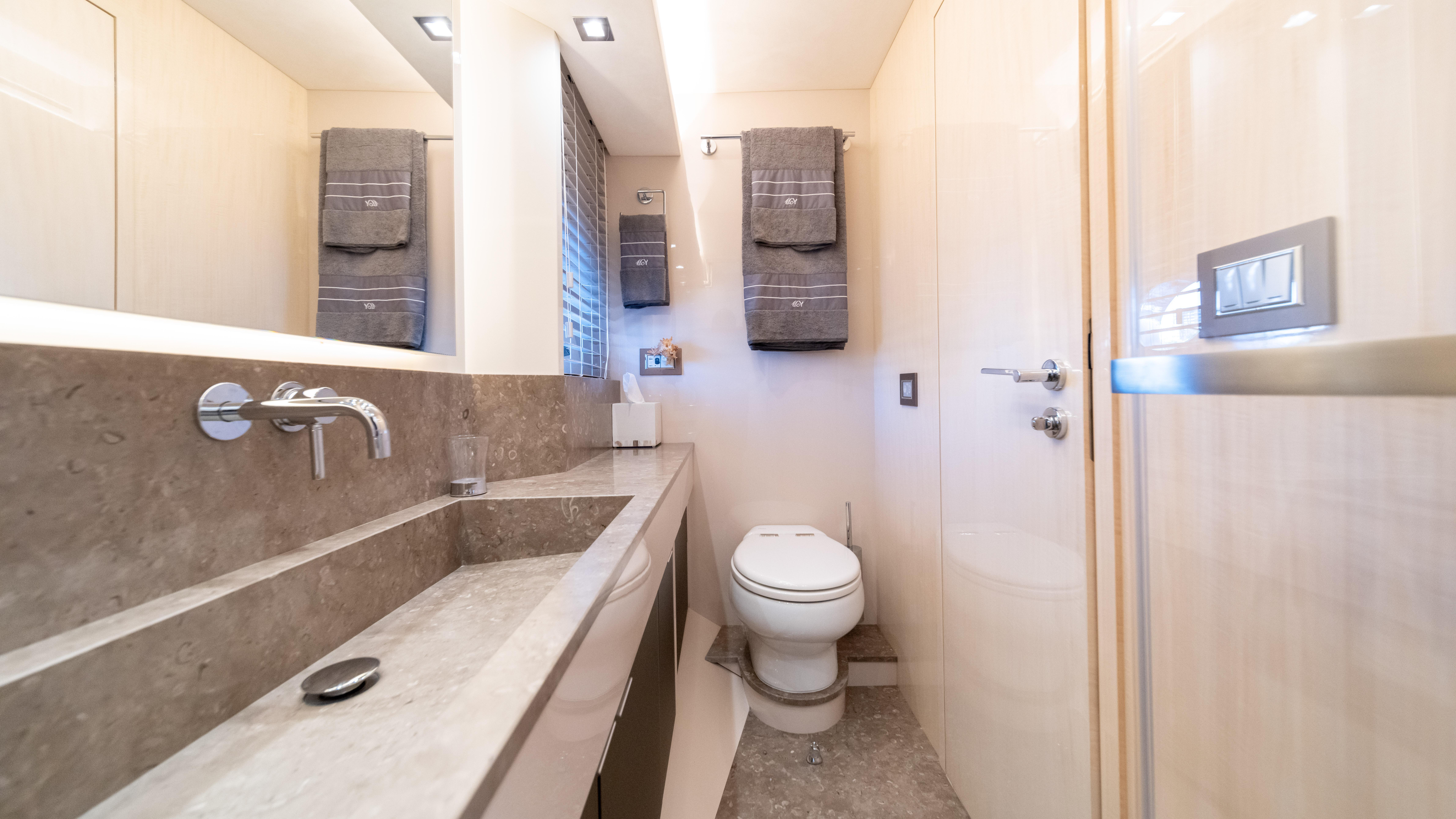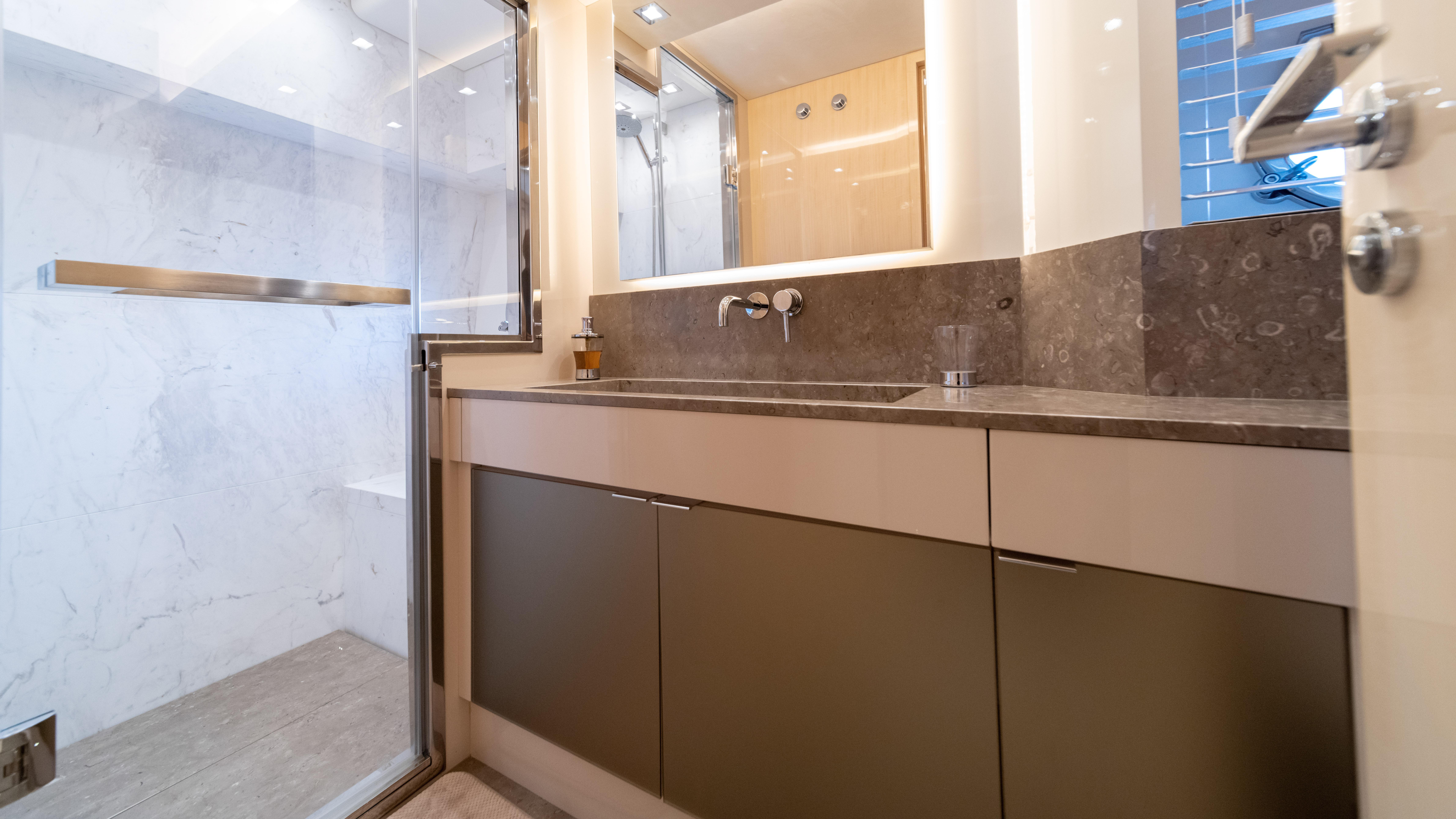 The MCY 66’s unique and sophisticated modern decor is a striking feature throughout the main saloon and all the cabins. High-end fabrics, natural stones and Italian leathers are just a few of the superior materials available on this yacht. Elegant glossy marble elements enriched by a light touch of copper are key defining features of the new MCY 66 interior design. The use of reflective materials, mirrors and lacquered wood, in combination with wide lateral windows enhance the brightness of natural light. In order to satisfy the owner’s needs and wishes, Monte Carlo Yachts offers complete customization of all interior design and layout features.