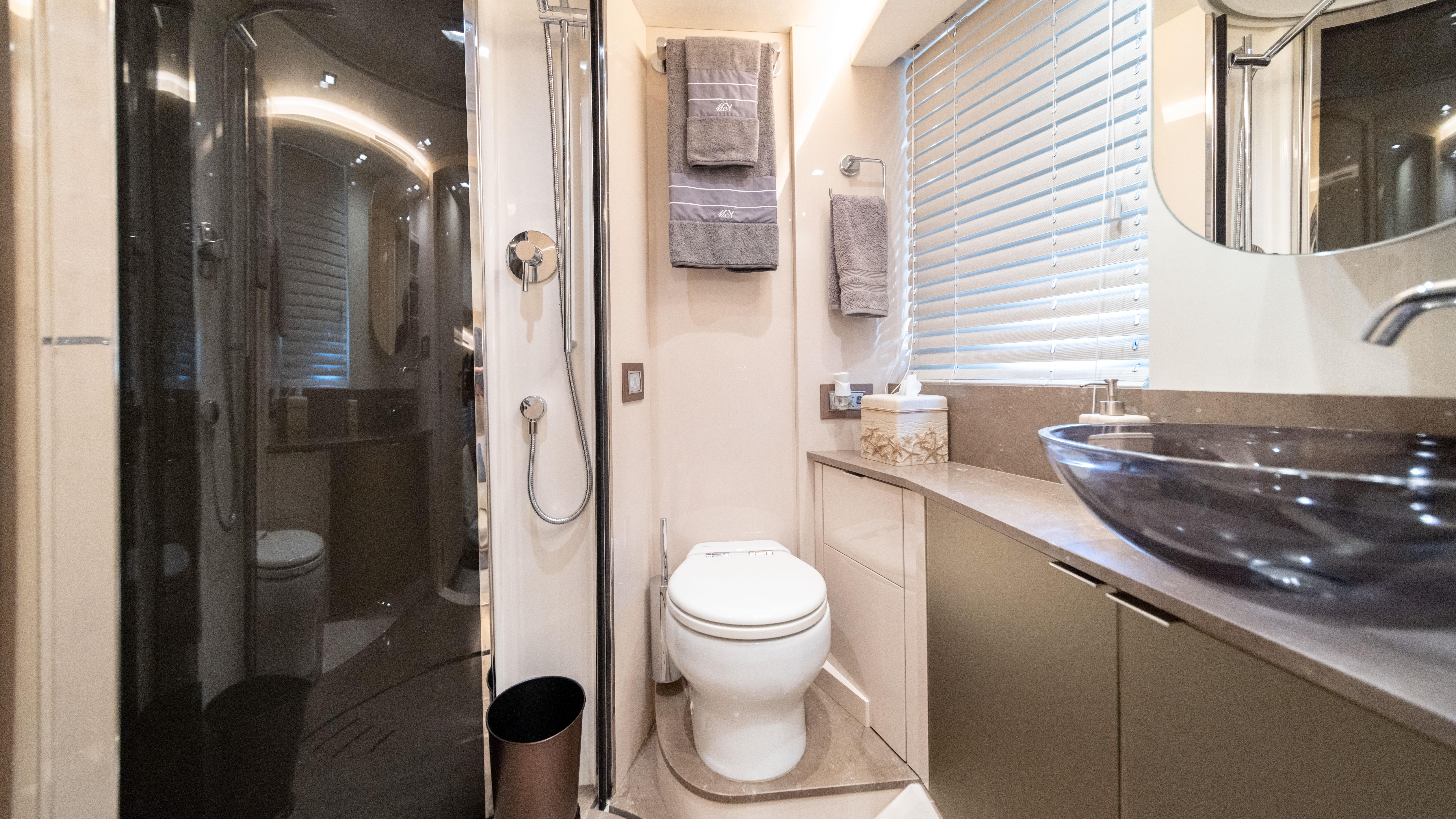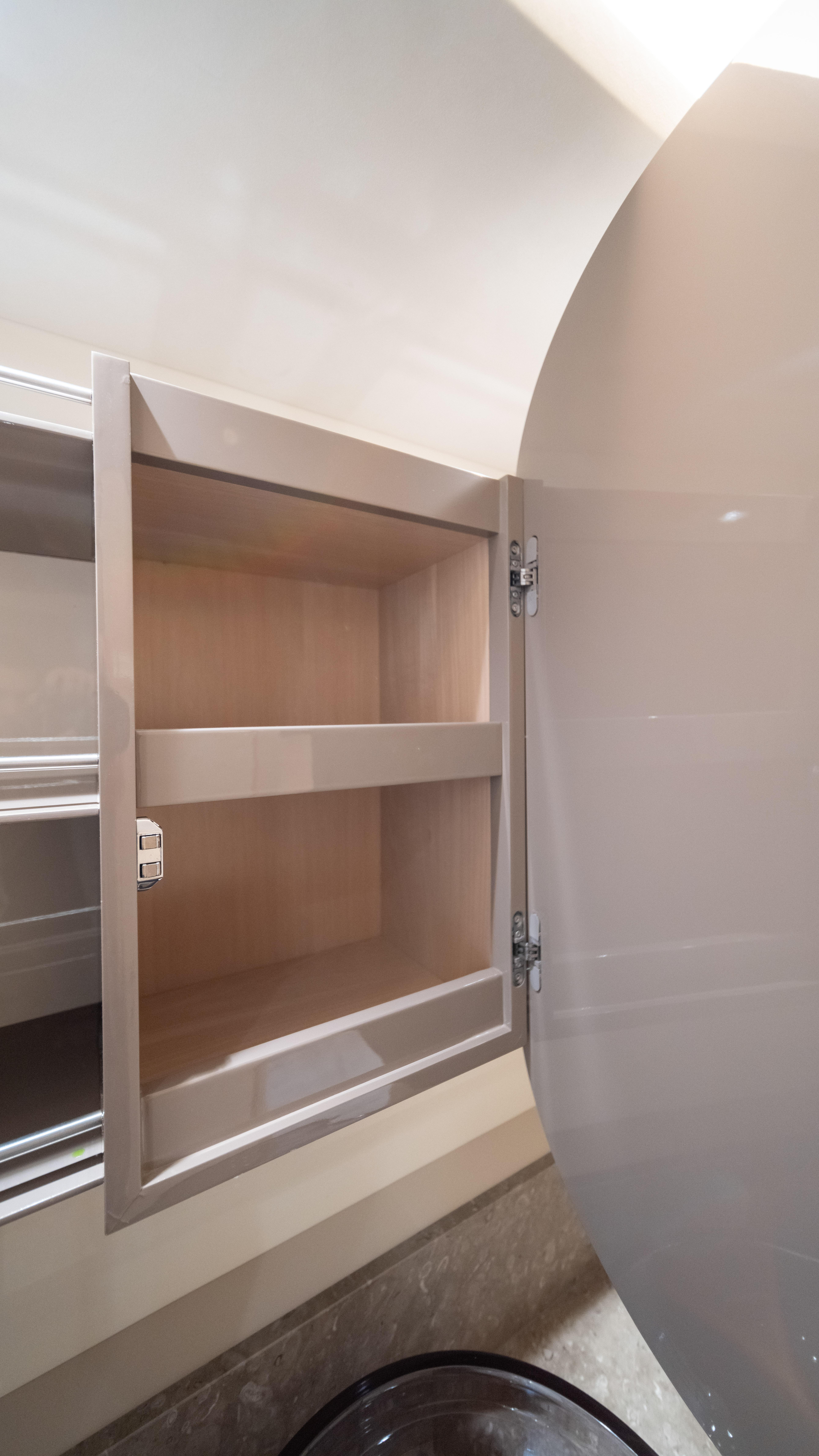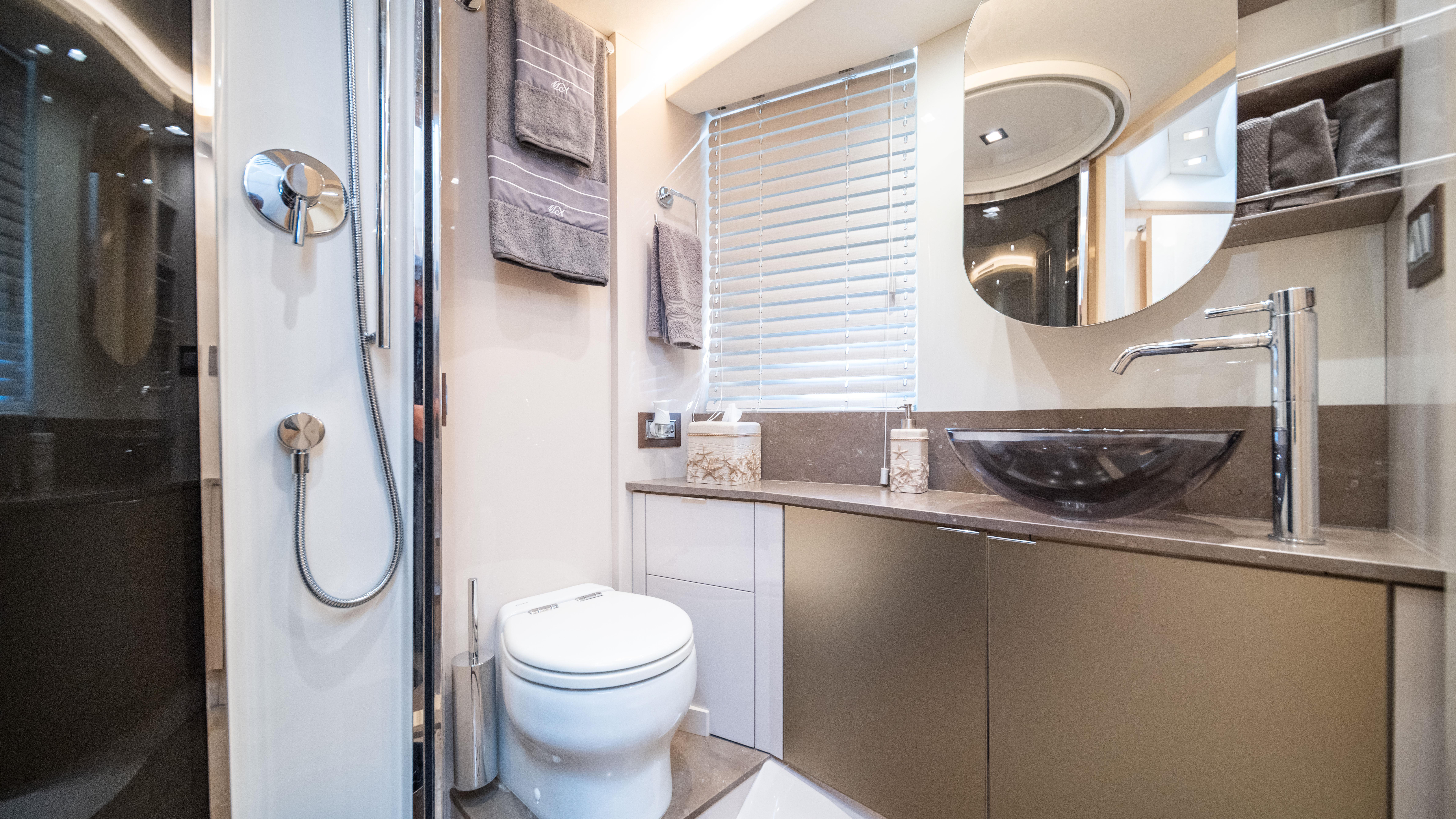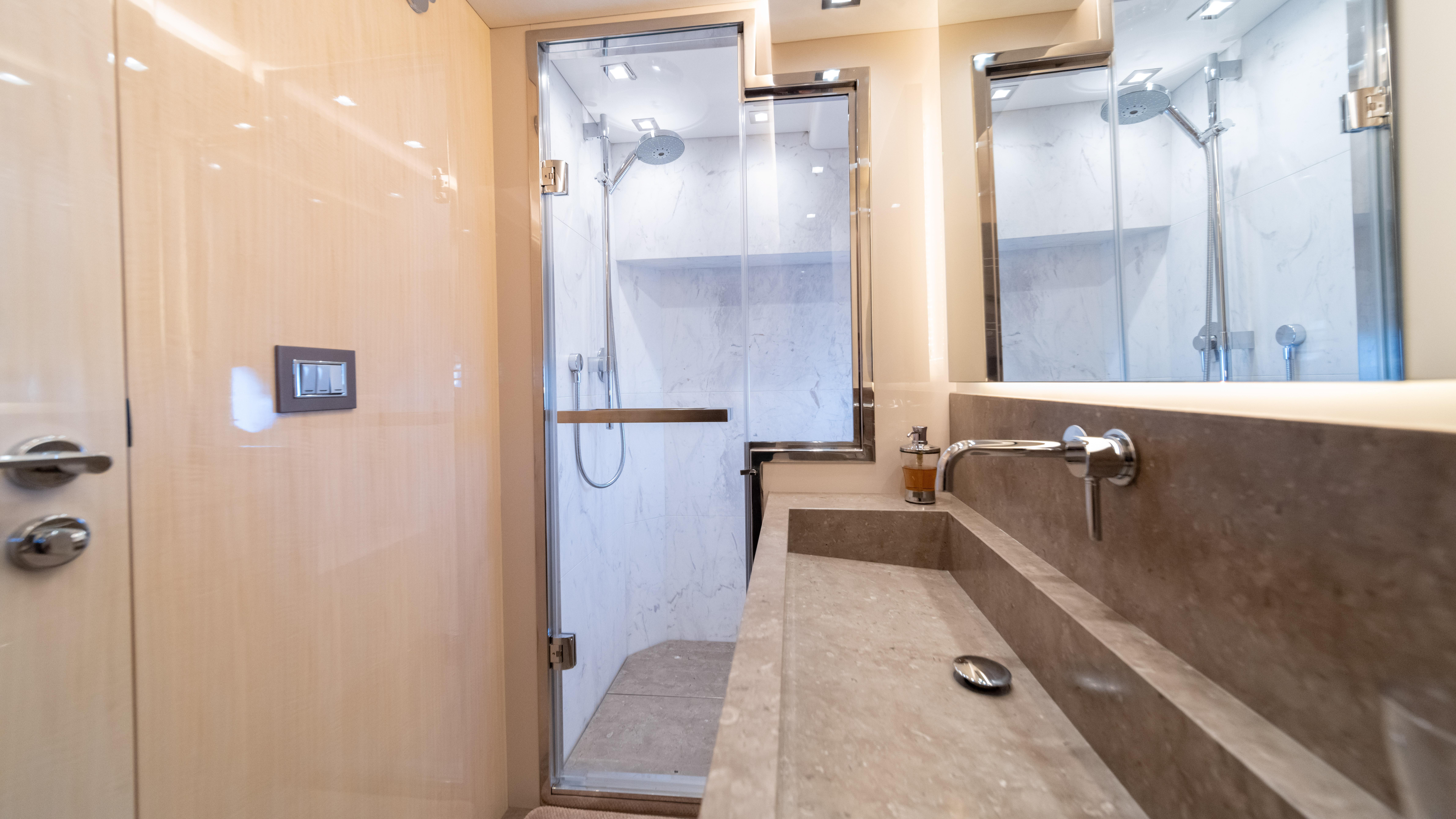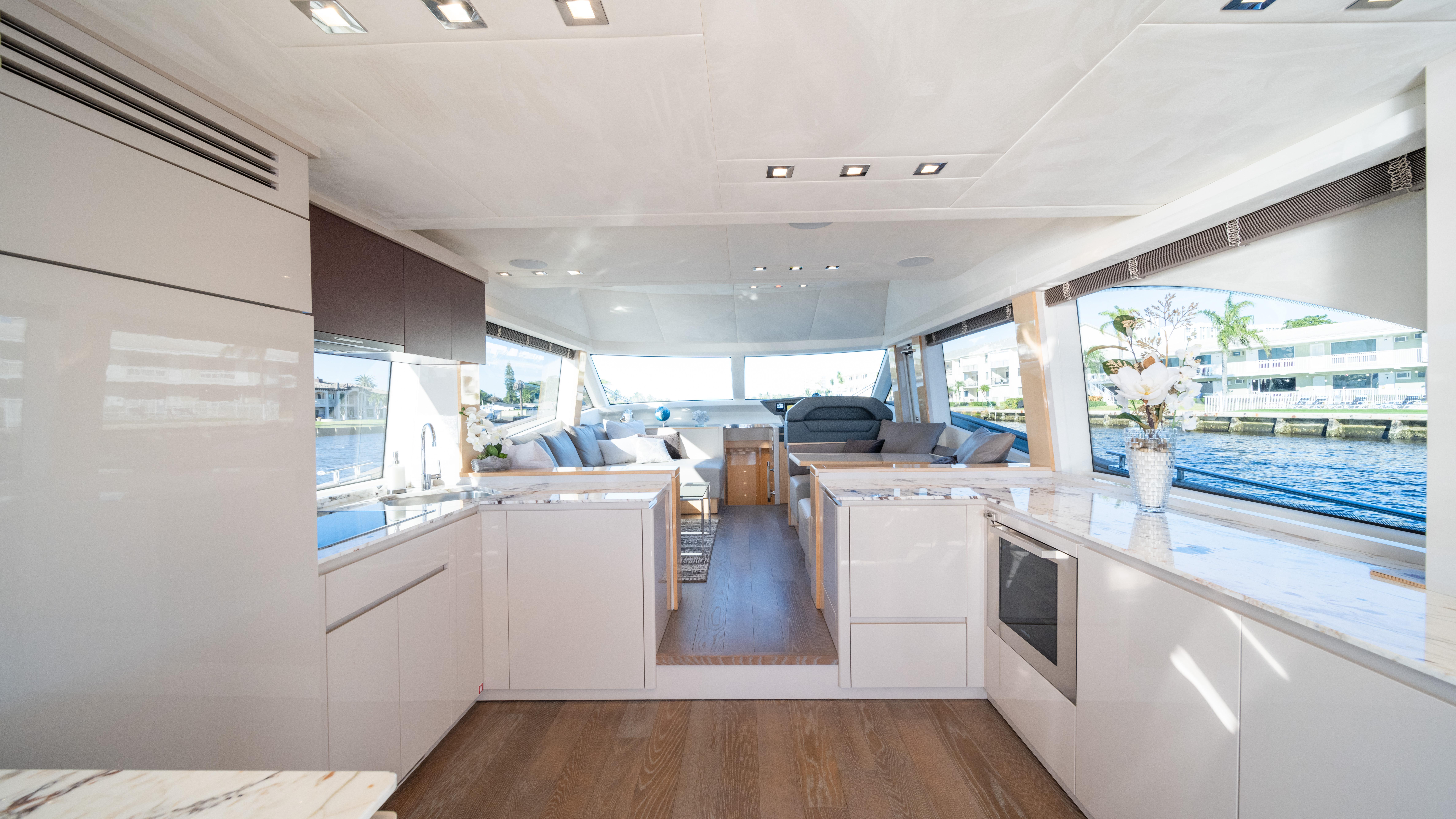 The MCY 66’s unique and sophisticated modern decor is a striking feature throughout the main saloon and all the cabins. High-end fabrics, natural stones and Italian leathers are just a few of the superior materials available on this yacht. Elegant glossy marble elements enriched by a light touch of copper are key defining features of the new MCY 66 interior design. The use of reflective materials, mirrors and lacquered wood, in combination with wide lateral windows enhance the brightness of natural light. In order to satisfy the owner’s needs and wishes, Monte Carlo Yachts offers complete customization of all interior design and layout features.