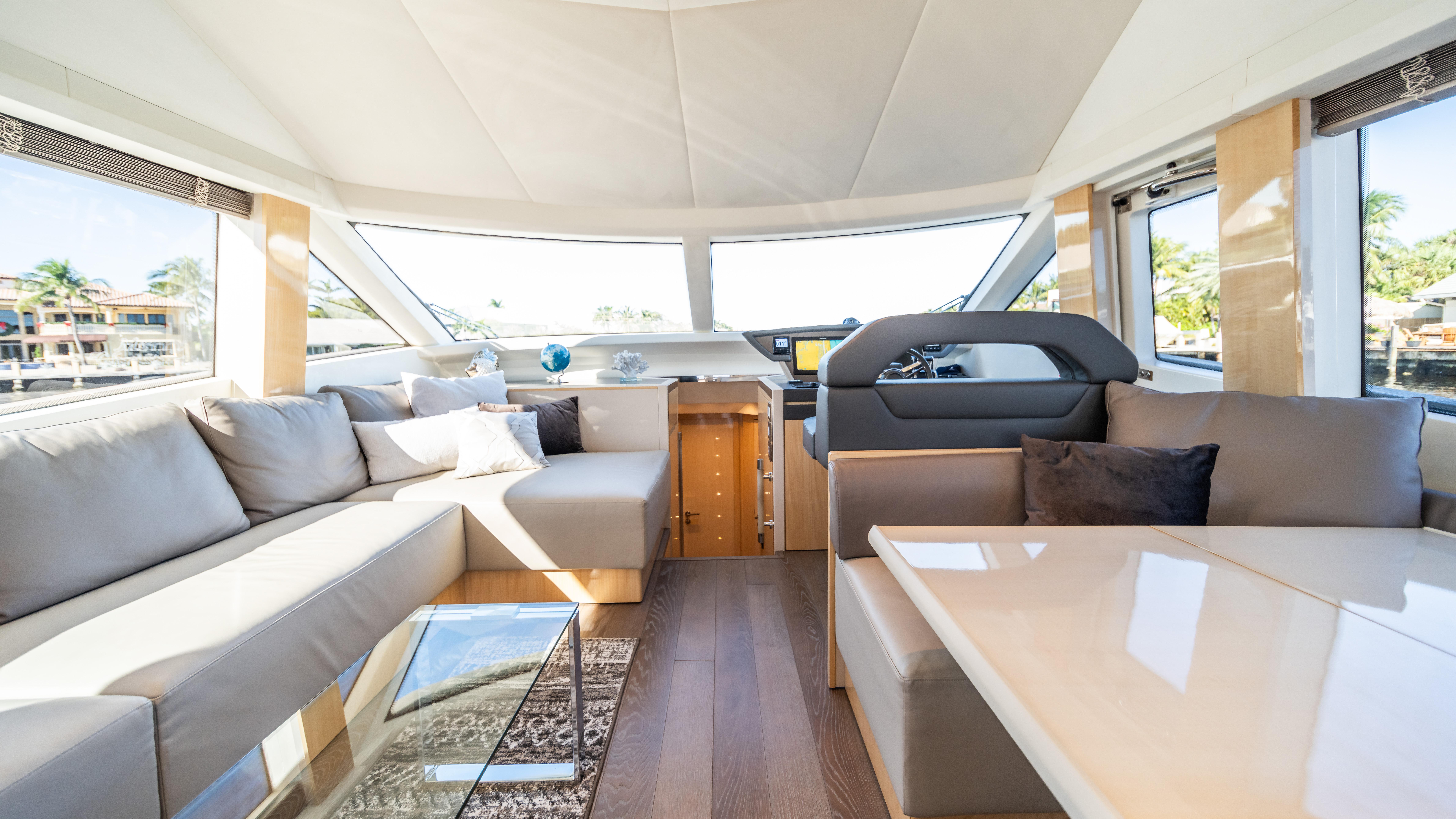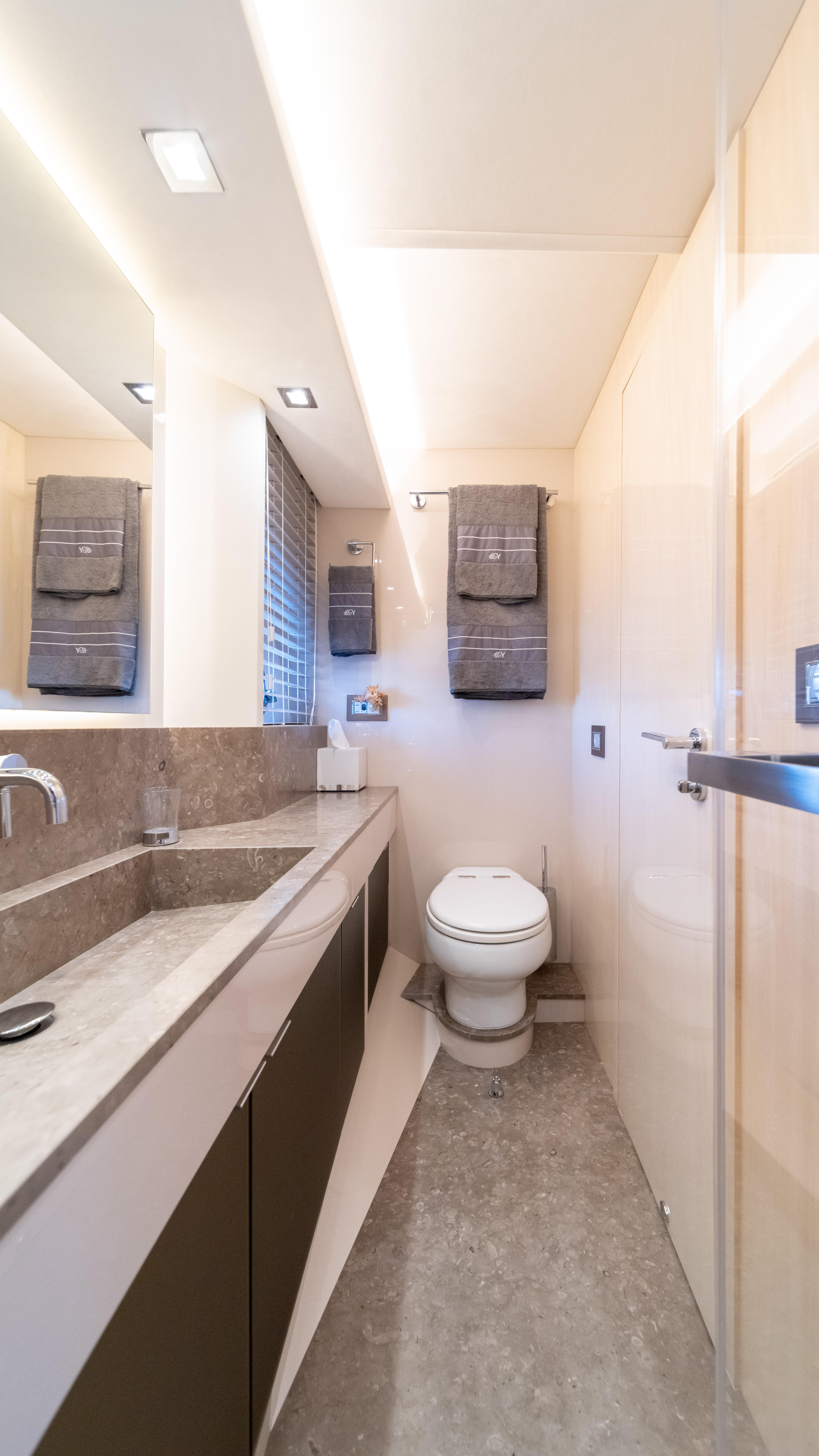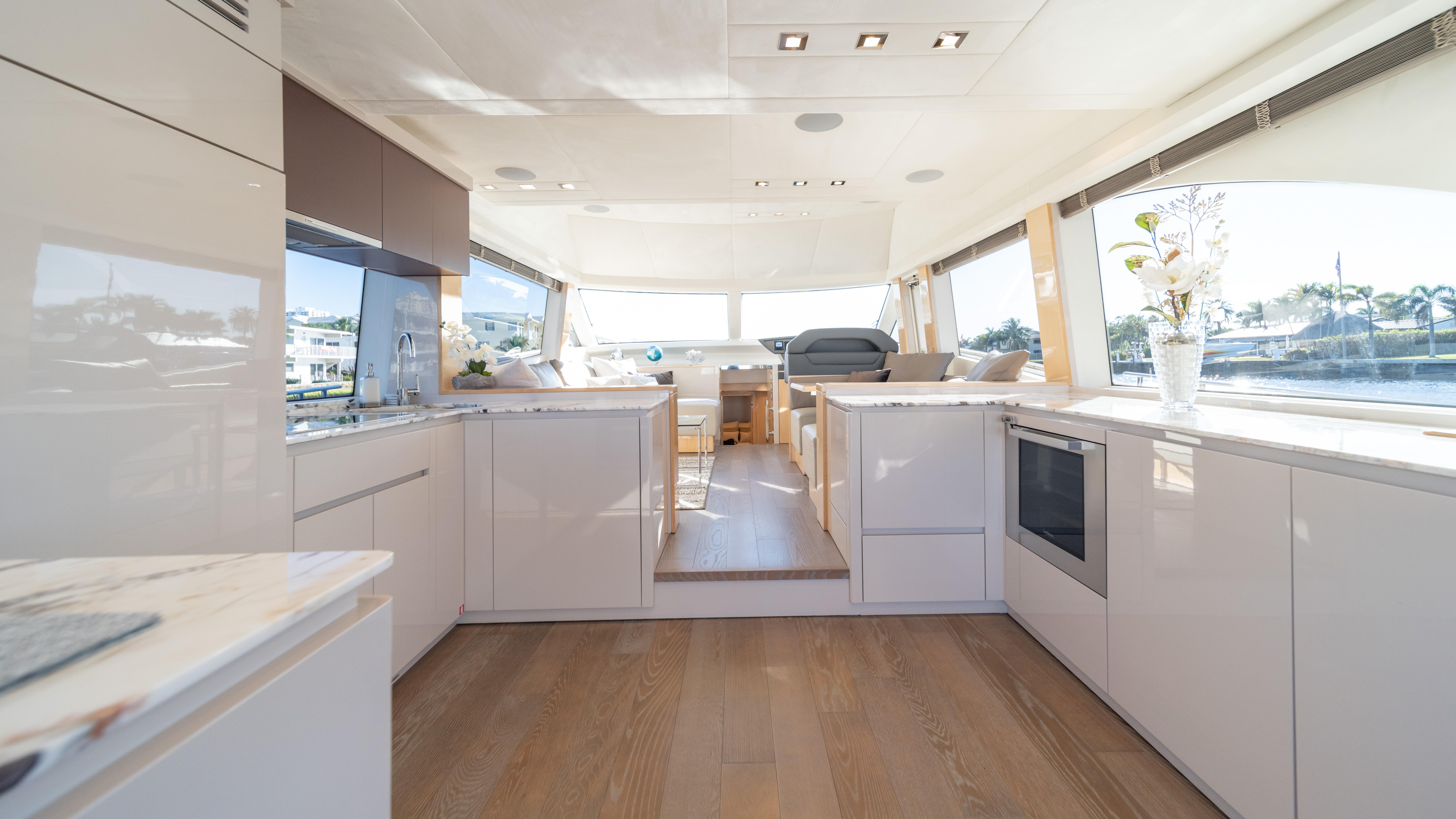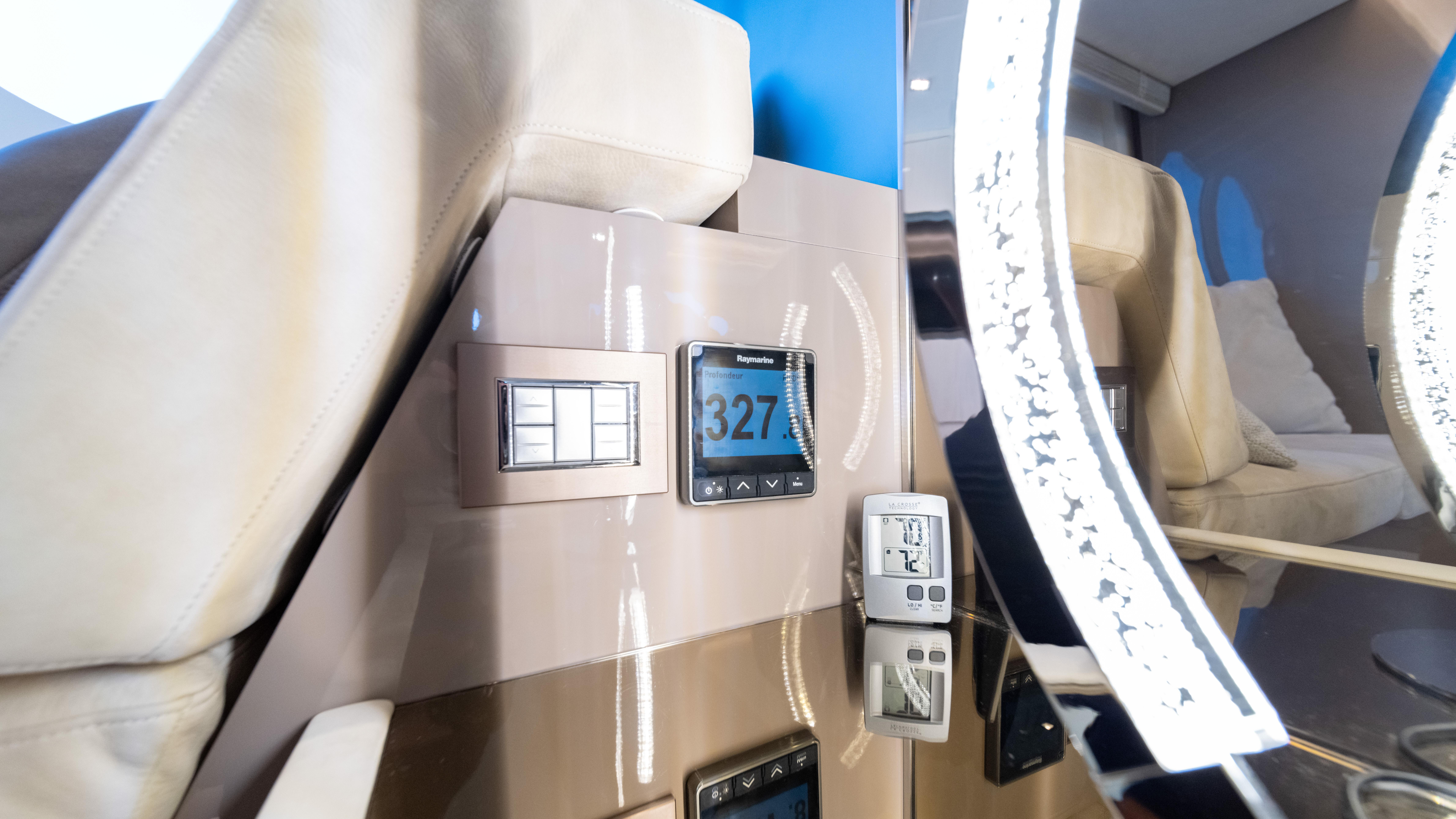 The MCY 66’s unique and sophisticated modern decor is a striking feature throughout the main saloon and all the cabins. High-end fabrics, natural stones and Italian leathers are just a few of the superior materials available on this yacht. Elegant glossy marble elements enriched by a light touch of copper are key defining features of the new MCY 66 interior design. The use of reflective materials, mirrors and lacquered wood, in combination with wide lateral windows enhance the brightness of natural light. In order to satisfy the owner’s needs and wishes, Monte Carlo Yachts offers complete customization of all interior design and layout features.