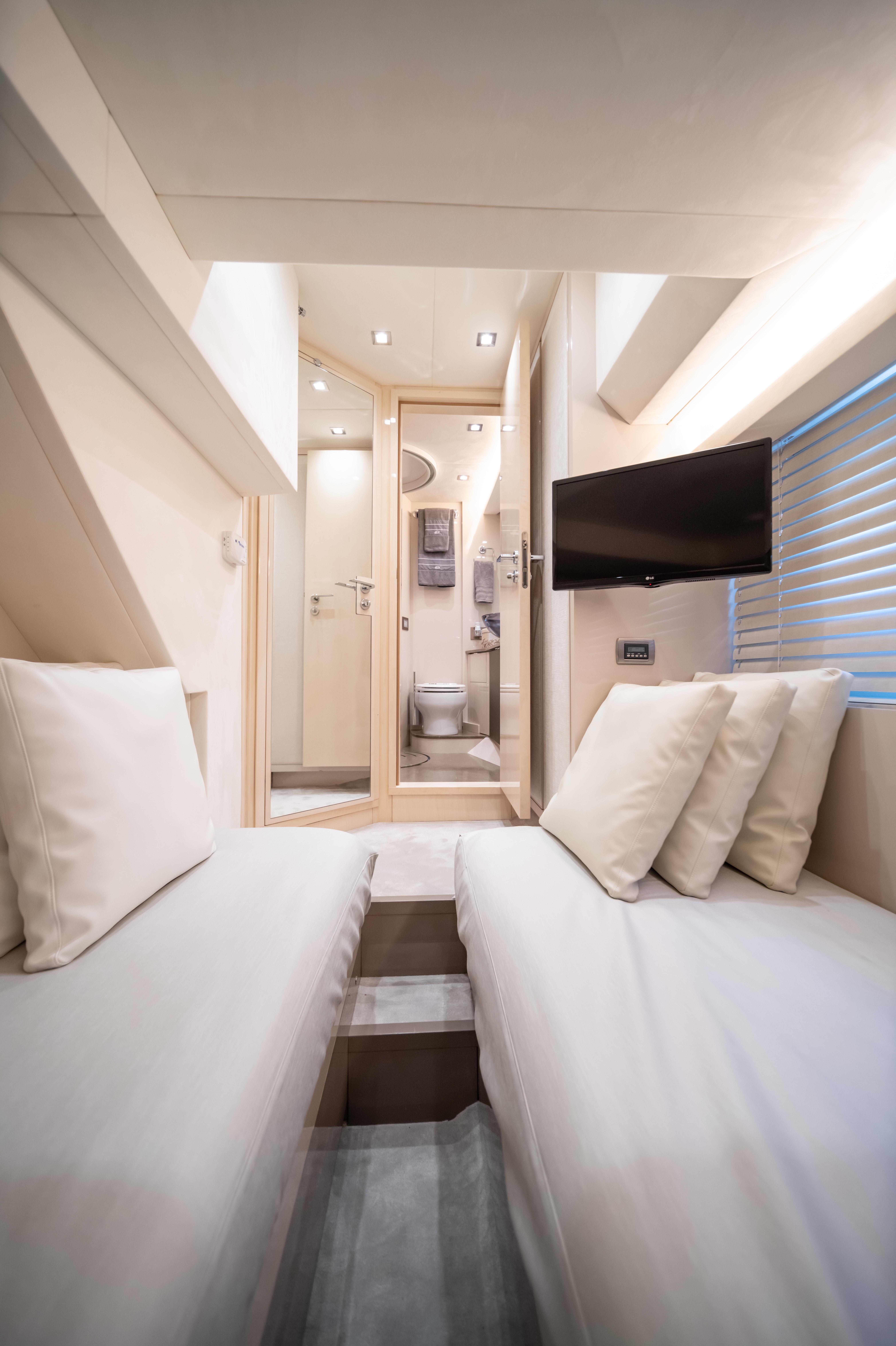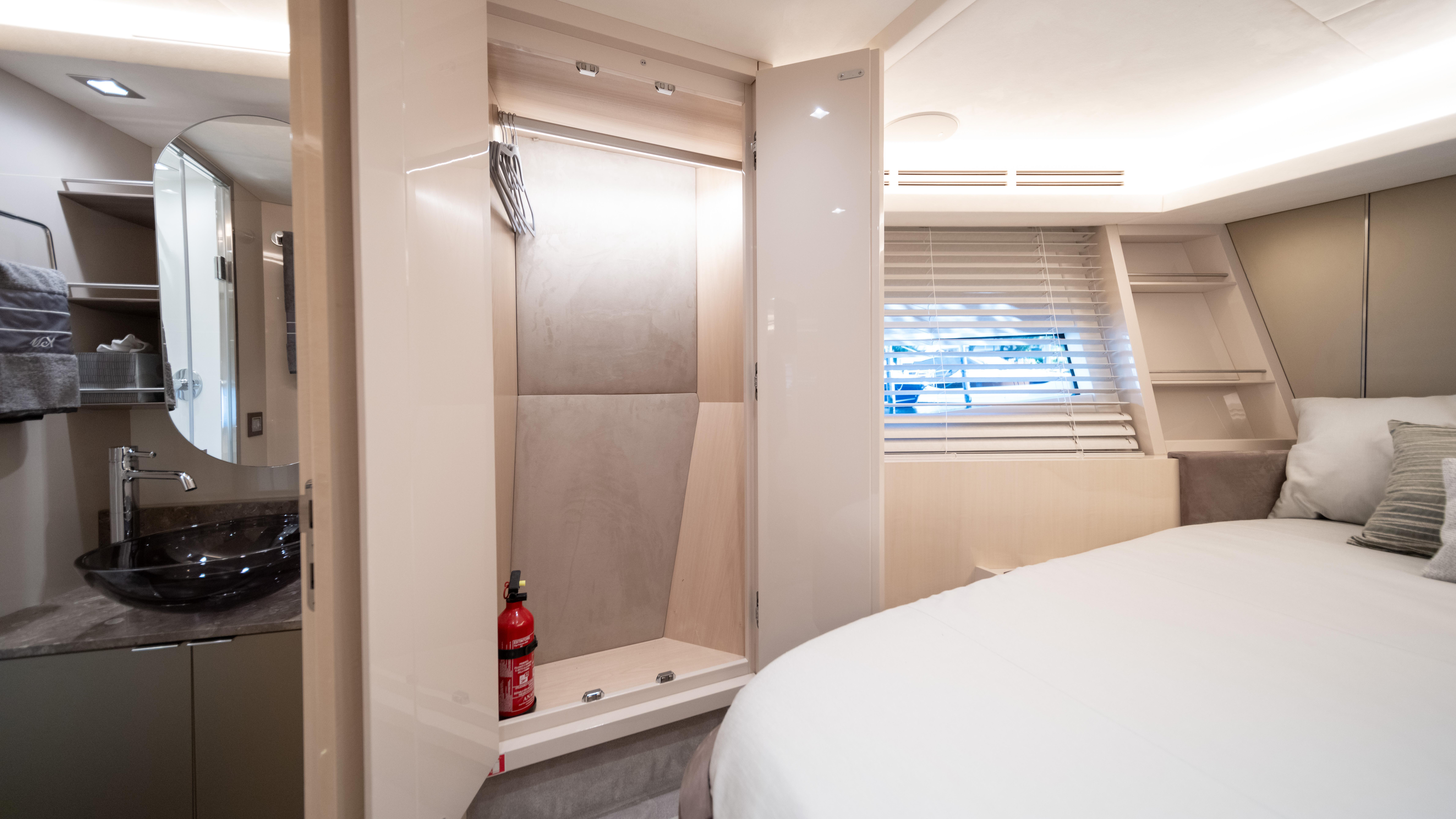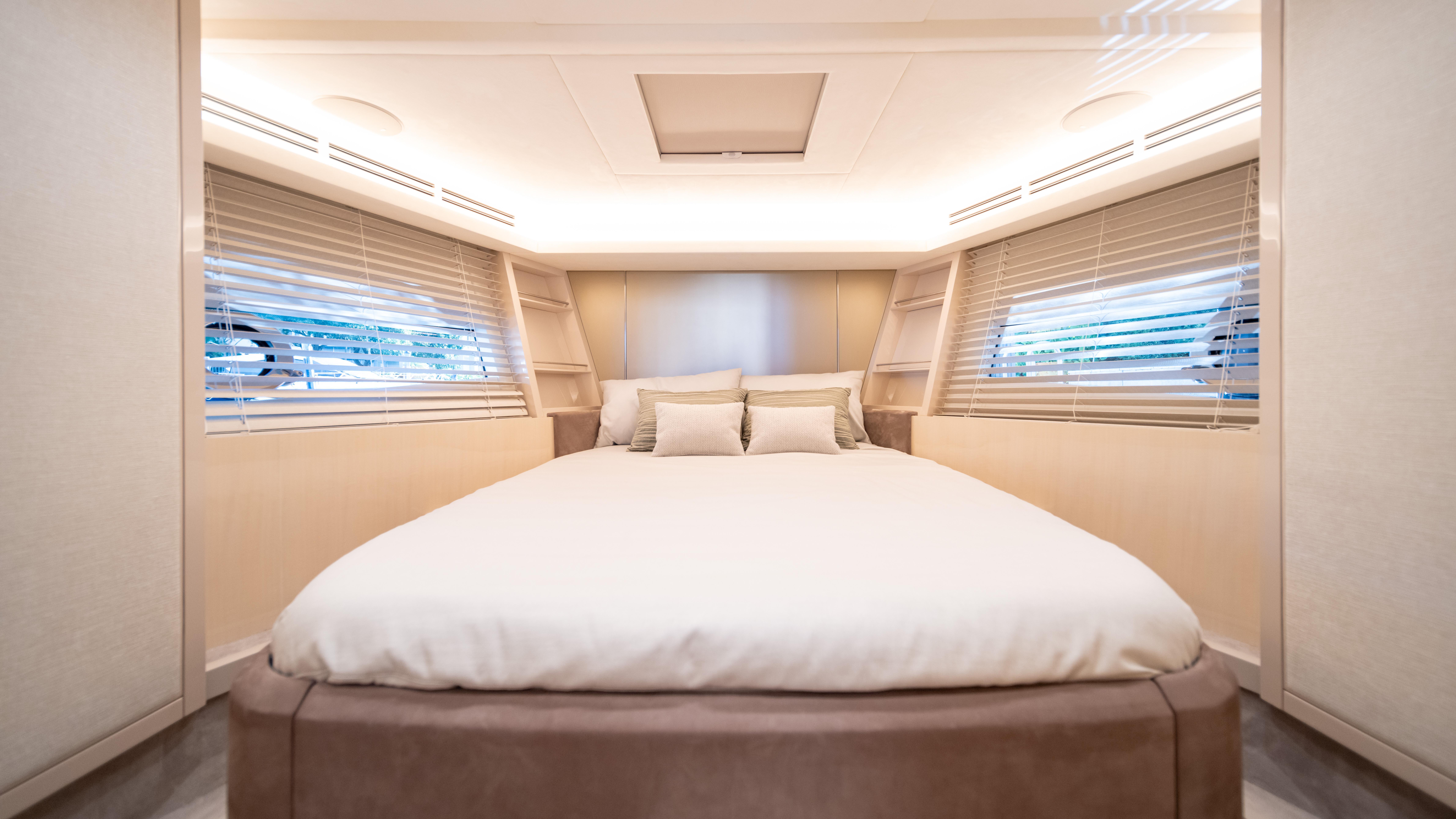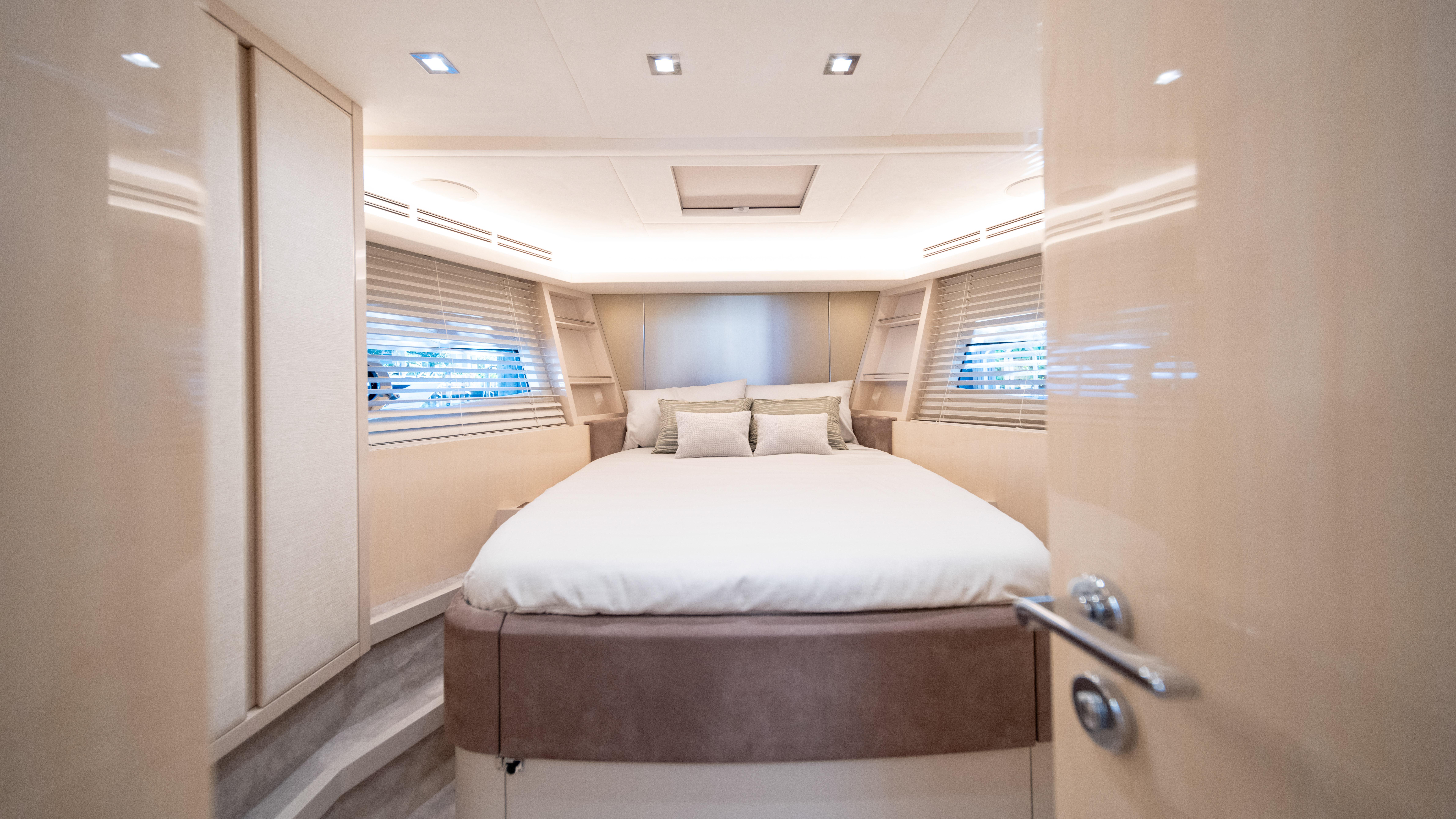 The MCY 66 features incredible internal spaces for a yacht in its size category. The additional bow portholes give the yacht an extended external appearance and provide higher exposure to natural light throughout the VIP cabin. The enlarged MCY’ iconic porthole enhances the intimate and relaxing feeling of the owner cabin. The guests’ cabins with their dedicated bathrooms follow the spacious volumes common to the other areas of this new model.