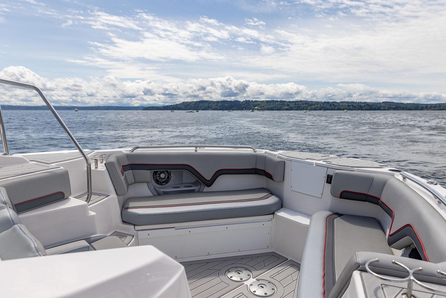 In the cockpit, it’s an angler’s paradise. With 6 rod holders topping the gunwale, 8 rocket launchers, flood lighting, EVA traction decking and a large livewell, you’ll be ready for any fight. Pop-up cleats retract for a snag-free cockpit. Below deck you’ll find a built-in fish box and additional storage in the lazarette. The self-bailing deck and raw water washdown make cleanup a simple task.