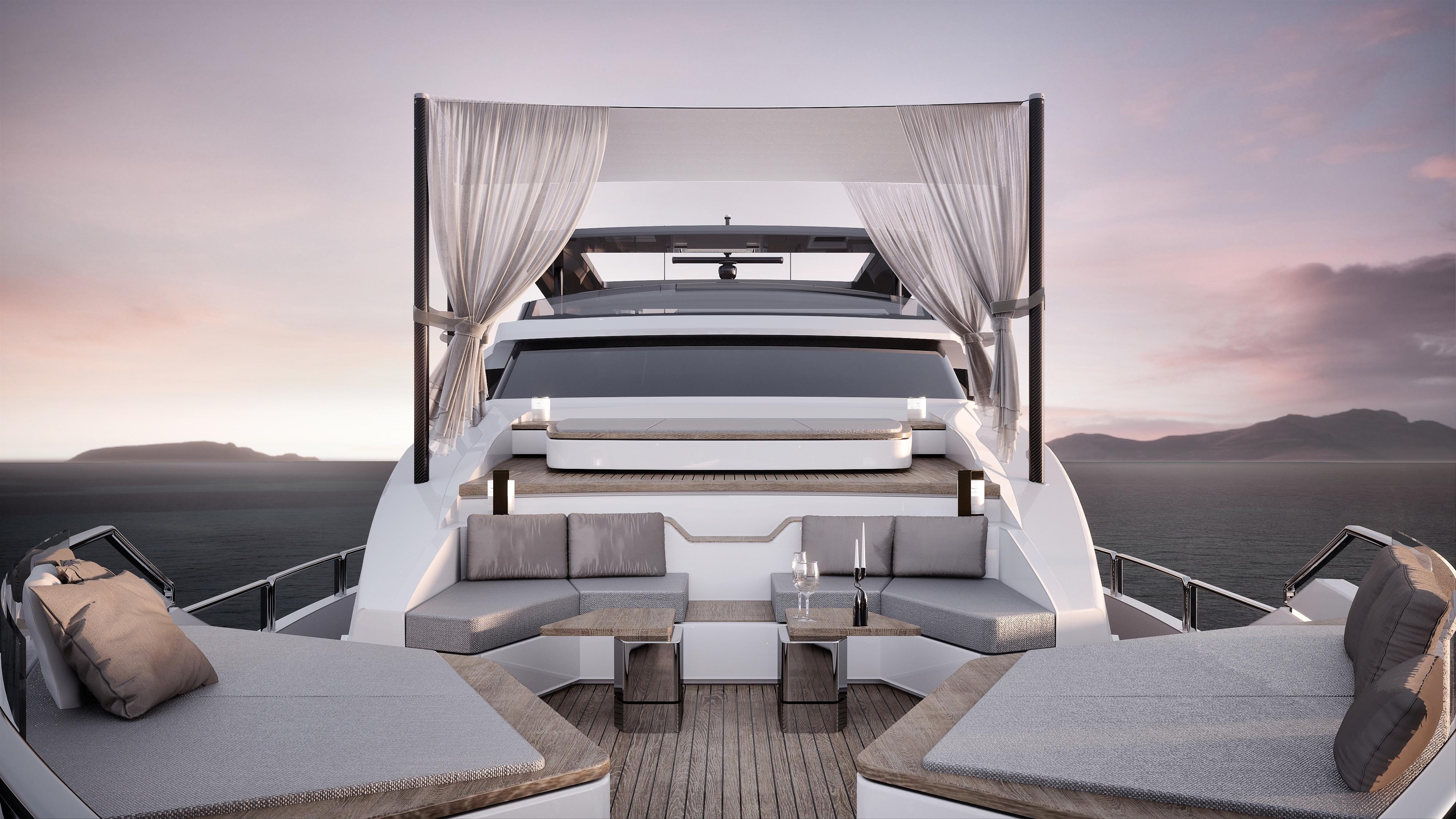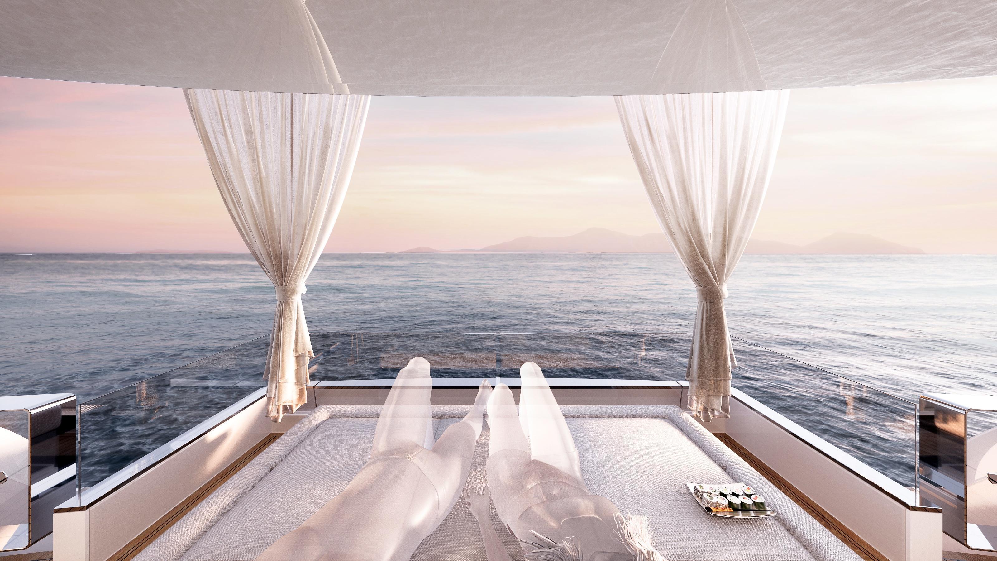A spacious alfresco dining table, a versatile sofa for both lounging and sunbathing, and seamlessly integrated mooring and storage solutions set a new benchmark in outdoor yacht living. The freestanding sunbed and distinctive glass veranda add an airy, open feel that enhances the sense of space and luxury. The cockpit and Beach Club flow together, creating one expansive, unified area—perfect for relaxing, entertaining, and enjoying time with family and friends.