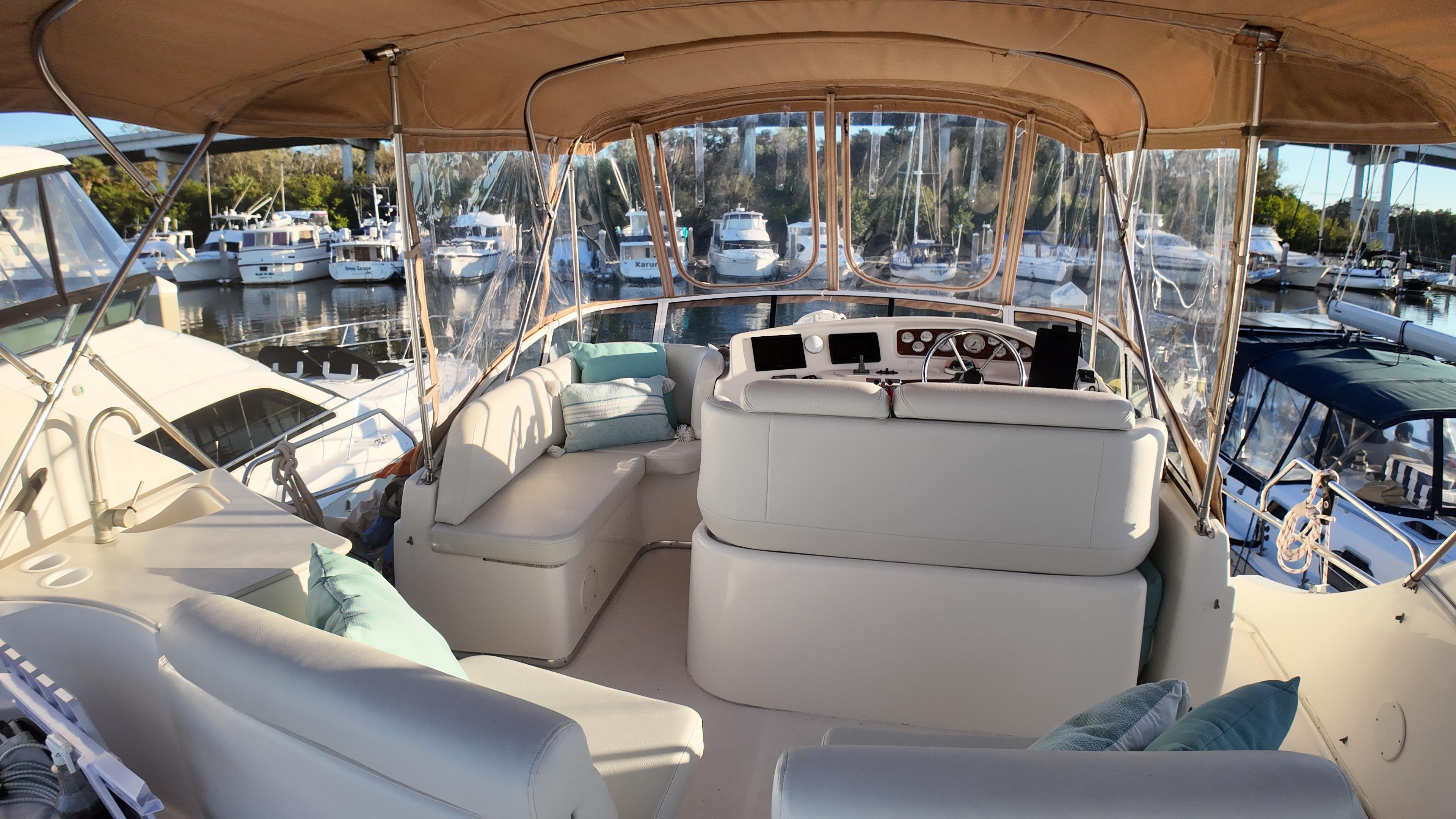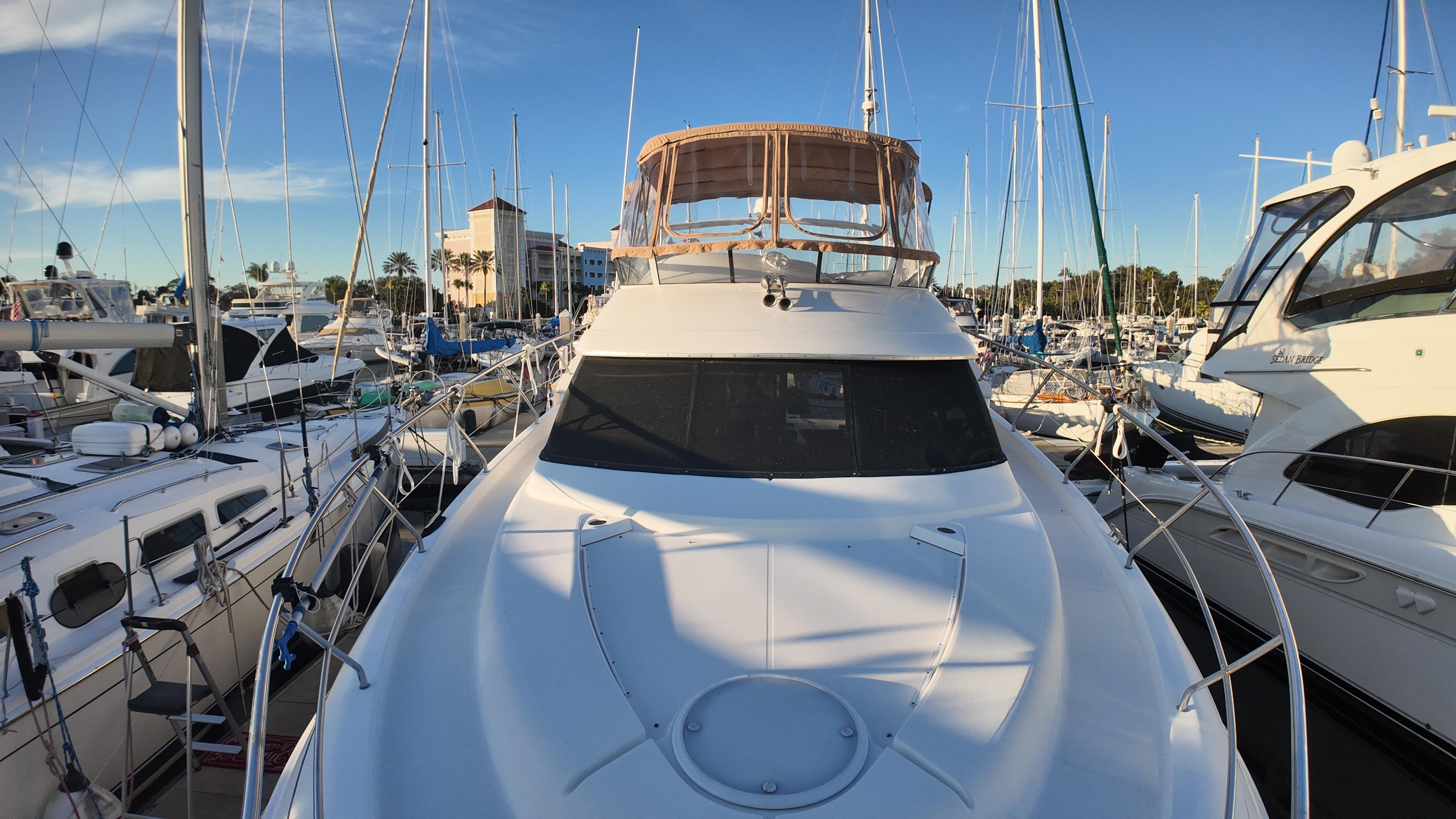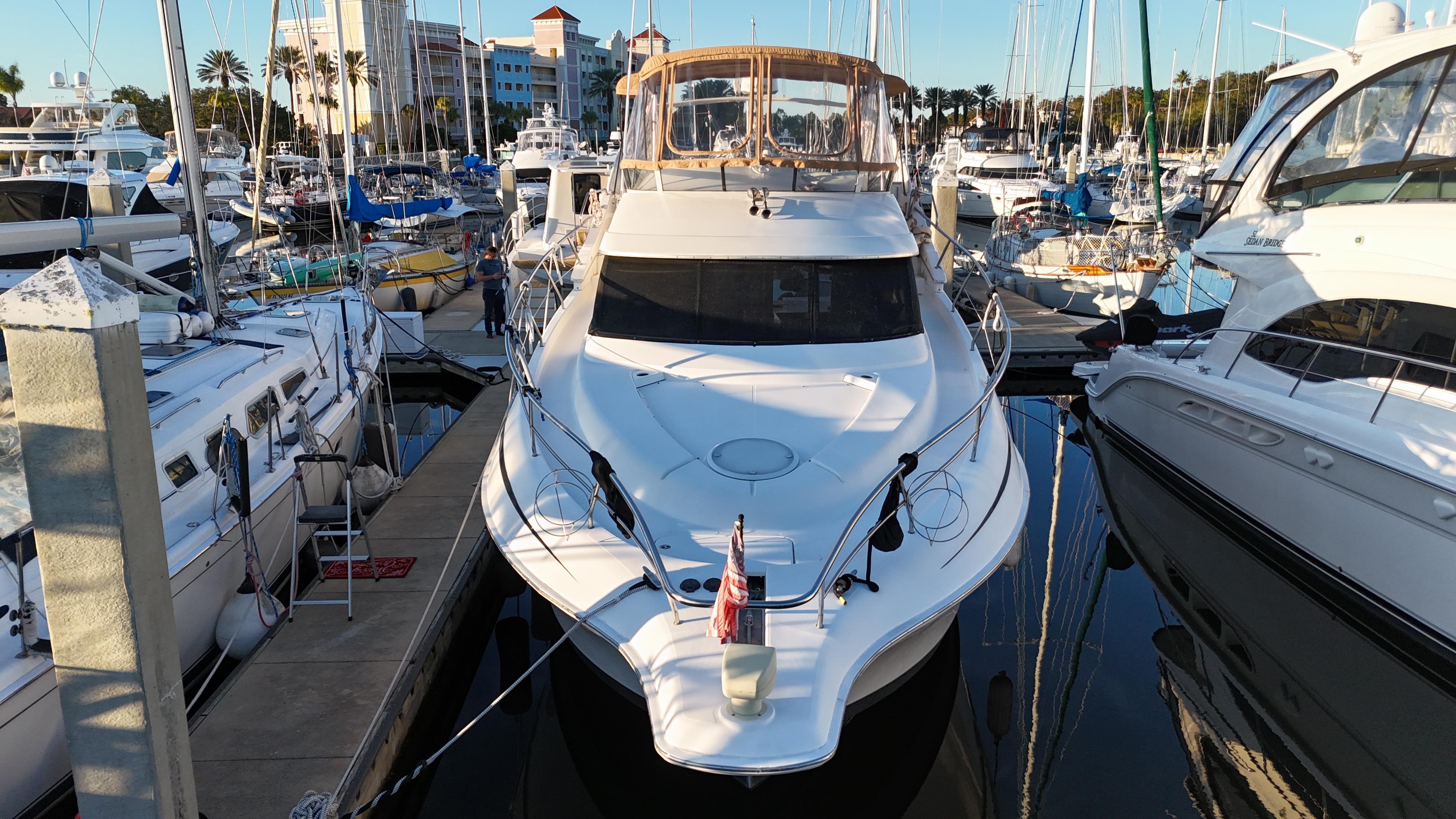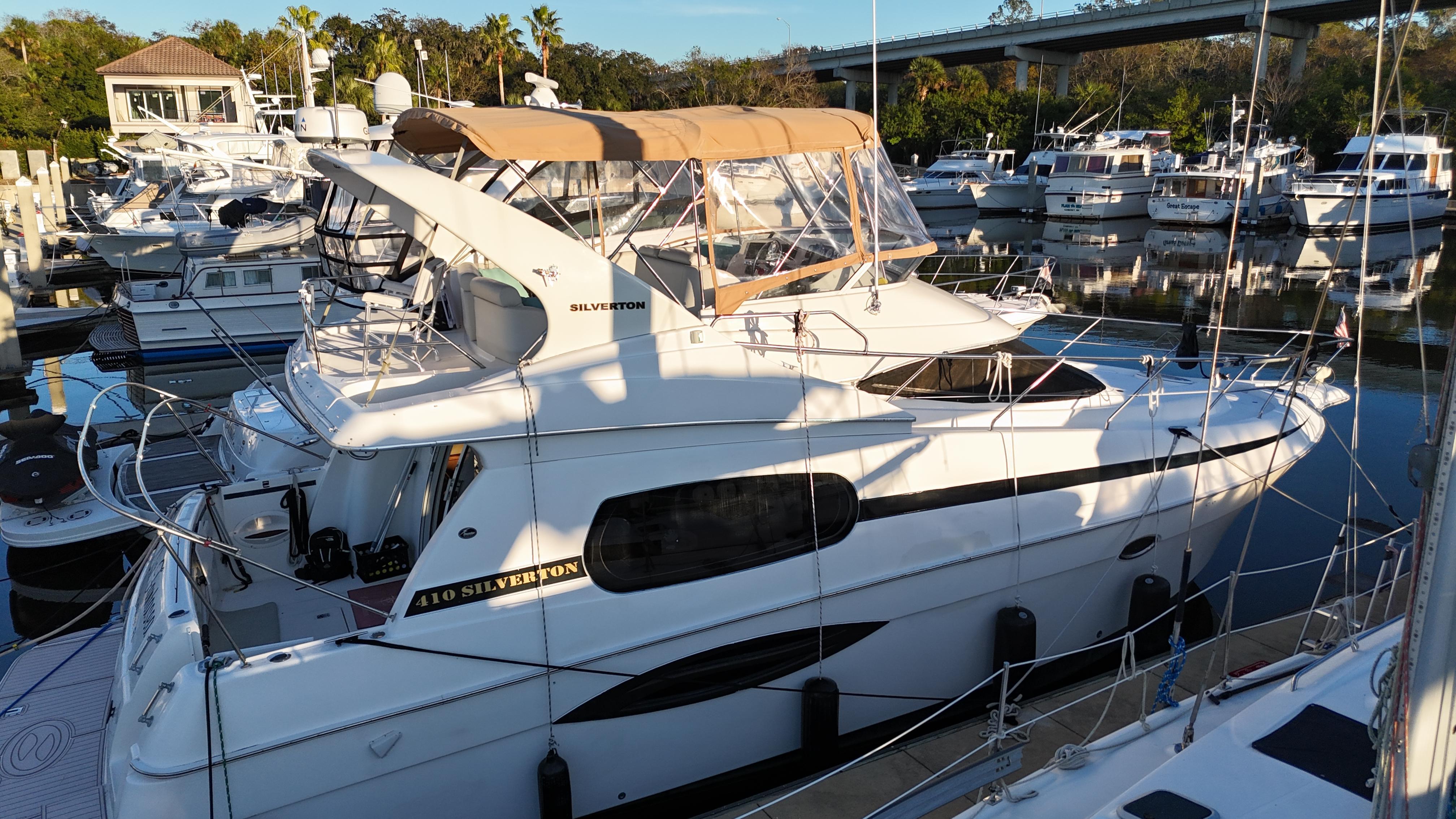 The Silverton 410 Sport Bridge combines sporty exterior styling with an exceptionally spacious and well-appointed interior, making it the perfect cruiser for adventure and relaxation. Powered by reliable Caterpillar 3216 engines with approximately 1,100 hours, this 410 is ready to take you wherever your next journey on the water may lead.Topside, you’ll find two sunpads, ample comfortable seating, and a wet bar—creating the ideal setting for entertaining or unwinding. The ergonomic helm, complete with full instrumentation, and the robust engine room ensure a confident and exciting experience on the water.Below deck, the Silverton 410 offers one of the largest interiors in its class. Highlights include a full-beam salon, a raised galley, two private staterooms, and a split head and shower, delivering the space and comfort of a much larger yacht.Additionally, the current owner, a meticulous engineer, has thoroughly addressed every system on the boat, ensuring it is truly turn-key and ready for immediate enjoyment. Whether you’re setting out for a weekend getaway or an extended cruise, you can feel confident in the vessel’s exceptional condition.While some may argue that the destination is what matters most, the Silverton 410 Sport Bridge proves that getting there can be just as enjoyable. Designed for performance, this vessel combines power and handling to ensure every journey is smooth, fun, and memorable.Recent Upgrades: New SeadeckNew galvanic isolatorsNew dripless sealsNew cutless bearingsNew running gear coatingNew shaft zincsNew bow thrusterNew bimini sternNew bimini and eisenglass flybridgeRecovered flybridge seatsNew Garmin 943 with new radarNew Horizon radio and antennaNew anchor chain and rodeNew generatorNew Victron battery chargerNew batteriesNew battery cables1000-hour overhaul: coolers flushed, new hose clamps, new impellers, oil change (engines and transmission), all filters changed, valves and injectors serviced, new alternators, new belts, anodes replaced, fuel polishedNew alternator isolatorTwo new AC unitsNew AC water pumpNew high-pressure freshwater pumpNew Raritan electric toiletNew shower sump pumpNew carpet and hardwood flooringNew window treatmentNew Garmin backup cameras