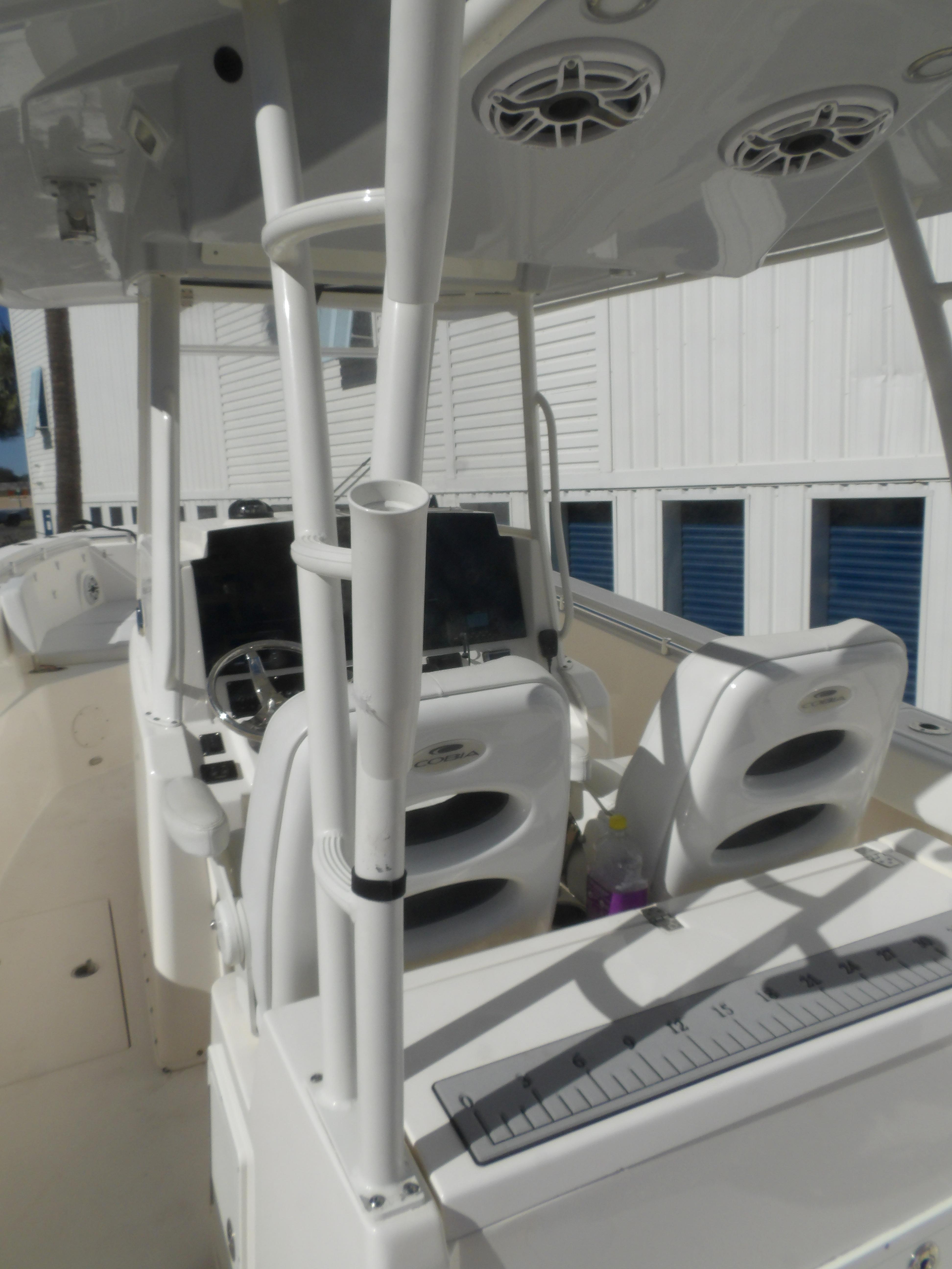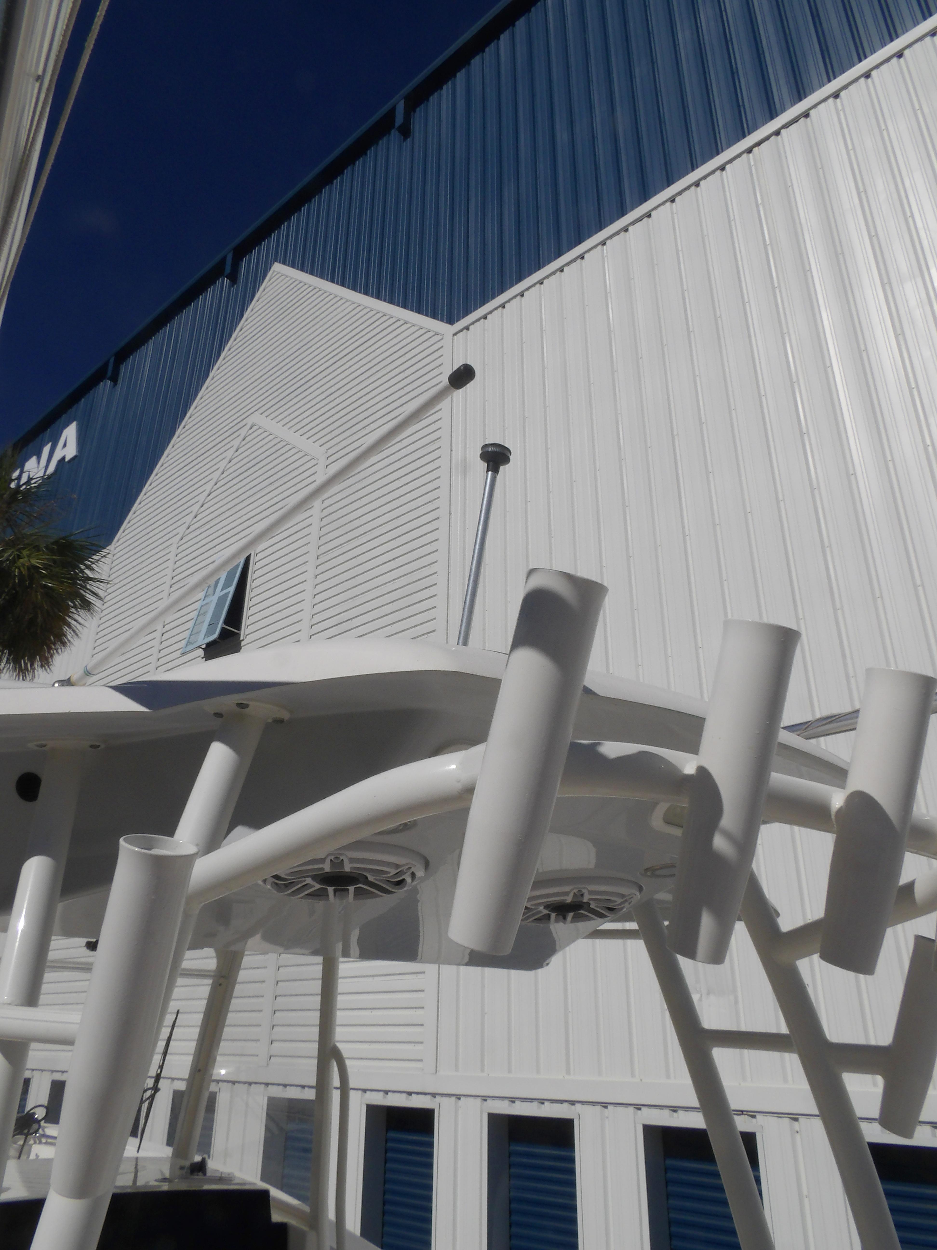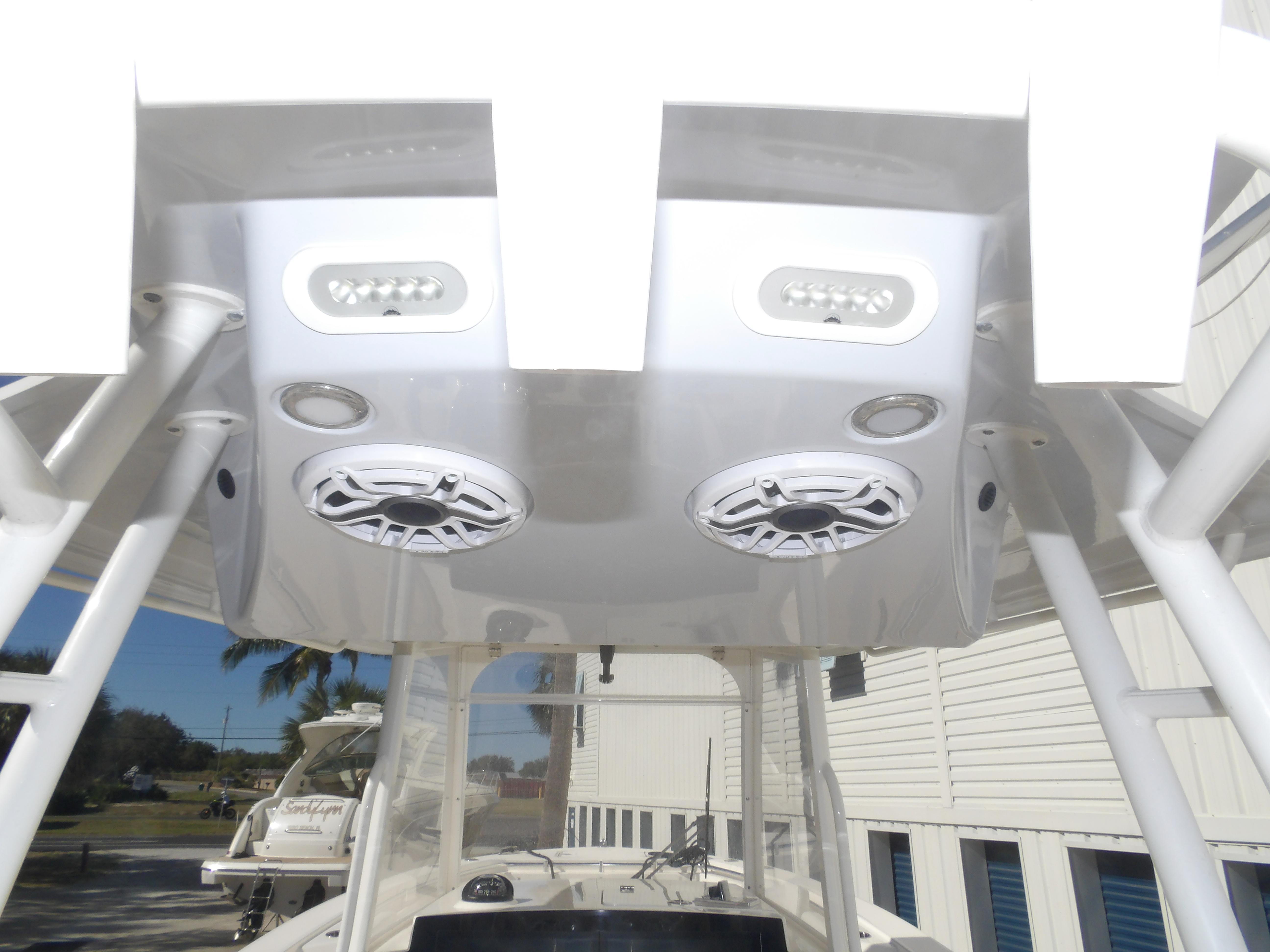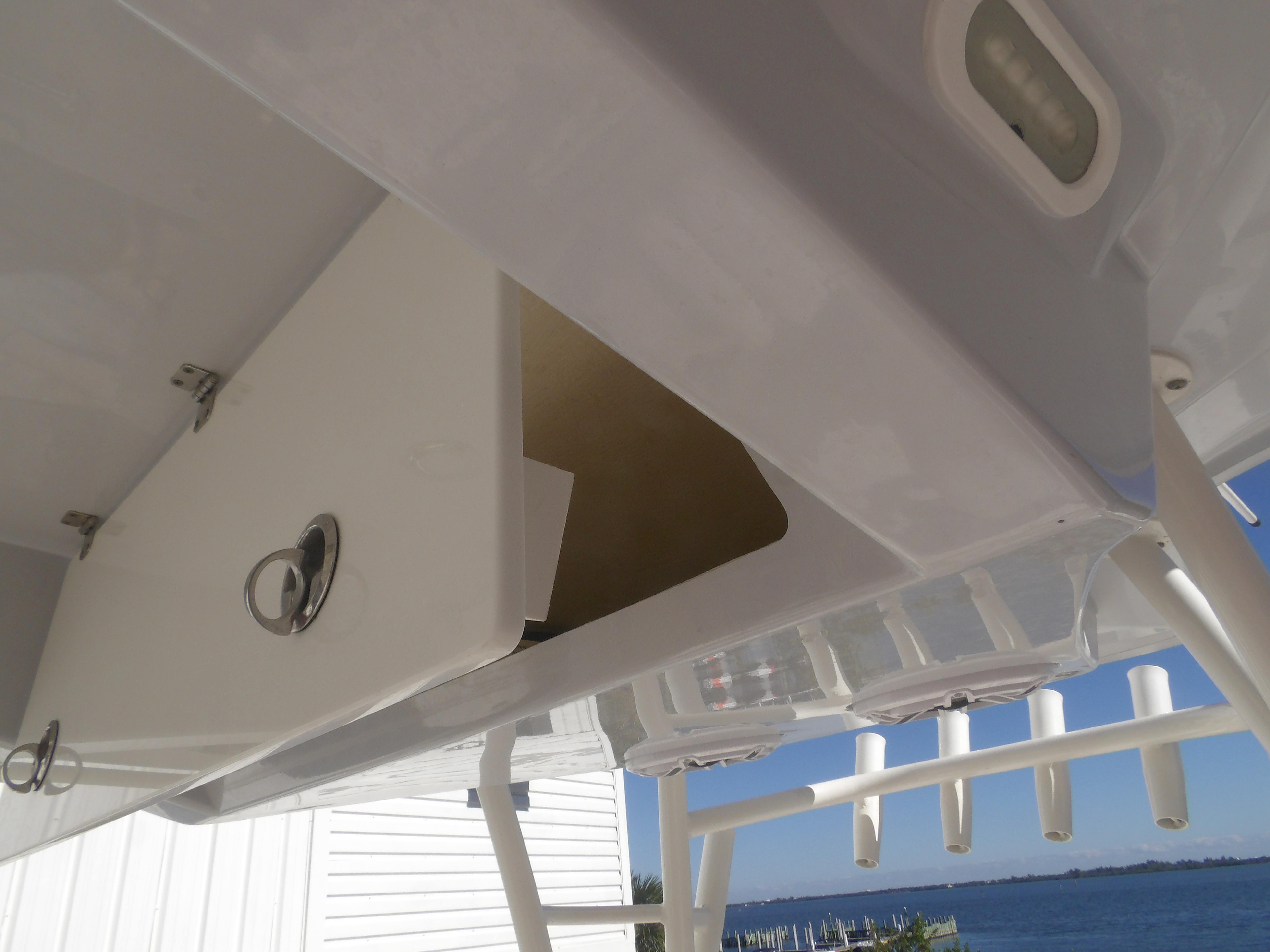 A fiberglass hardtop with aluminum frame keeps the storage center, helm and forward console seat in the shade, and features an integrated electronics box, storage, and LED lighting fore and aft. A five-rod rocket launcher and additional rod holders on the frame, including a pair angled for trolling kingfish-style, are among the many available options. In addition, 11 flush-mounted rod holders sit properly spaced along the covering boards, and a horizontal rack under the portside gunwale tacks additional rod storage.