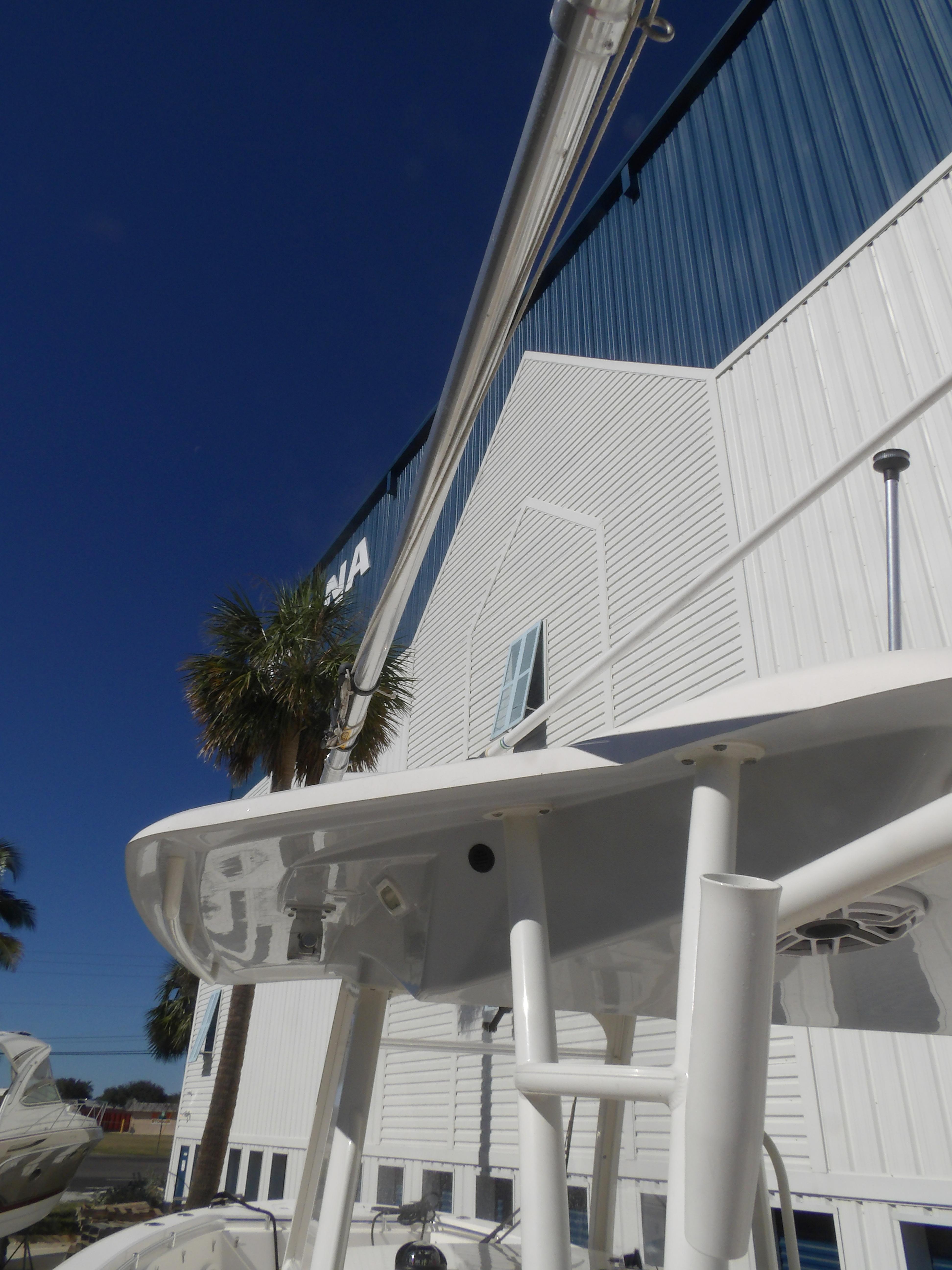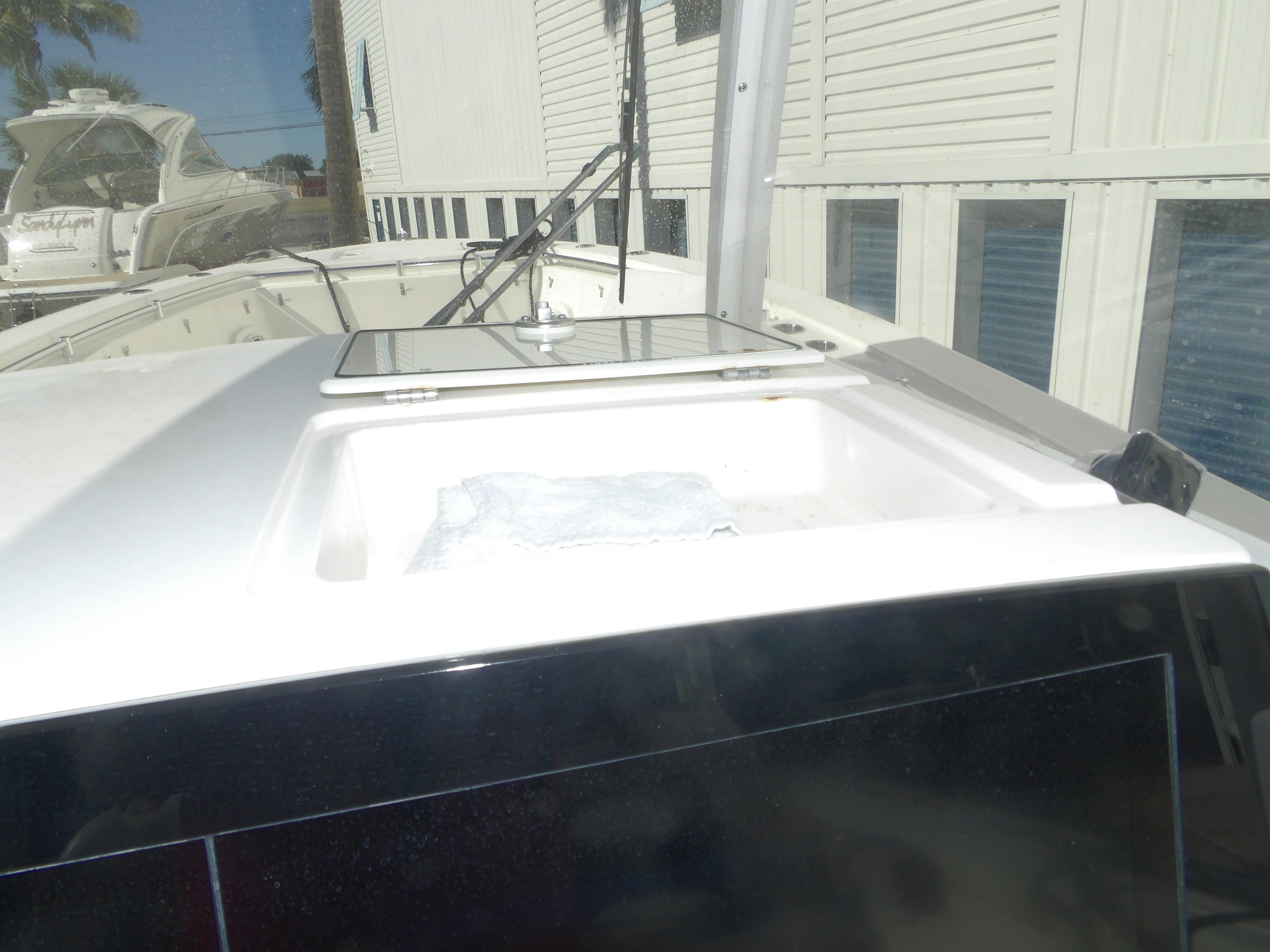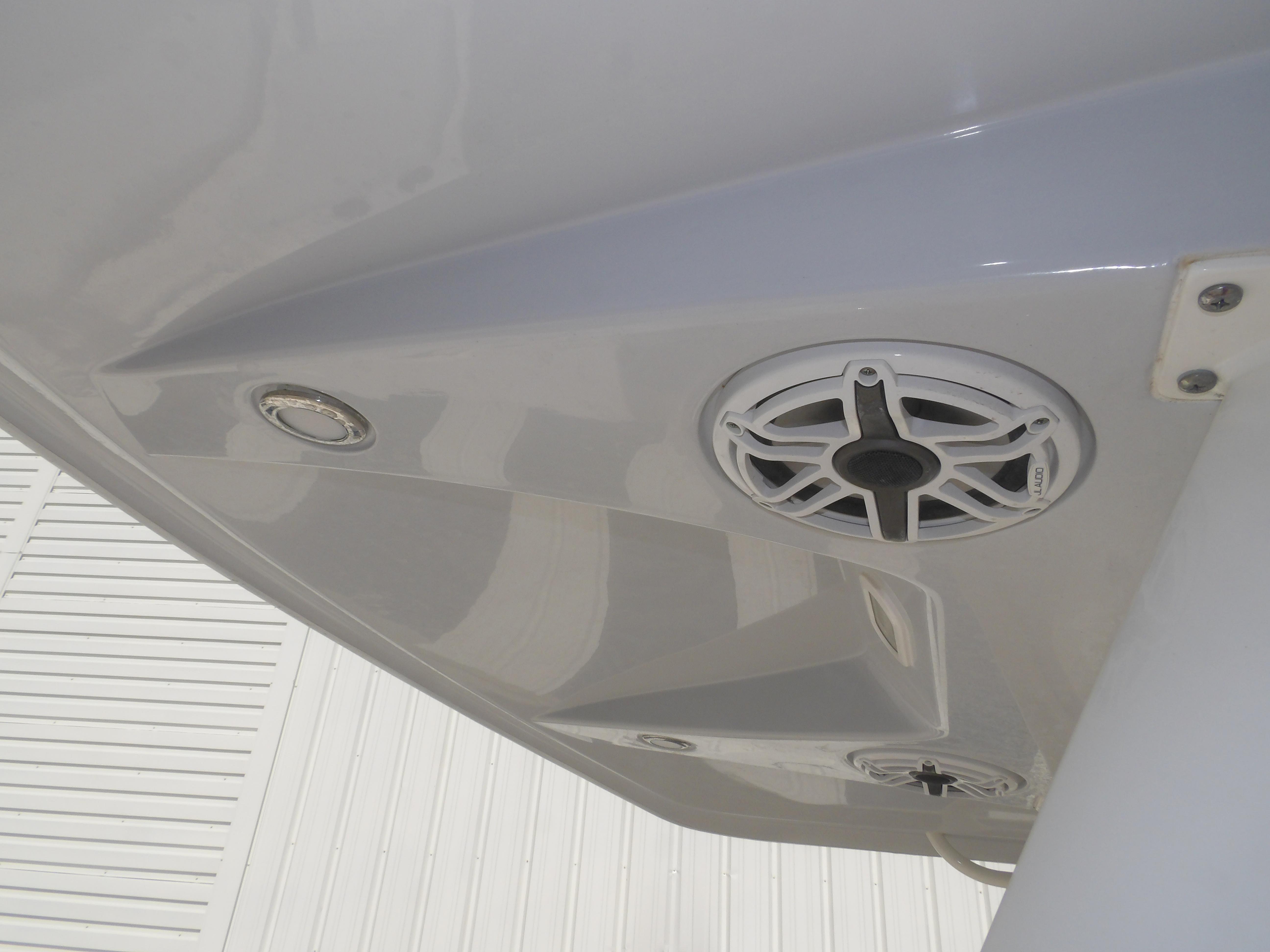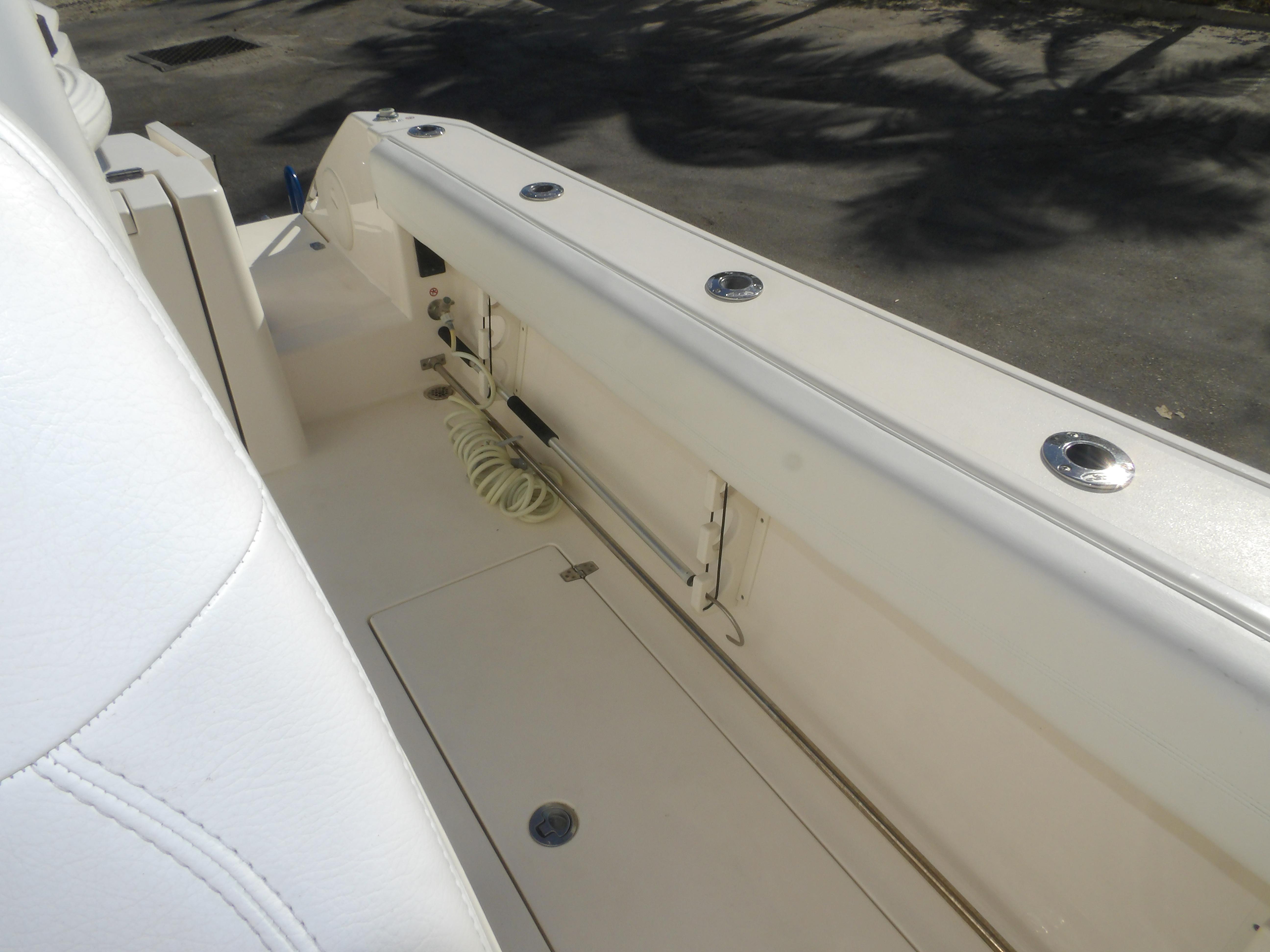 A fiberglass hardtop with aluminum frame keeps the storage center, helm and forward console seat in the shade, and features an integrated electronics box, storage, and LED lighting fore and aft. A five-rod rocket launcher and additional rod holders on the frame, including a pair angled for trolling kingfish-style, are among the many available options. In addition, 11 flush-mounted rod holders sit properly spaced along the covering boards, and a horizontal rack under the portside gunwale tacks additional rod storage.