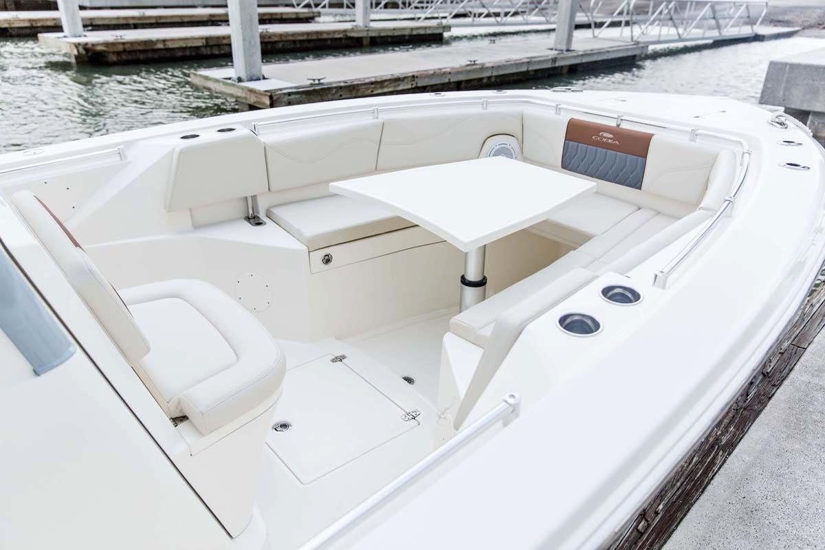 A hatch in the bow conceals a dedicated anchor locker complete with windlass and is part of an elevated platform (where the covering boards meet) large enough to serve as a perch from which to cast-net bait when conditions allow. Above-deck compartments to port and starboard provide bow seating for four to six people. A filler plank that butts against the forward bulkhead completes the U-shaped cushioned seating with ample storage underneath. A recessed grab rail traces the contour of the bow-seating backrests, which include two separate end sections that turn to face forward for lounging. And when it's time for lunch or drinks, a table with fiberglass top that resides in the deck rises at the touch of a button.