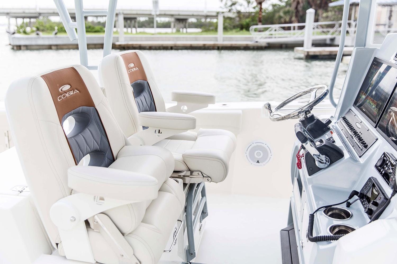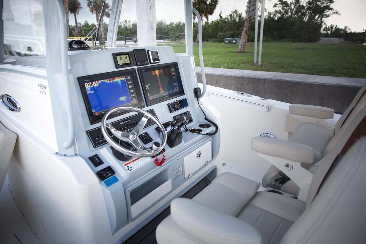 The helm side of the console incorporates a drop-in electronics pod with dimensions to hold dual 16-inch multifunction displays, plus digital gauges, a VHF radio, stereo, and full array of switches and control elements. A few inches below, the tilt steering wheel and throttle control are perfectly situated for easy reach and unobstructed view of the MFDs, while a storage cubby and a glove compartment keep cellphones and valuables safe and at arm's length. An optional integrated windshield protects the skipper and a companion from rain and spray, while a pair of comfy helm chairs with flip-up bolsters and arm and footrests enable driving while either sitting or standing.