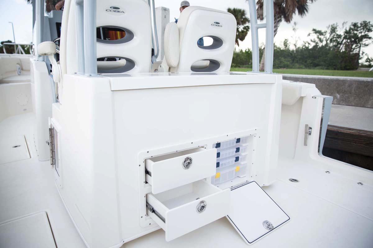 Behind the helm seats, a tackle-storage center complete with a bait-prep area and sink faces the roomy cockpit.