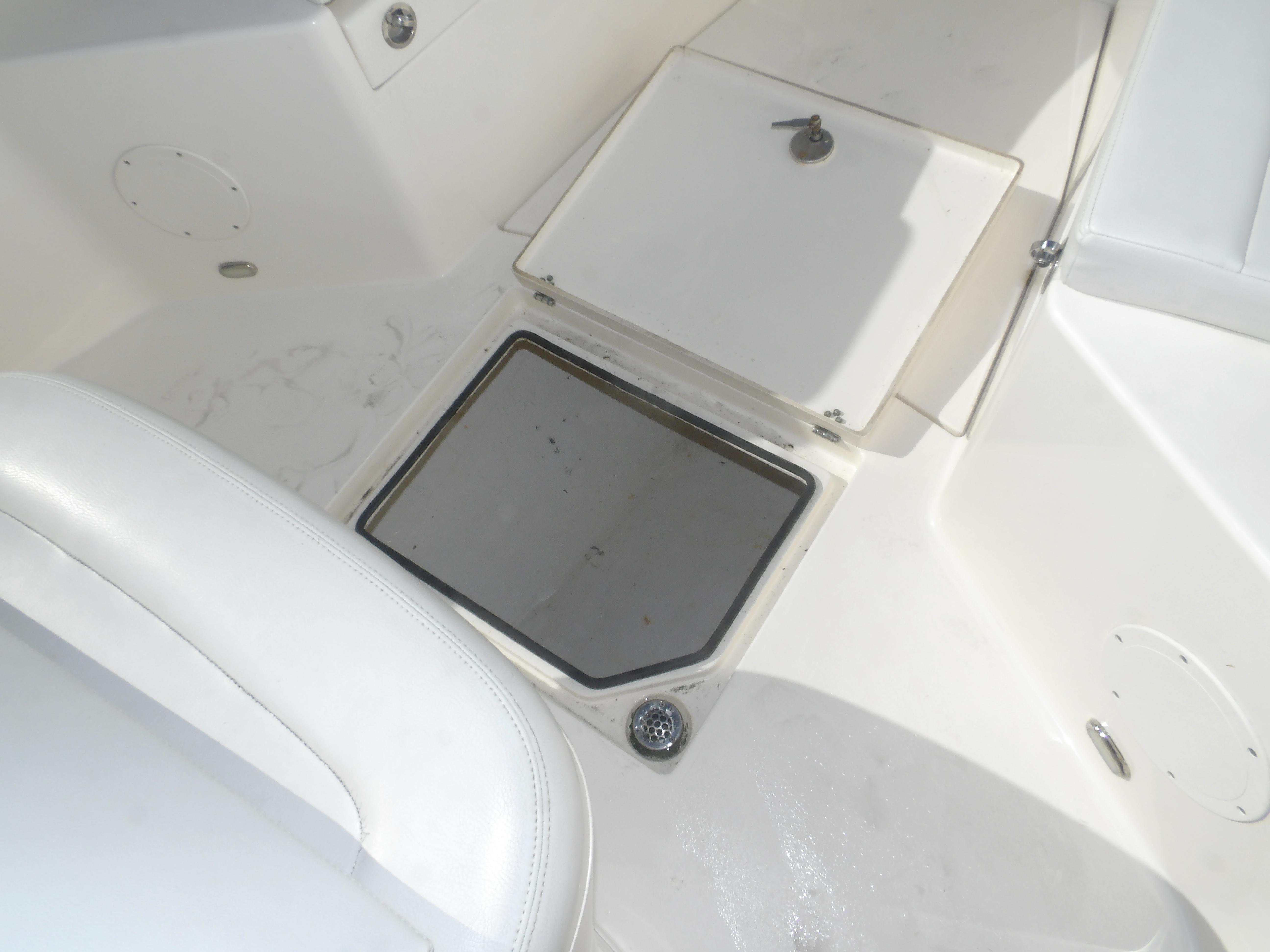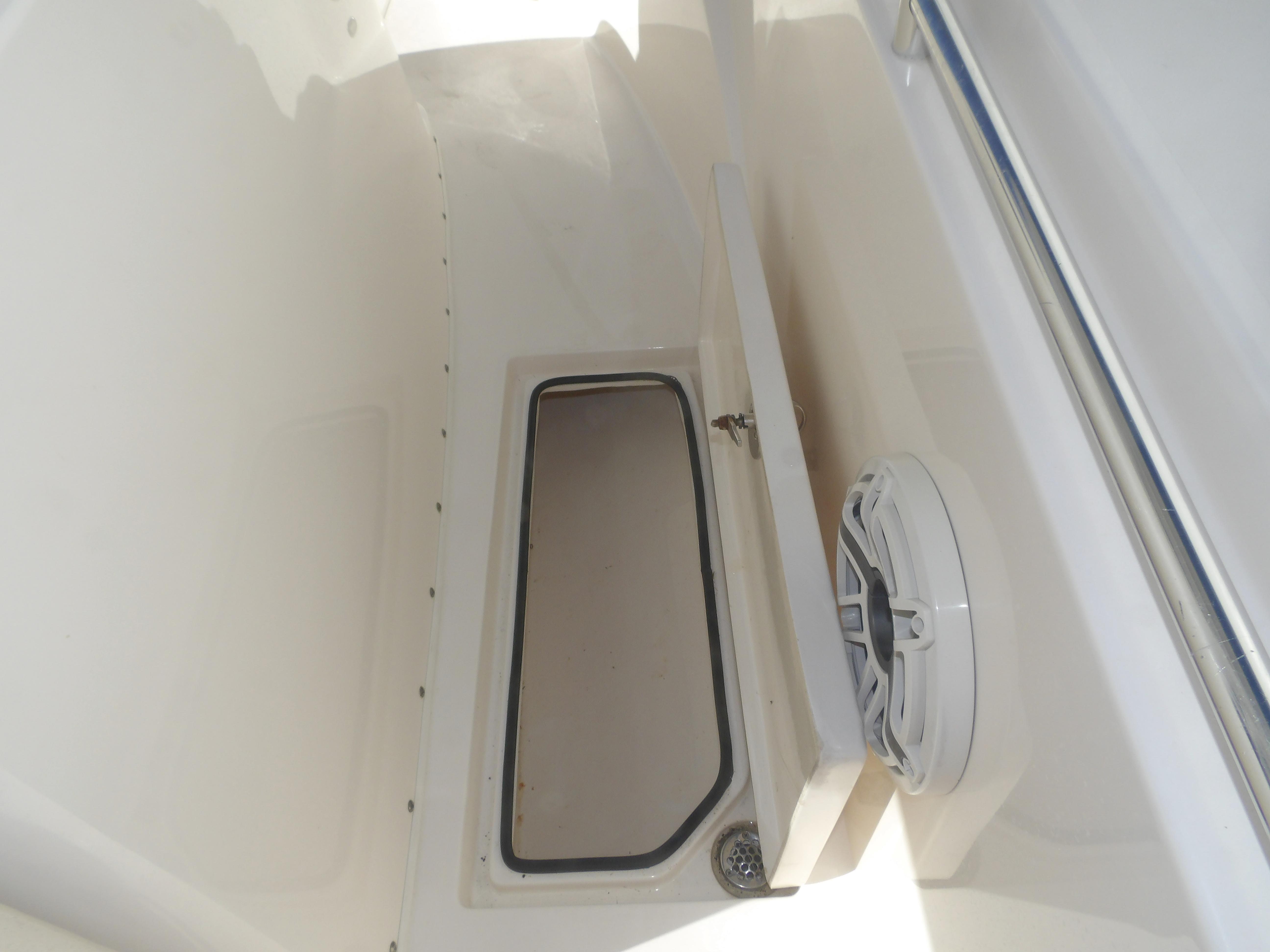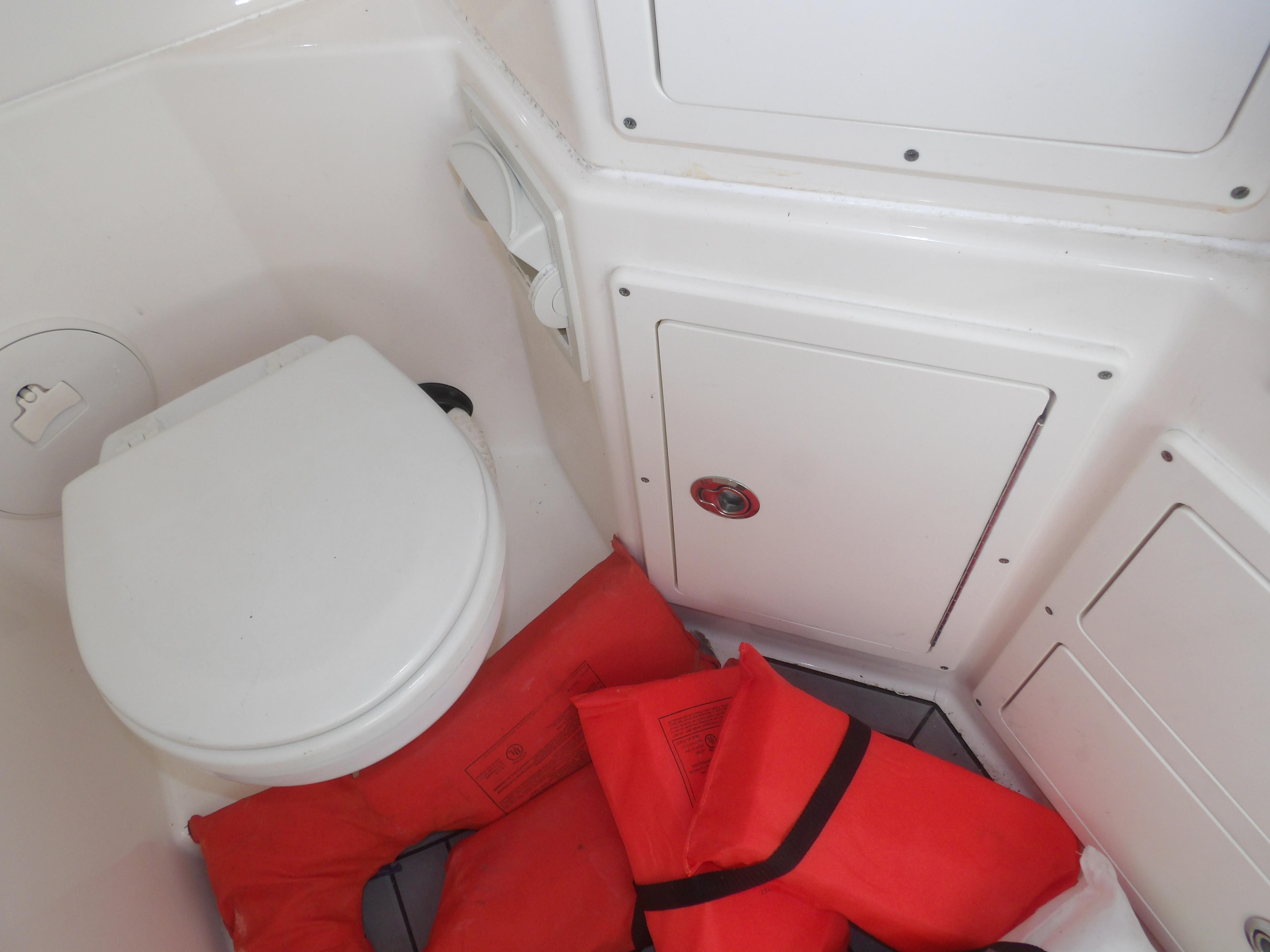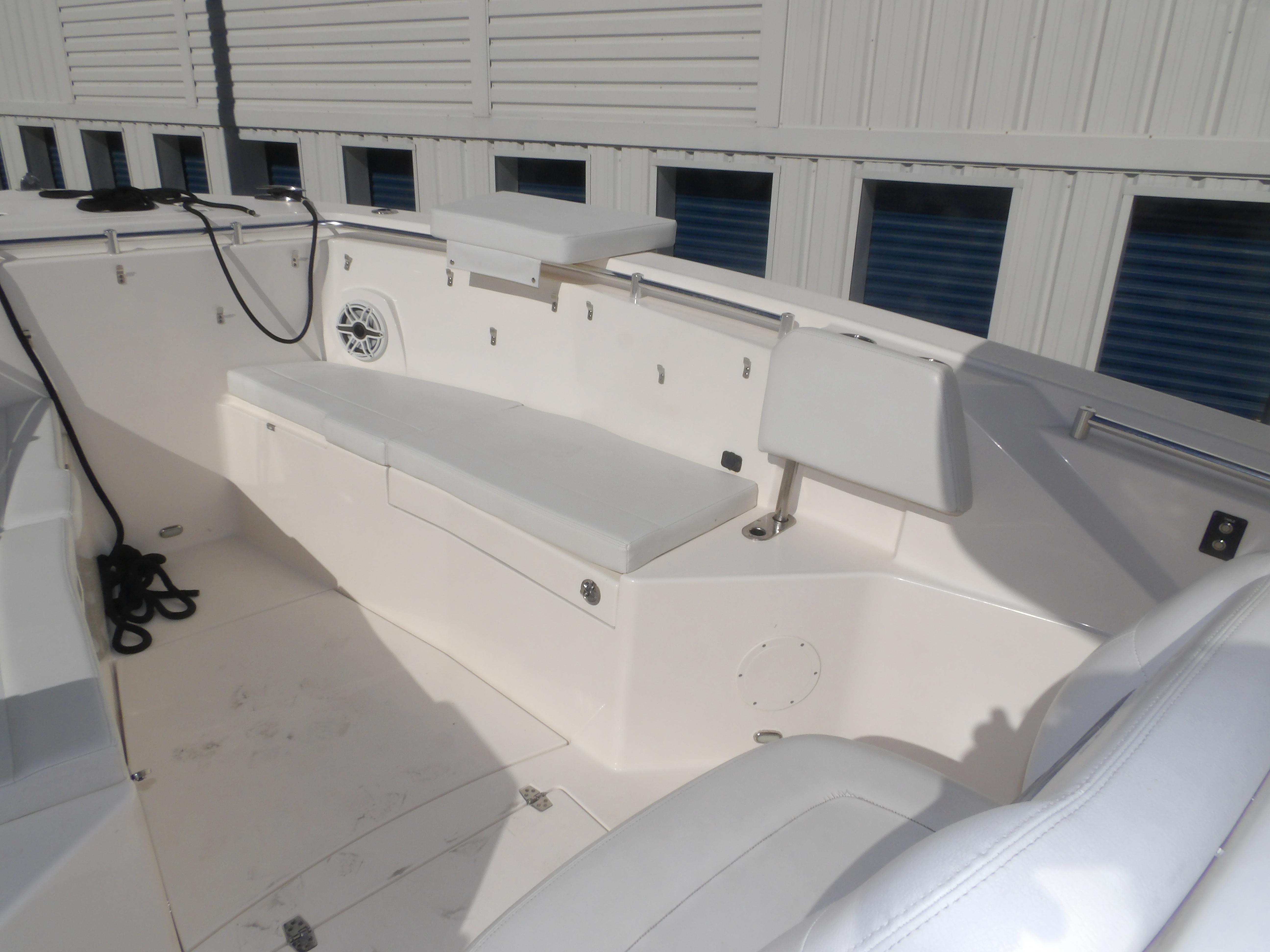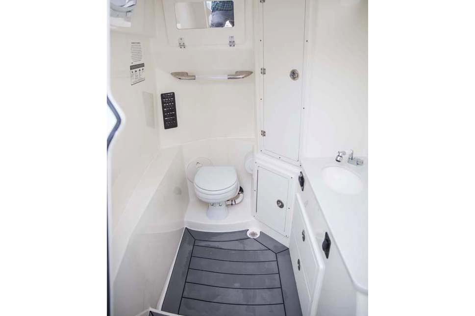 The forward seat of the center console accommodates two, houses a 72-quart cooler beneath, and is integrated into the front fascia, which swings open to a spacious step-down head compartment with 6 feet 2 inches of height clearance, conveniently appointed with an electric marine toilet with macerator, vanity, Corian counter, sink, freshwater faucet/pull-out shower, closet with hangers and storage cabinet. A large in-deck compartment in front of the console stows fenders, buoys, cast nets and other wet gear.