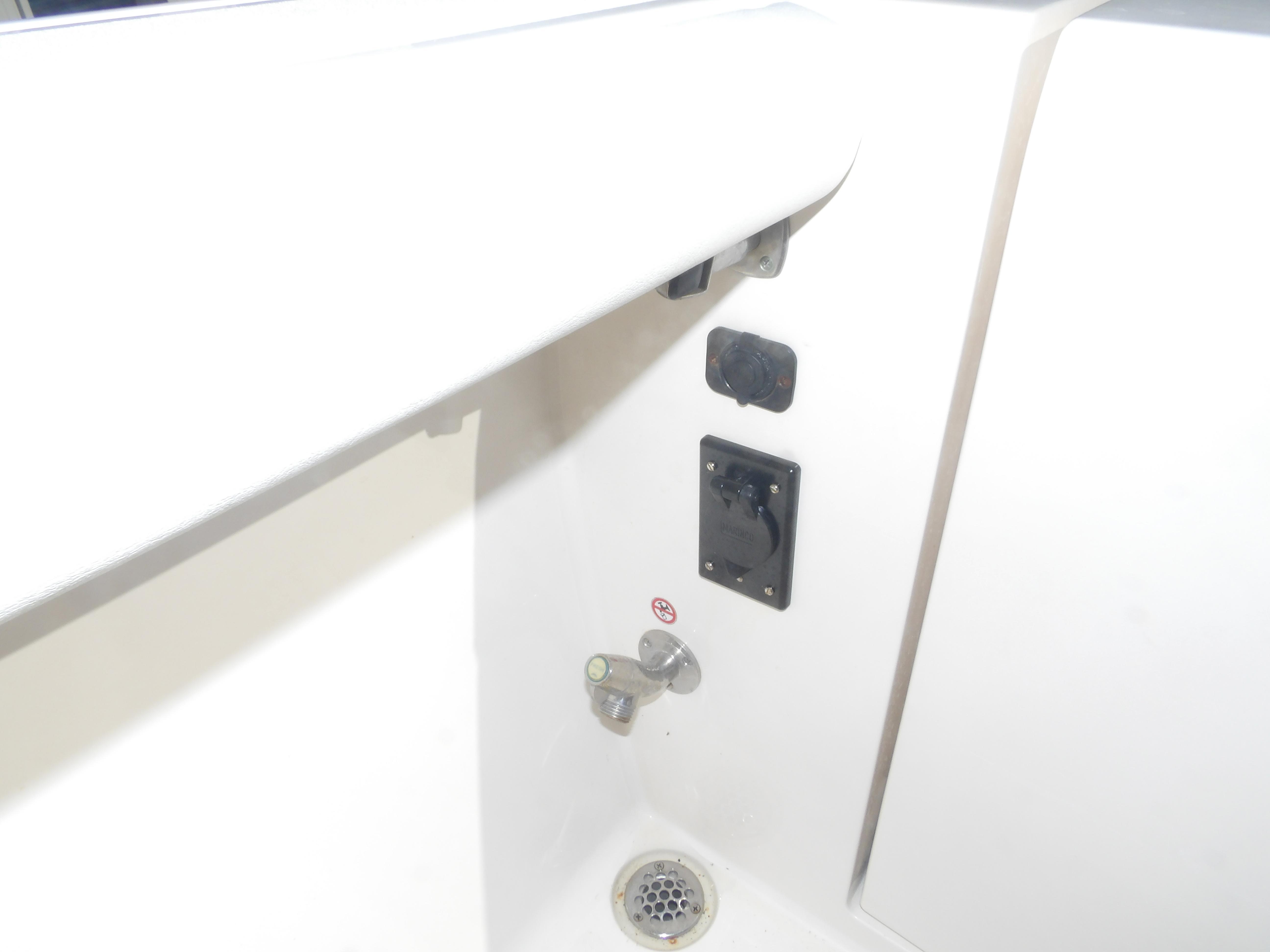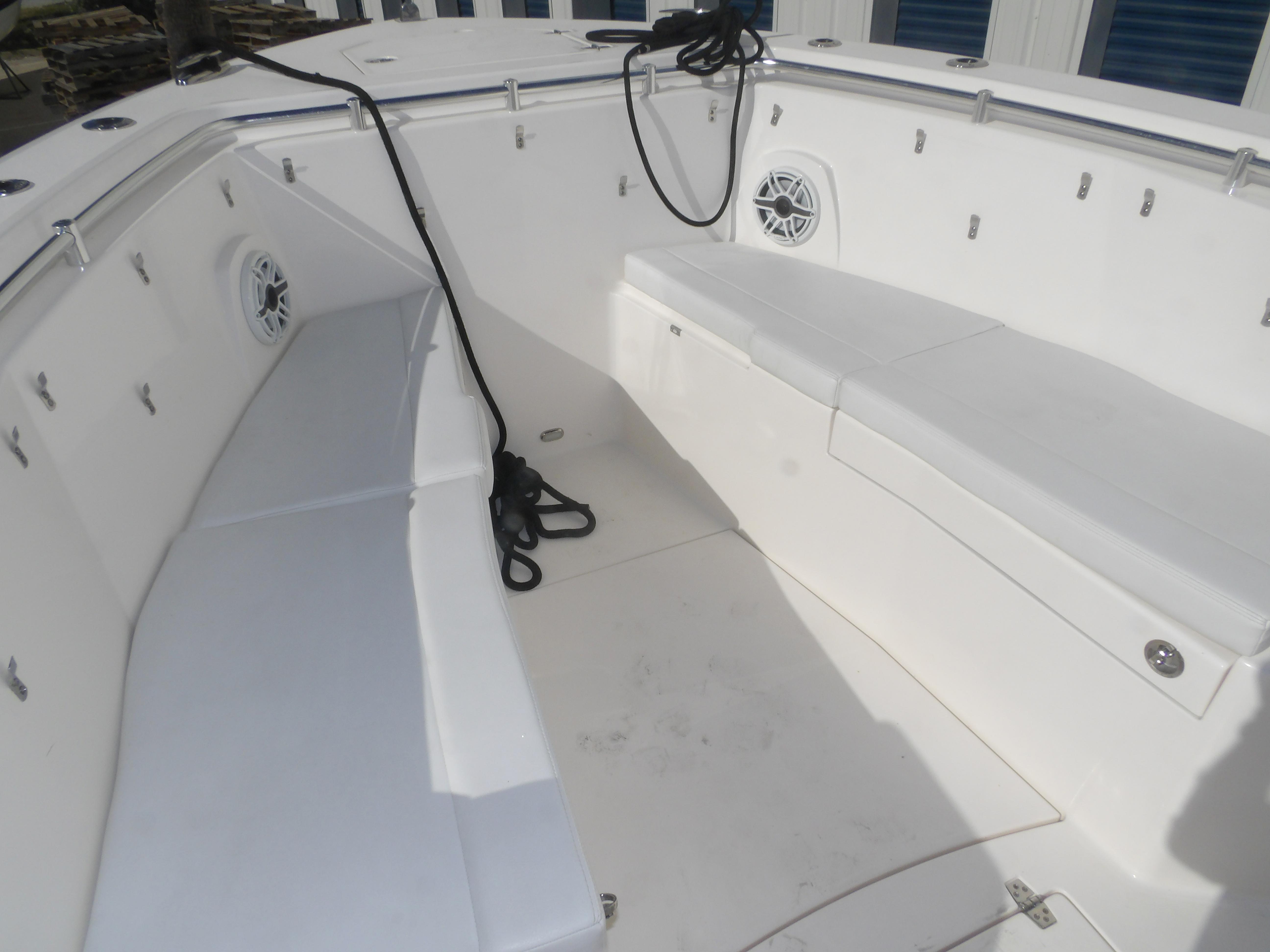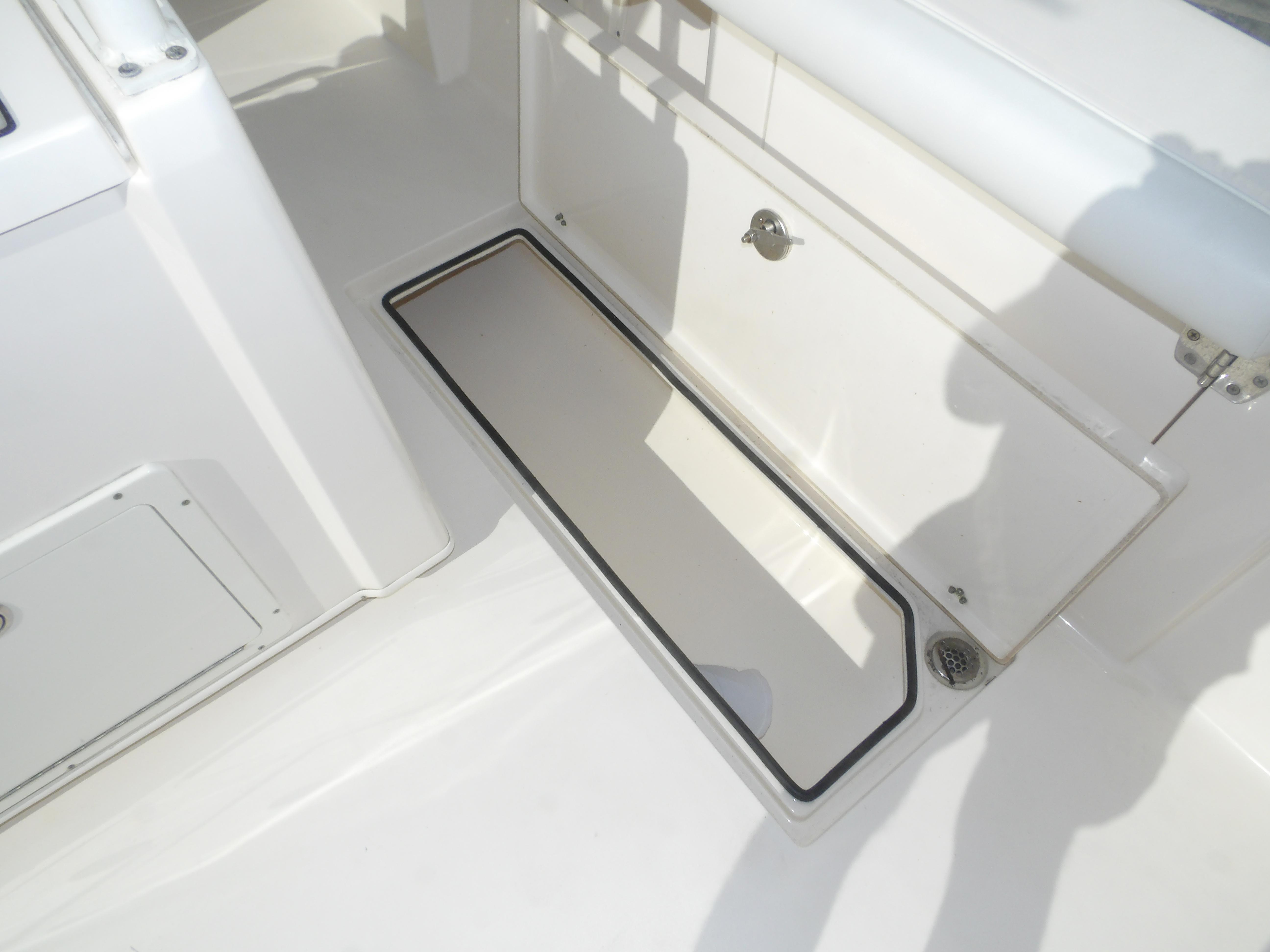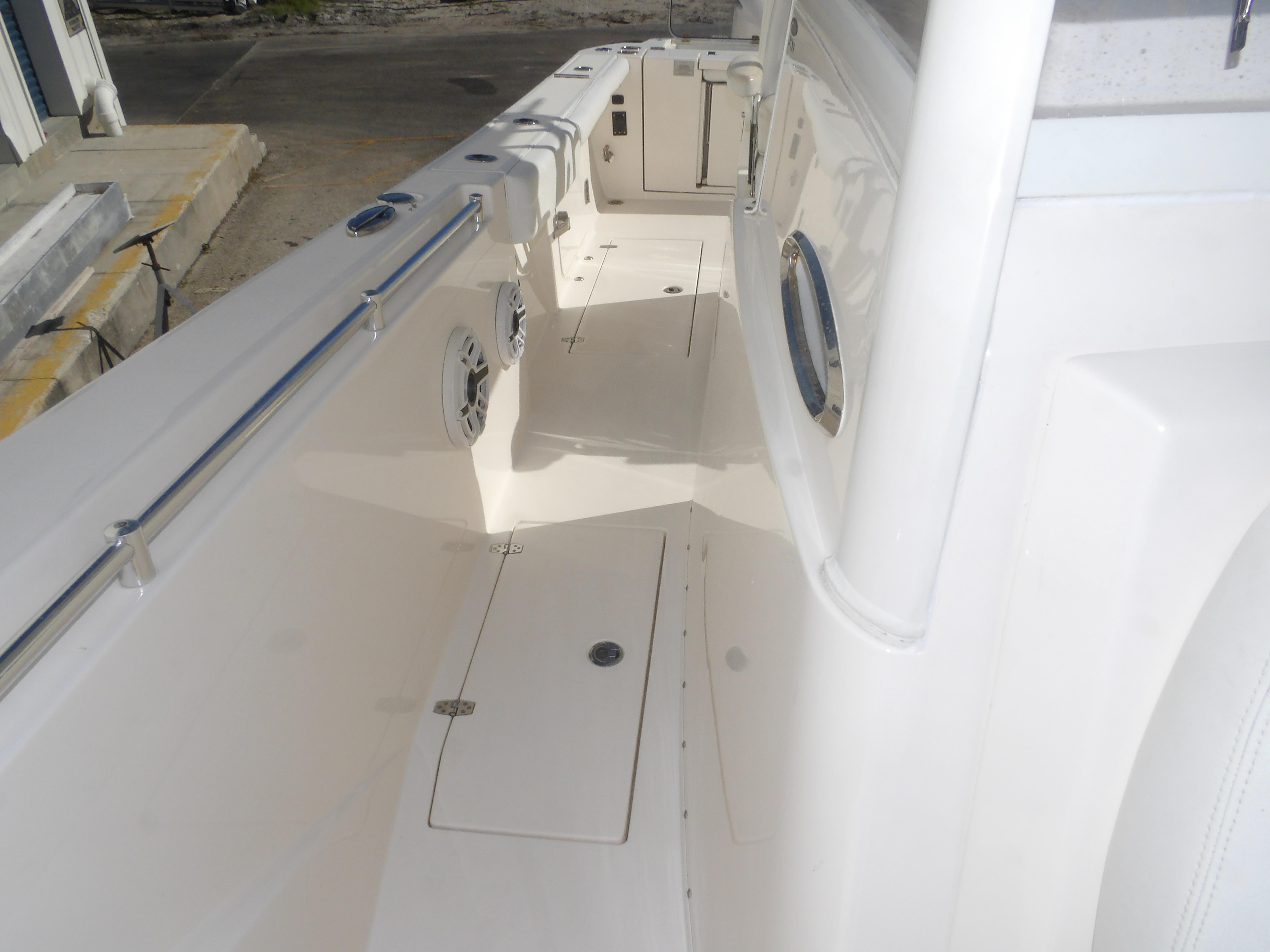 The forward seat of the center console accommodates two, houses a 72-quart cooler beneath, and is integrated into the front fascia, which swings open to a spacious step-down head compartment with 6 feet 2 inches of height clearance, conveniently appointed with an electric marine toilet with macerator, vanity, Corian counter, sink, freshwater faucet/pull-out shower, closet with hangers and storage cabinet. A large in-deck compartment in front of the console stows fenders, buoys, cast nets and other wet gear.