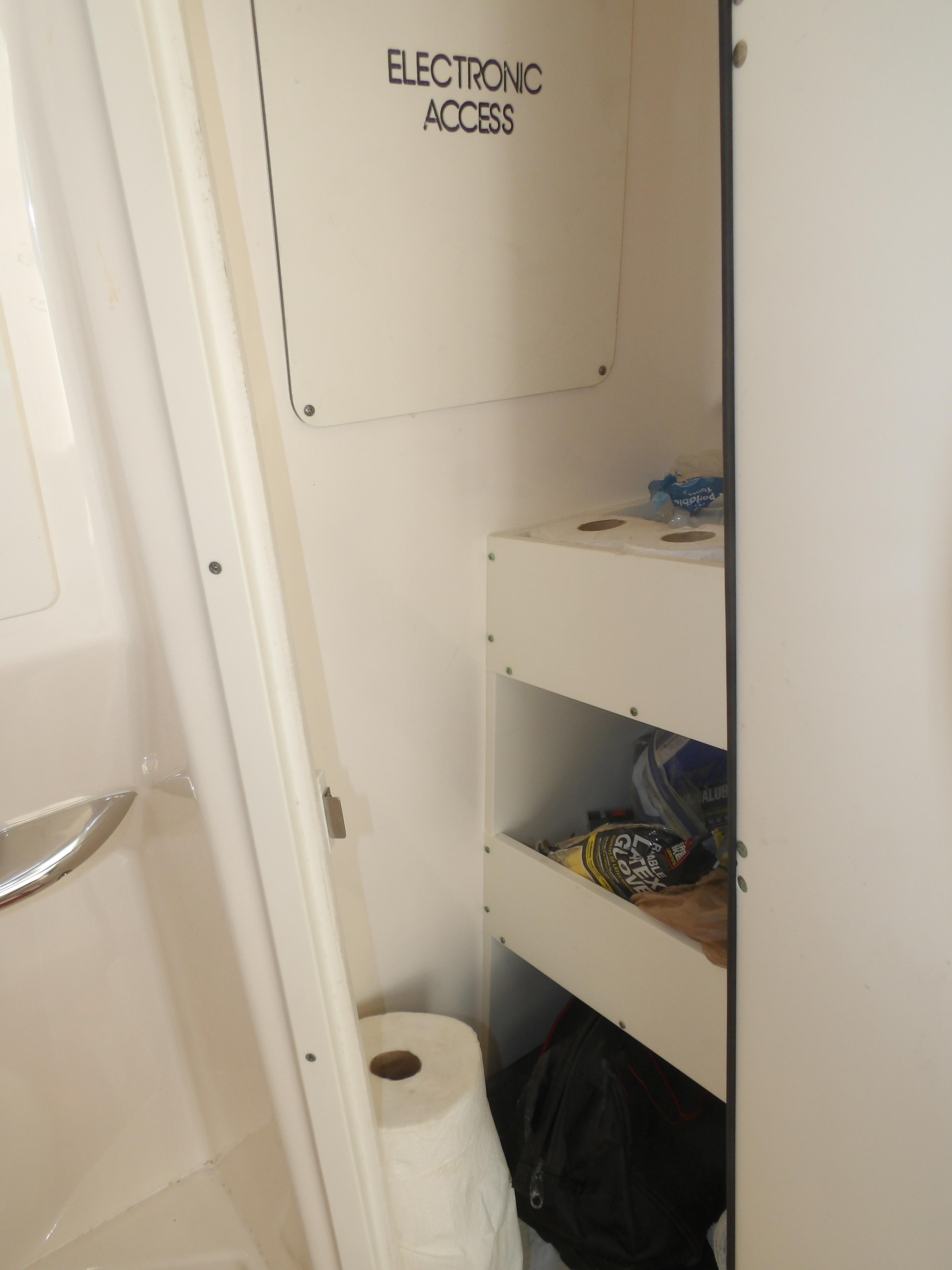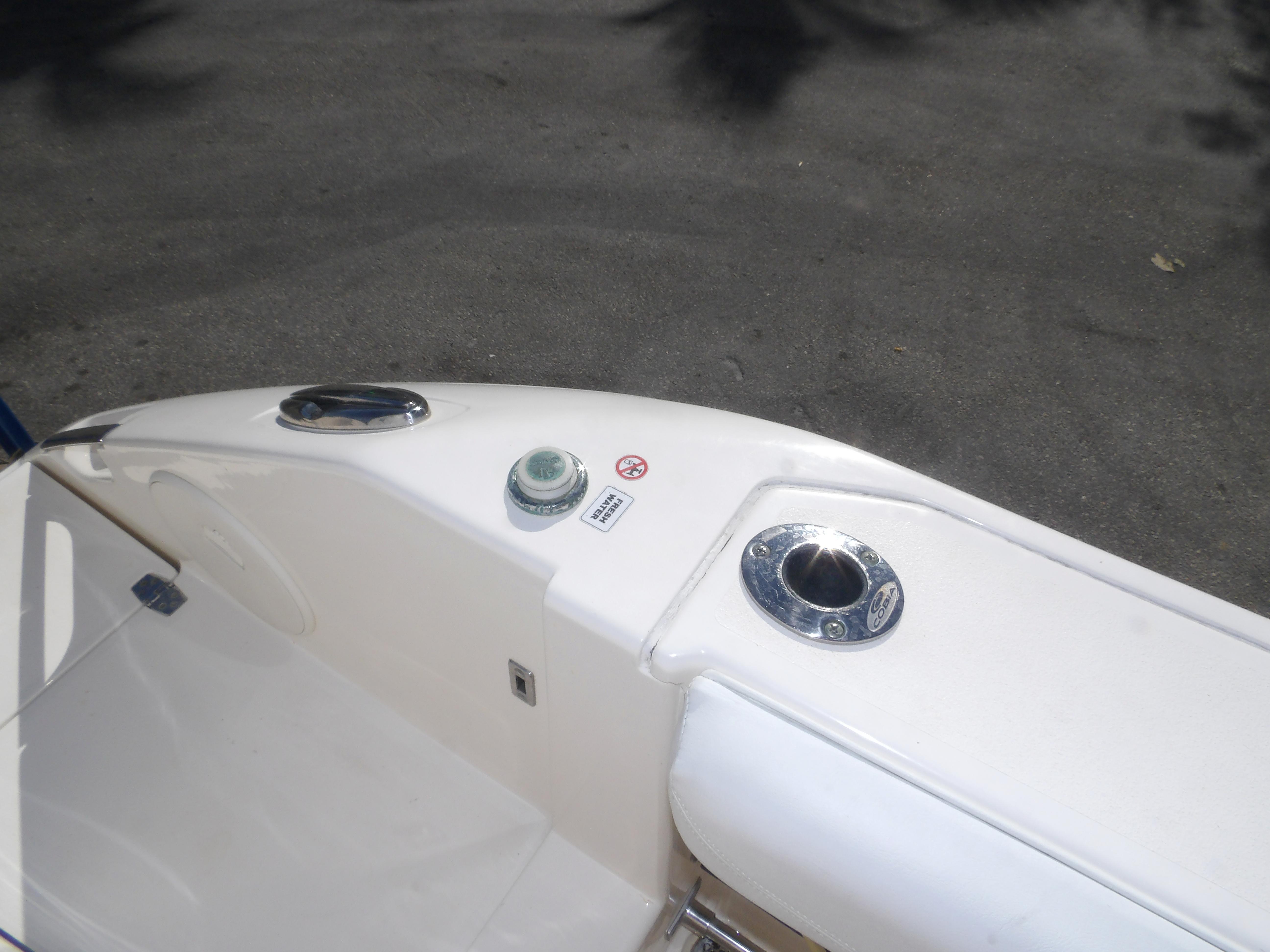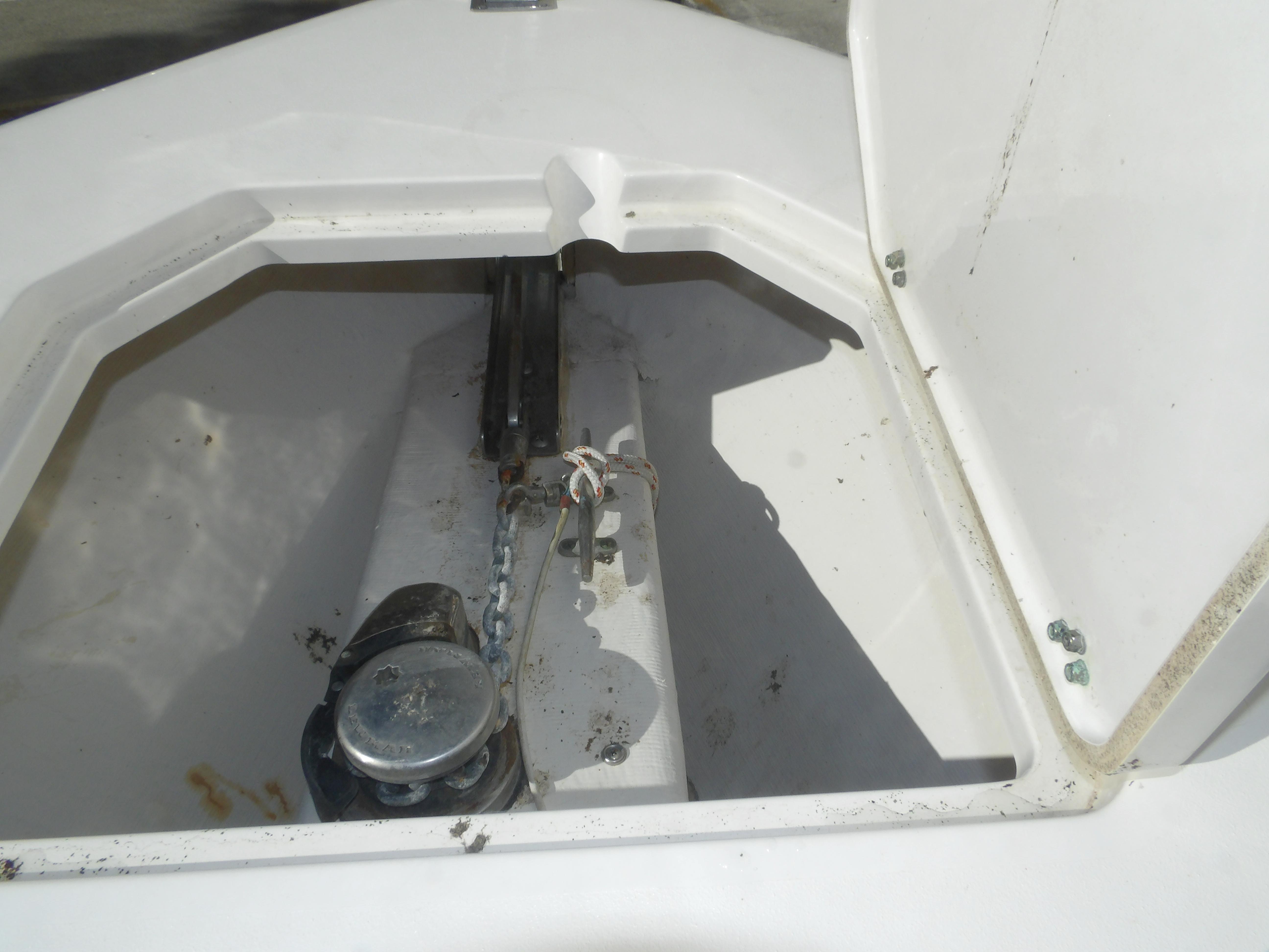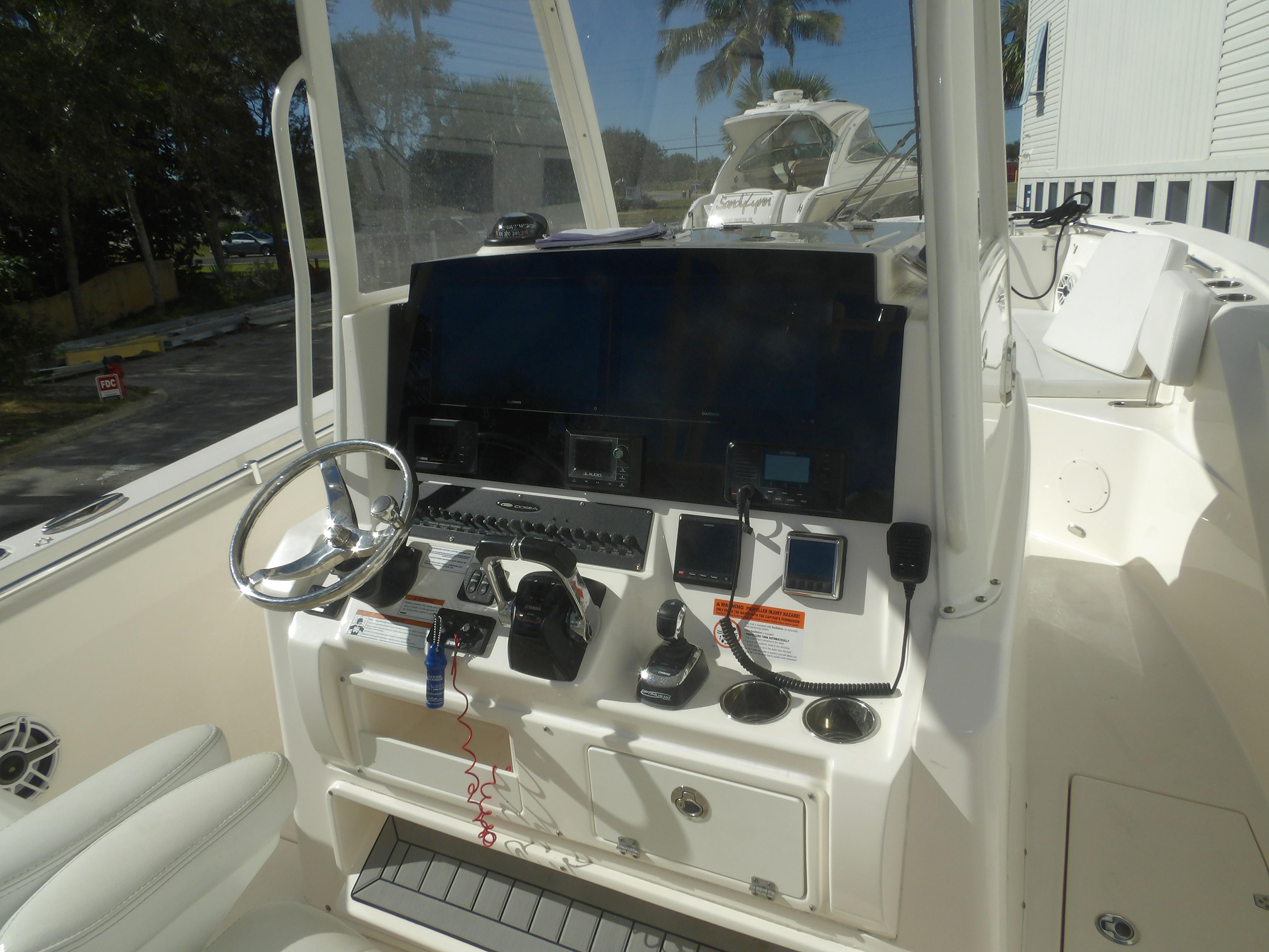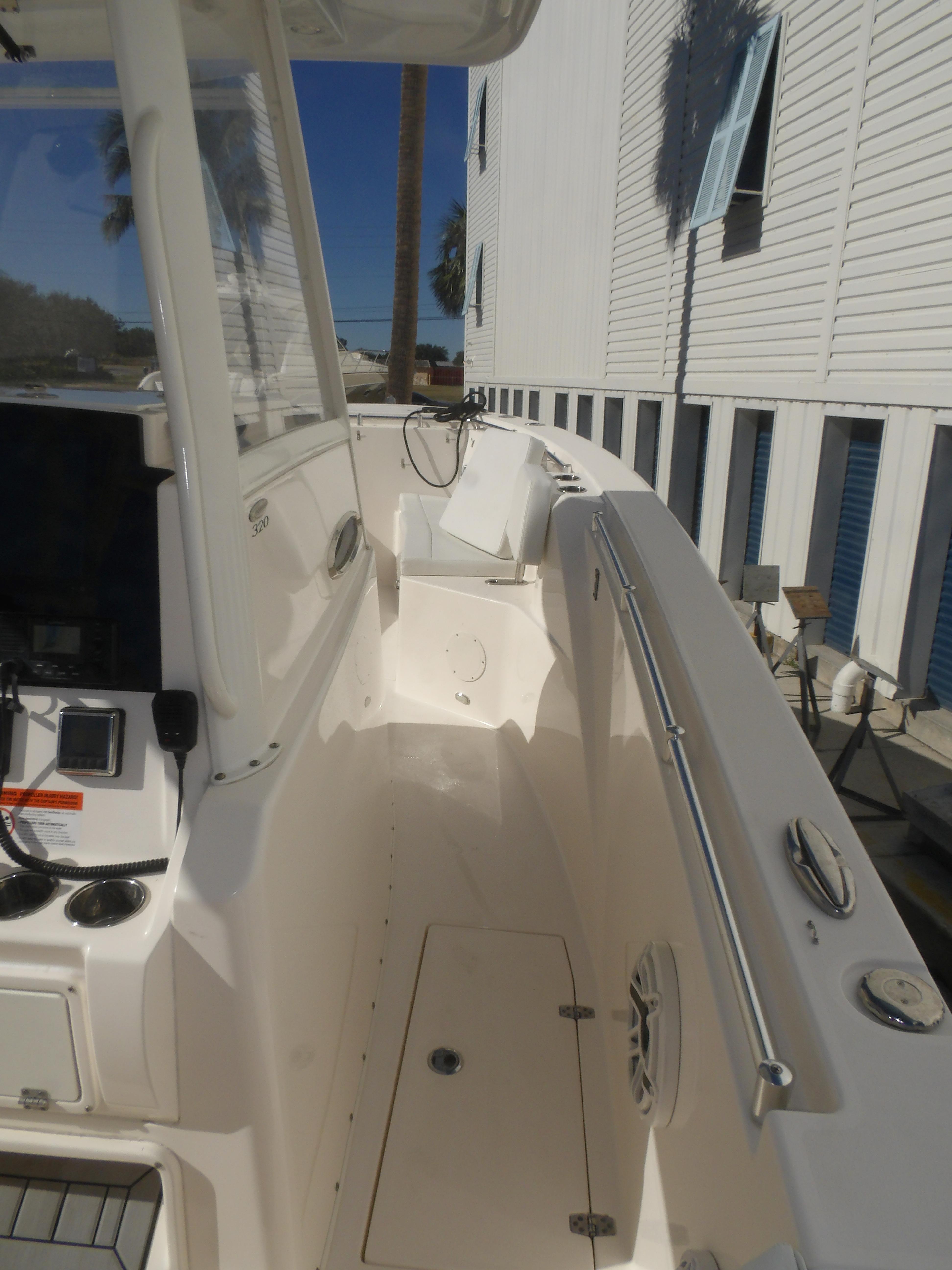 The forward seat of the center console accommodates two, houses a 72-quart cooler beneath, and is integrated into the front fascia, which swings open to a spacious step-down head compartment with 6 feet 2 inches of height clearance, conveniently appointed with an electric marine toilet with macerator, vanity, Corian counter, sink, freshwater faucet/pull-out shower, closet with hangers and storage cabinet. A large in-deck compartment in front of the console stows fenders, buoys, cast nets and other wet gear.