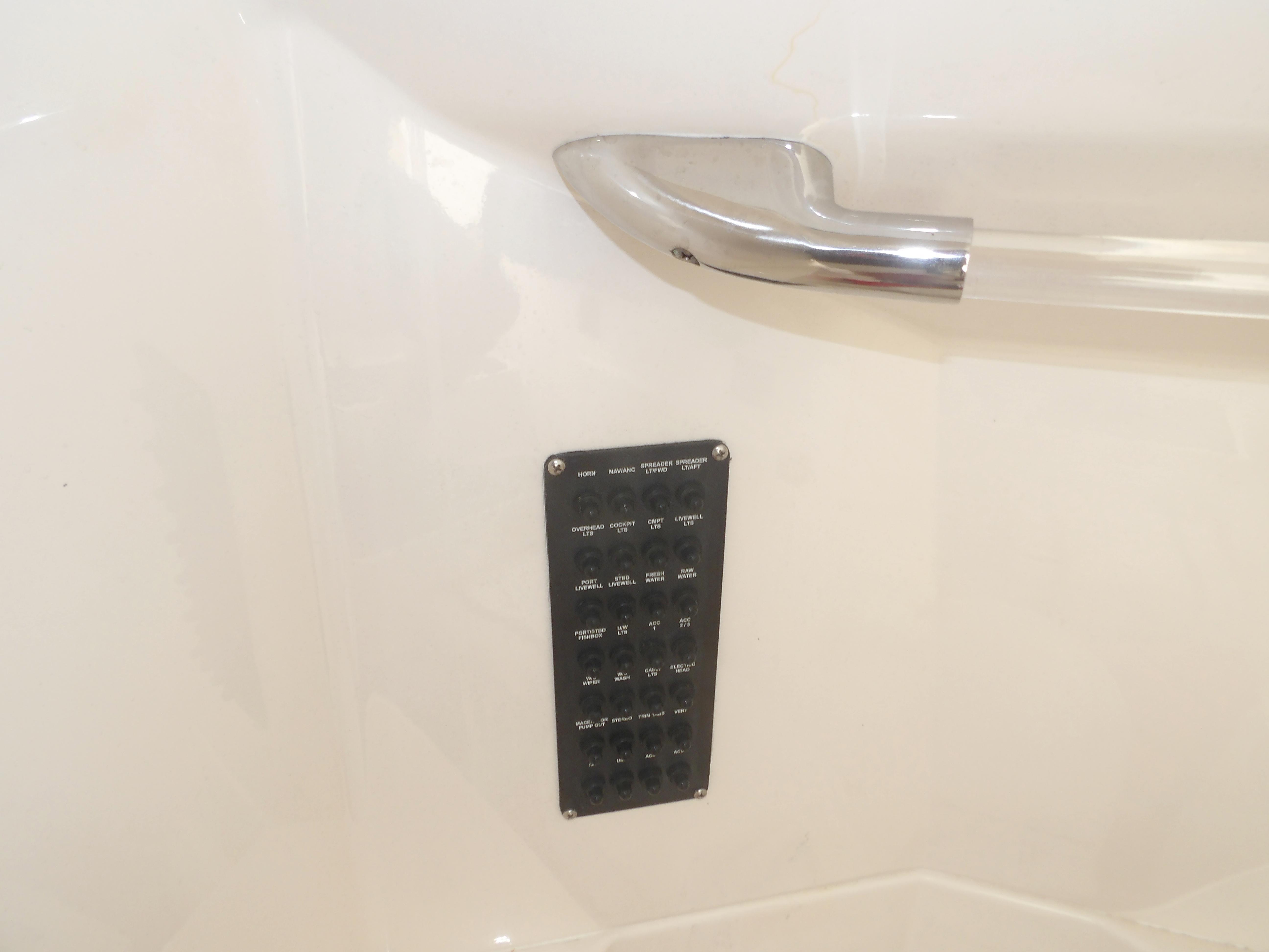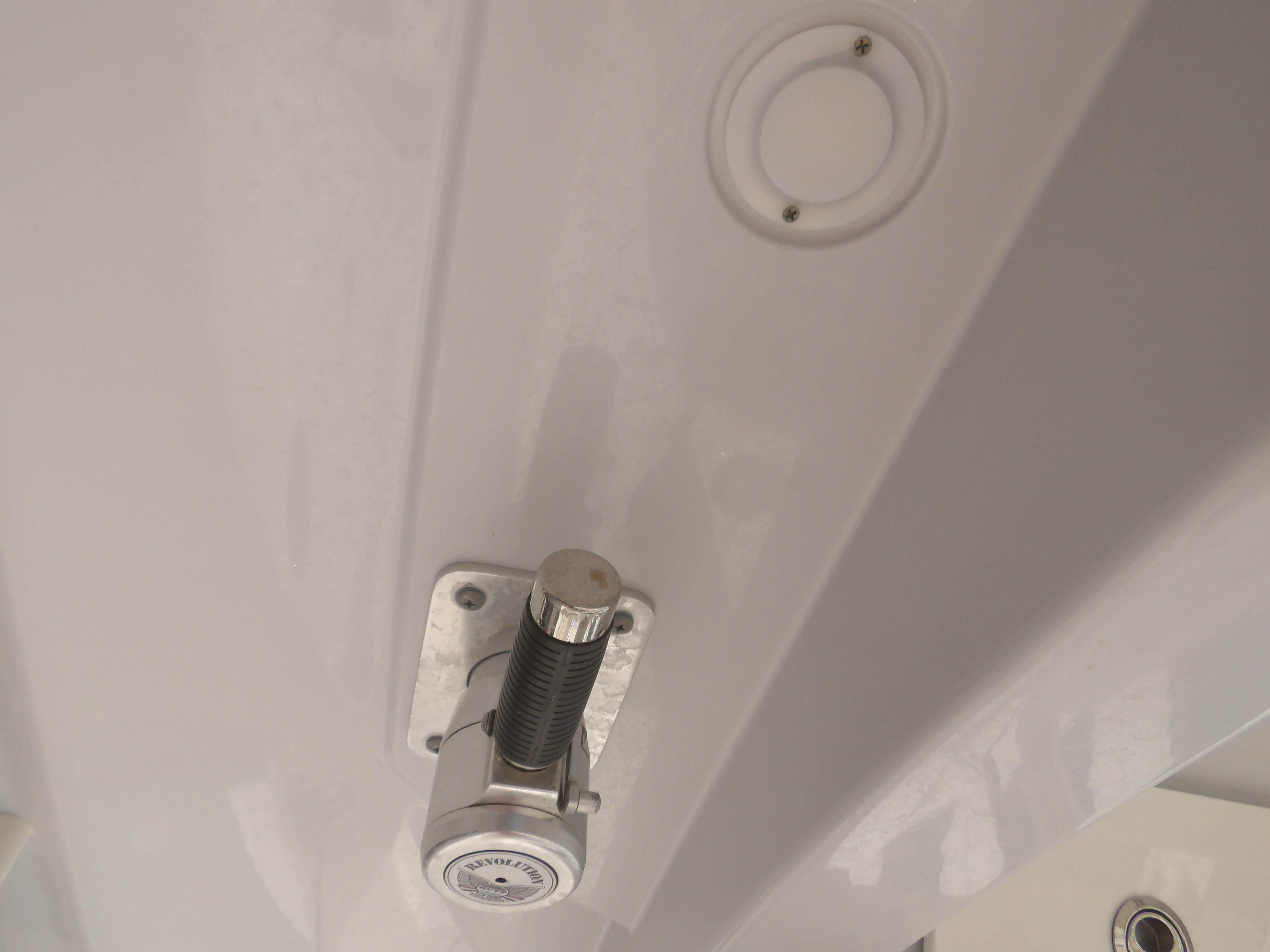 A transom bench for two affords seating in the rear. It easily folds away when fishing, and the entire module that it folds into lifts electronically for instant, unhindered access to the bilge and the livewell hoses and wiring. Raw- and freshwater washdowns rest out of the way in opposite cockpit corners, below coaming bolsters; toe rails lend stability and leverage to anglers coaxing fish up from the depths; and an inward-opening side door to starboard simplifies boarding and loading at the dock, going for a swim, or boating a heavy catch.