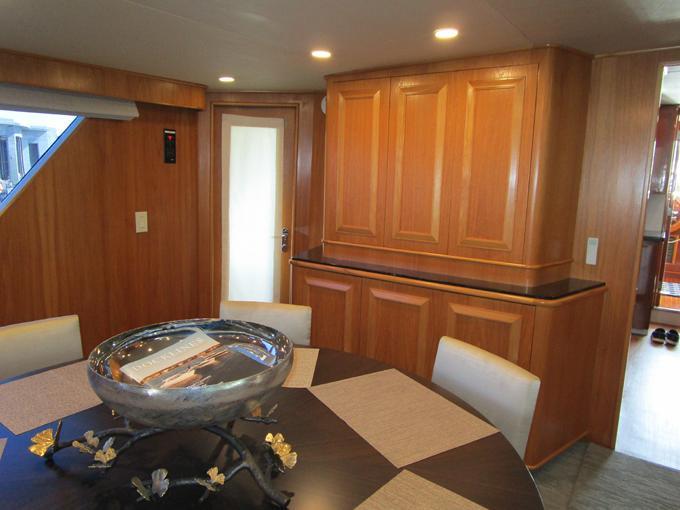 Open to the Salon aft, the Dining Salon has a round six place table with upholstered chairs to the port side. Built-in raised panel cabinets forward to port with three above and three below a marble shelf (with drawers within) were built to store all the yacht’s glasses and dinnerware. Outboard is the side deck glass framed entry door. Just inside the door are Emperador dark marble tiles.
