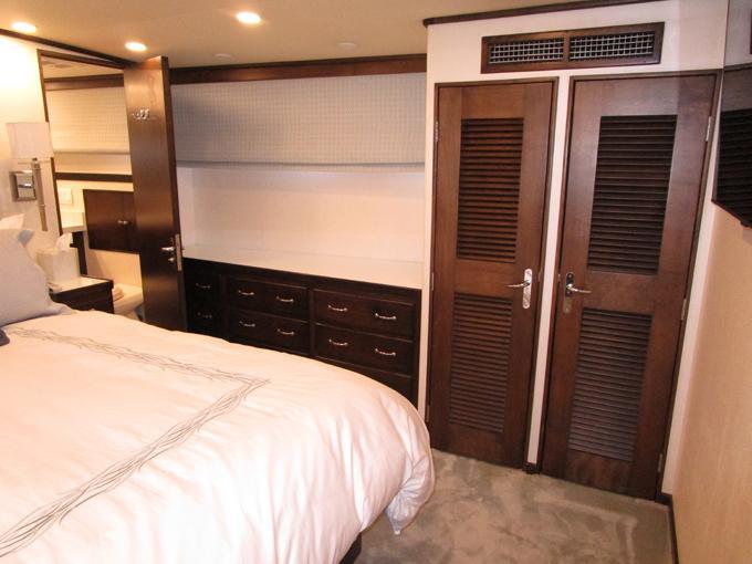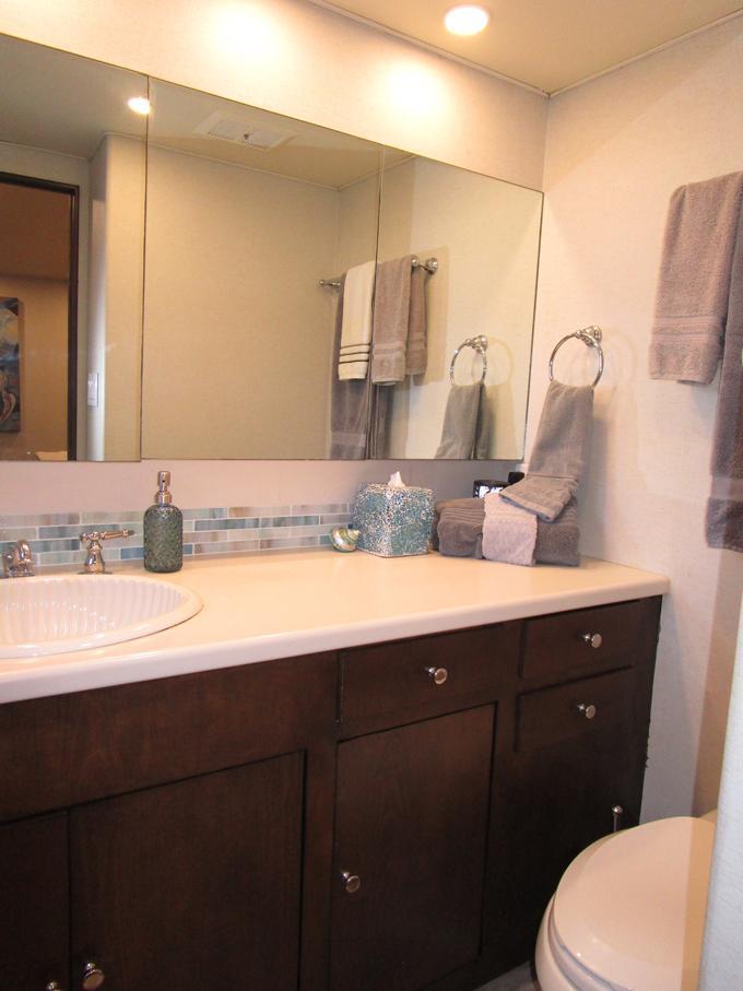 The Day Head has a Headhunter toilet, vanity with sink above and storage below and beautiful decorative tile around the two-sided mirror that makes this small area seem much larger.