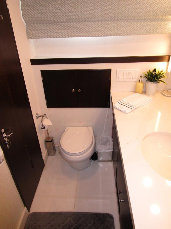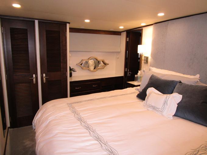 Further outboard is the entertainment center with joinery that matches that of the dining area. Within the two forward cabinets is a Sony audio/video receiver, the aft deck Direct TV receiver and the salon’s Direct TV DVR. Above is a 70” Samsung Smart TV with two storage cabinets below. Aft are two more cabinets with the salon A/C air handler within. The entire cabinet has a matching marble top to the rest of the area. Also in the salon is a contiguous carpeted sole, digital A/C controls, 16 overhead LED lights and a 5-channel stereo system overhead.