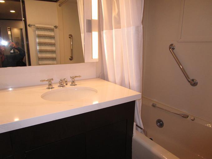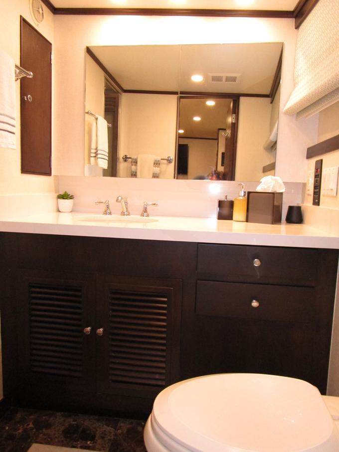 Next aft is a marble topped two door storage cabinet with two drawers within.