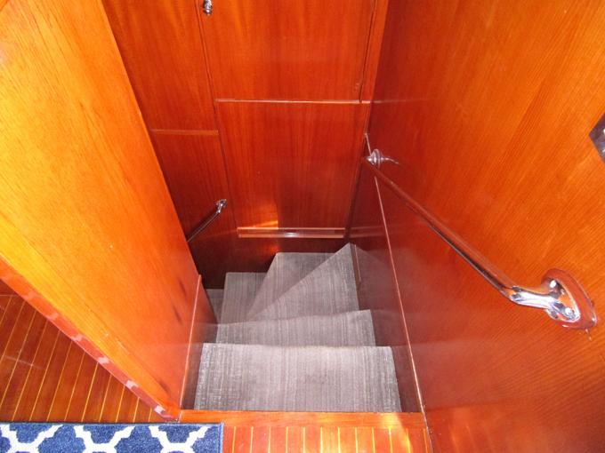 Aft are steps to the Flybridge and a slim storage locker. Forward to starboard are steps to the engine room and crew cabins.