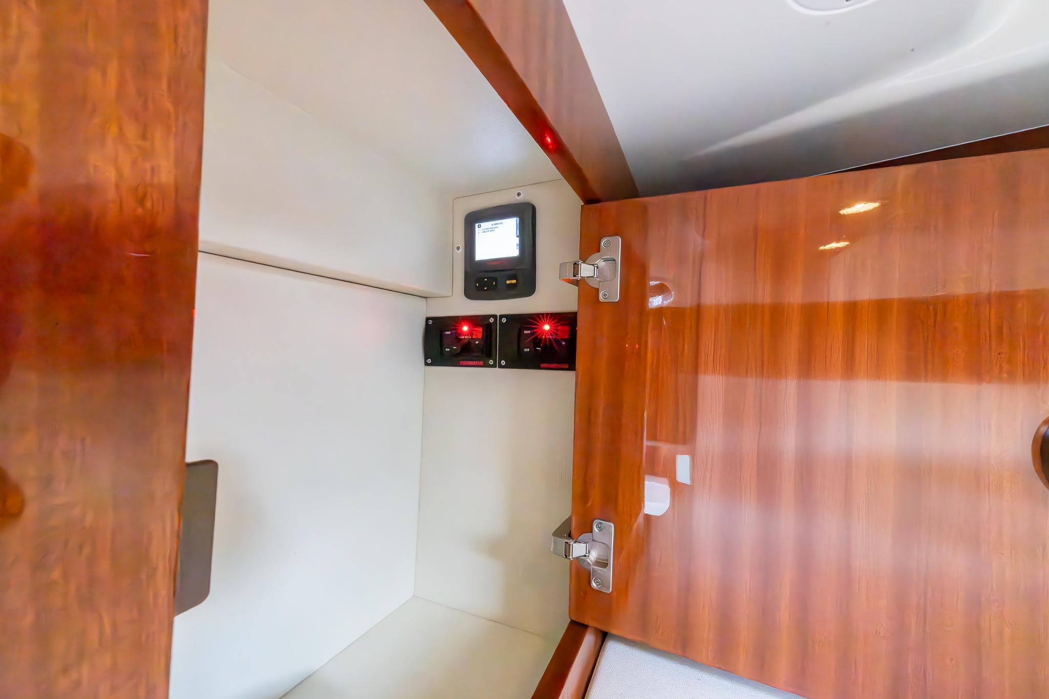 Cockpit & HelmThe cockpit offers a comfortable, open layout designed for socializing, with plush, waterproof leather upholstery in cream tones that contrast beautifully with the rich wood trim. The wraparound seating offers enough space for all guests to relax in style. The polished wooden dashboard features modern, intuitive controls, while the leather-trimmed steering wheel and chrome accents reinforce the luxurious feel. She is also equipped with navigational electronics, including GPS and digital gauges to ensure stress free cruising everywhere you go.