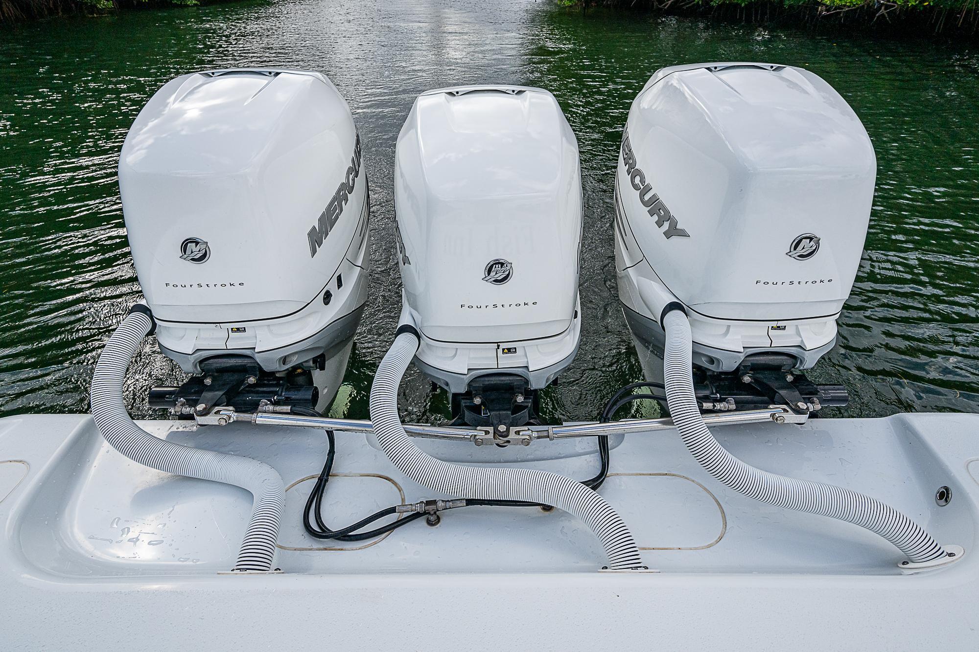 Mercury K-Plane performance trim tab system with polygon shaped hydraulic trim tabs of approximately 21” X 12” X 8” with single actuators Parker model 108-649355 hydraulic pumps port and starboard behind access doors