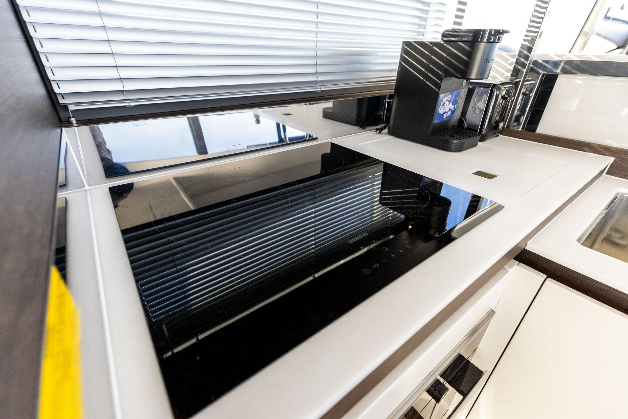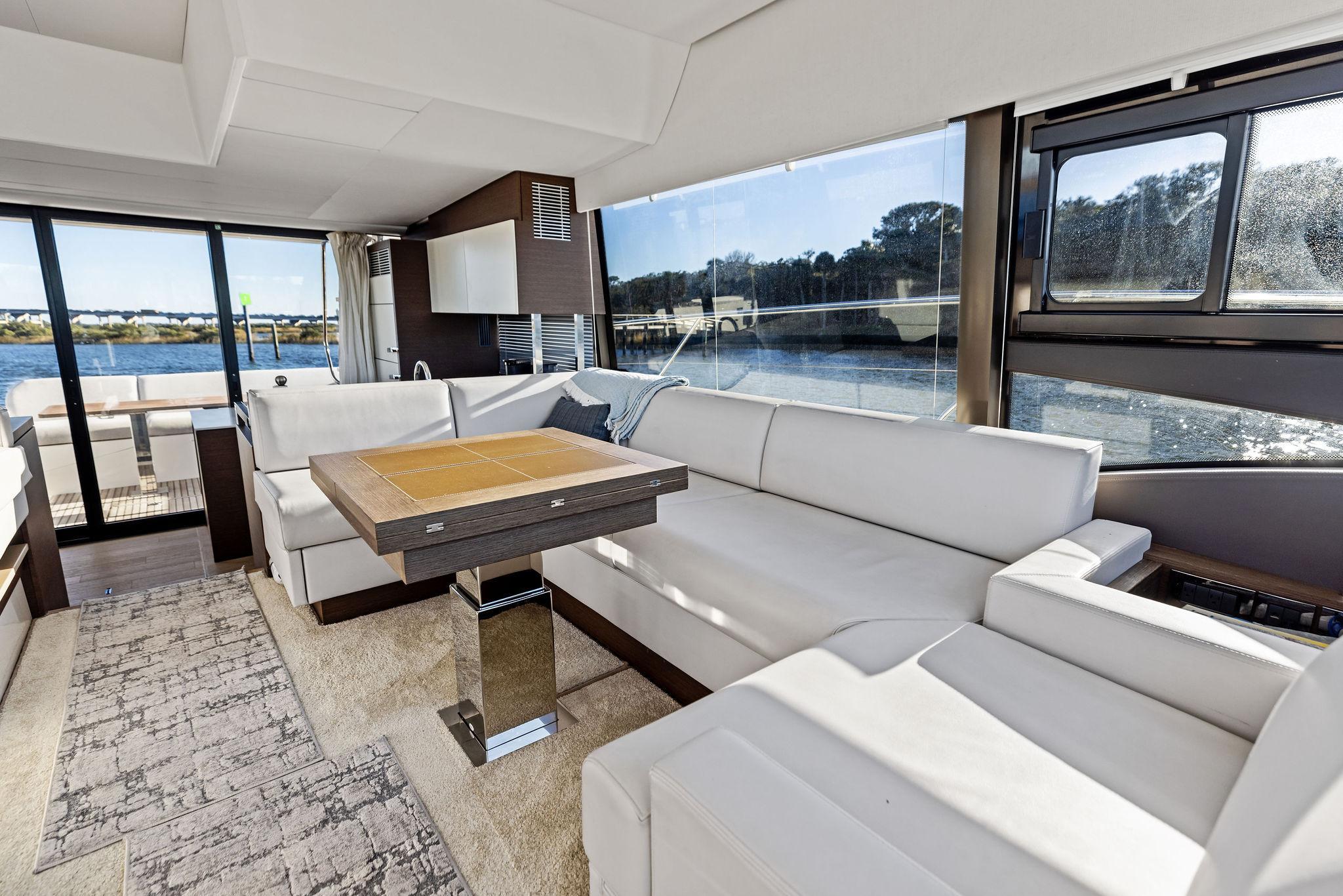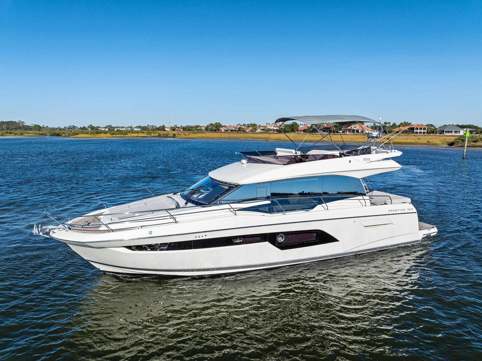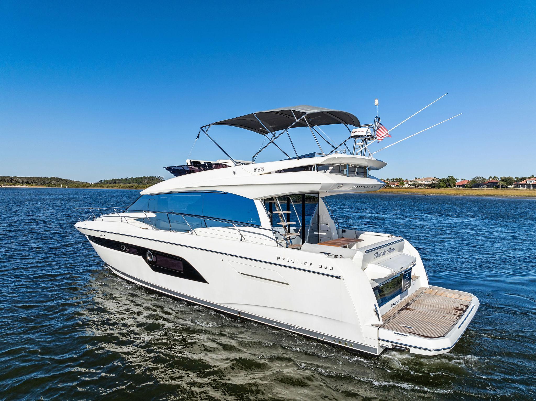 2019 Prestige 520 Fly | PURE DE PAPASPrice Reduction!Pure De Papas has a three stateroom, two head layout for owner's party. There is a small crew cabin aft with head and hand held shower. There is a double-berth forward stateroom that shares a head with the portside stateroom whose twin berths convert to a double berth. The salon has two seating areas, lower helm forward to starboard, galley aft to port and access to lower master stateroom to starboard. Cockpit has bench seating, expandable teak table, teak decks, access to the engine room, and both side decks. Fixed swim platform and hydraulic swim platform are accessed to starboard. The flybridge features a helm to port and starboard seating areas.GalleySS sinkSiemans 3 burner cooktopVesta dishwasherMiele microwaveSplendid 7190 combo washer/dryerIsotherm icemaker, aft deckElectronics & NavigationTwo Raymarine Axiom 12" Chart Plotter + radar (Up and down)Raymarine digital auto pilot (Up and down)Seakeeper - lower helmFlybridge, lower helm + aft deck joystickQuick bow thruster, upper, lower, and aft deckRaymarine VHF - upper and lower3" compass - upper and lowerDeck & HullTeak decks on bow, side decks, cockpit and flybridgeAft deck and flybridge, electric grill and sinkShorewater aftTextliene windshield cover2 windshield wipersForedeck and flybridge sun pads with cushions and coversForedeck sun convertible sunshadeStainless steel side rails + grab railsMarine spotlightLemmar winch with 131' chain and 164' line rodeFlybridge bimini topFlybridge covers for helm, seating area + sun padDelta plow anchor in chuteDometic Central VacuumFresh and raw water hookup in cockpitAnchor chain counter, lower helmElectrical240 Volt/50 amp shore powerCable Master starboard aft quarterOnan 13.5 KW Generator8 AGM batteries2 Victron Battery ChargersMechanicalLenco Trim TabsHydraulic Swim PlatformNautic hot water heaterJabsco macerator2 Rule bilge pumps1 Pod System has 4 blade outer and 3 blade inner4Cruiser reverse cycle air conditionerBroker's CommentsPURE DE PAPAS is a very clean, low hour example of the popular Prestige 520 Flybridge. She features the Volvo Penta IPOD System for easy handling, bow thruster, 3 comfortable staterooms and a hydraulic swim platform.