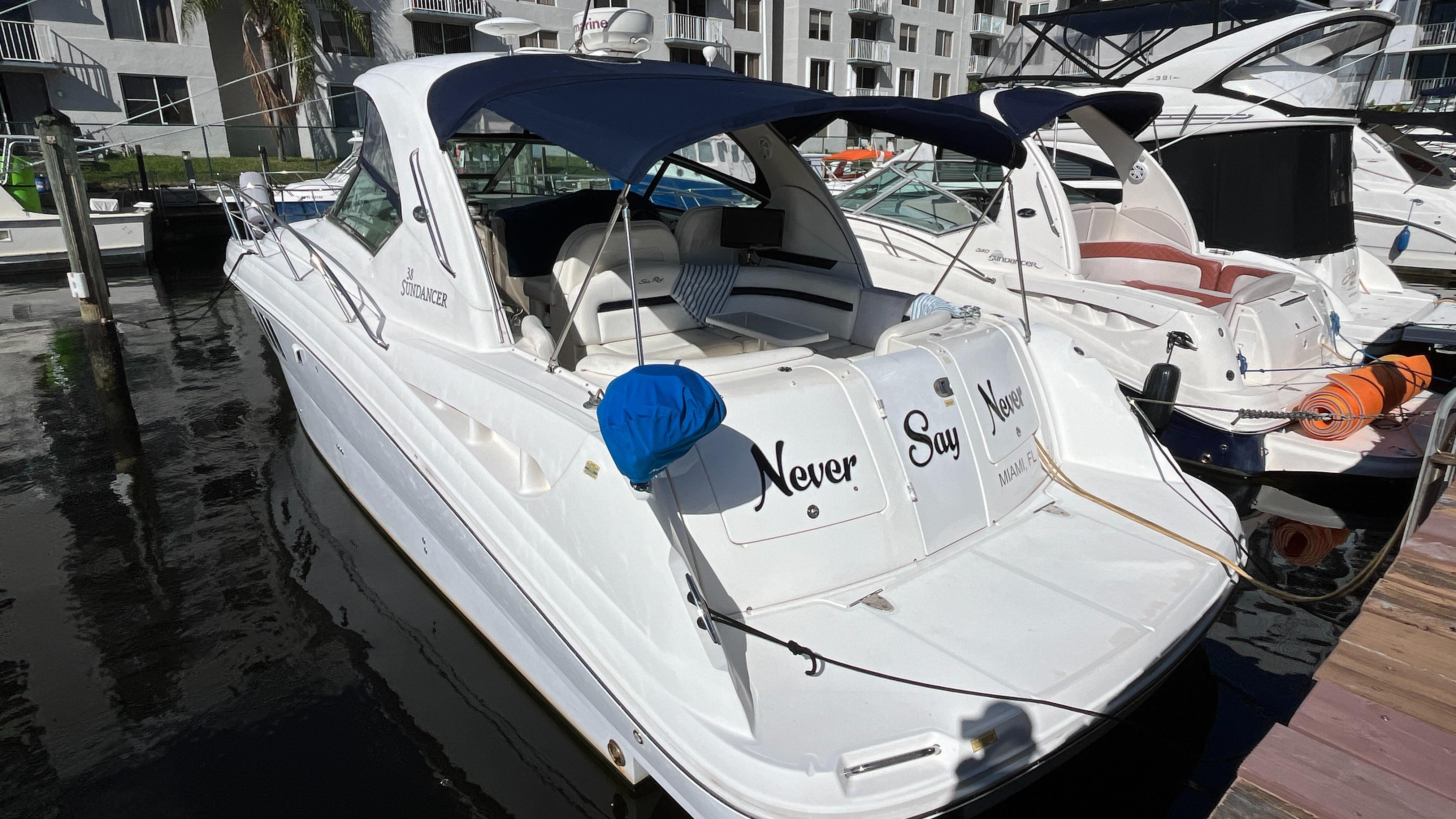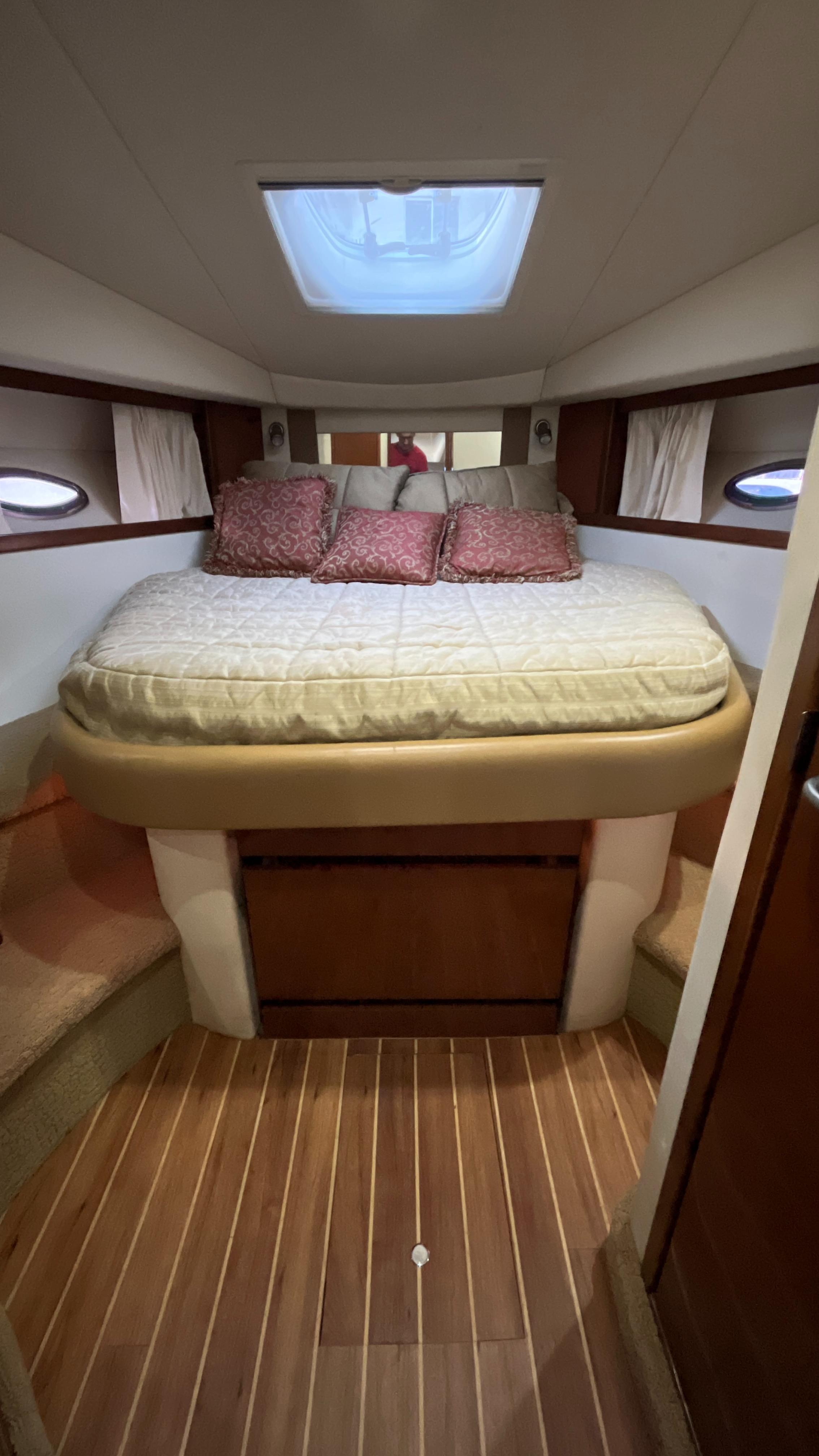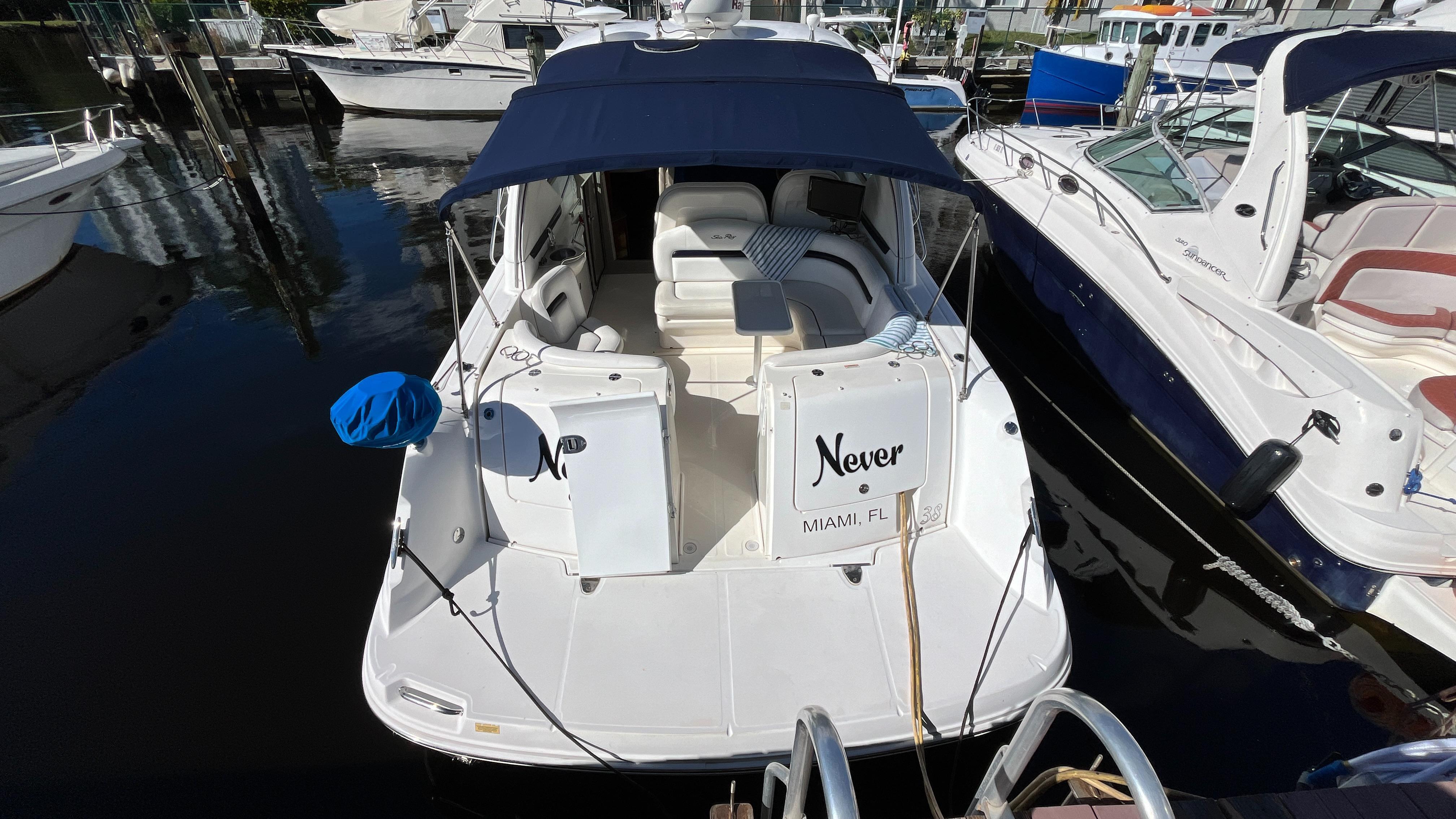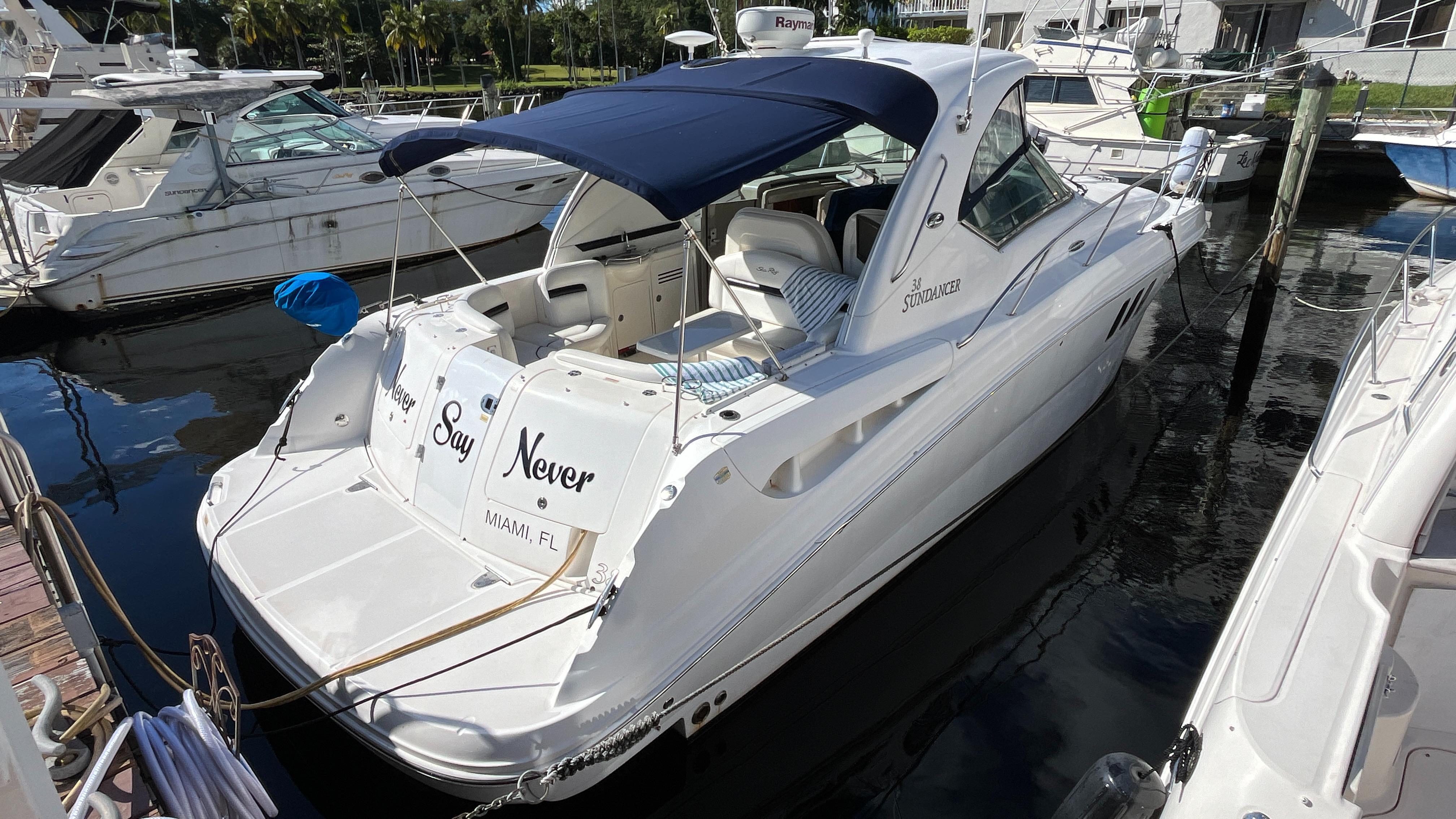 PRICE JUST DROPPED $10,000.00This exciting 38 Sundancer features a stylish fiberglass hardtop with aft sunshade, overhead lighting and stainless-steel grab rails. An innovative center door in the transom provides easy access to the luxuriously appointed cockpit, complete with Corian tabletop, wet bar and icemaker. Powered by twin 8.1 S Horizon MerCruiser V-drives with 370HP fresh water-cooled engines, underwater exhaust, and standard anchor washdown.Standard MerCruiser® 8.1 S DTS Horizon engines with 4-year Mercury® limited warrantyStandard SmartCraft® Diagnostics and VesselView Display.Swivel bucket helm seat with flip-up thigh-rise bolster, armrests, and heavy-duty pedestal with slide, swivel and pneumatic vertical adjustment.Companion bench with molded fiberglass storageElectrically actuated engine compartment hatch.12V AM/FM single CD with six-disc CD changer, eight (8) speakers and digital cockpit remote controlCockpit wet bar with sink and faucet, Corian® countertop, stainless steel handrail, trash receptacle, and cooler with dedicated storageSirius® Satellite Receiver with antenna.Standard LCD drop-down flatscreen TV with DVD in salon.Innerspring mattress is standard in forward stateroom.Separate shower and dual-entry head.Ultraleather HP™ standard on all interior seating.Fiberglass hard top with aft sunshade, overhead lighting and stainless steel grab rails.Standard generator with sound shieldLarge integral/extended swim platform with heavy-duty stainless steel swim ladder.Water manifold system with shut-off valveUnderwater exhaust.Standard anchor washdown.