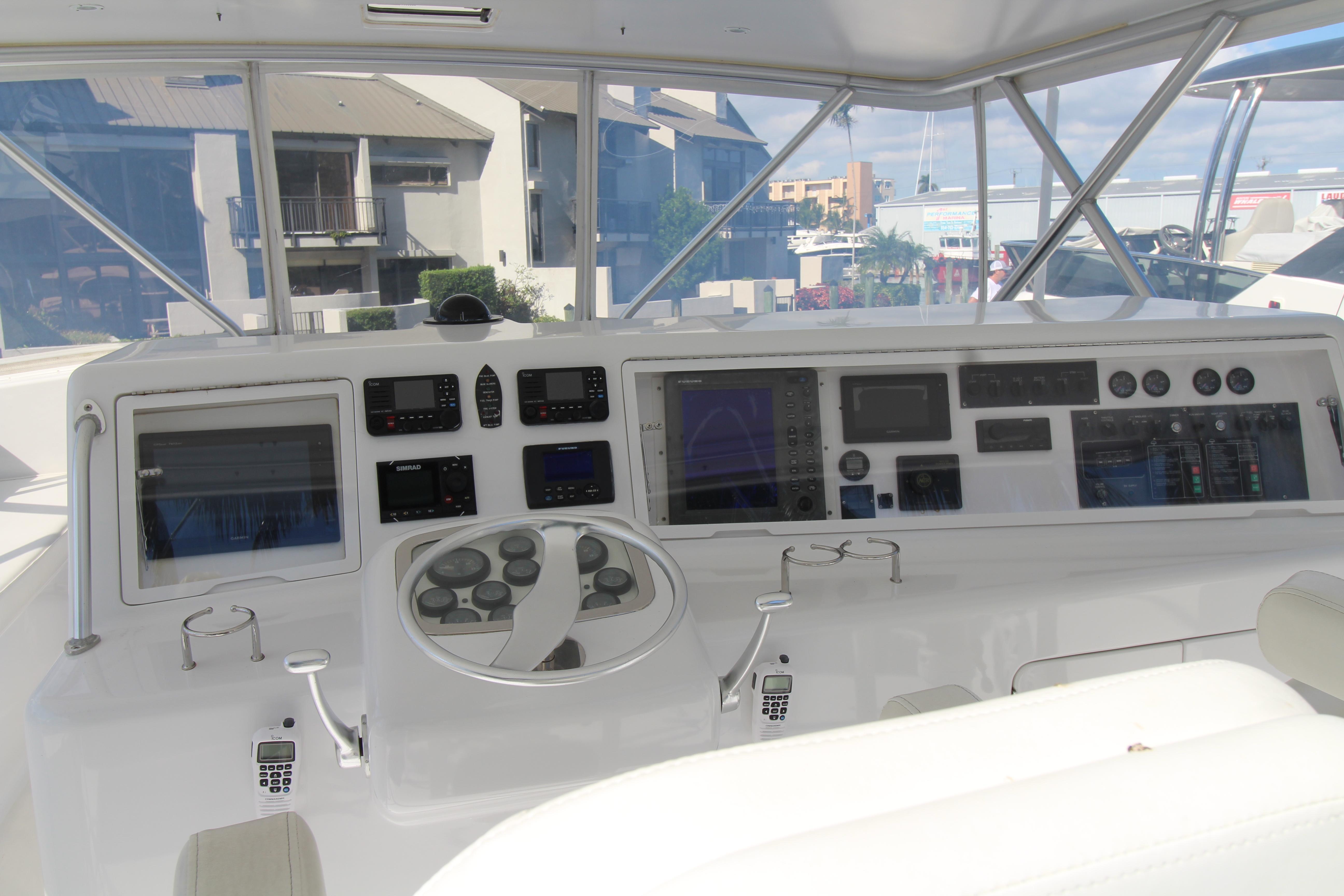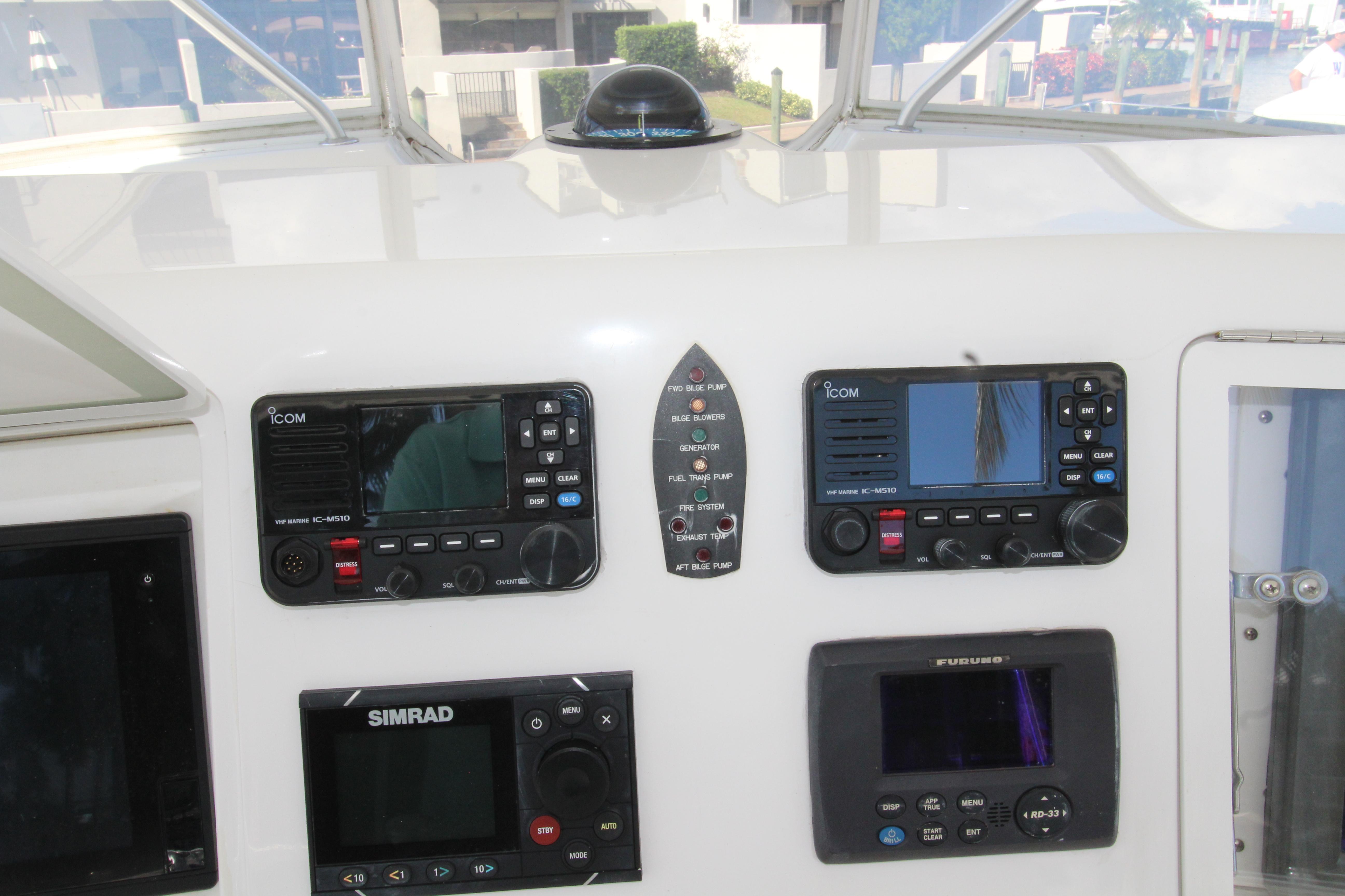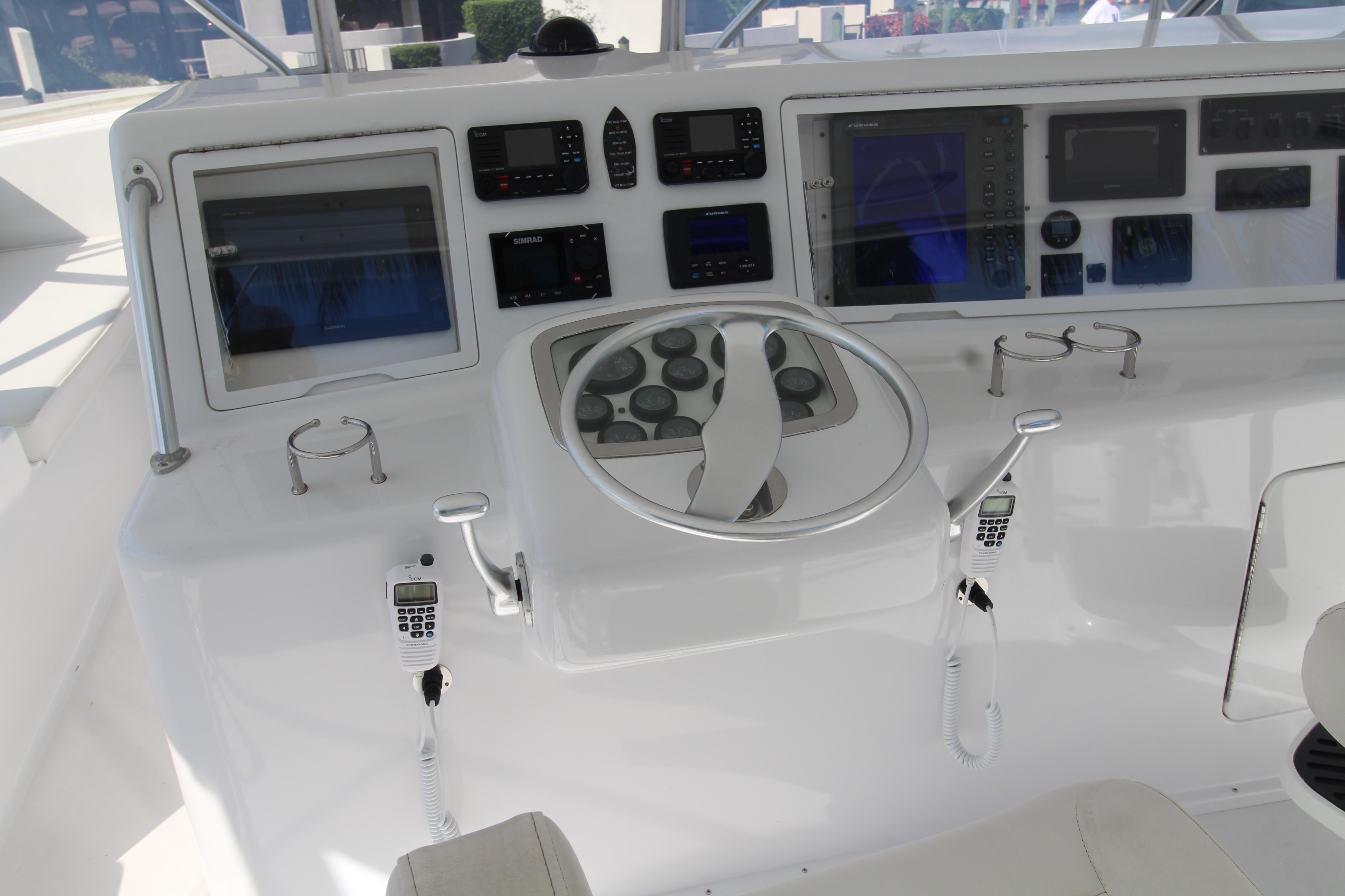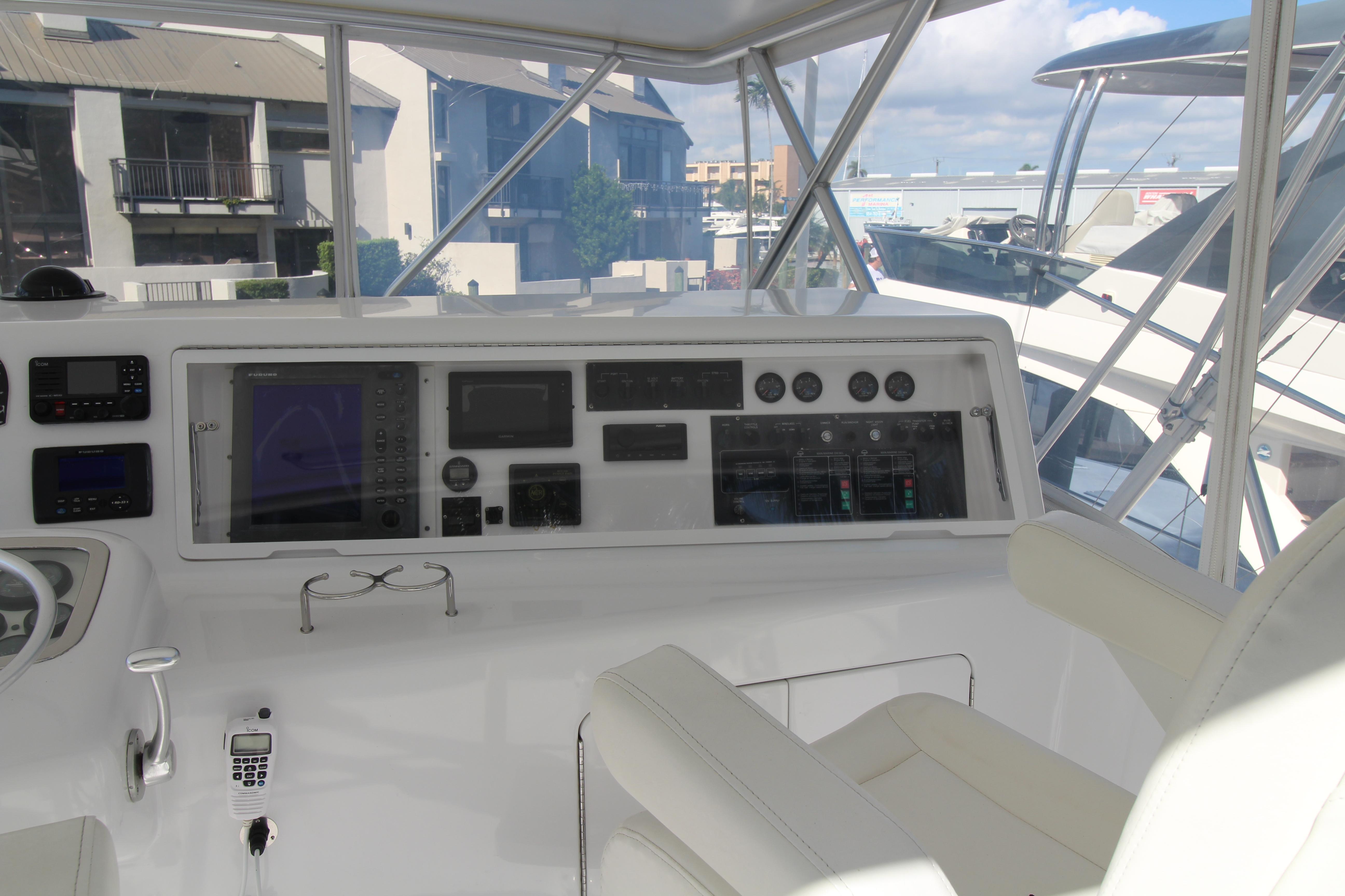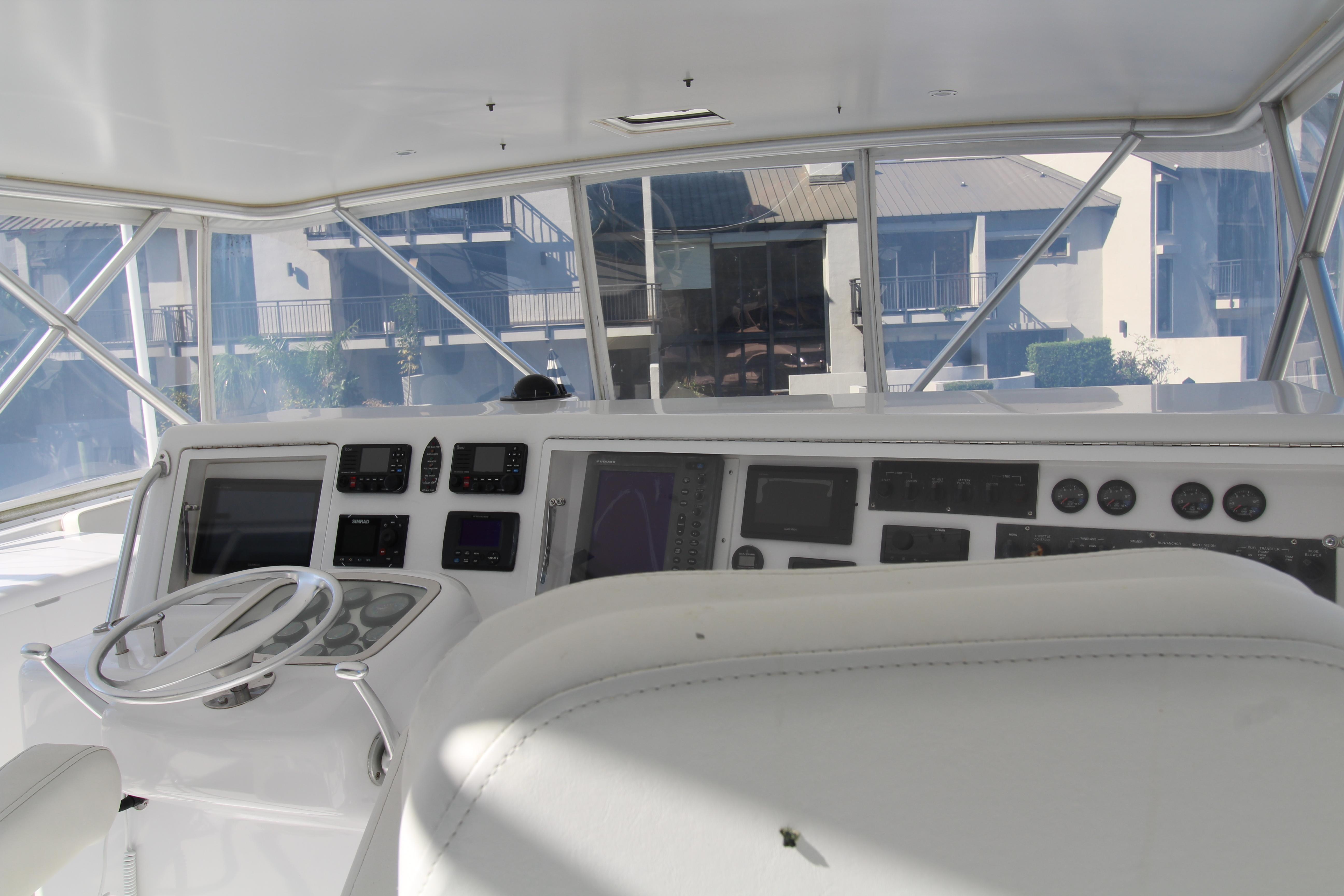 Moving up the ladder to the bridge deck the pedestal mounted captain and companion swivel chairs are in very good condition. The console houses the Furuno Radar receiver, a Garmin GPS / plotter , Simard auto pilot,. twin Icom Vhf Radios. The spotlight remote. Programmable color recessed lighting and transom mount underwater lights, really make this sport fish stand out as the evening party continues.