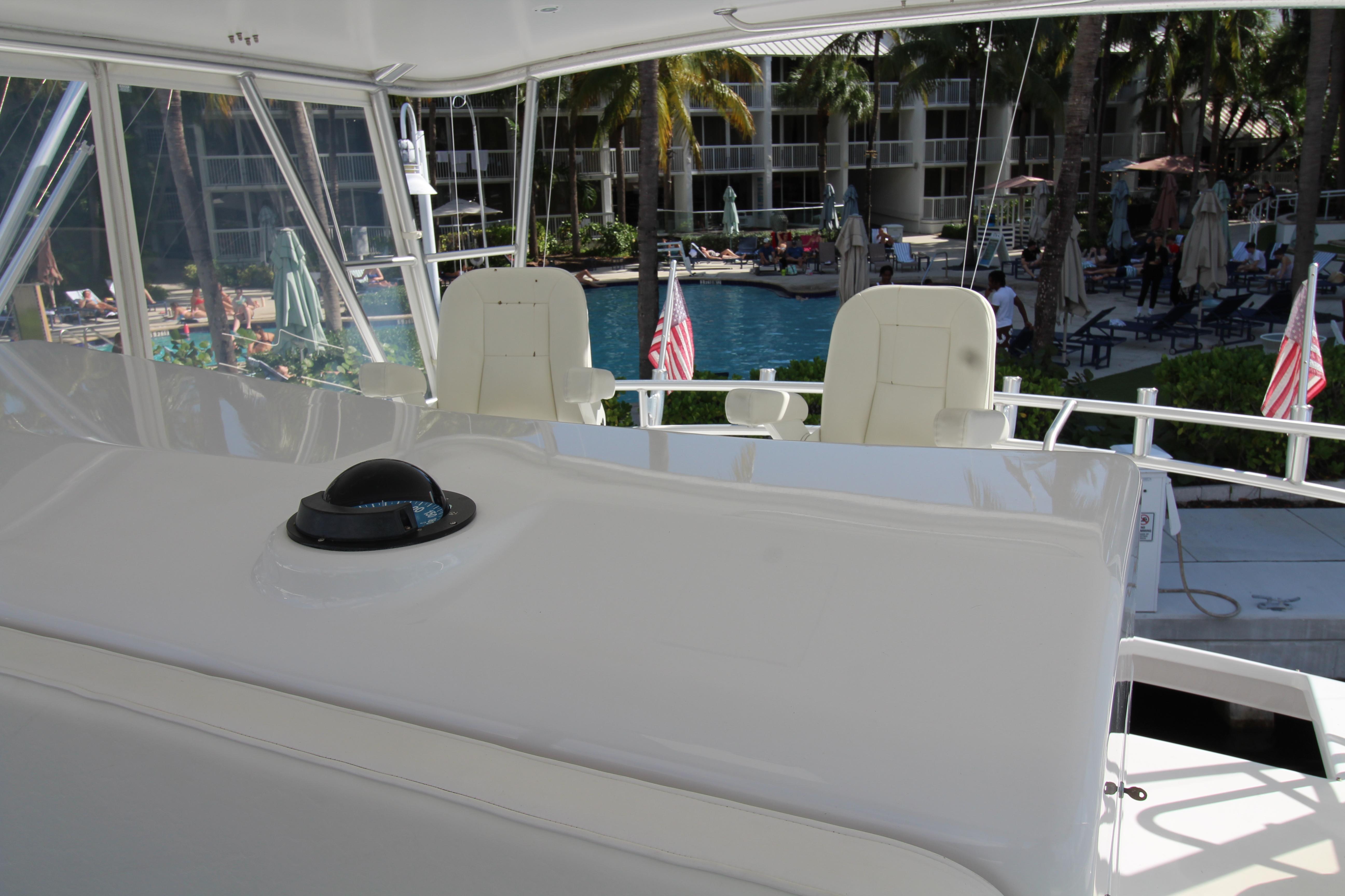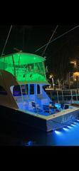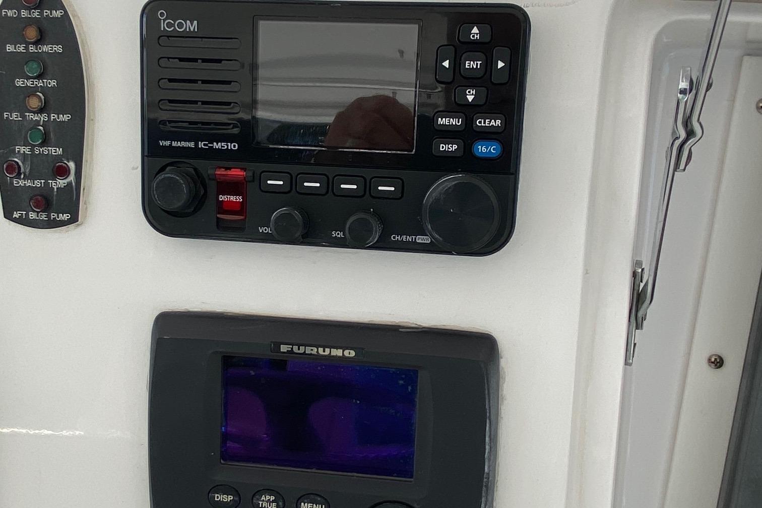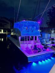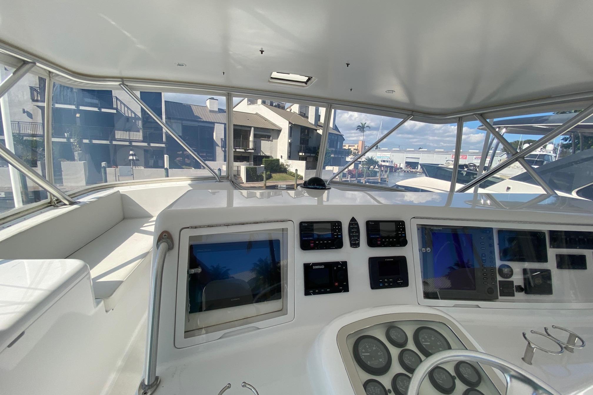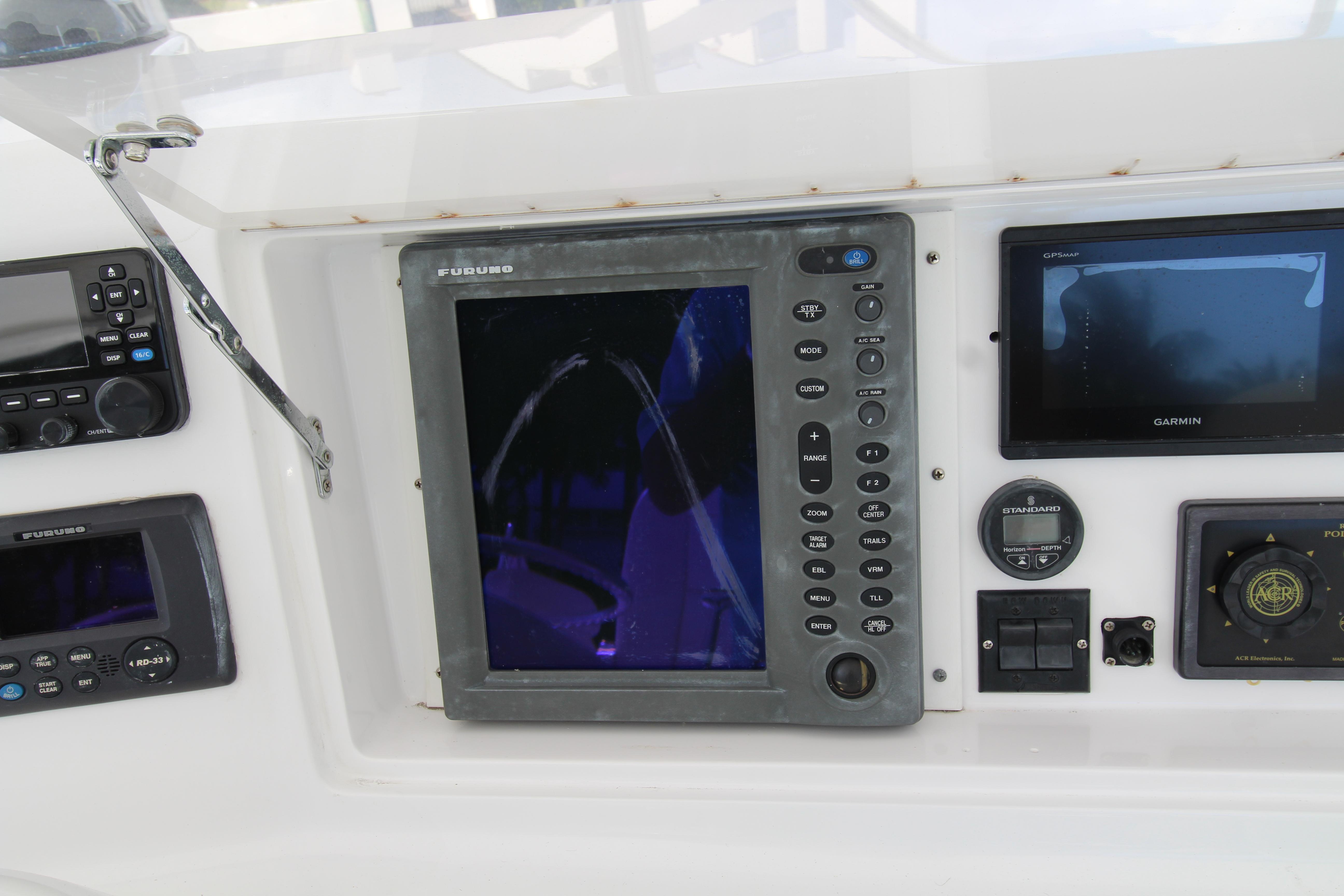 Moving up the ladder to the bridge deck the pedestal mounted captain and companion swivel chairs are in very good condition. The console houses the Furuno Radar receiver, a Garmin GPS / plotter , Simard auto pilot,. twin Icom Vhf Radios. The spotlight remote. Programmable color recessed lighting and transom mount underwater lights, really make this sport fish stand out as the evening party continues.