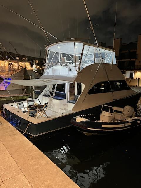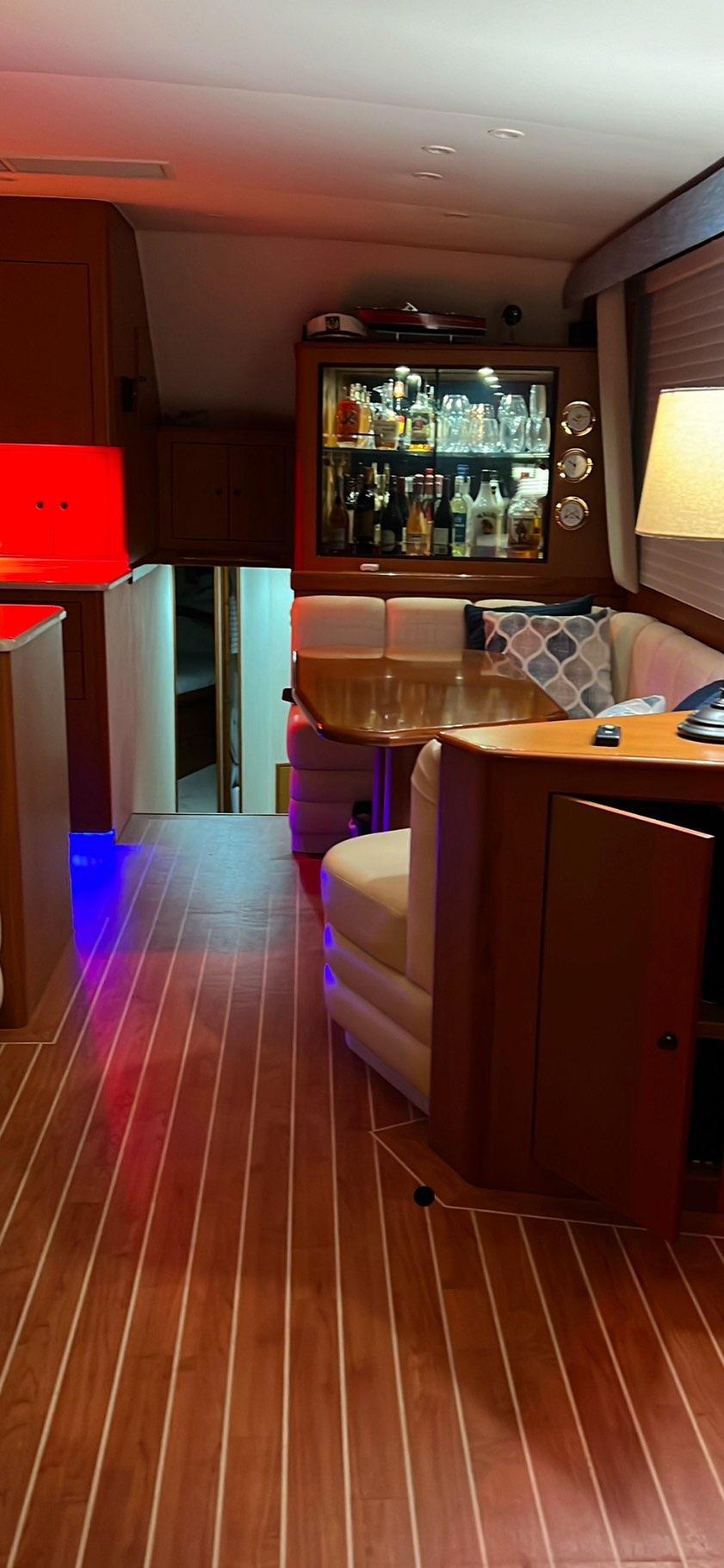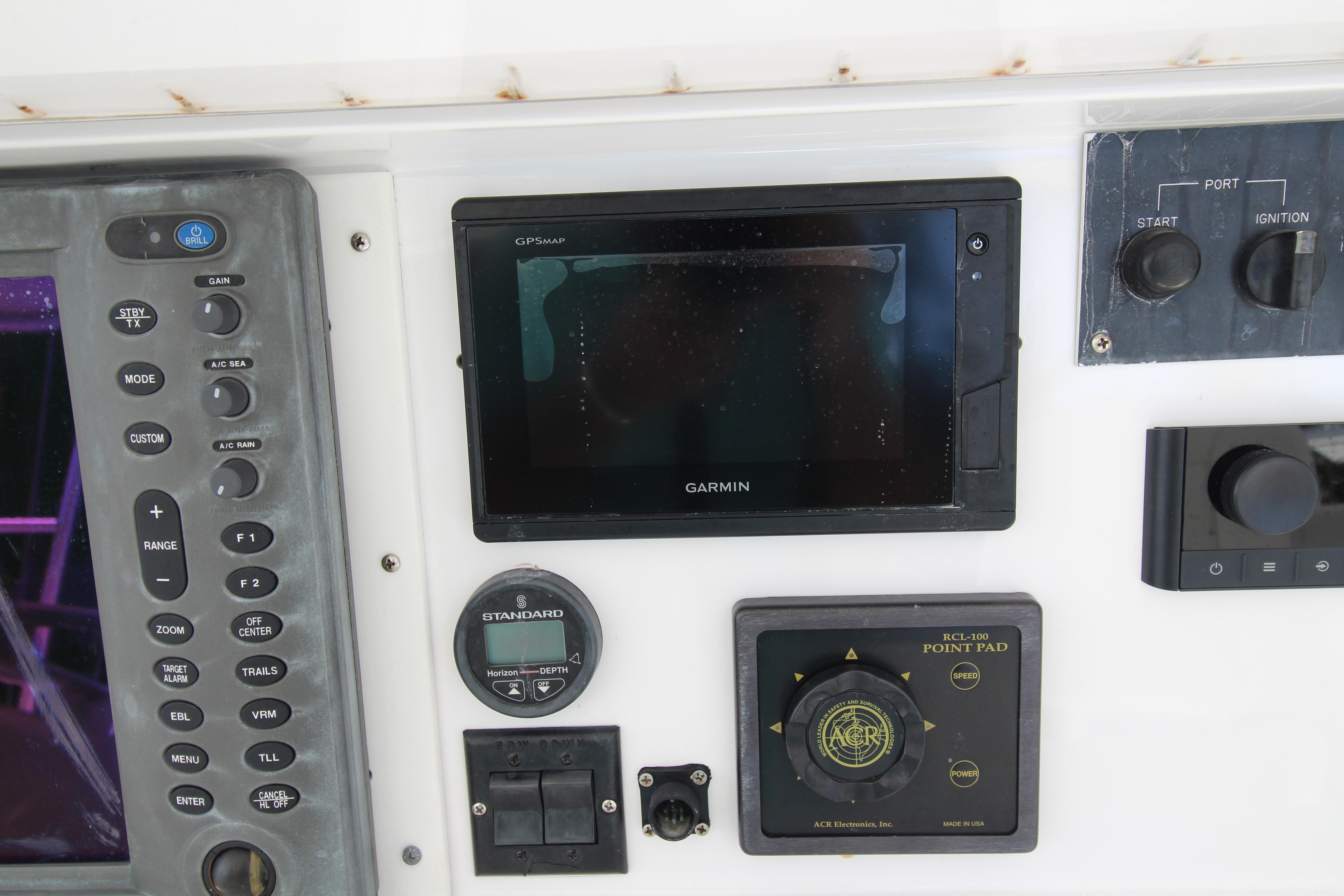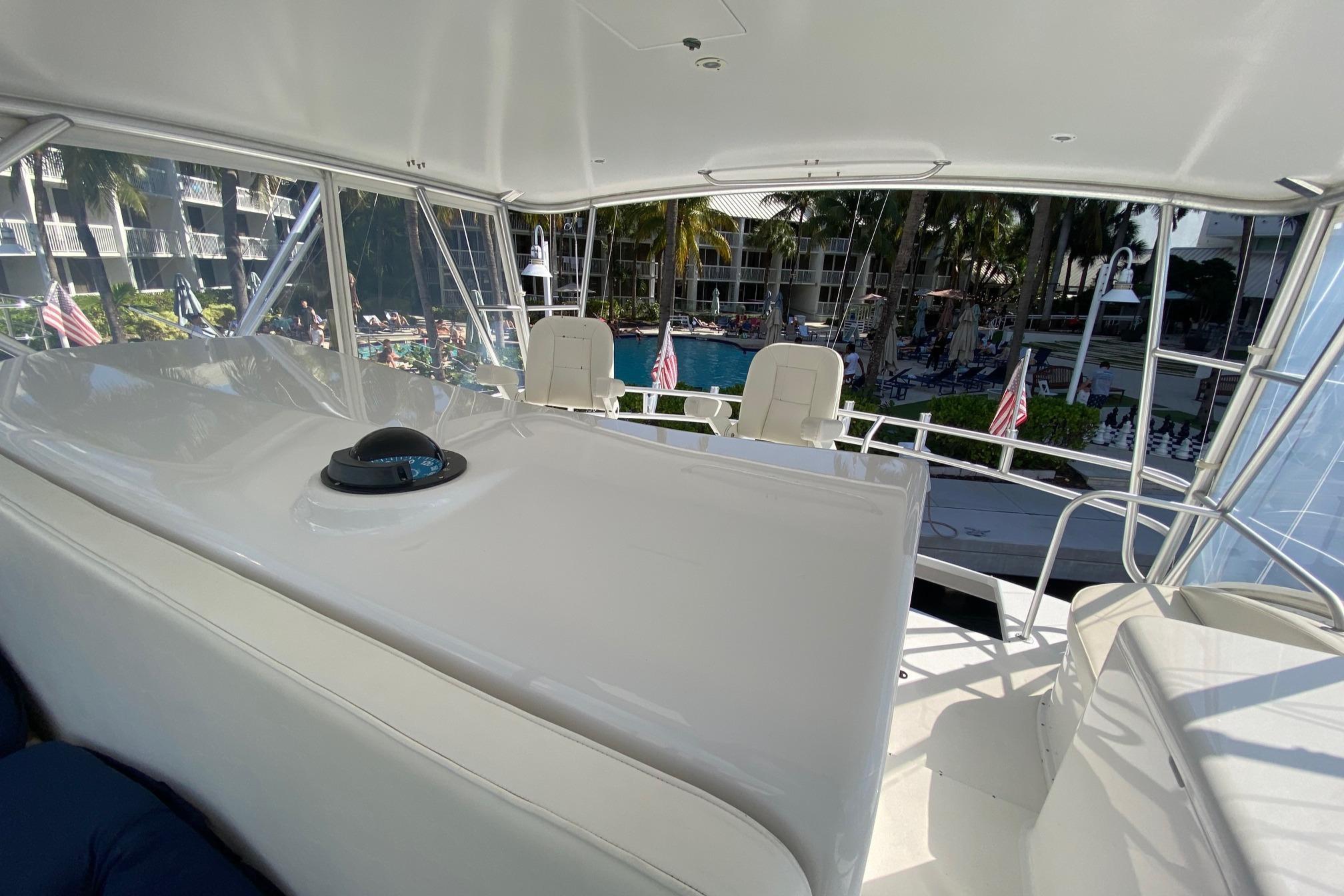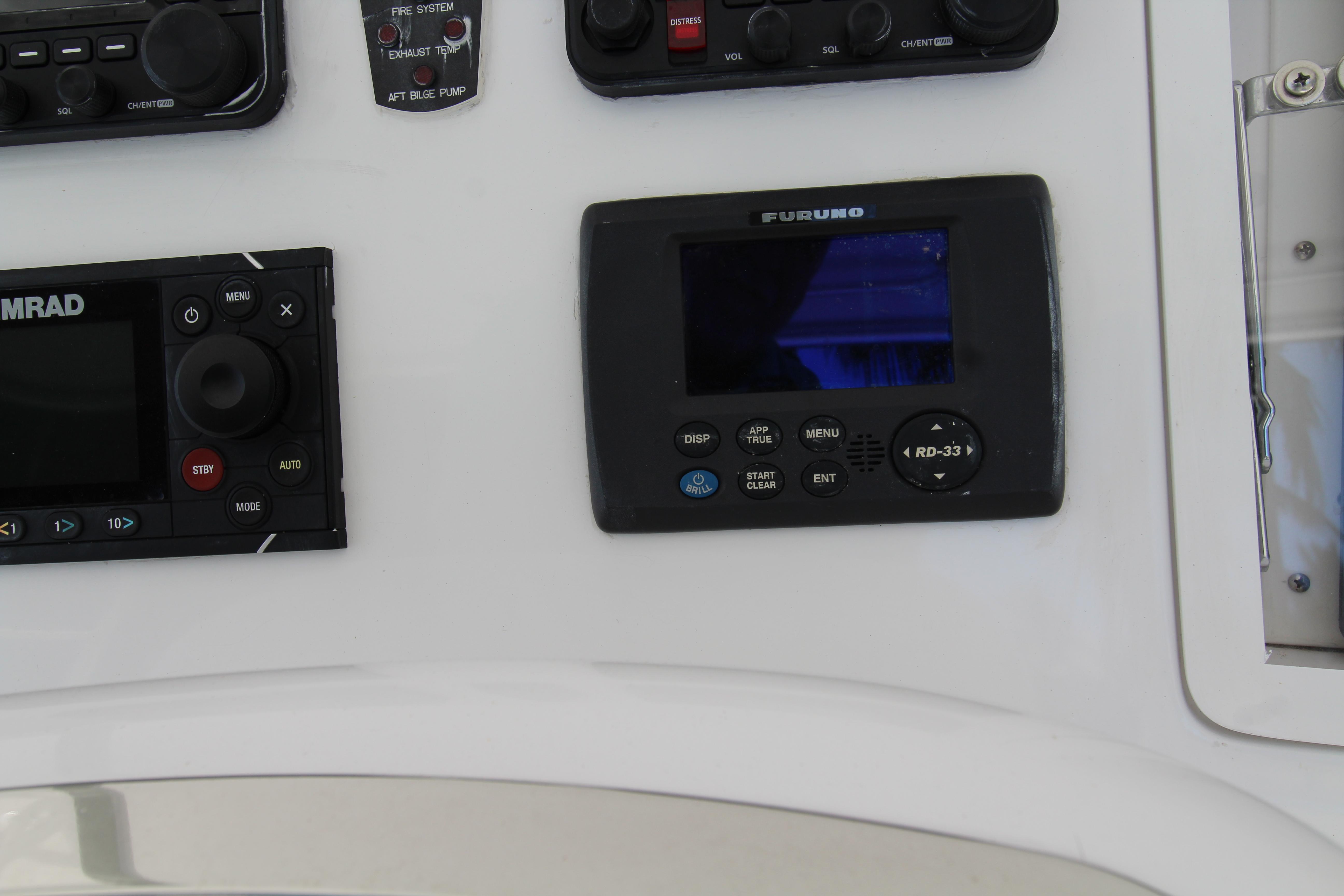 Moving up the ladder to the bridge deck the pedestal mounted captain and companion swivel chairs are in very good condition. The console houses the Furuno Radar receiver, a Garmin GPS / plotter , Simard auto pilot,. twin Icom Vhf Radios. The spotlight remote. Programmable color recessed lighting and transom mount underwater lights, really make this sport fish stand out as the evening party continues.