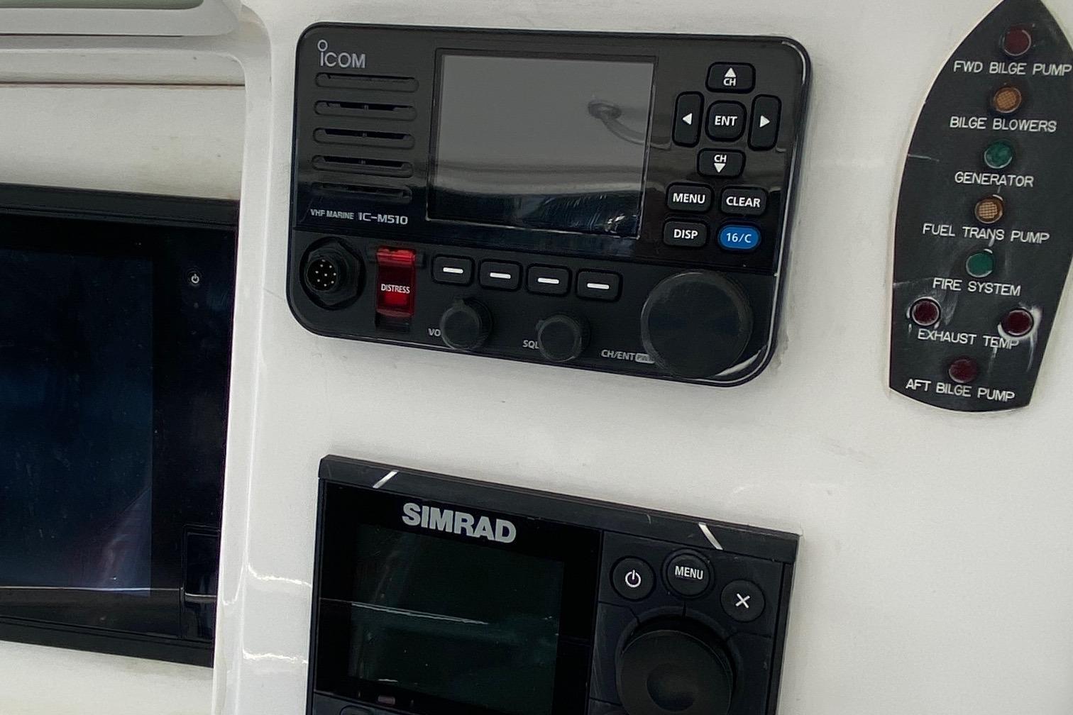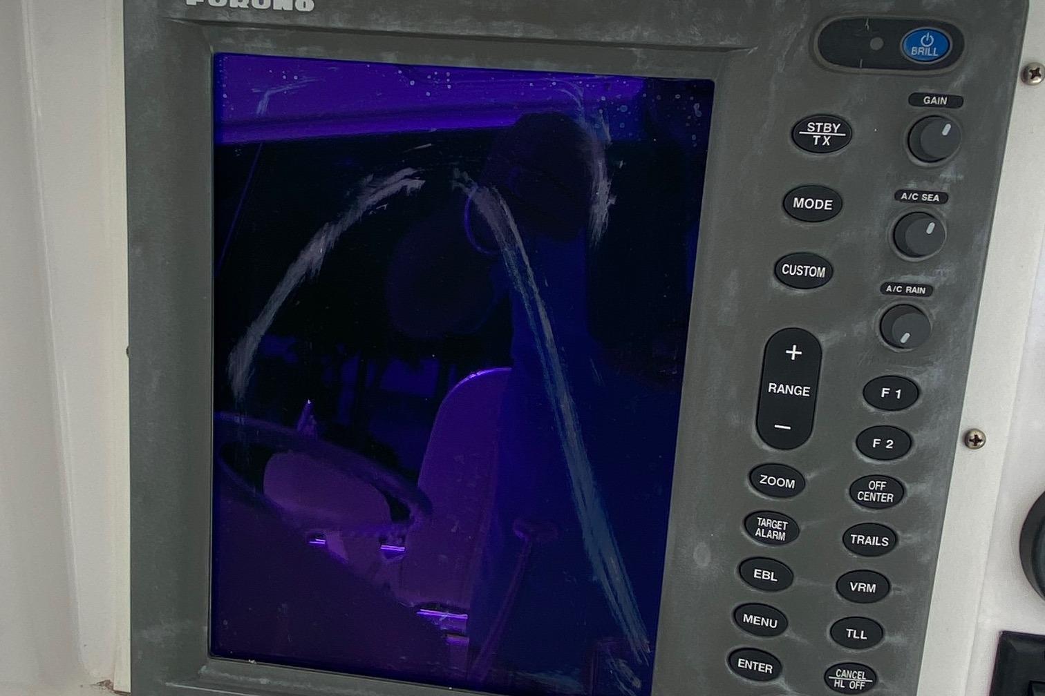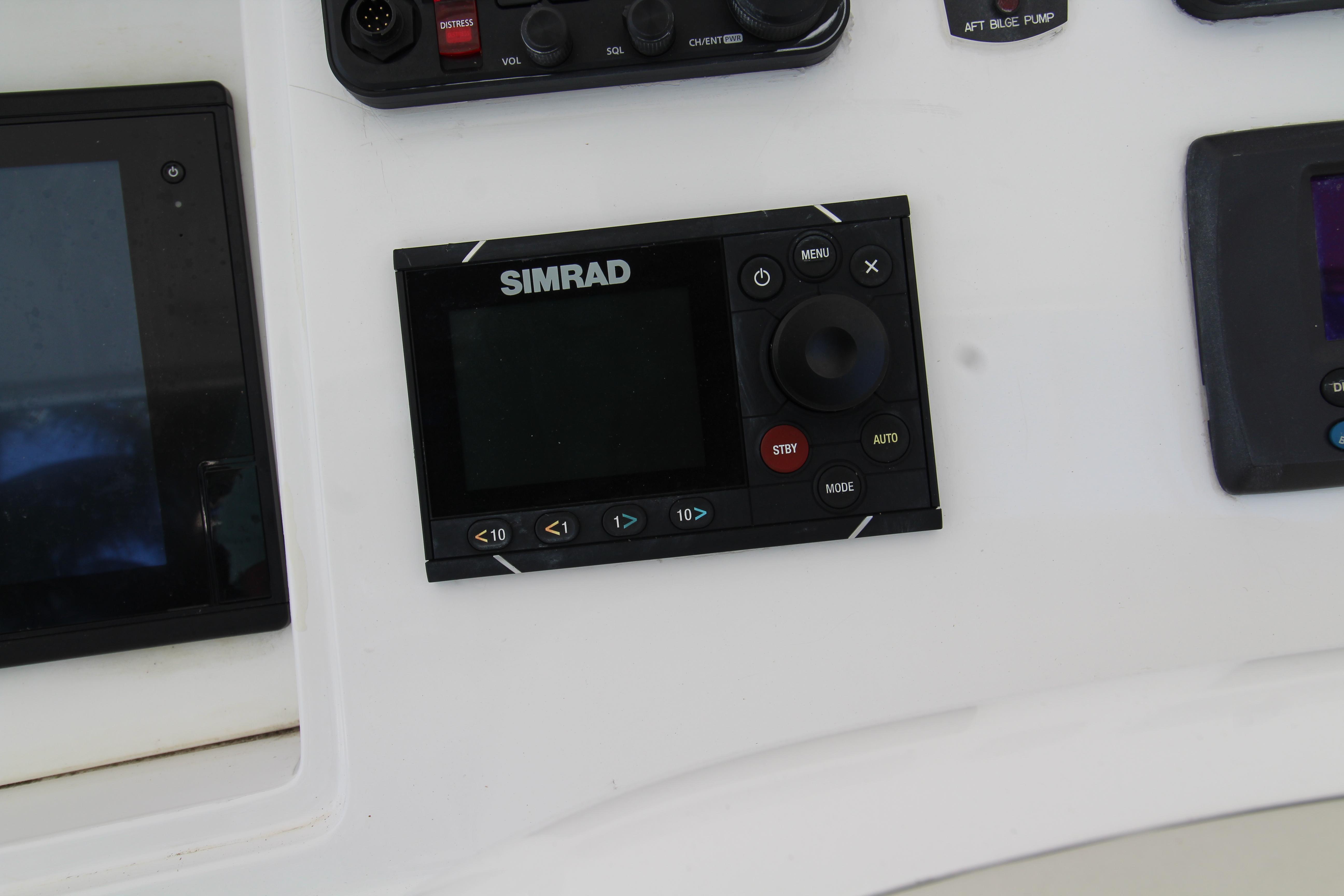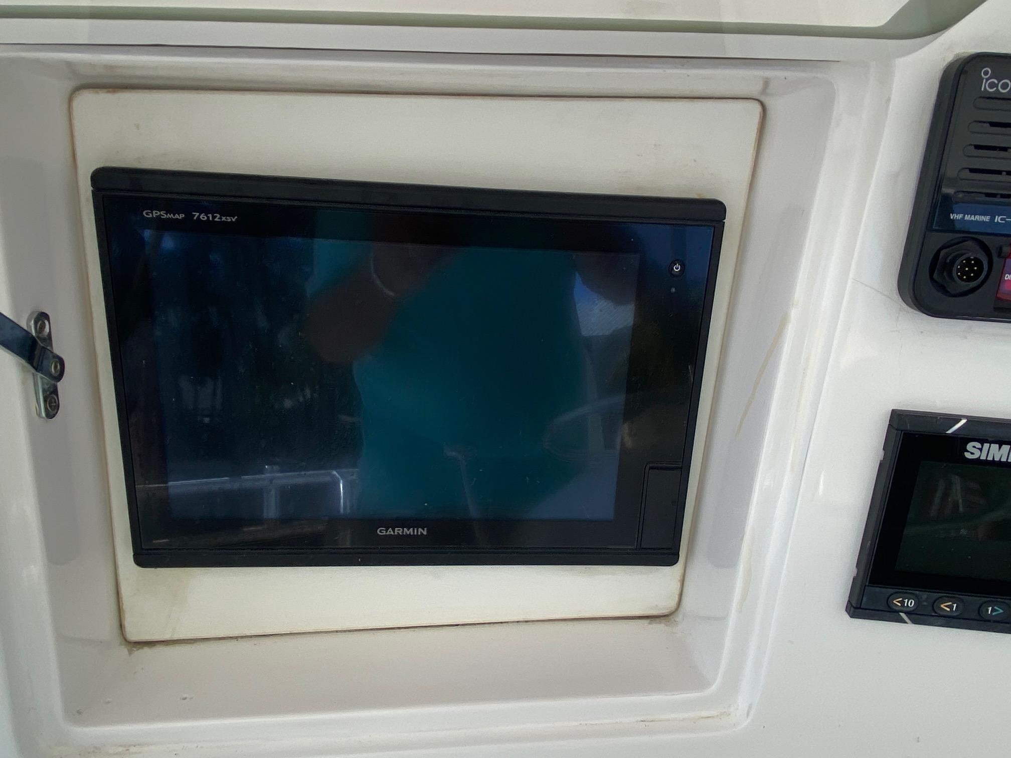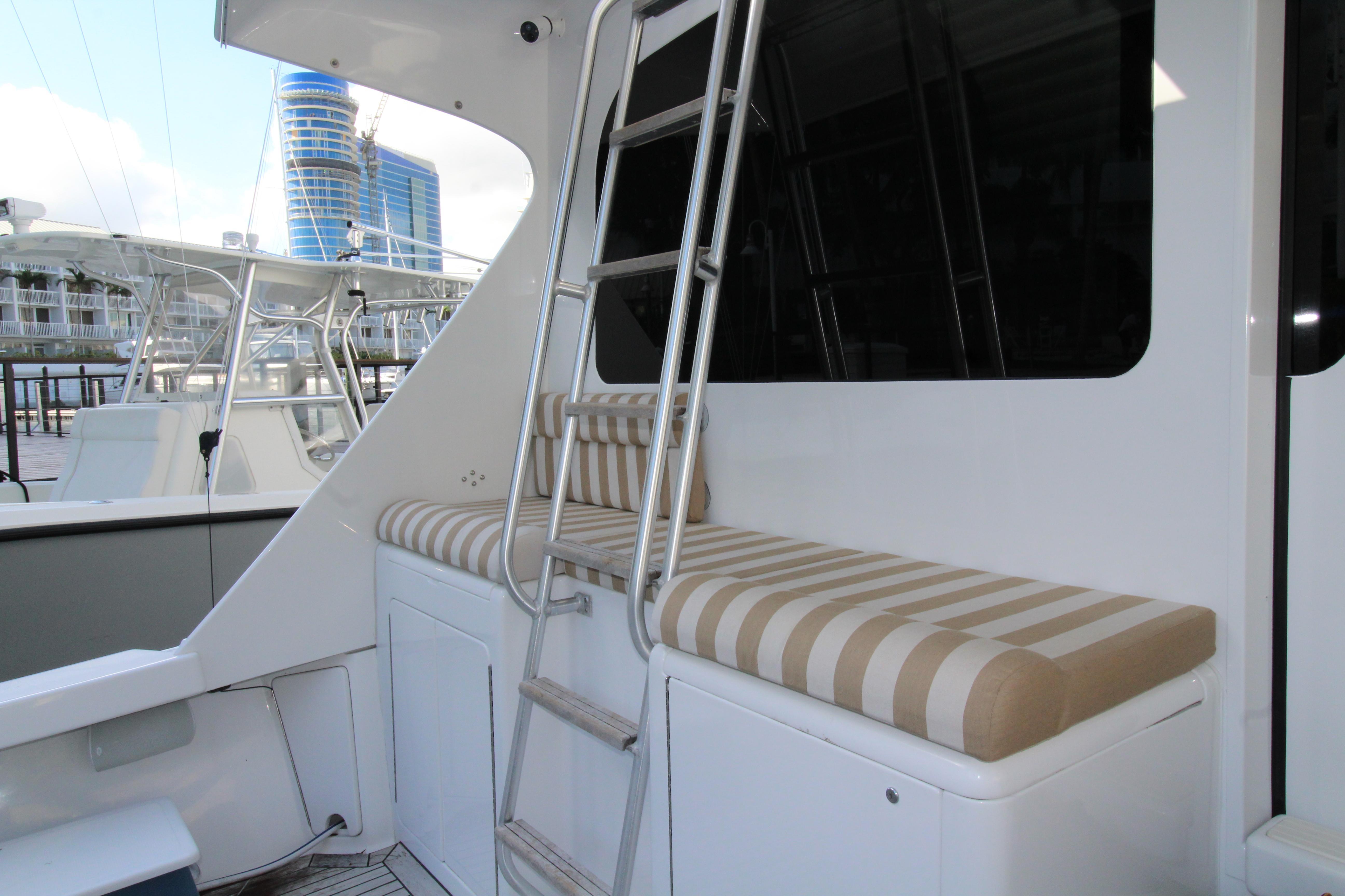 Moving up the ladder to the bridge deck the pedestal mounted captain and companion swivel chairs are in very good condition. The console houses the Furuno Radar receiver, a Garmin GPS / plotter , Simard auto pilot,. twin Icom Vhf Radios. The spotlight remote. Programmable color recessed lighting and transom mount underwater lights, really make this sport fish stand out as the evening party continues.