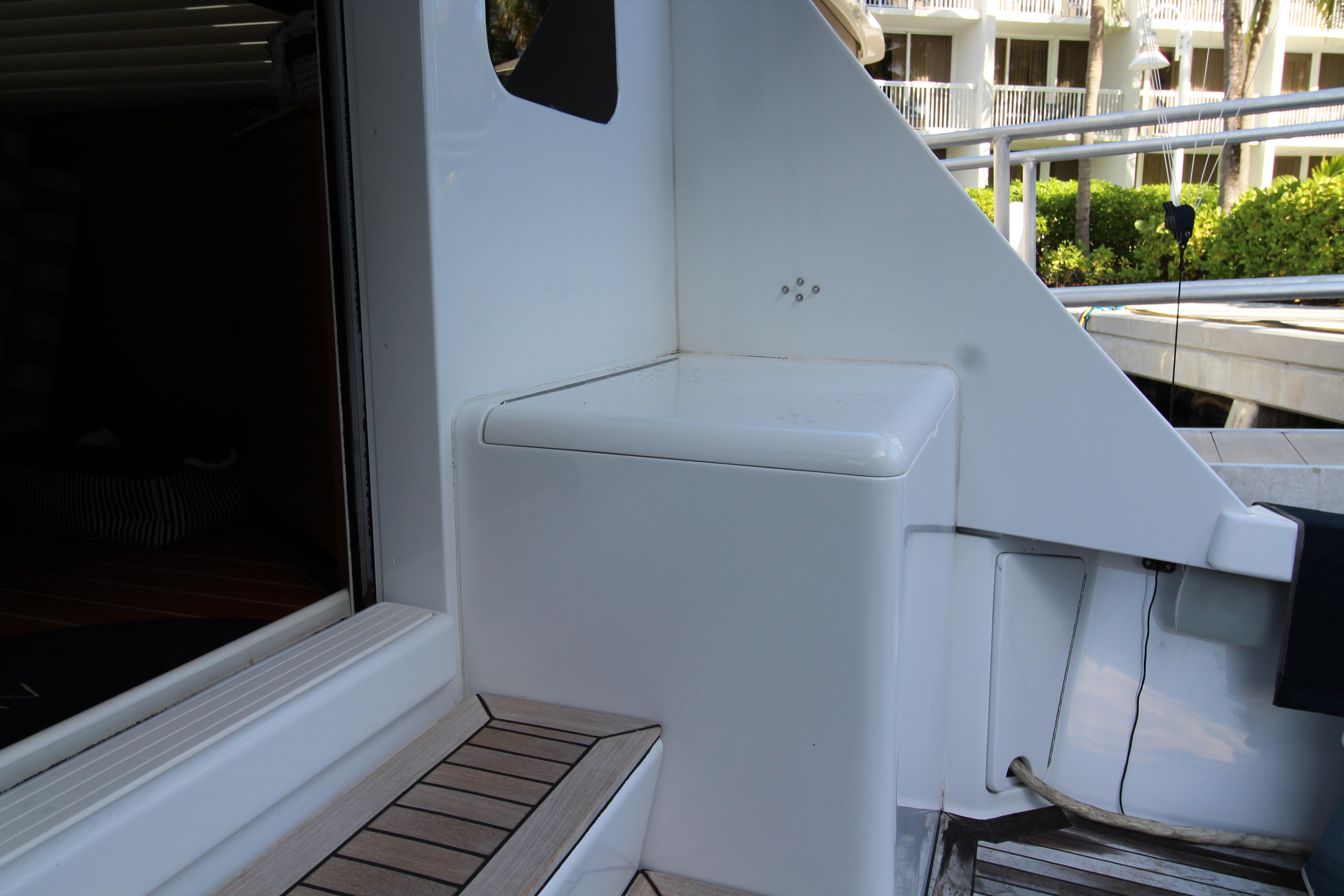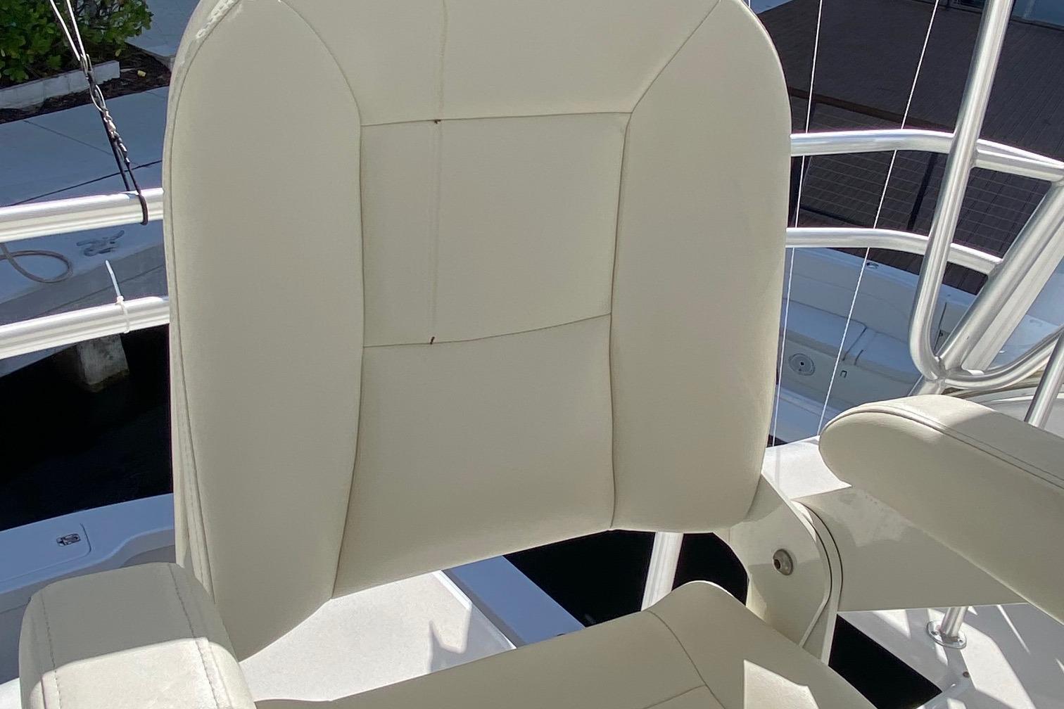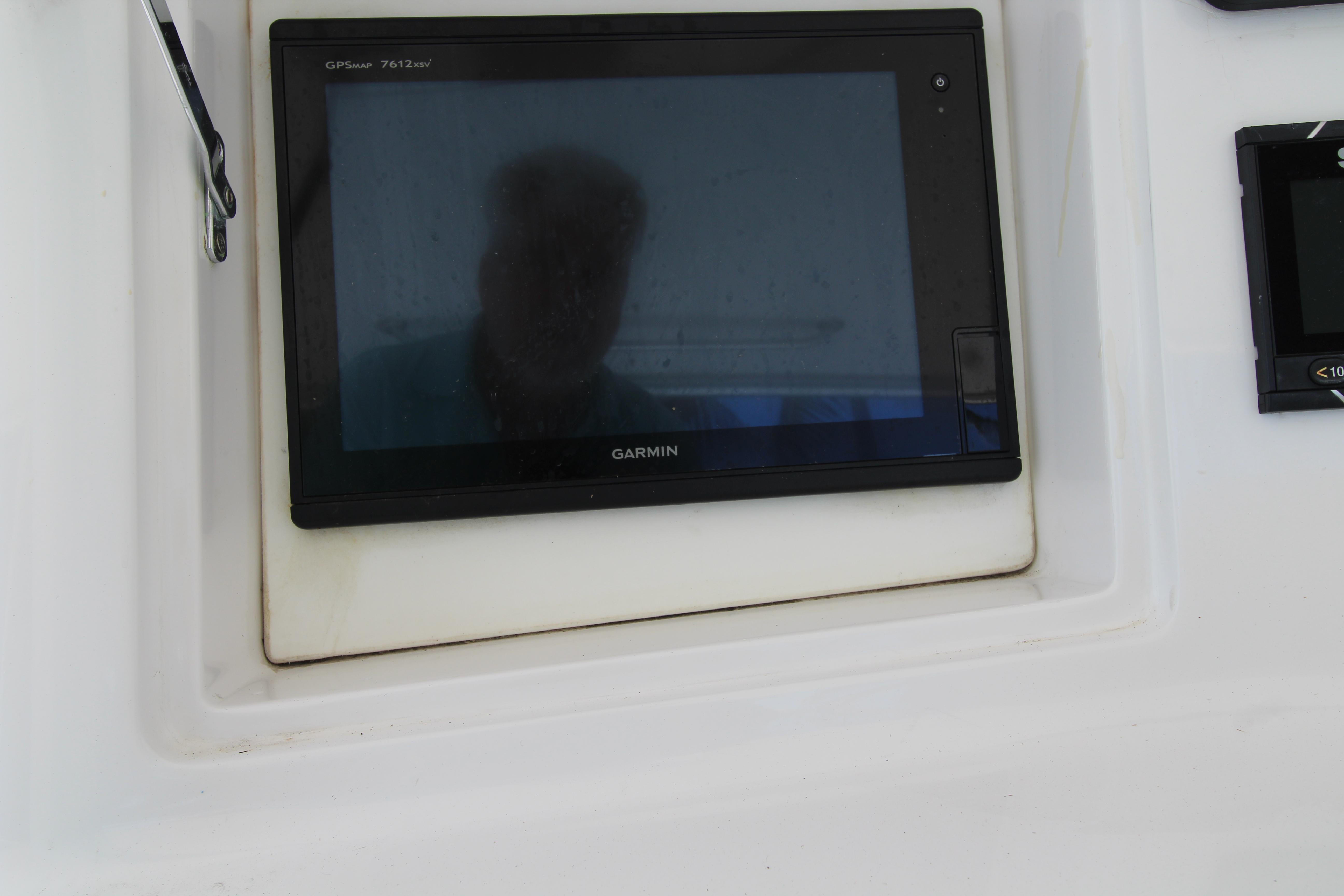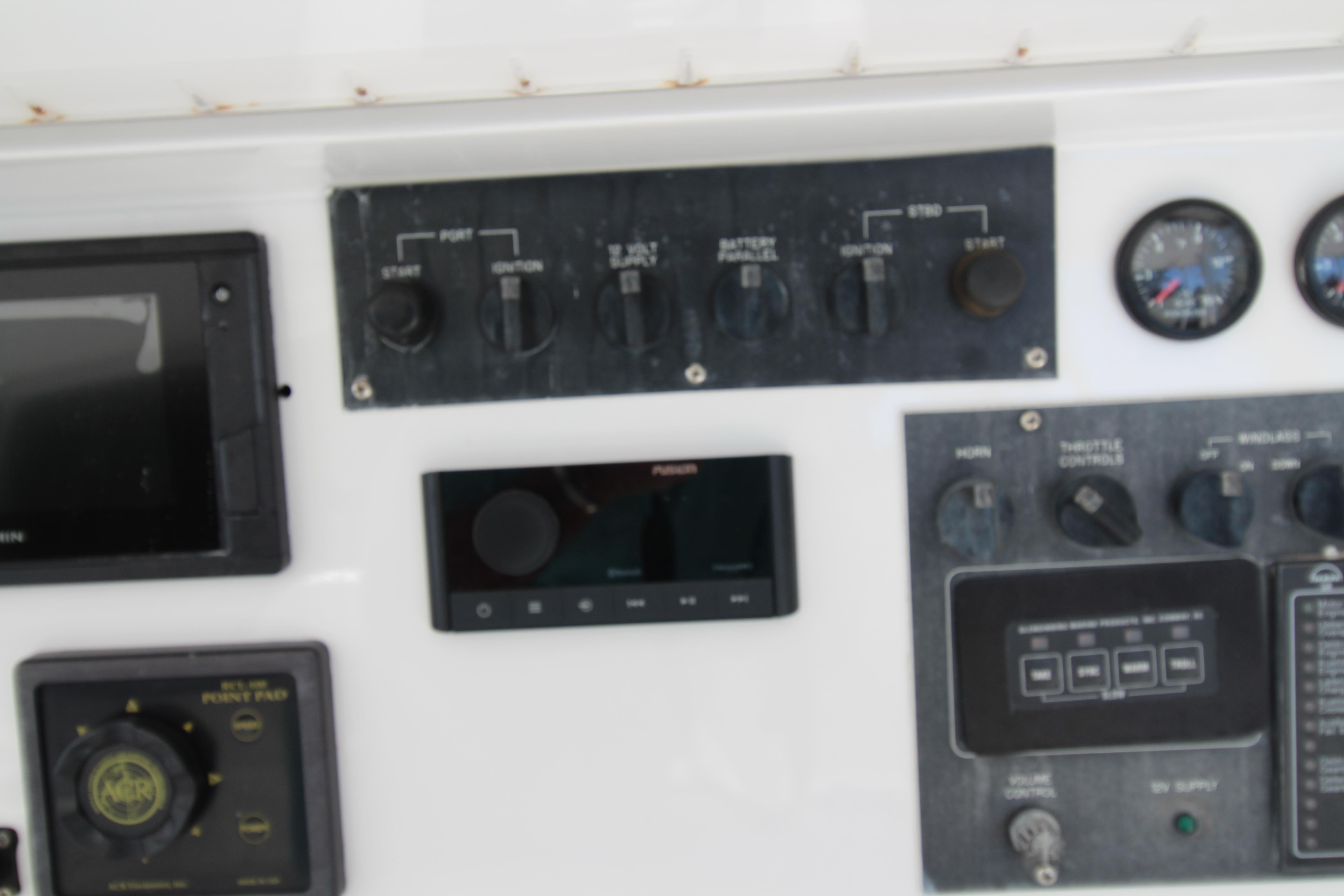 Moving up the ladder to the bridge deck the pedestal mounted captain and companion swivel chairs are in very good condition. The console houses the Furuno Radar receiver, a Garmin GPS / plotter , Simard auto pilot,. twin Icom Vhf Radios. The spotlight remote. Programmable color recessed lighting and transom mount underwater lights, really make this sport fish stand out as the evening party continues.