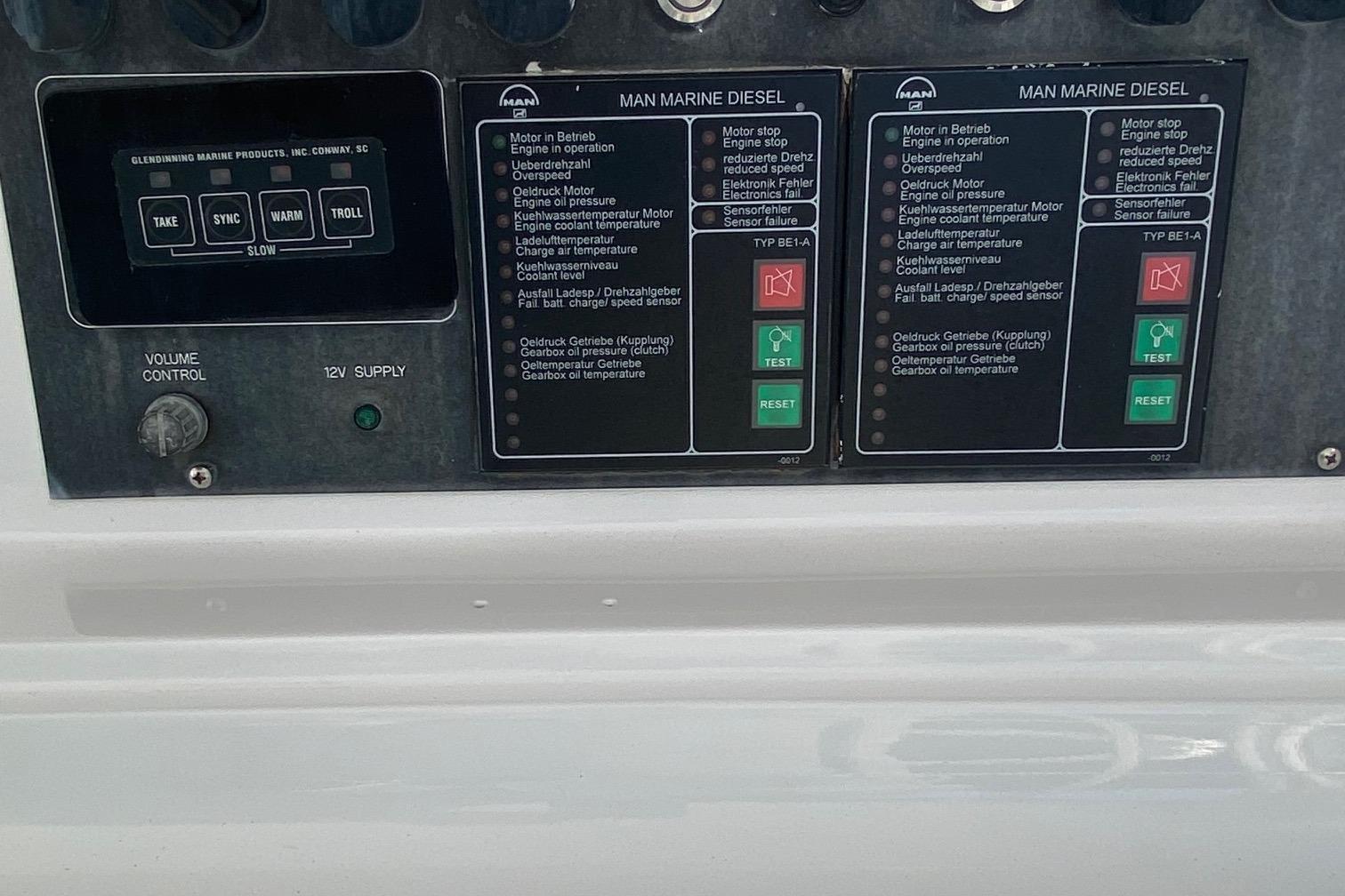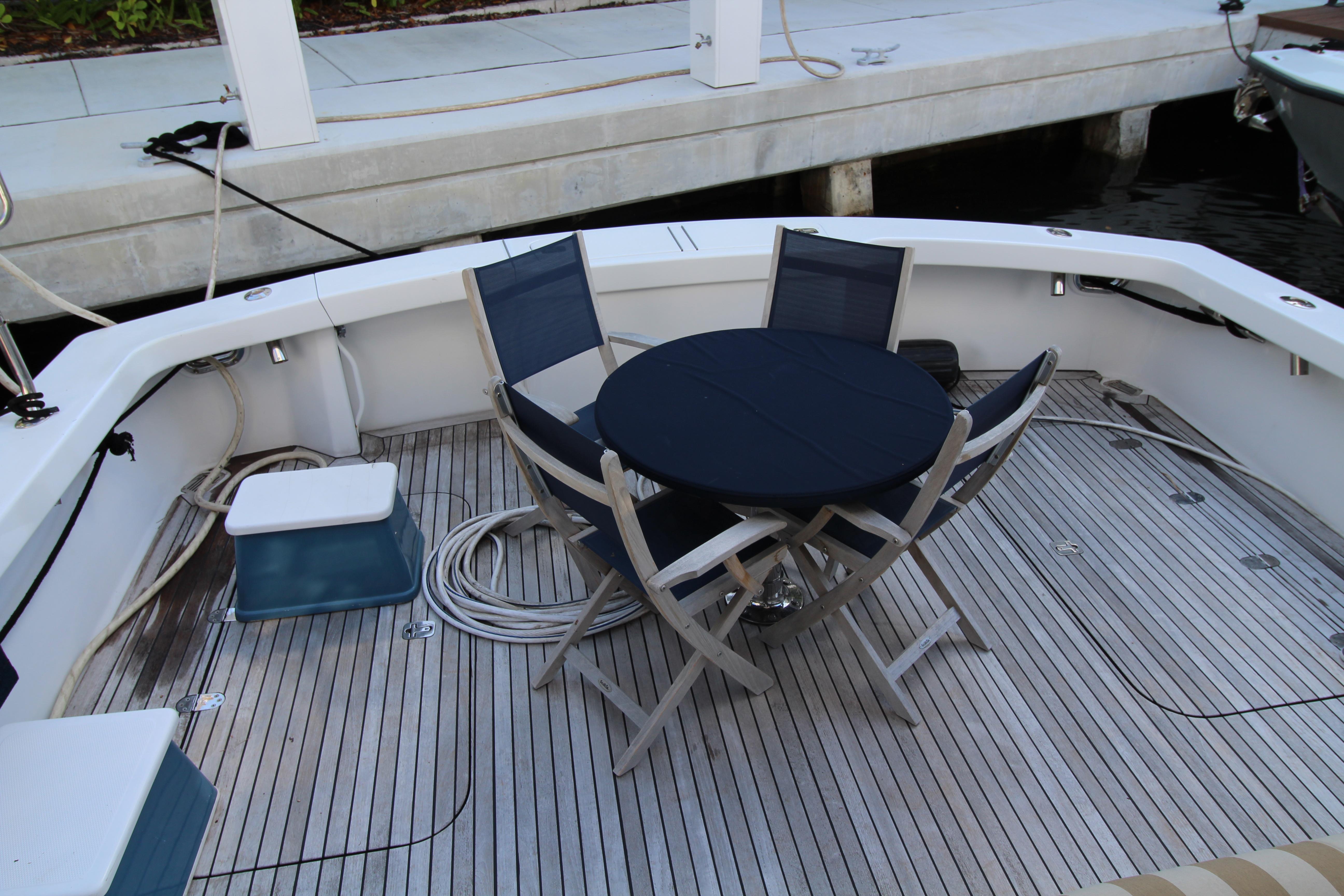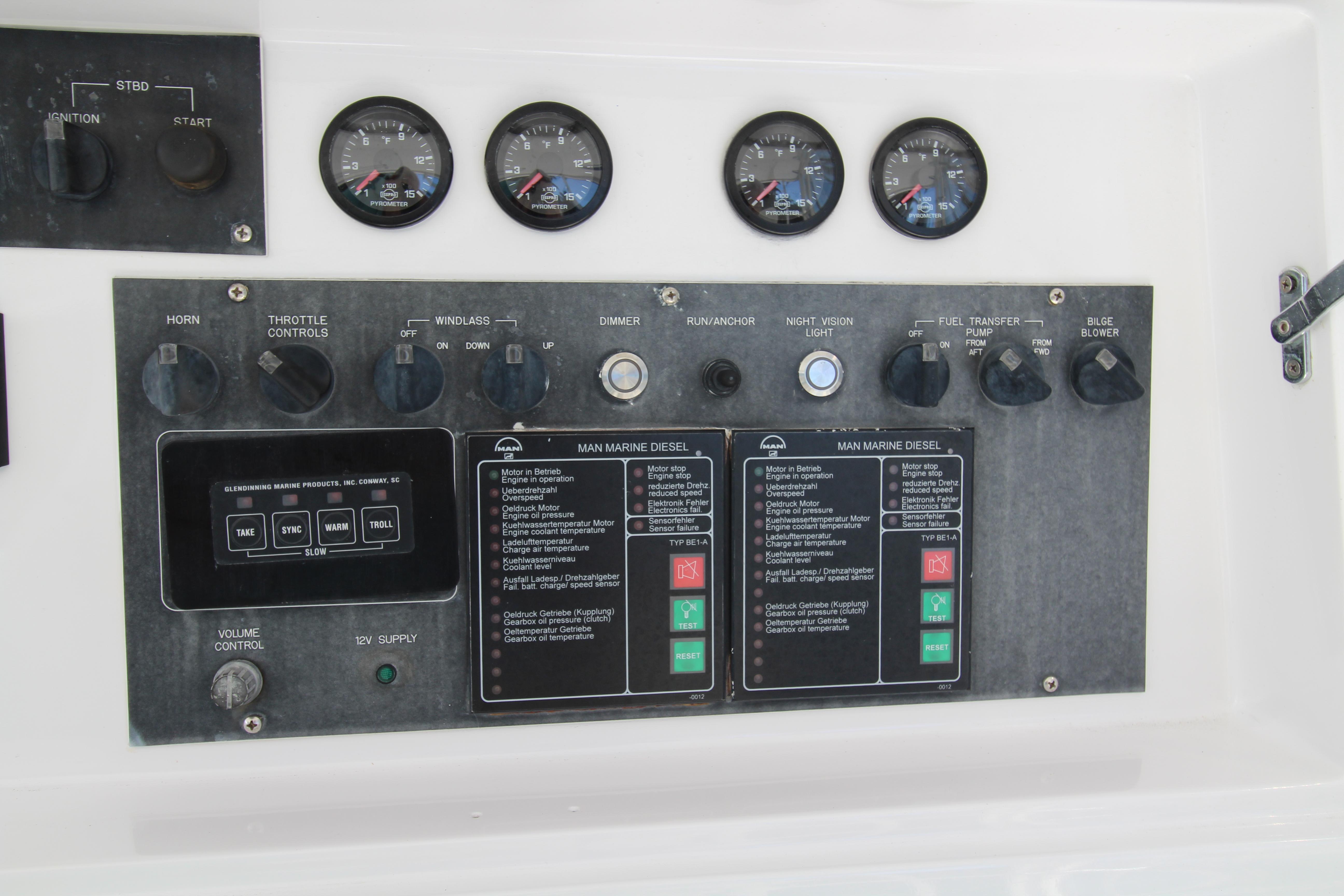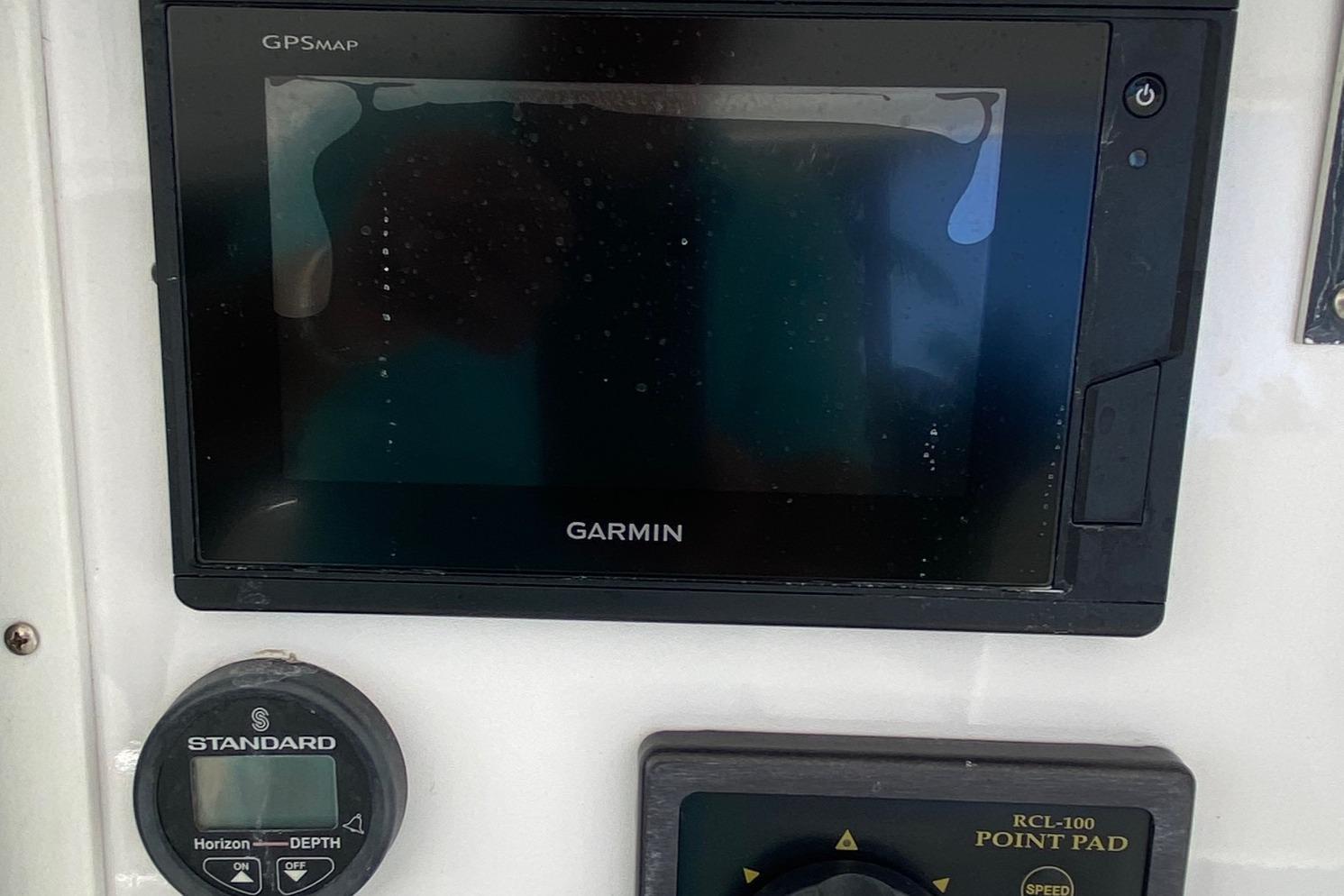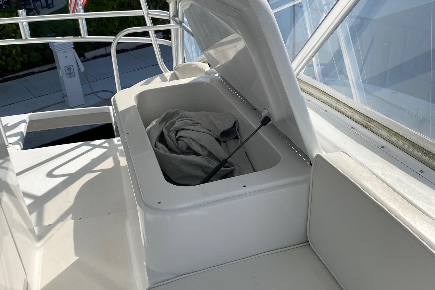 Moving up the ladder to the bridge deck the pedestal mounted captain and companion swivel chairs are in very good condition. The console houses the Furuno Radar receiver, a Garmin GPS / plotter , Simard auto pilot,. twin Icom Vhf Radios. The spotlight remote. Programmable color recessed lighting and transom mount underwater lights, really make this sport fish stand out as the evening party continues.