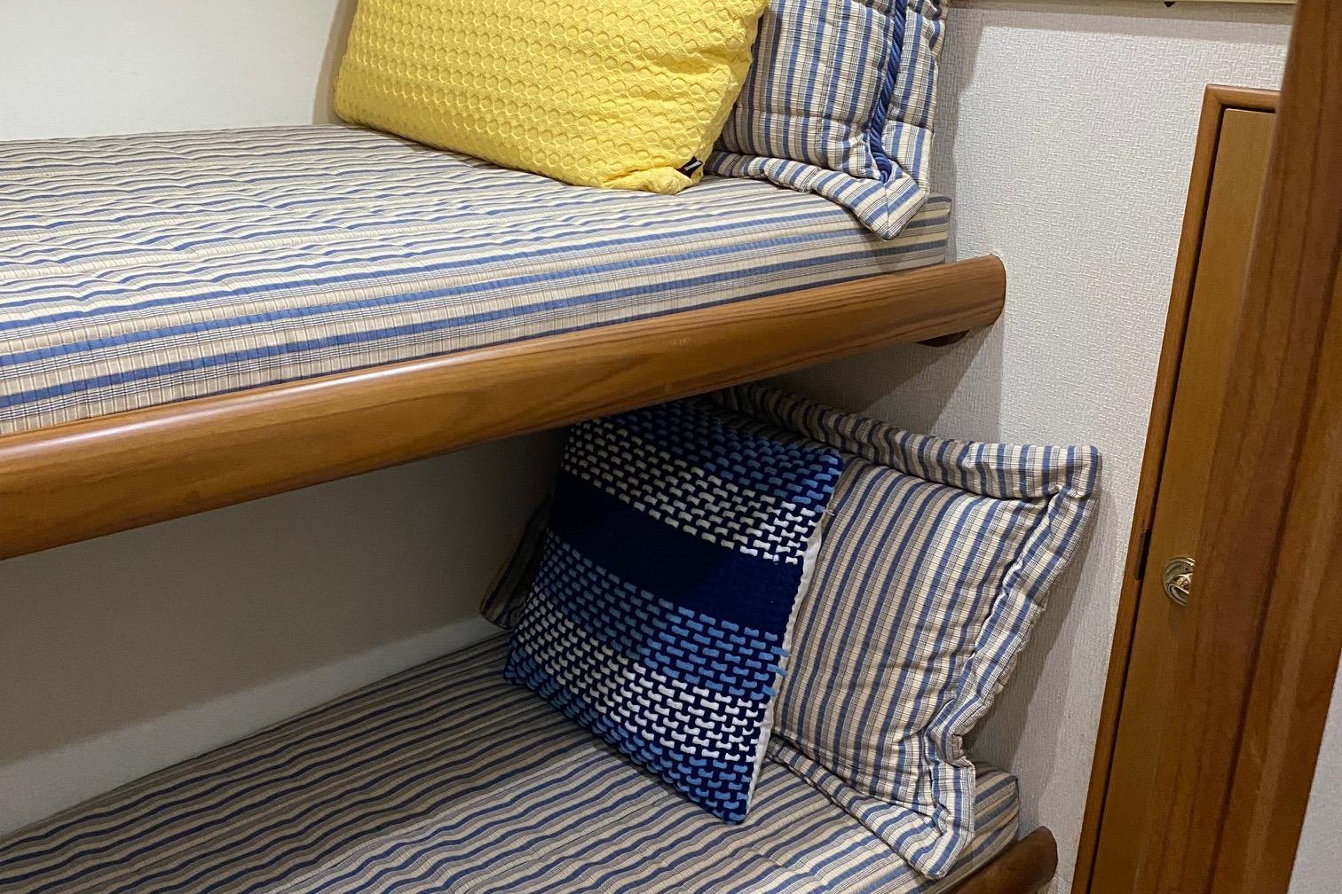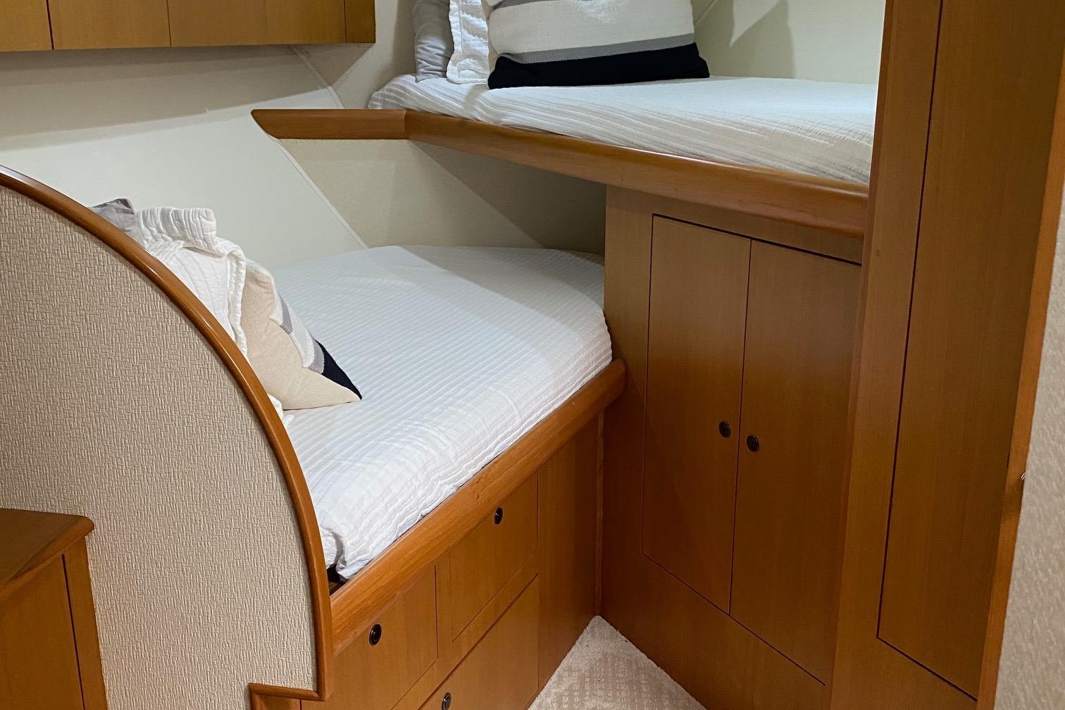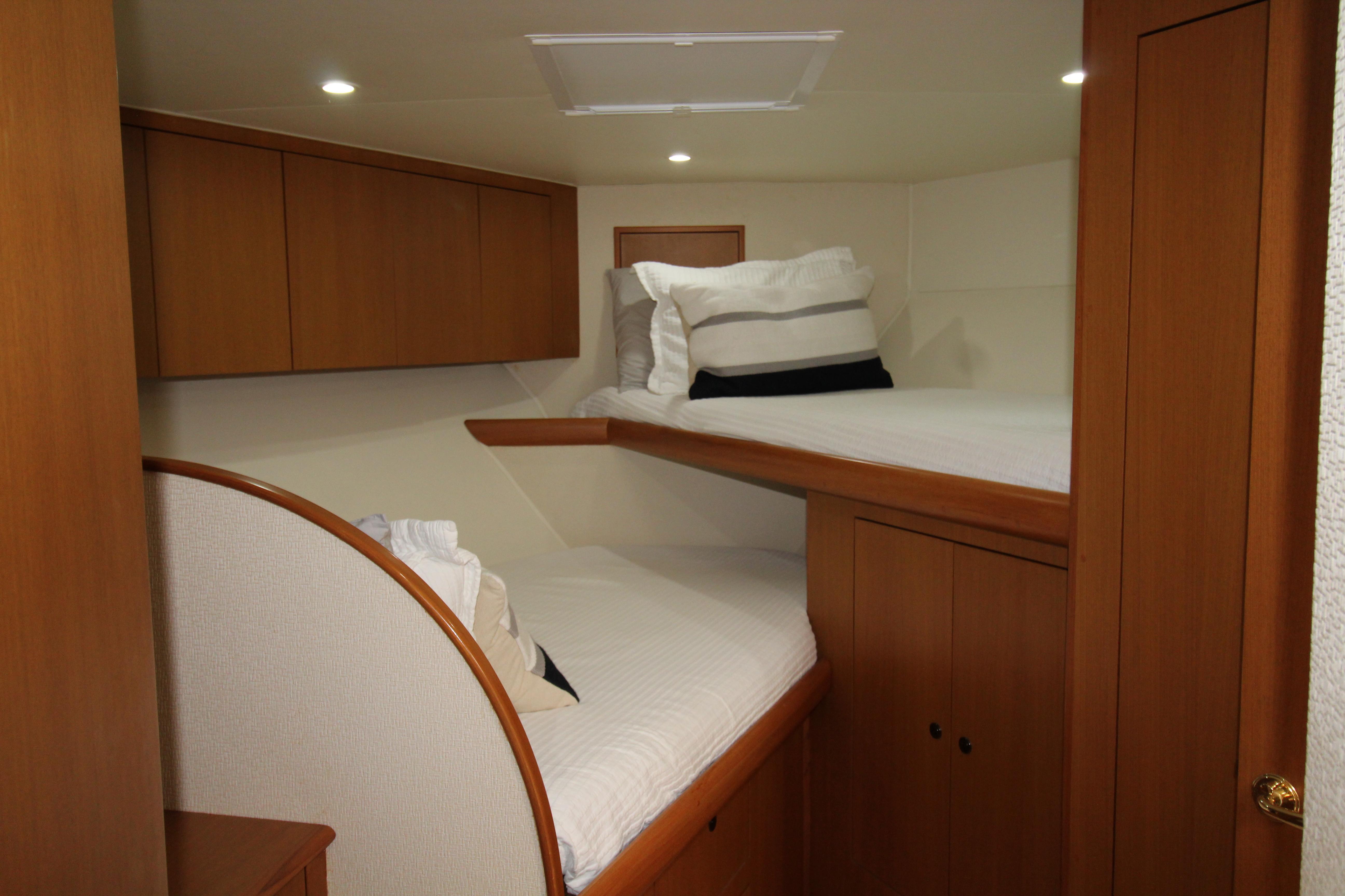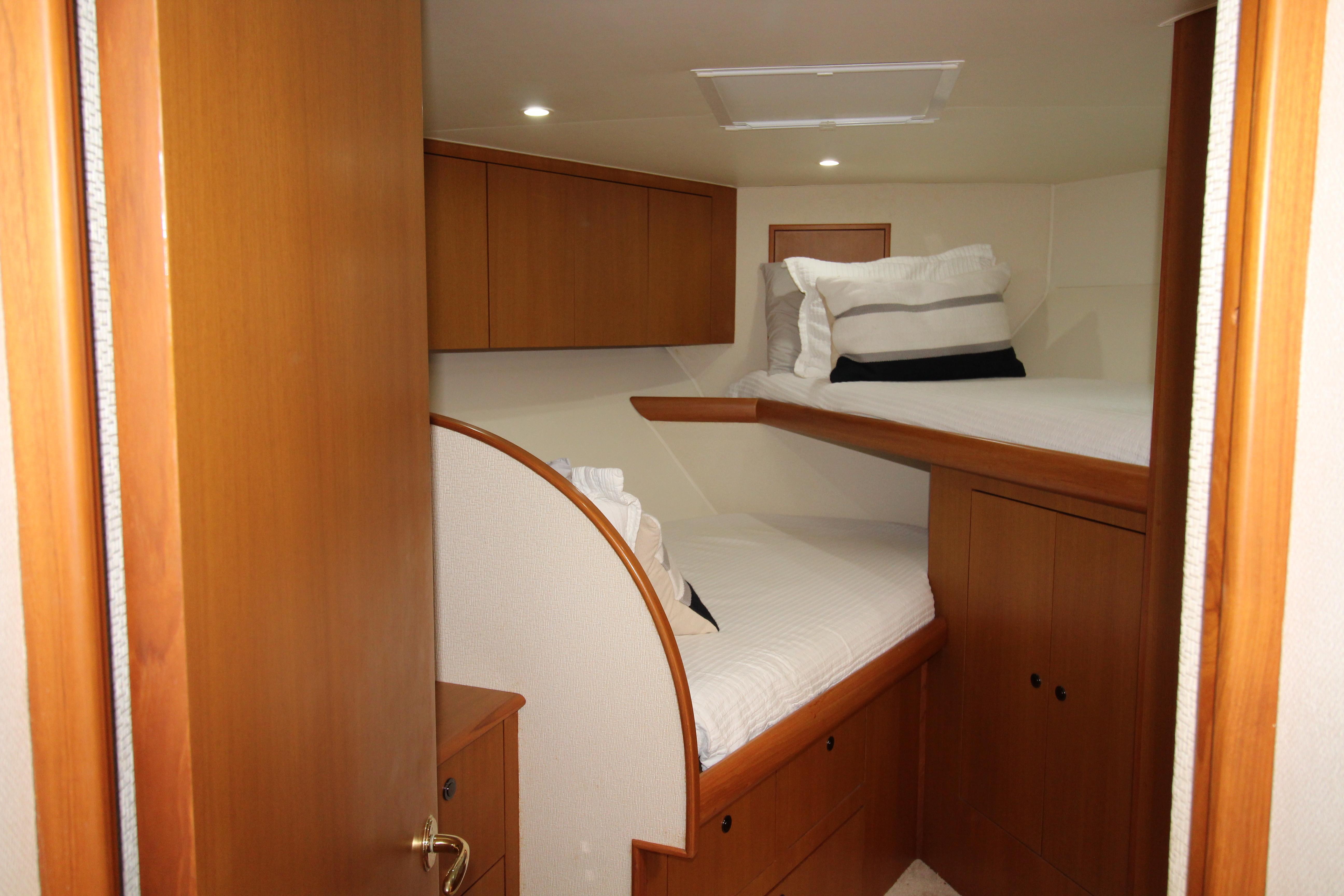 The companion way is Teak and Holley sole and brings you to a guest stacked bunk room on the starboard side. The Owners stateroom is to the port side with an en-suite head with shower and lavatory sink and vacuum flush head. Continuing forward is a v-stacked bunk , private en-suite entry to the guest head . A washer dryer and ample storage cabinetry complete the owners and guest accommodations. assuring everyone a comfortable stay while on board.