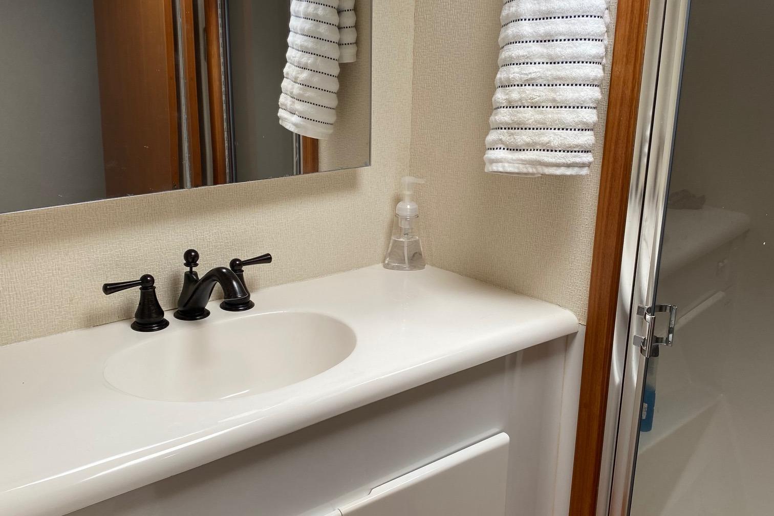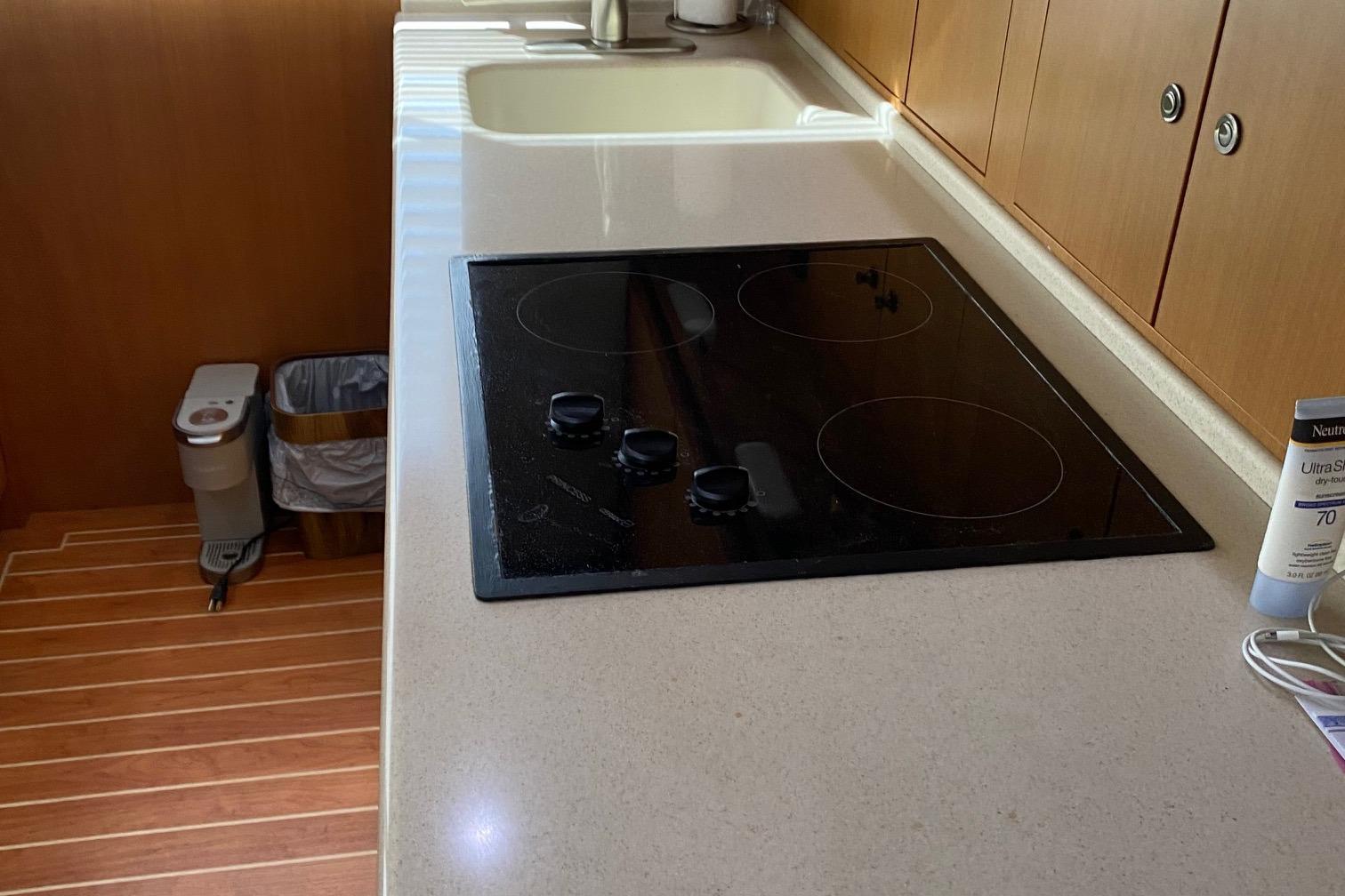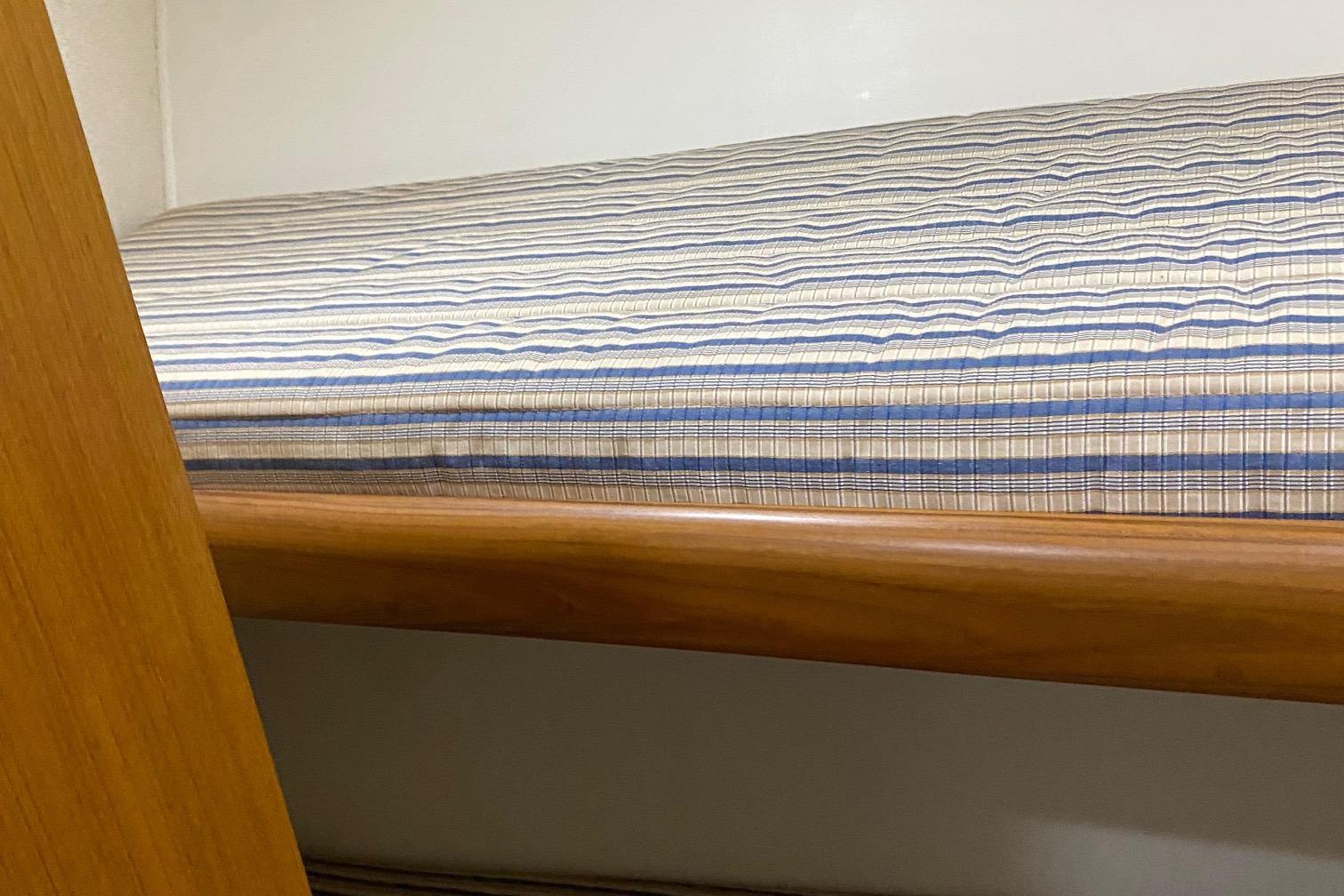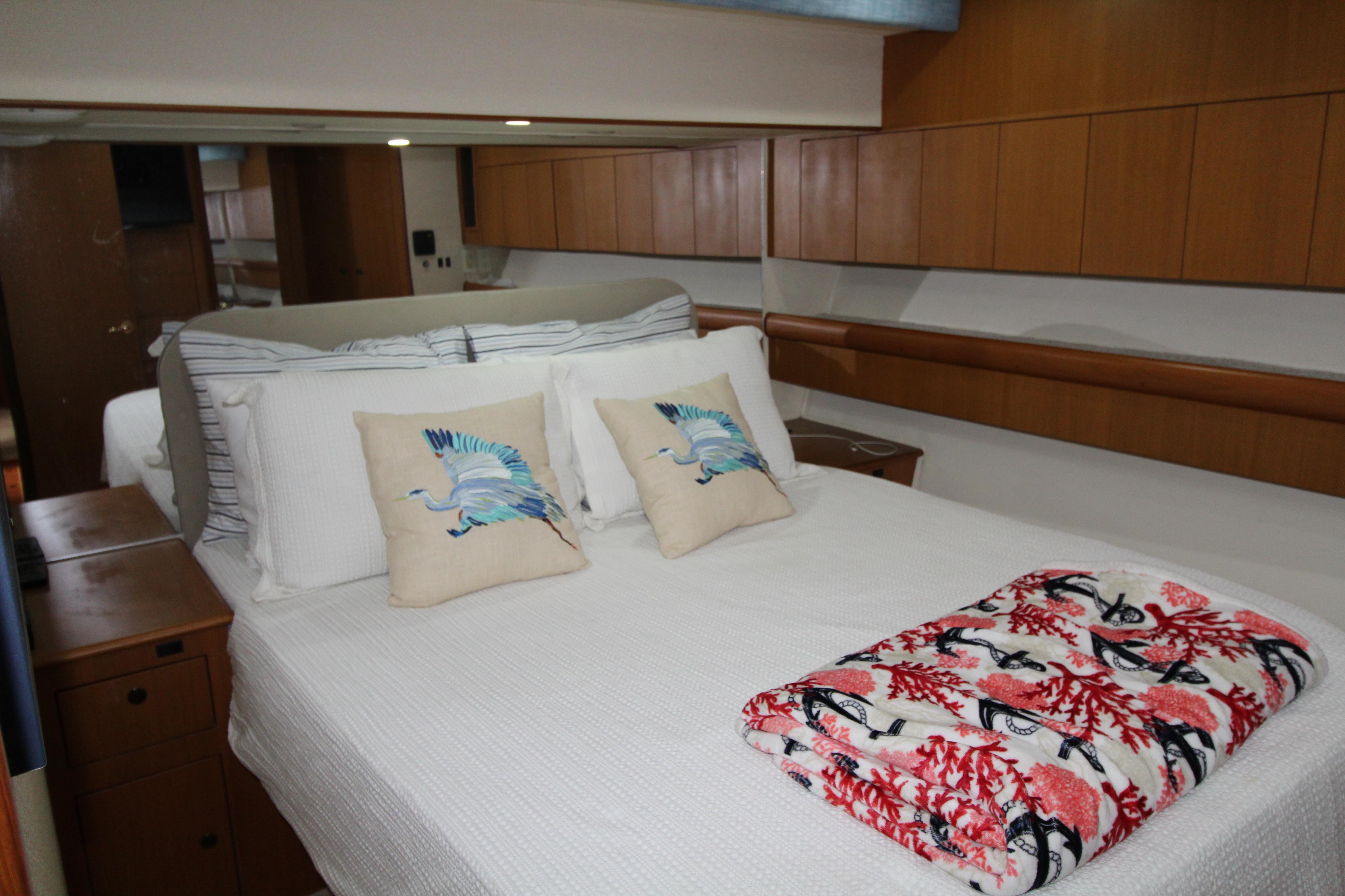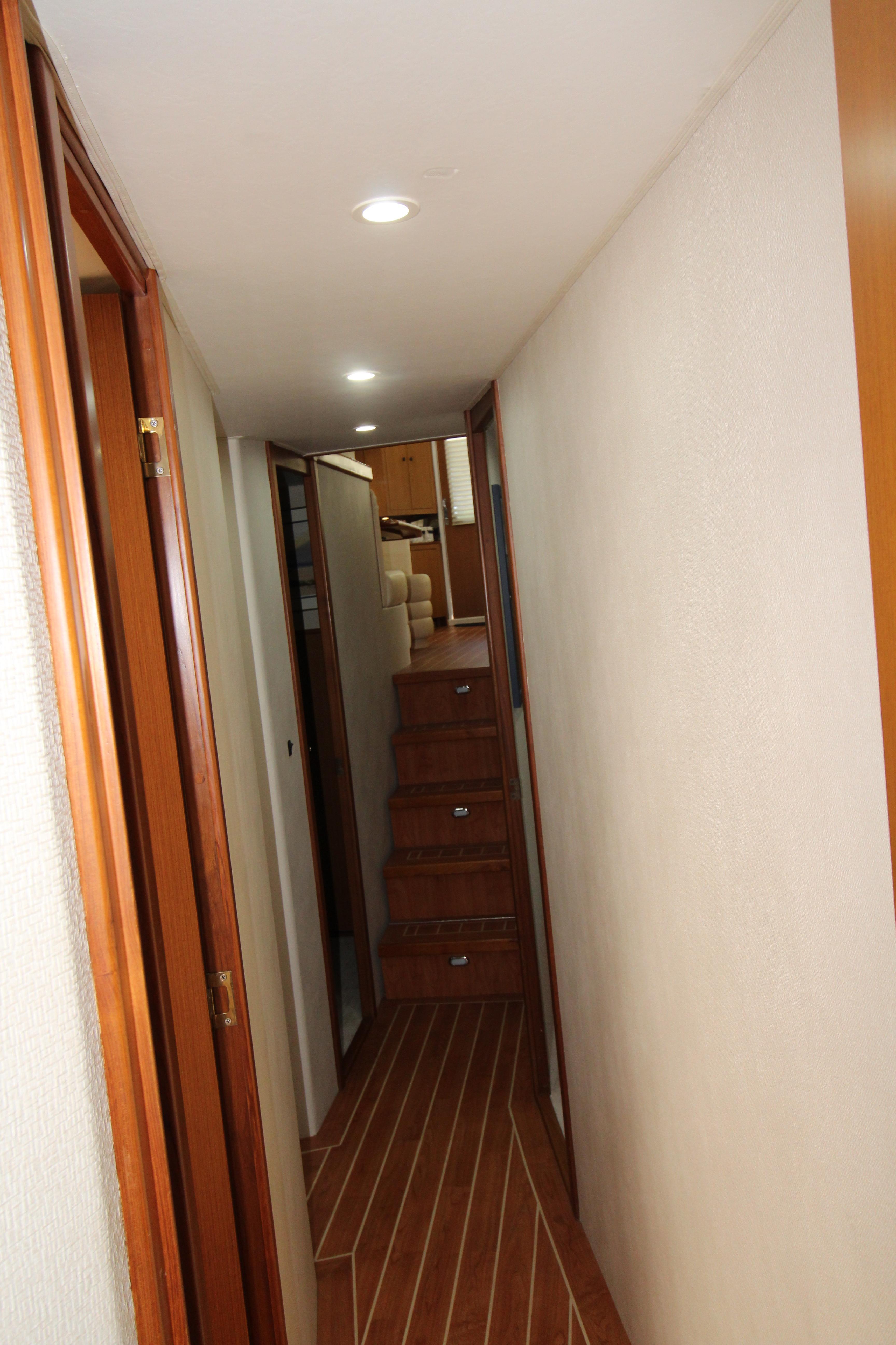 The companion way is Teak and Holley sole and brings you to a guest stacked bunk room on the starboard side. The Owners stateroom is to the port side with an en-suite head with shower and lavatory sink and vacuum flush head. Continuing forward is a v-stacked bunk , private en-suite entry to the guest head . A washer dryer and ample storage cabinetry complete the owners and guest accommodations. assuring everyone a comfortable stay while on board.