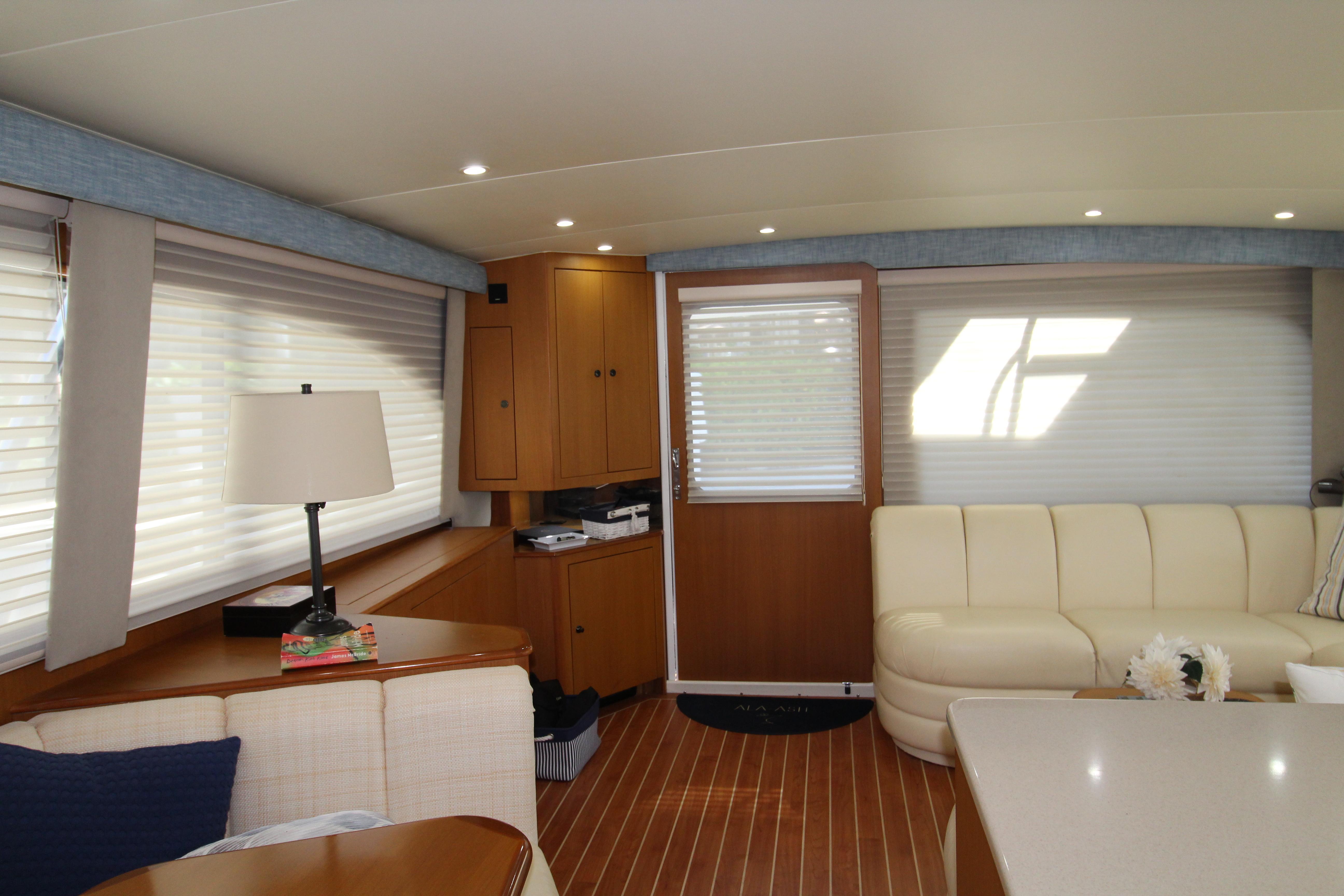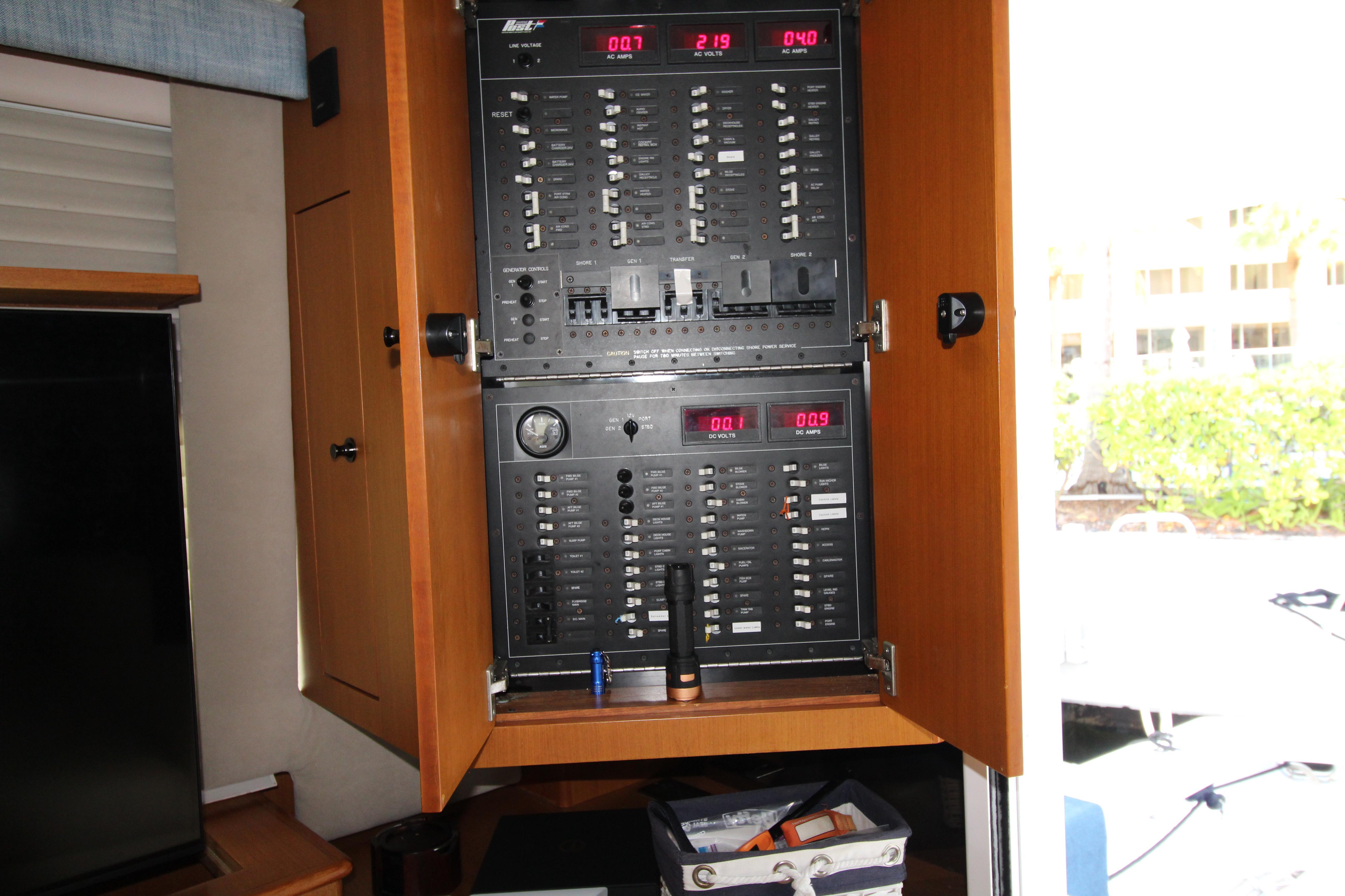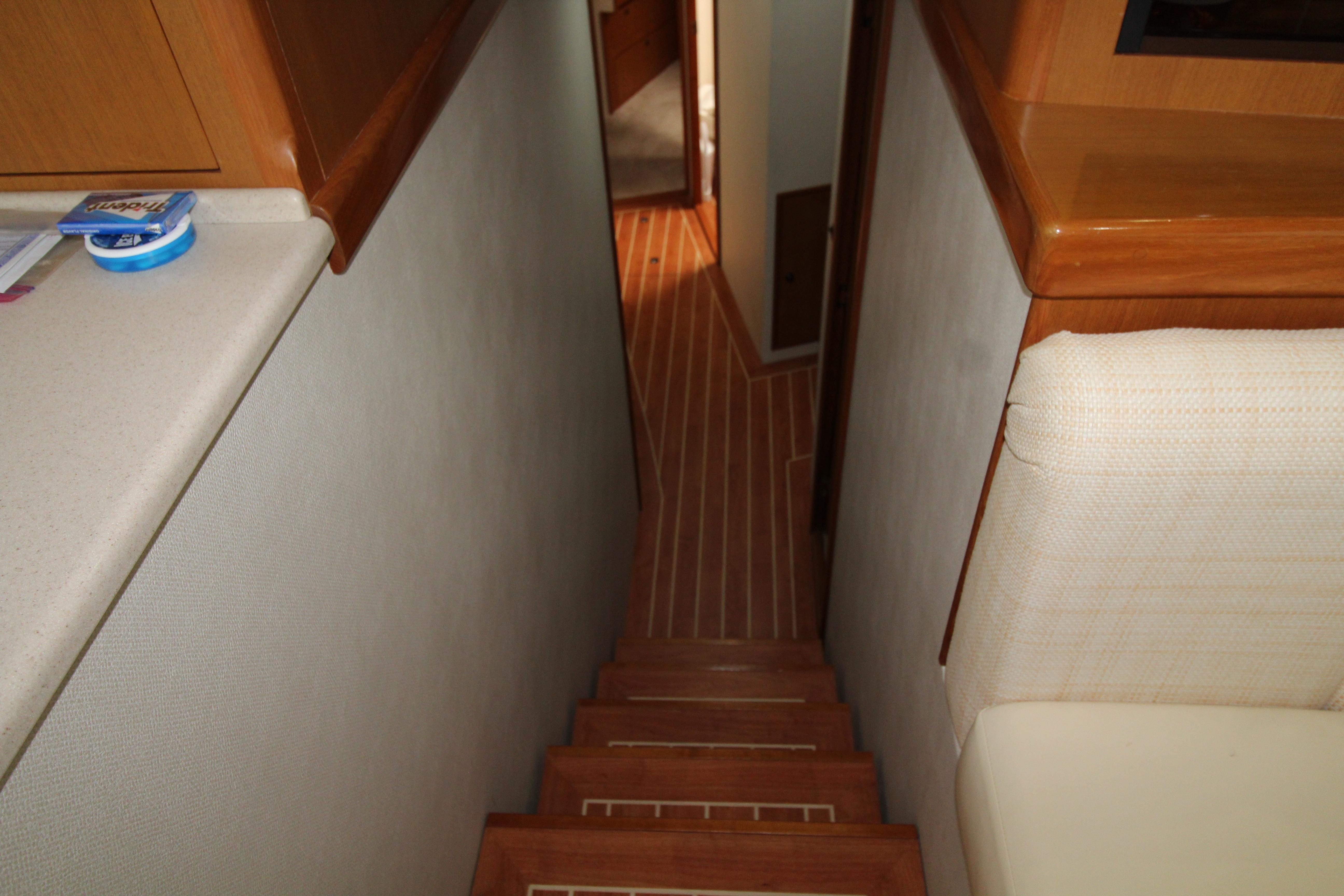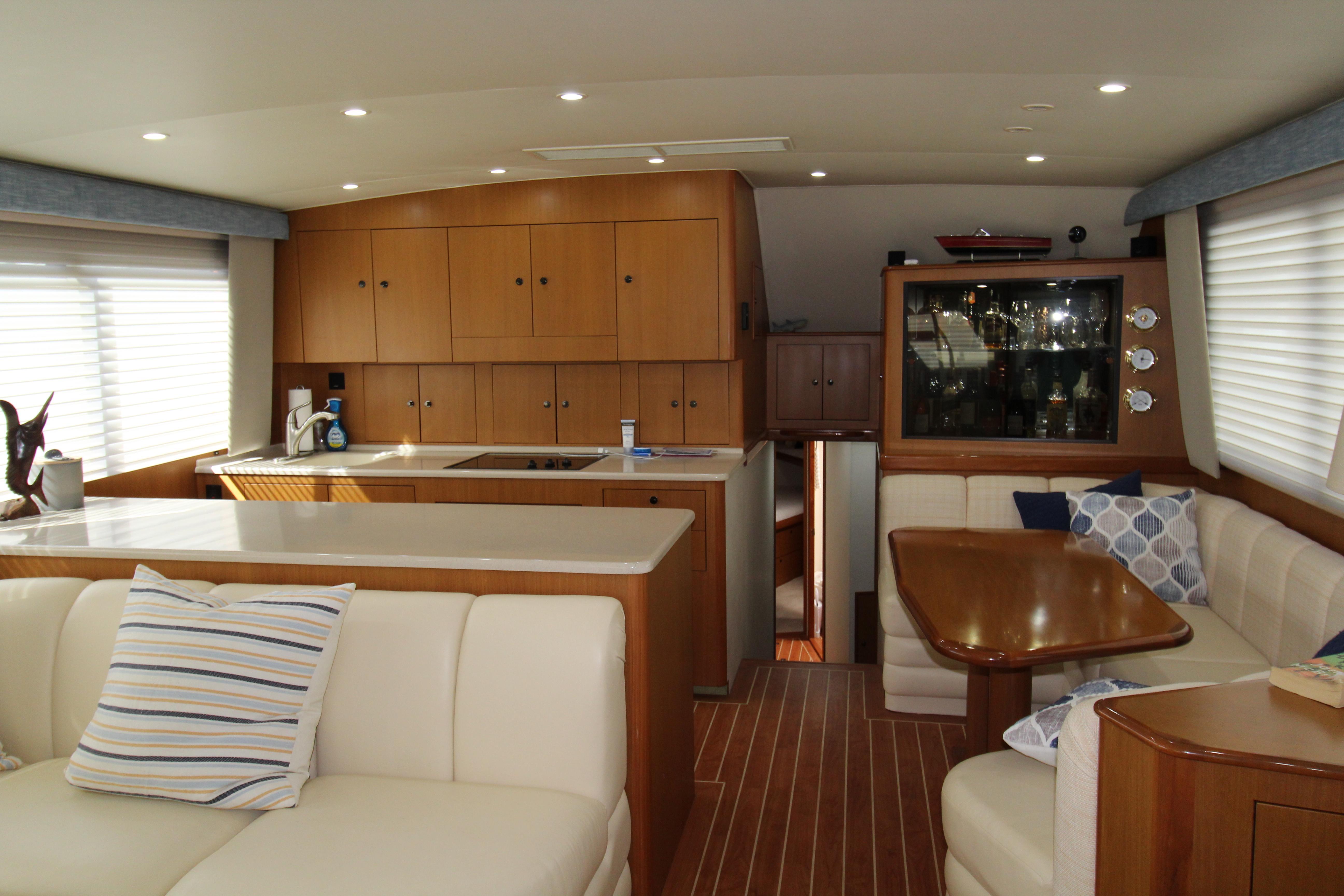 At first glance this 2003 Post stands out as a well maintained and distinctive semi custom Sport fish. The teak soled cockpit built in Deck Fish Boxes, live well, tackle station, Outriggers, engine room access and ladder to the bridge deck. Complete a serious fishing platform but equaling accommodating for the cruising enthusiast . Entering the Salon it is flanked with an L shaped settee with storage under the seats. A custom recessed retractable Flat screen T.V. raises up from the cabinet on the starboard side adjacent to the main electrical panel.
