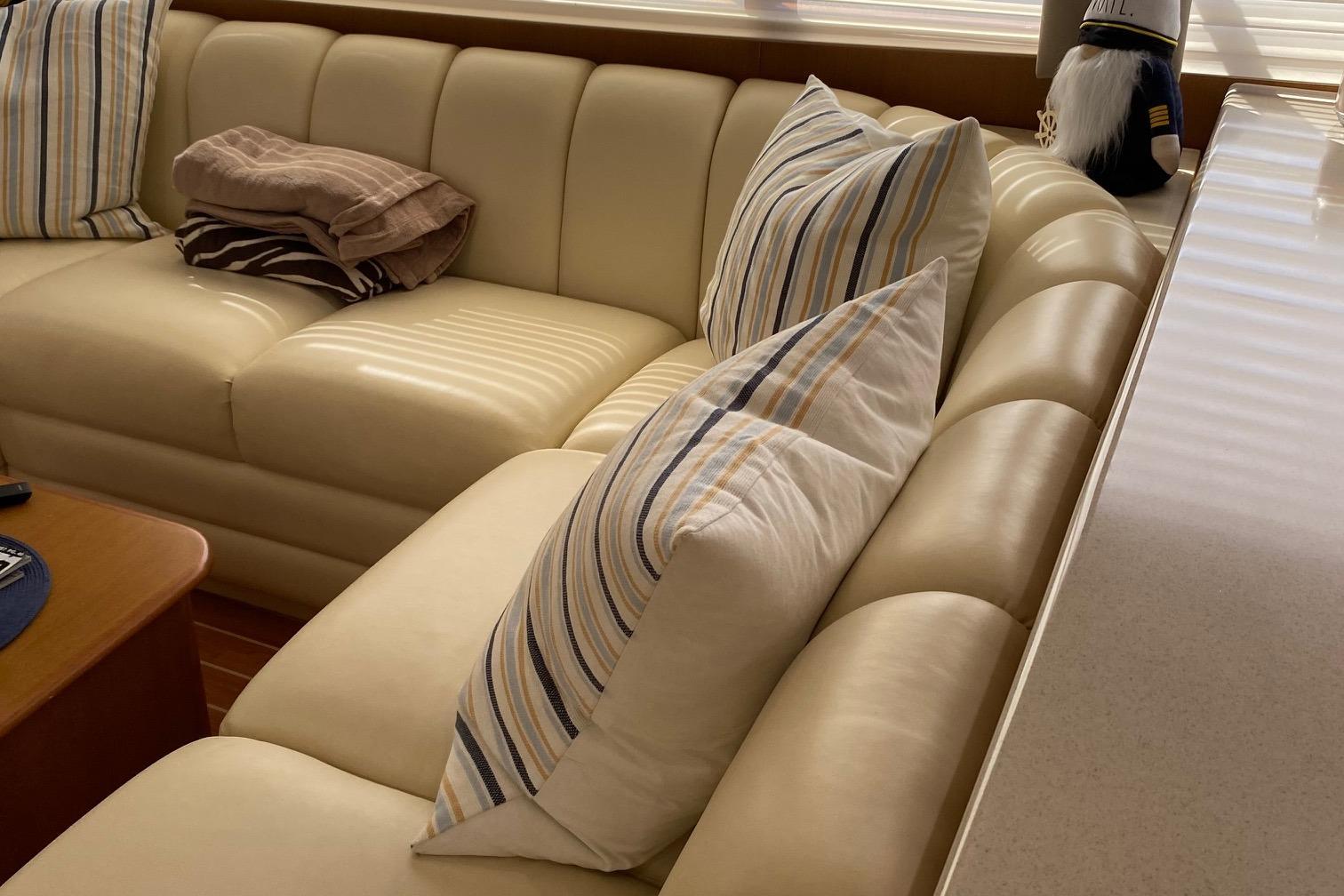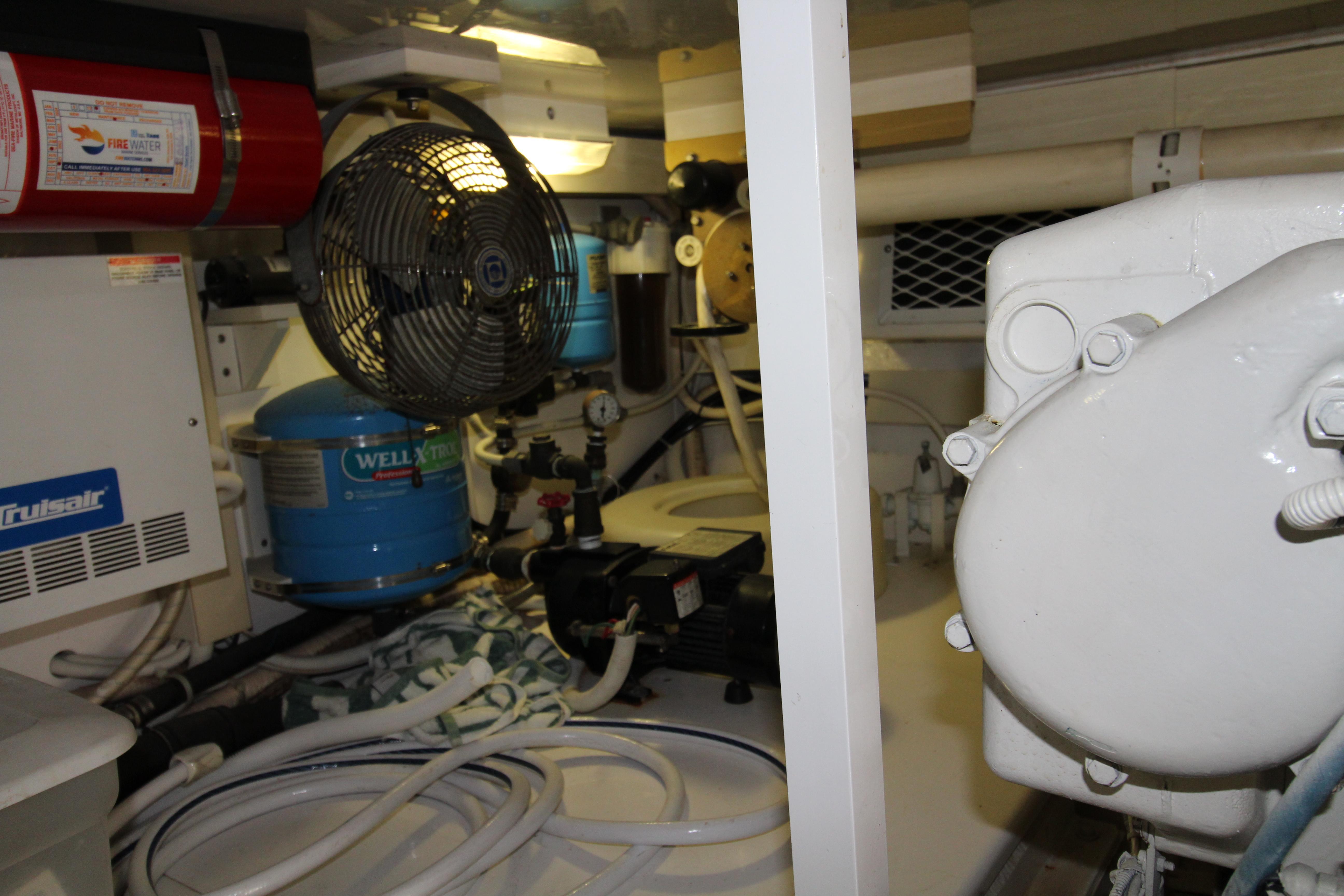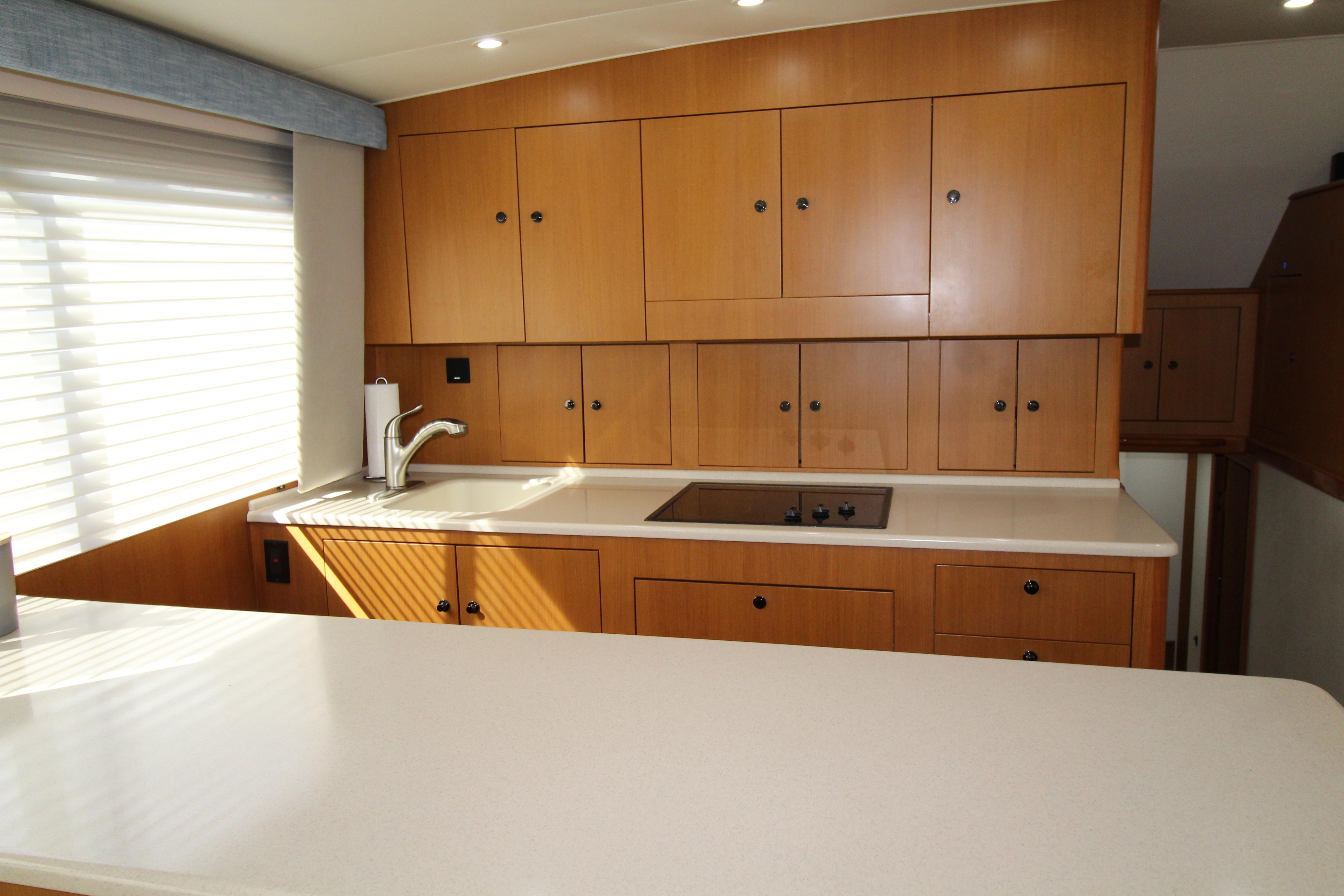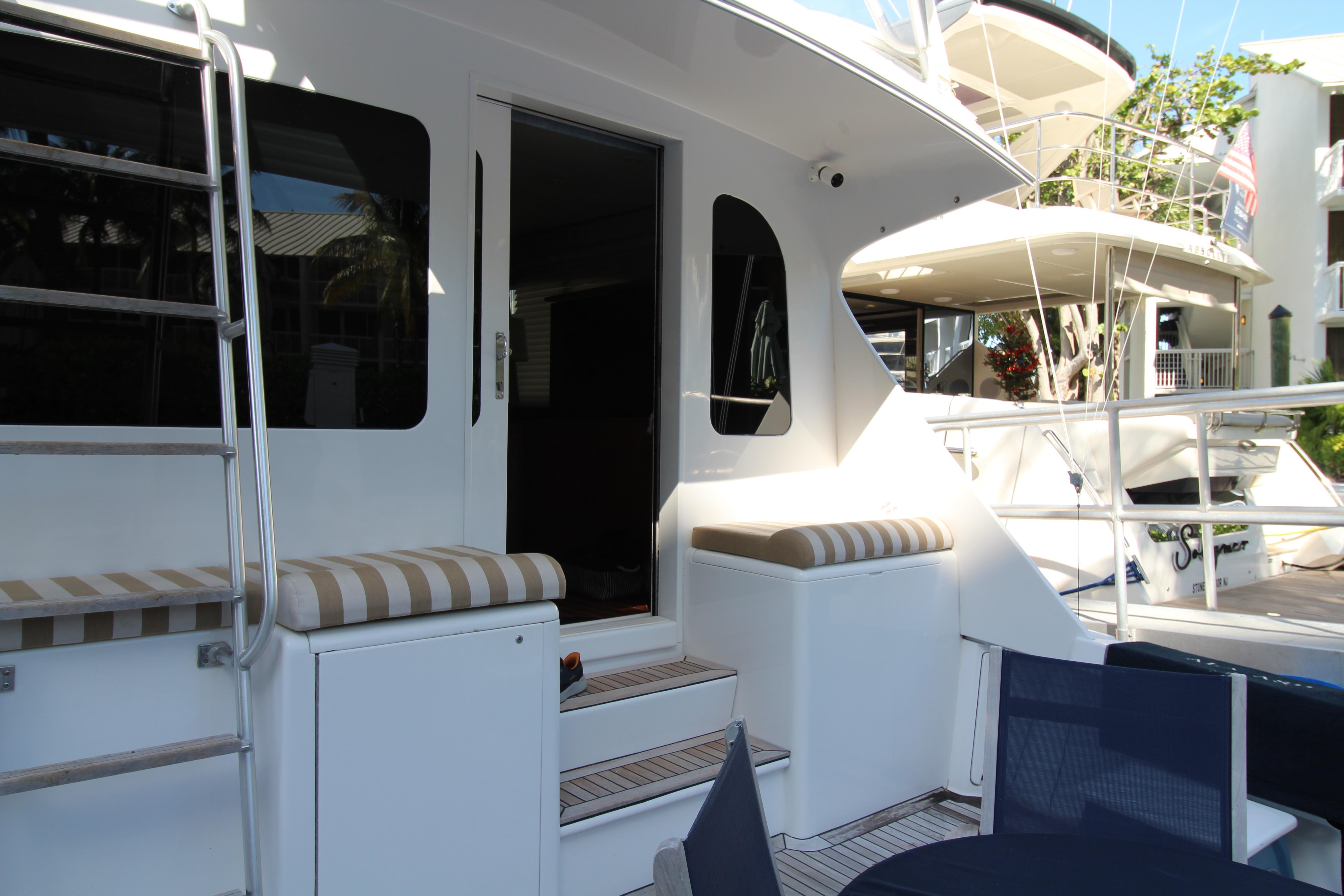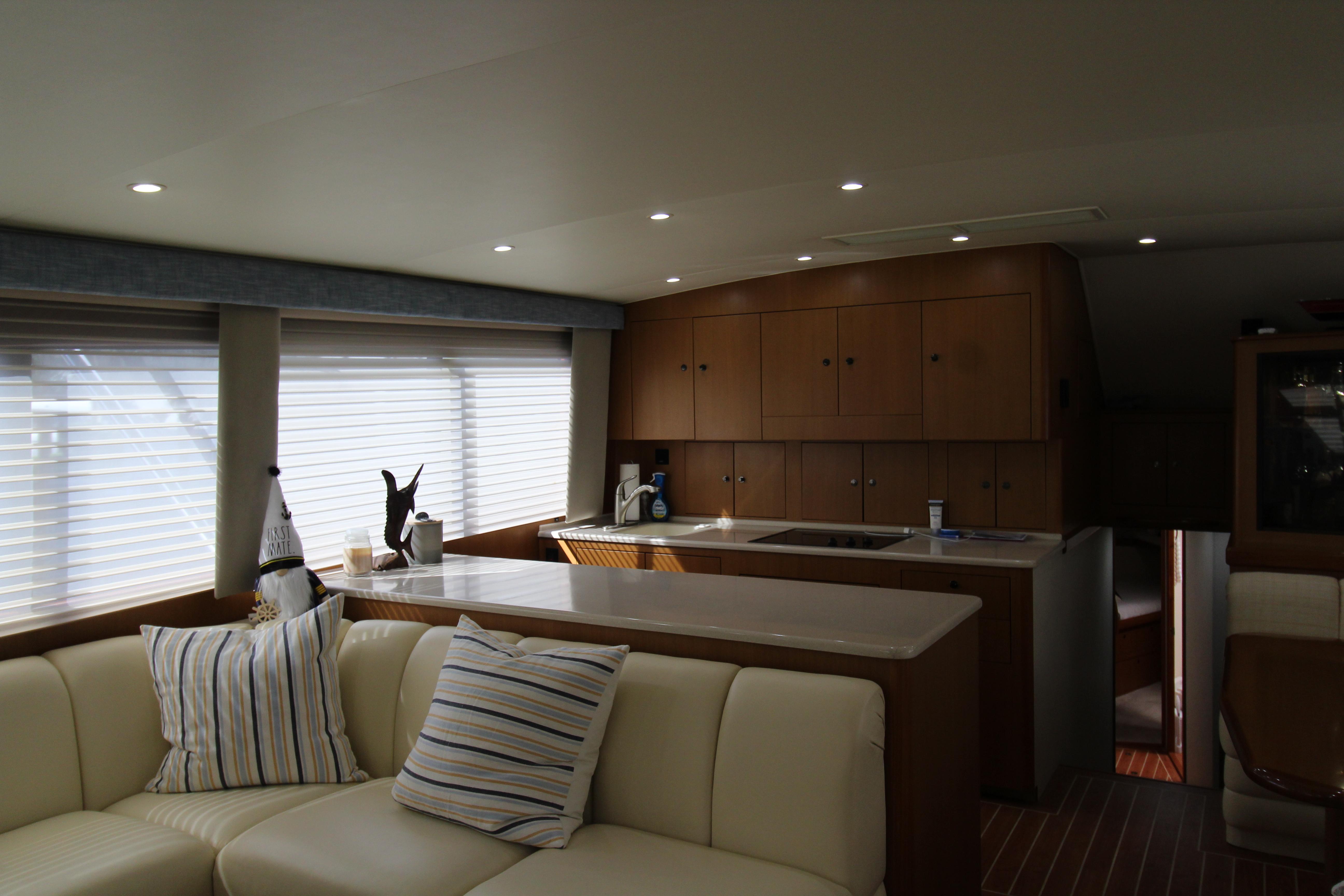 At first glance this 2003 Post stands out as a well maintained and distinctive semi custom Sport fish. The teak soled cockpit built in Deck Fish Boxes, live well, tackle station, Outriggers, engine room access and ladder to the bridge deck. Complete a serious fishing platform but equaling accommodating for the cruising enthusiast . Entering the Salon it is flanked with an L shaped settee with storage under the seats. A custom recessed retractable Flat screen T.V. raises up from the cabinet on the starboard side adjacent to the main electrical panel.