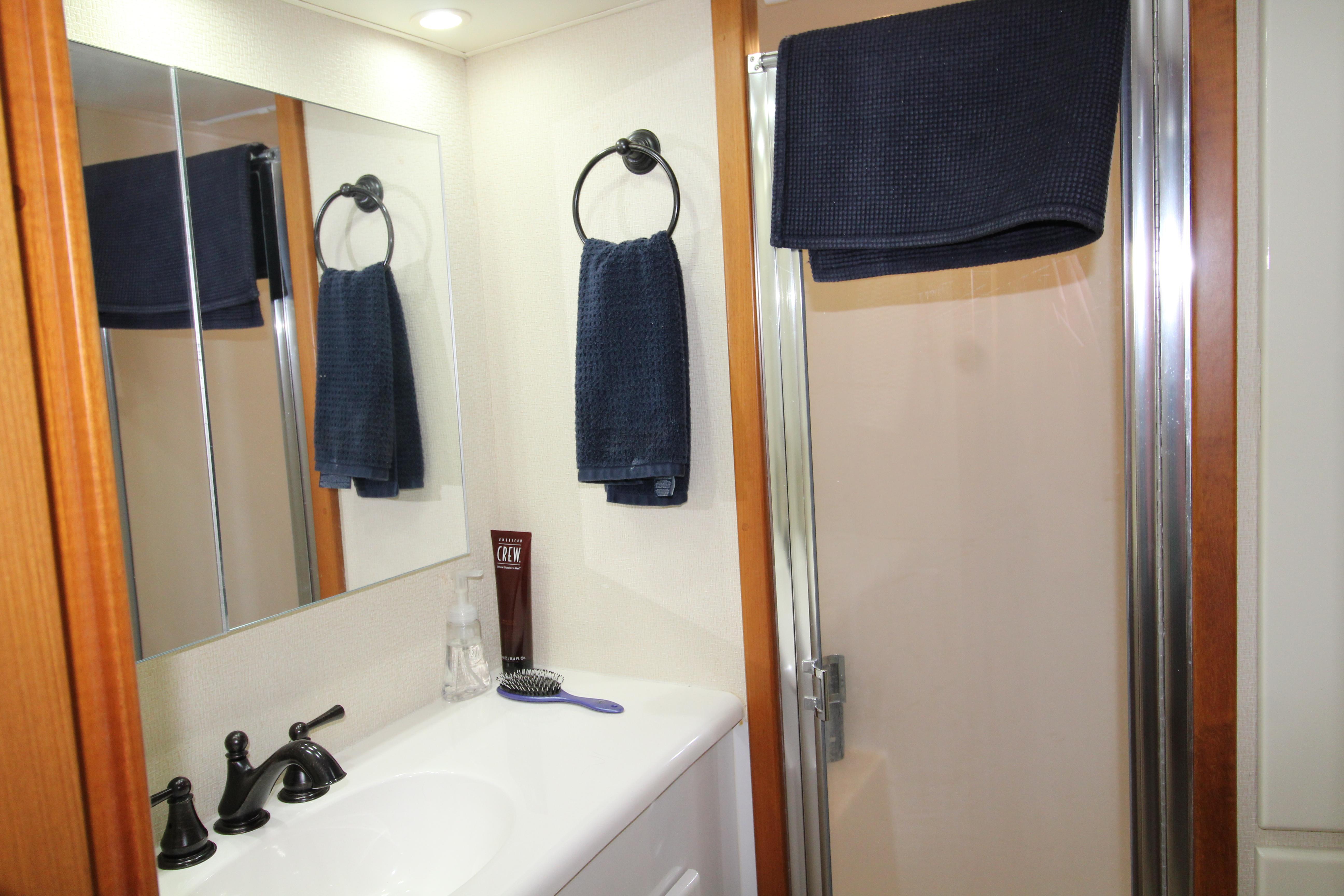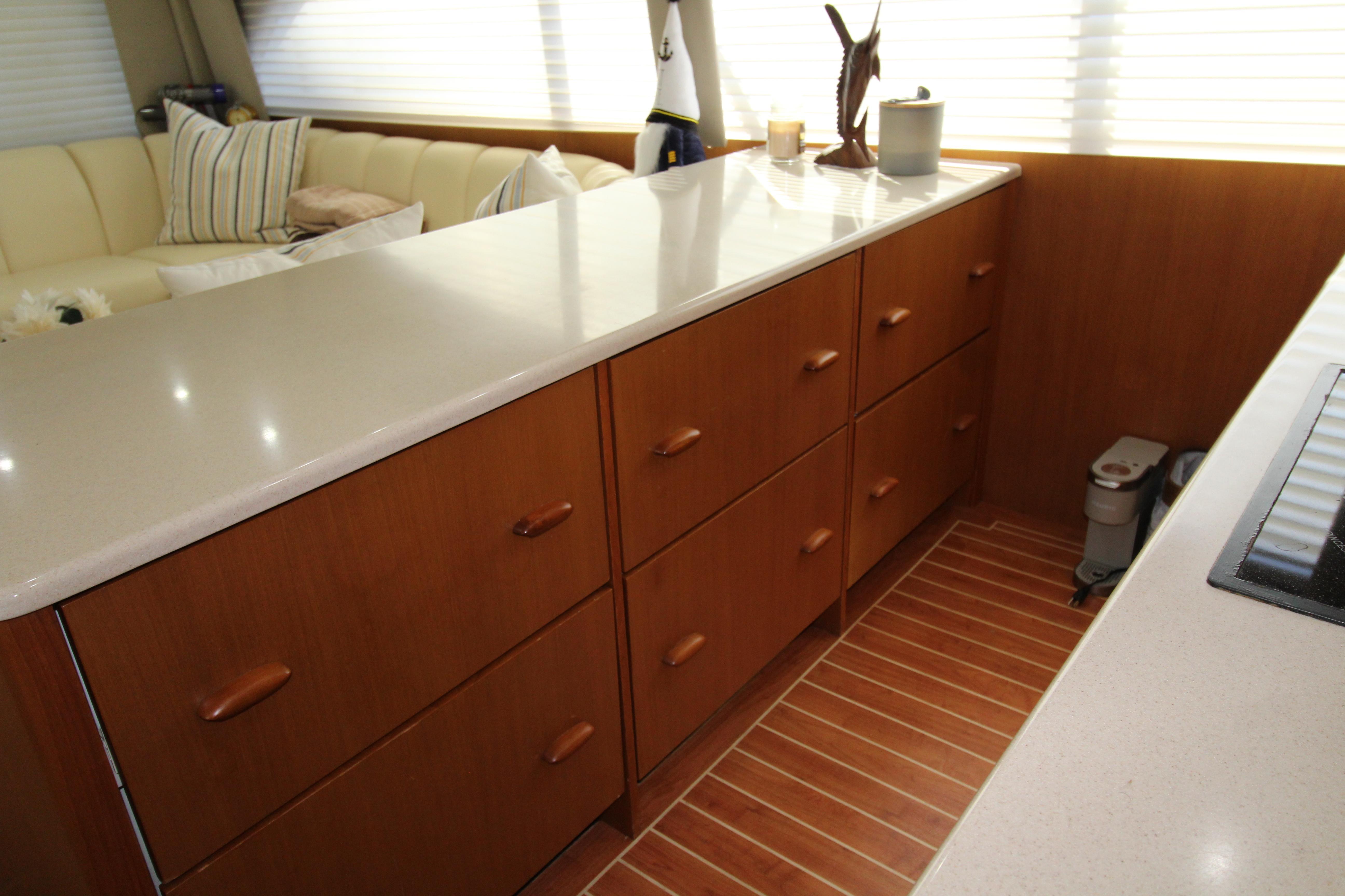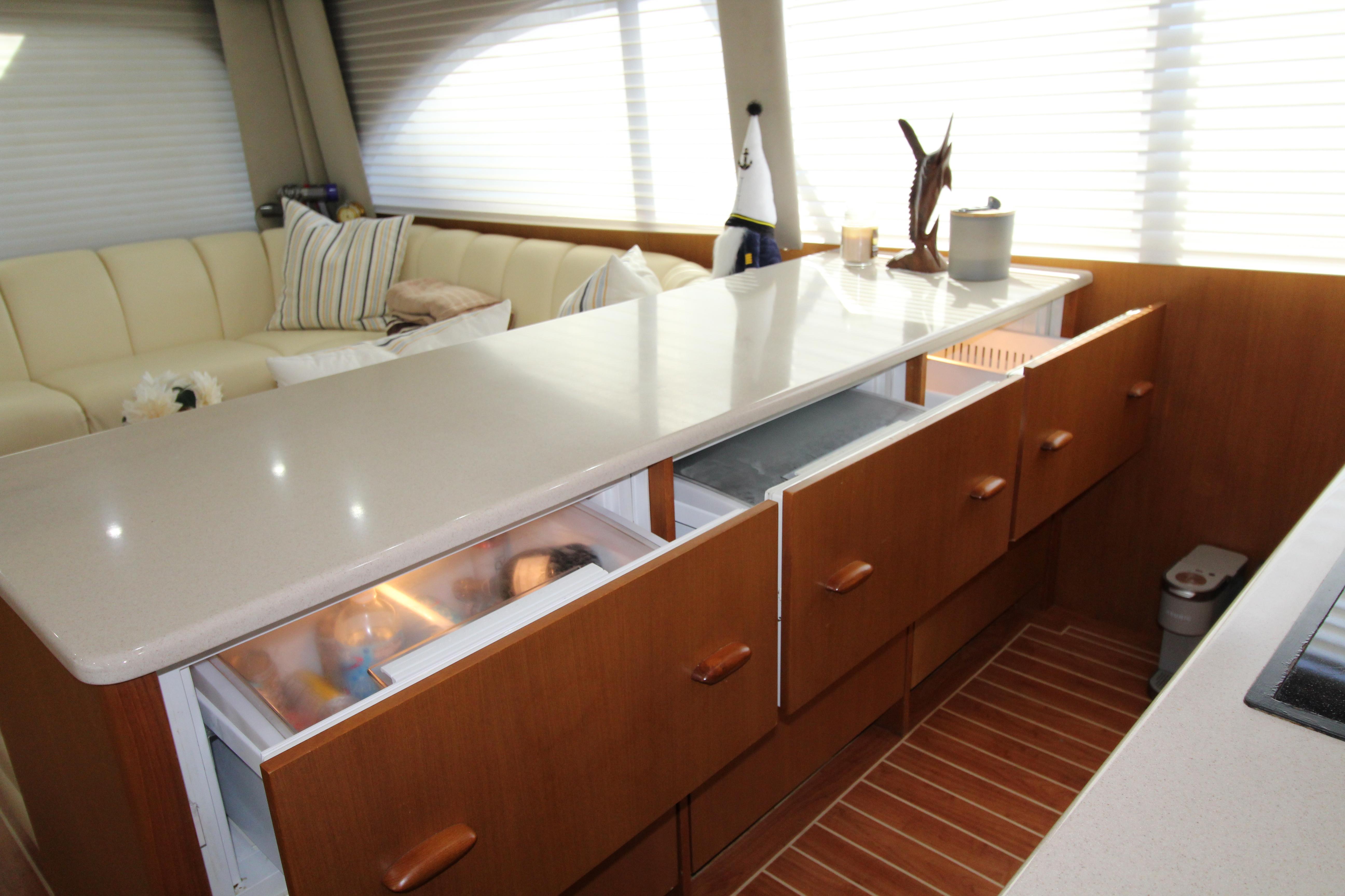 The galley is equipped with six drawers of under counter refrigeration/ freezer. The sink and Flat top stove and generous storage cabinets housing the Microwave /convection oven, are on the opposing bulk head.. The dinette is located on the starboard side with wrap around seating and table. It features a custom bar accented by recessed lighting that adds a touch of distinction.