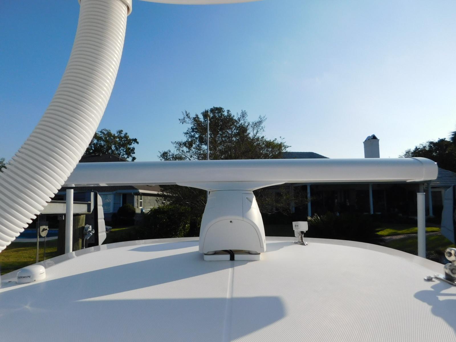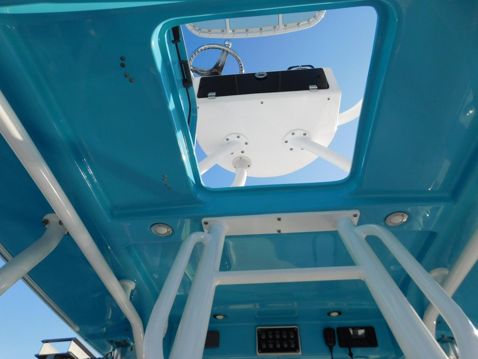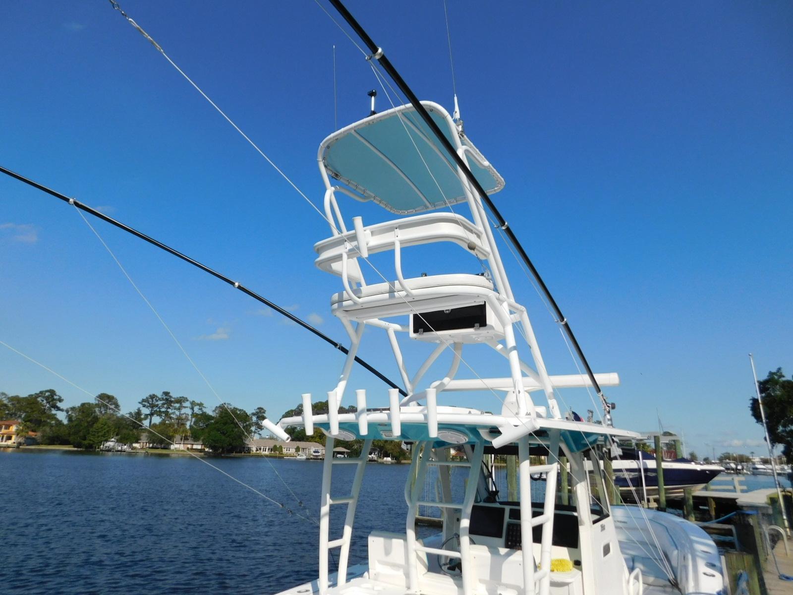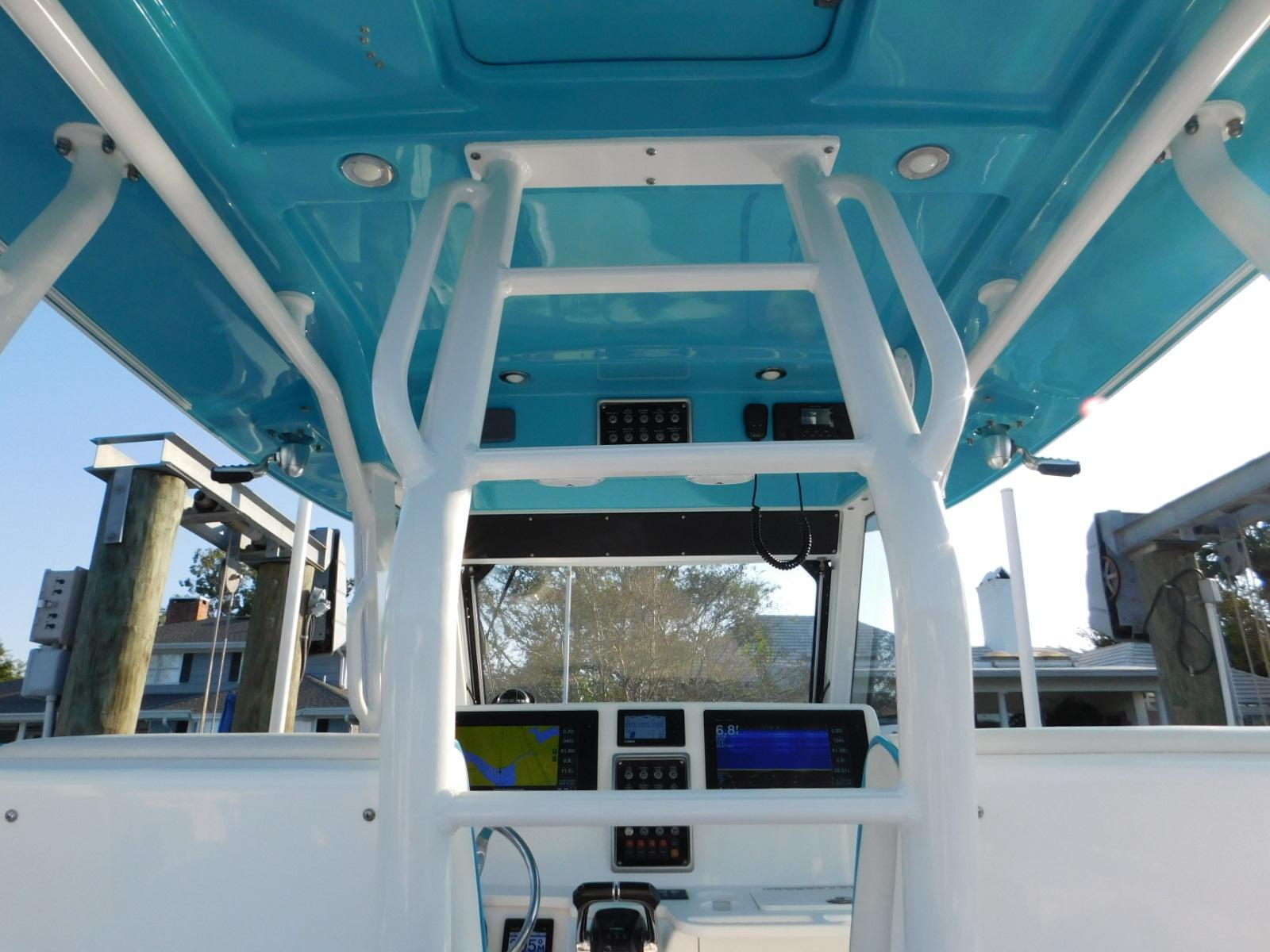 Fiberglass hardtop with aluminum powder-coated frame includes LED lights, spreader lights, electric sliding windshield, electronics box, (5) rod holders, a set of kingfish rod holders