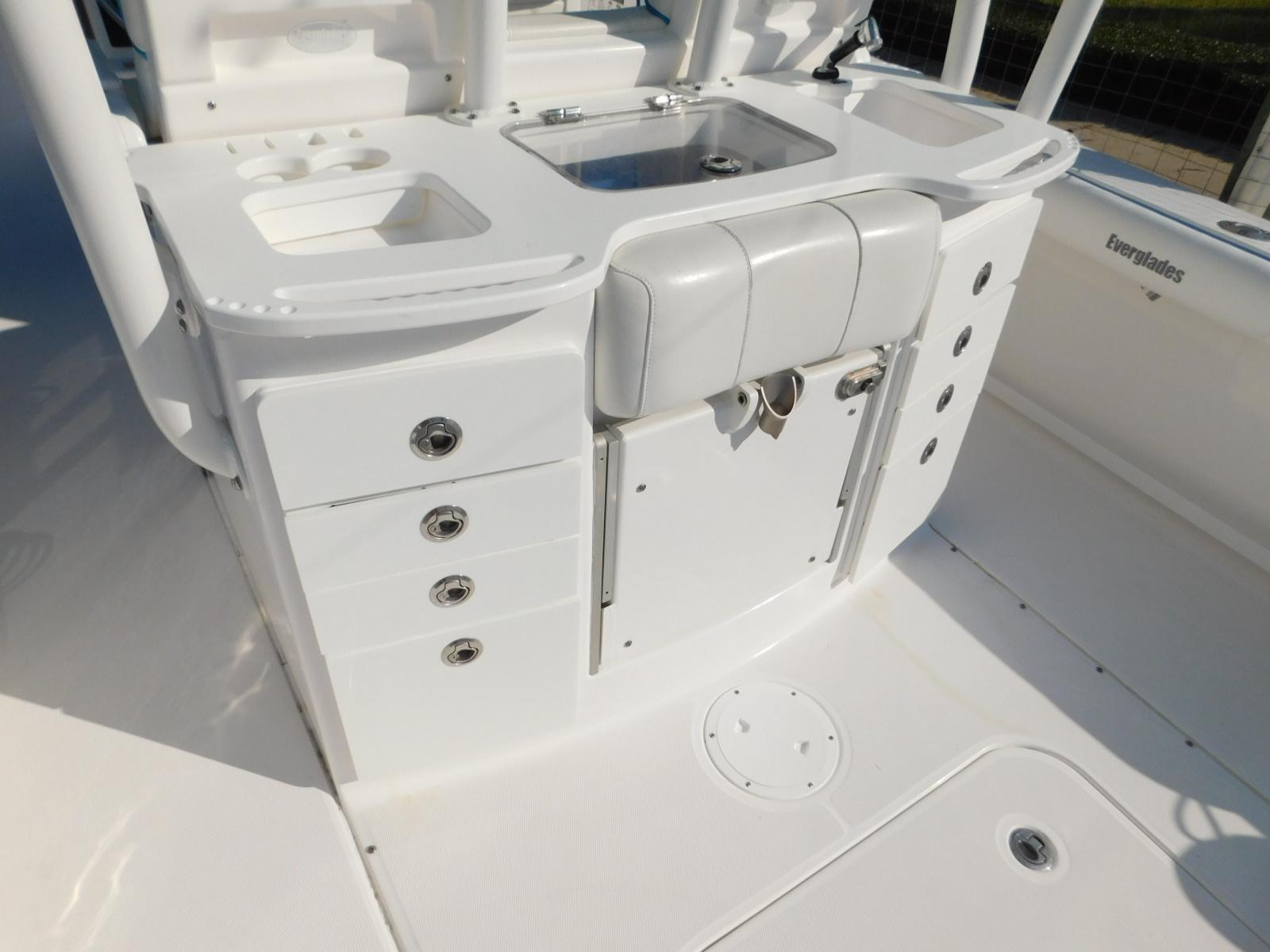 There is plush custom seating in the bow and forward of the console, and the electric bow table also converts to a comfortable, cushioned sun pad. In the stern there are folding seats and a folding fighting chair with gimbal, all standard. Other standard conveniences include a china bowl head with macerator and holding tank, a sink with shower in the head, and a 35-gallon fresh water wash down. For ultimate fishability, customize with options like a side utility door, bow thruster, crow's nest, or a choice of two different 2nd stations. With the 355cc, Everglades has raised the bar on fishing boats.