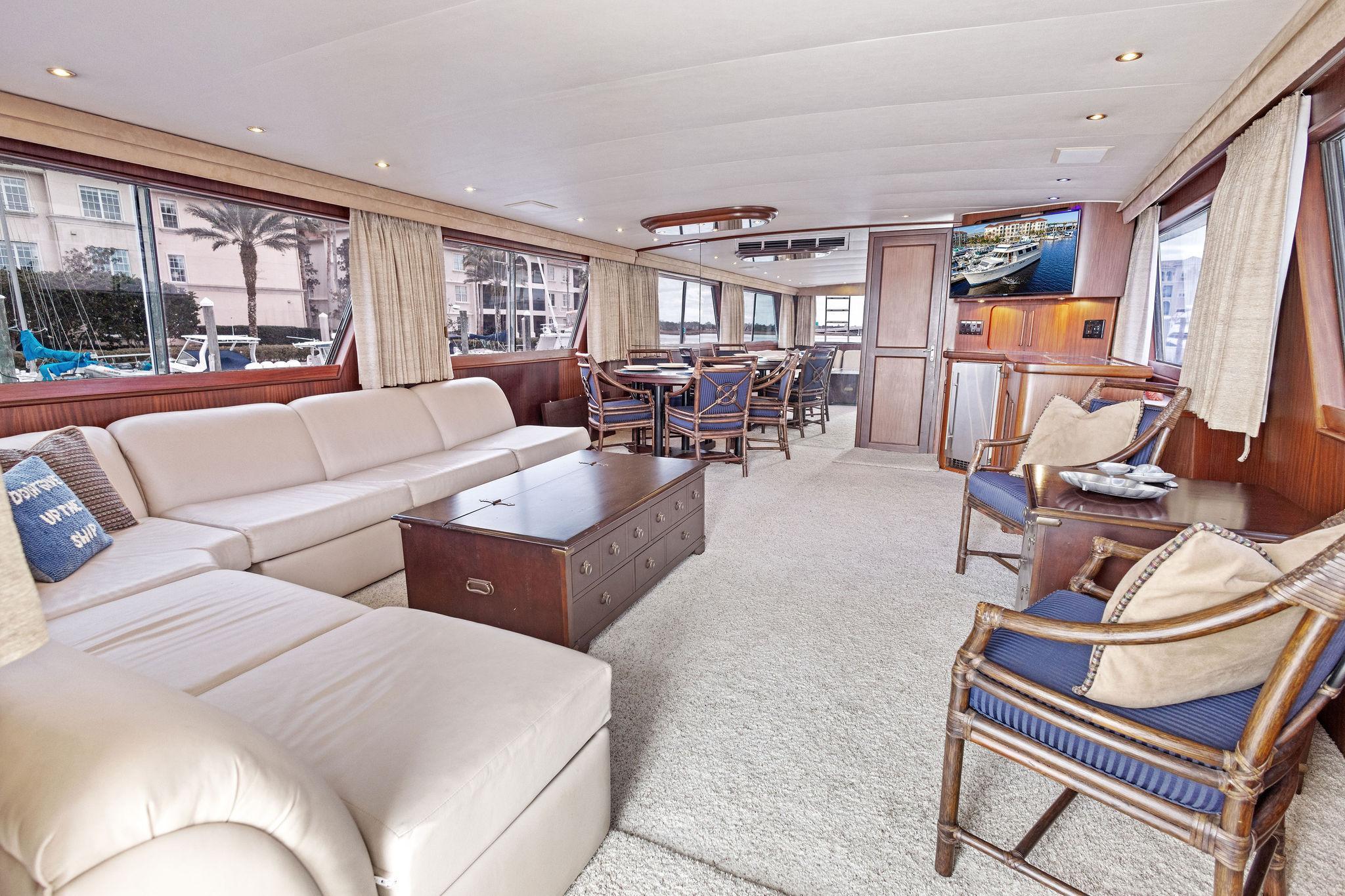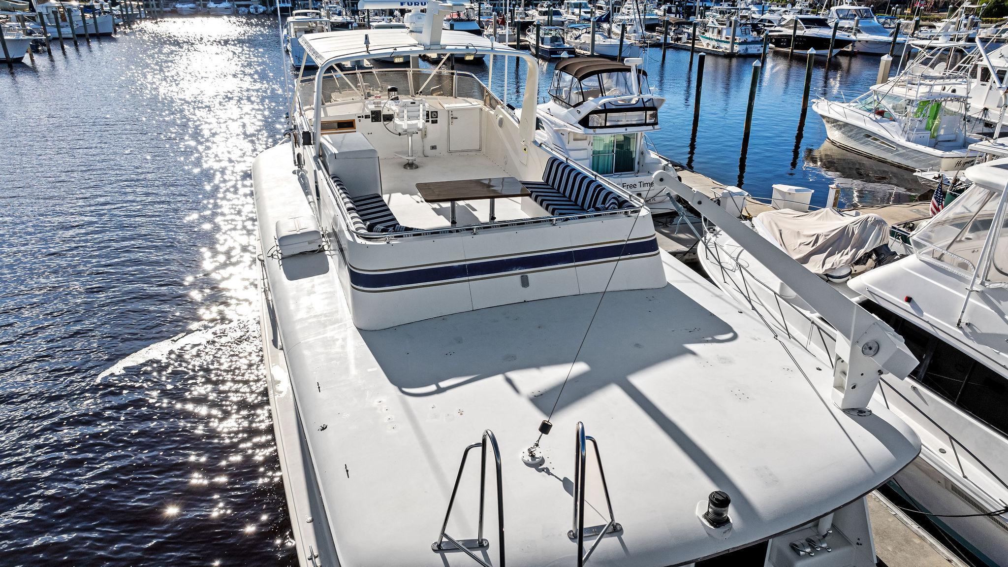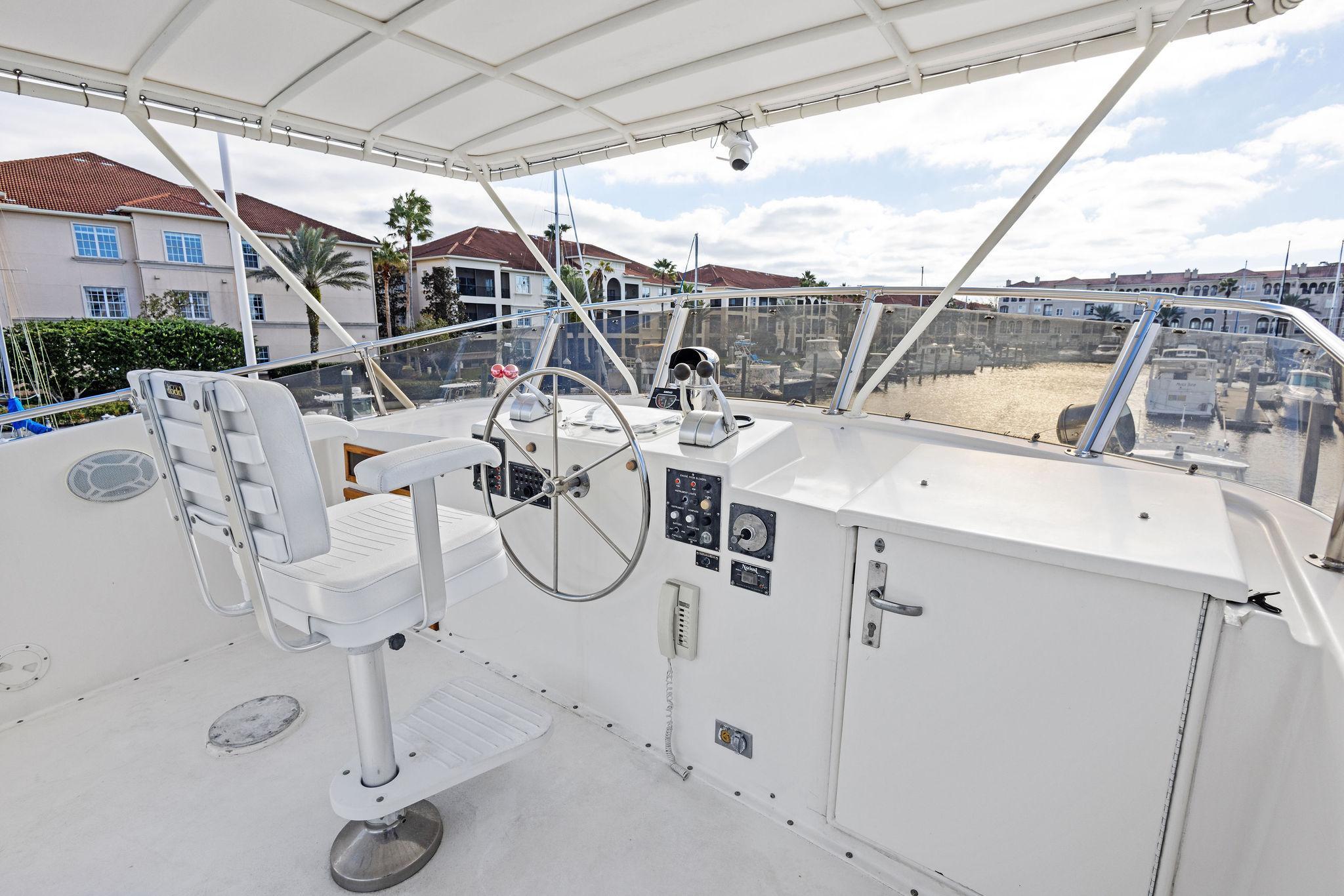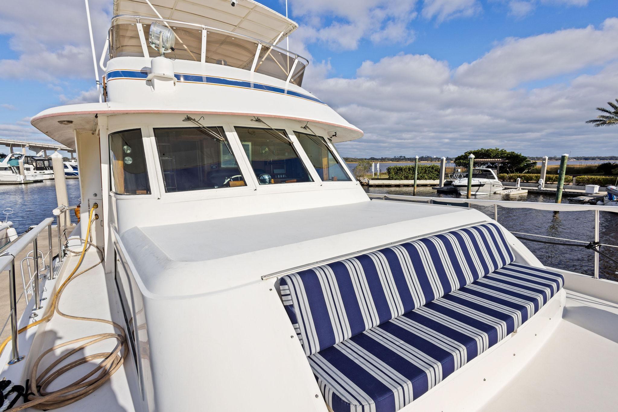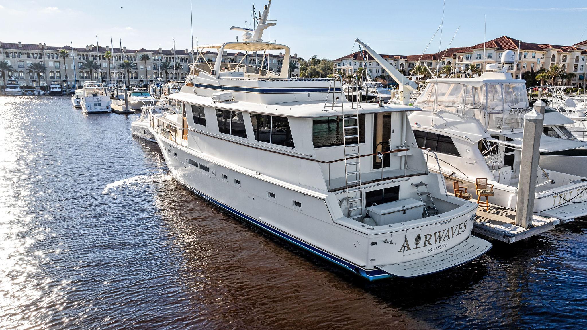 AIRWAVES is one of seven 68 Hatteras cockpit motor yachts whose owners have continually maintained her in an exceptional condition with many upgrades over the years. The vessel has extensively cruised the East Coast and is now in Jacksonville, Florida. The hull is solid fiberglass with a wide beam and deep keel. She features a four stateroom layout each with it’s own head, the galley is on the main deck, a large master stateroom, separate engine rooms and a large spacious salon and dining area. The large flybridge has generous cushioned seating. Her cockpit allows for easy boarding of the vessel, has aft engine controls and custom ladder to flybridge boat deck. She was reportedly painted in 2012 and was hauled in October, 2024 for a complete bottom job and new cutlass bearings. Main engines have 3700 hours since engine blocks were replaced.AccommodationsThe large salon features an L-shaped sofa aft to port, a built in bar area forward to starboard with icemaker and VIZIO 40” flat screen TV above. Dining area is opposite to port. Forward is the galley area with Amtico flooring that extends to the wheelhouse, recent appliances with dinette table to starboard. Further forward is the pilothouse with a bench helm seat, wing doors and a ladder to the flybridge.Descending from the pilothouse are the living quarters. Below the cabin sole prior to entering the staterooms is a very unique double size hinged access to the genset room. The bow stateroom has upper and lower bunk berths to starboard with ensuite head and stall shower opposite. Aft to port is the second stateroom with crossover berths and a head with handheld shower. Further aft and down a few steps is the third stateroom to port with twin berths. Opposite to port is a head with stall shower. Moving aft between the twin engine rooms is the very spacious main stateroom, the size which you don’t normally find on a 68 foot vessel. A large king-size berth centerline aft with a unique dressing area forward to port and ensuite head with tub and shower to starboard.Up from the pilothouse is the very spacious U-shaped seating, bar area to port and helm forward. On the aft end of the hardtop is a davit for lifting a dingy. Galley Ninja air fryer Double SS sink with garbage disposal Kenmore dishwasher Frigidaire Professional microwave GE Profile 4 burner cooktop Kenmore Elite double door refrigerator/freezer Whirlpool trash compactor (under stairs) Comfort & Entertainment Three Vizio flat screen TVs in staterooms and Salon Sony video and disc player in master stateroom Bosch washer and dryer Electric 120/240V AC 12 VDC 20 KW Northern Lights genset in sound shield w/303 hours 20 KW Northern Lights genset w/304 hours Two shore power cords Electronics and Navigation Lower helm: Northstar 800 Loran Northstar 951X GPS Icom VHF Datamarine depth indicator Simrad AP20 auto-pilot Garmin 7610 GPS map 6’ compass in binnacle Upper helm: Datamarine depth indicator Simrad R135 rudder angle indicator 6” Danforth compass in binnacle Deck: Varnished teak side rails w/covers Foredeck seating cushion w/cover 2 Foredeck fiberglass dunnage boxes Galley Maid windlass w/wildcat, 300’ chain, plow anchor in SS shute w/deck controls Davit for dinghy Swim platform Transom door Custom ladder from cockpit to boat deck Cockpit fiberglass storage box Five rod holders in cockpit coaming Marquip boarding ladder Mechanical Cruisair reverse cycle AC with new style digital controls and seven recently installed new compressors Naiad stabilizers Aft clutches and throttles Hot water heater Plumbed for water maker All heads replumbed for fresh water Comments:With her many upgrades and recent bottom job, AIRWAVES is ready to go boating now. Owner is motivated to sell.