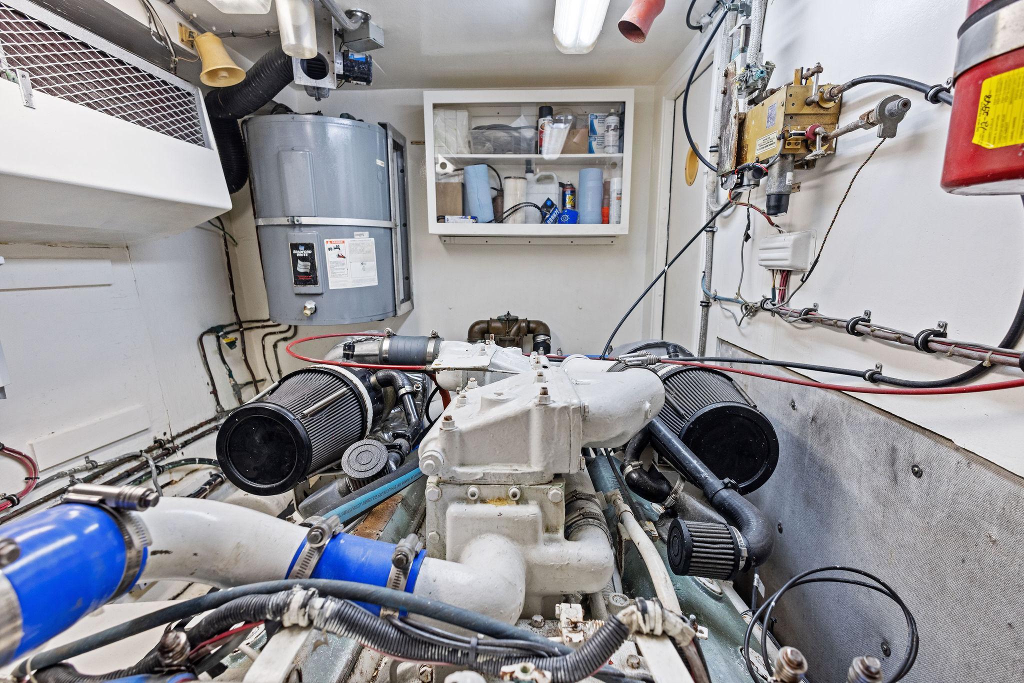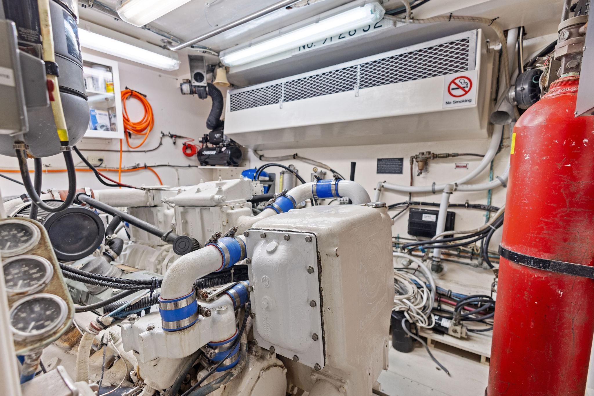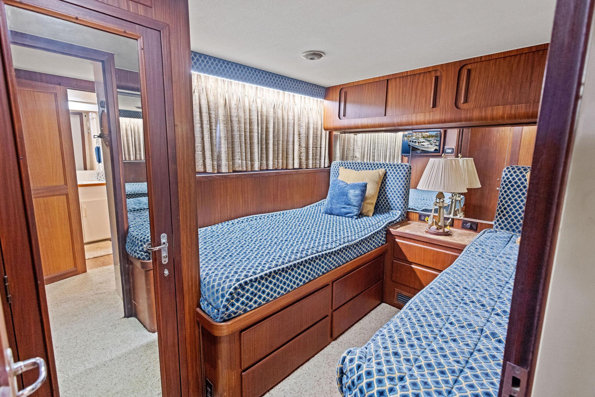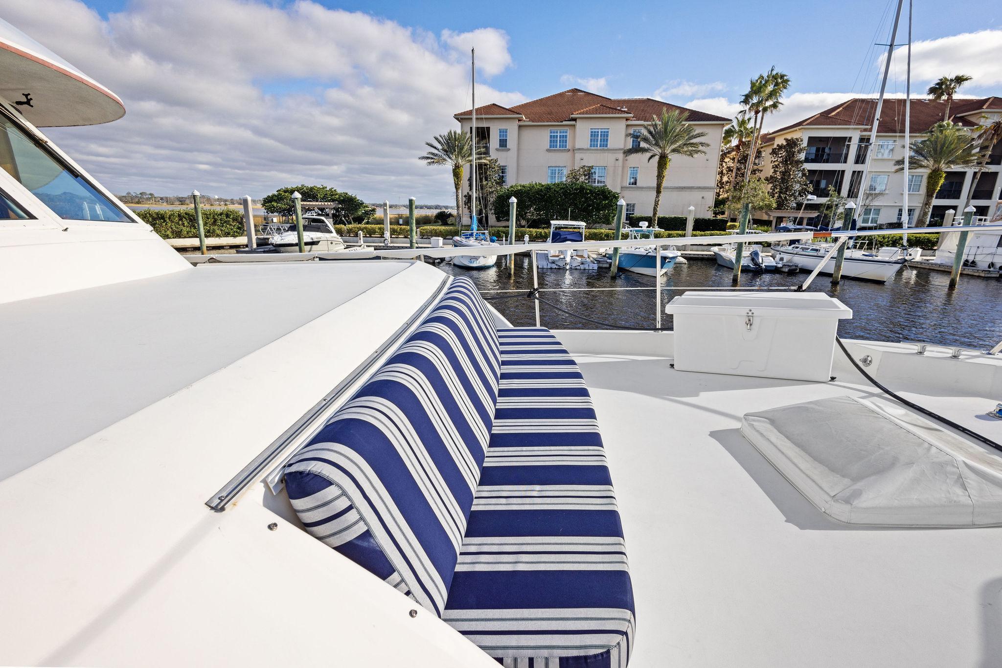 AIRWAVES is one of seven 68 Hatteras cockpit motor yachts whose owners have continually maintained her in an exceptional condition with many upgrades over the years. The vessel has extensively cruised the East Coast and is now in Jacksonville, Florida. The hull is solid fiberglass with a wide beam and deep keel. She features a four stateroom layout each with it’s own head, the galley is on the main deck, a large master stateroom, separate engine rooms and a large spacious salon and dining area. The large flybridge has generous cushioned seating. Her cockpit allows for easy boarding of the vessel, has aft engine controls and custom ladder to flybridge boat deck. She was reportedly painted in 2012 and was hauled in October, 2024 for a complete bottom job and new cutlass bearings. Main engines have 3700 hours since engine blocks were replaced.AccommodationsThe large salon features an L-shaped sofa aft to port, a built in bar area forward to starboard with icemaker and VIZIO 40” flat screen TV above. Dining area is opposite to port. Forward is the galley area with Amtico flooring that extends to the wheelhouse, recent appliances with dinette table to starboard. Further forward is the pilothouse with a bench helm seat, wing doors and a ladder to the flybridge.Descending from the pilothouse are the living quarters. Below the cabin sole prior to entering the staterooms is a very unique double size hinged access to the genset room. The bow stateroom has upper and lower bunk berths to starboard with ensuite head and stall shower opposite. Aft to port is the second stateroom with crossover berths and a head with handheld shower. Further aft and down a few steps is the third stateroom to port with twin berths. Opposite to port is a head with stall shower. Moving aft between the twin engine rooms is the very spacious main stateroom, the size which you don’t normally find on a 68 foot vessel. A large king-size berth centerline aft with a unique dressing area forward to port and ensuite head with tub and shower to starboard.Up from the pilothouse is the very spacious U-shaped seating, bar area to port and helm forward. On the aft end of the hardtop is a davit for lifting a dingy. Galley Ninja air fryer Double SS sink with garbage disposal Kenmore dishwasher Frigidaire Professional microwave GE Profile 4 burner cooktop Kenmore Elite double door refrigerator/freezer Whirlpool trash compactor (under stairs) Comfort & Entertainment Three Vizio flat screen TVs in staterooms and Salon Sony video and disc player in master stateroom Bosch washer and dryer Electric 120/240V AC 12 VDC 20 KW Northern Lights genset in sound shield w/303 hours 20 KW Northern Lights genset w/304 hours Two shore power cords Electronics and Navigation Lower helm: Northstar 800 Loran Northstar 951X GPS Icom VHF Datamarine depth indicator Simrad AP20 auto-pilot Garmin 7610 GPS map 6’ compass in binnacle Upper helm: Datamarine depth indicator Simrad R135 rudder angle indicator 6” Danforth compass in binnacle Deck: Varnished teak side rails w/covers Foredeck seating cushion w/cover 2 Foredeck fiberglass dunnage boxes Galley Maid windlass w/wildcat, 300’ chain, plow anchor in SS shute w/deck controls Davit for dinghy Swim platform Transom door Custom ladder from cockpit to boat deck Cockpit fiberglass storage box Five rod holders in cockpit coaming Marquip boarding ladder Mechanical Cruisair reverse cycle AC with new style digital controls and seven recently installed new compressors Naiad stabilizers Aft clutches and throttles Hot water heater Plumbed for water maker All heads replumbed for fresh water Comments:With her many upgrades and recent bottom job, AIRWAVES is ready to go boating now. Owner is motivated to sell.