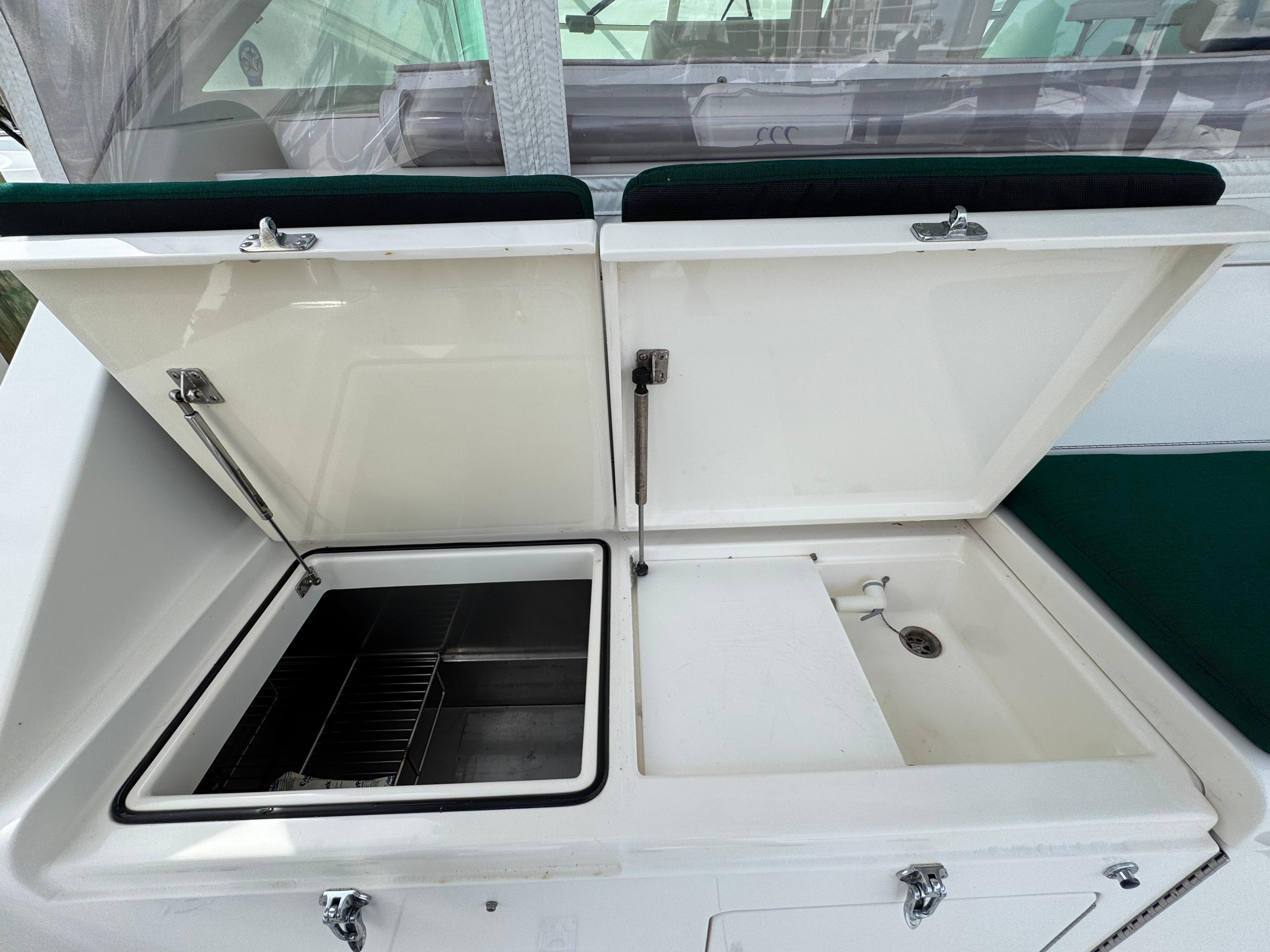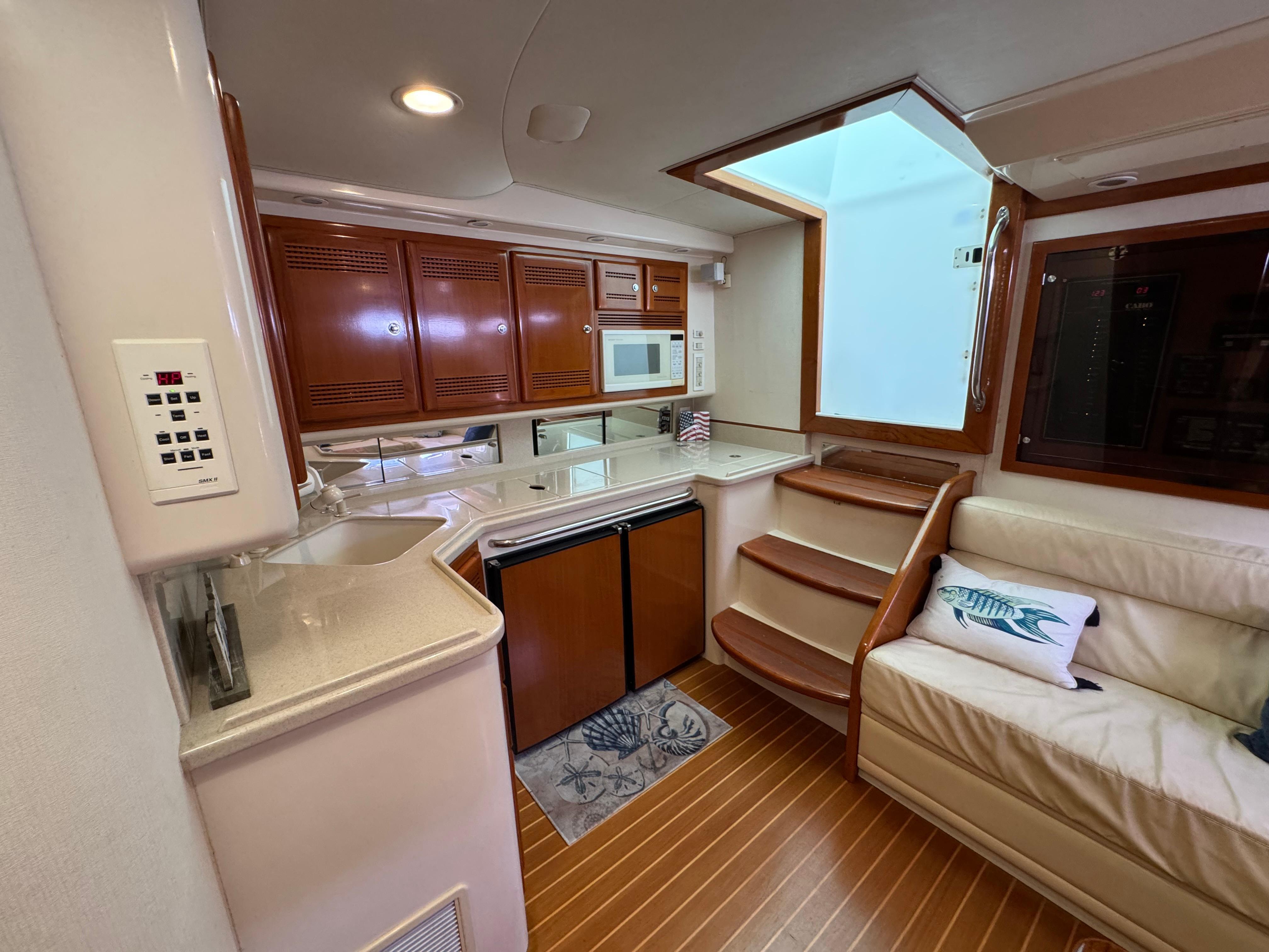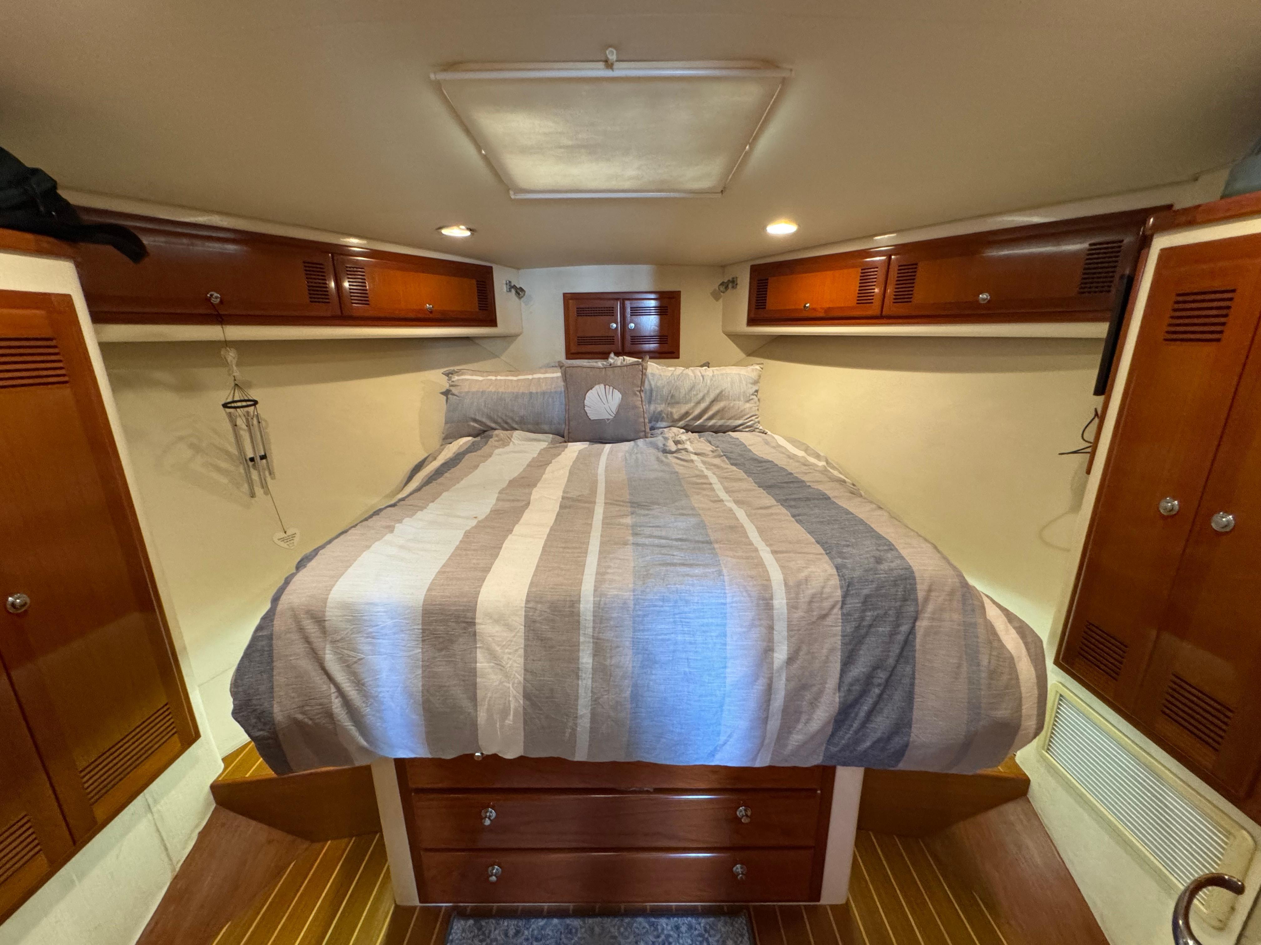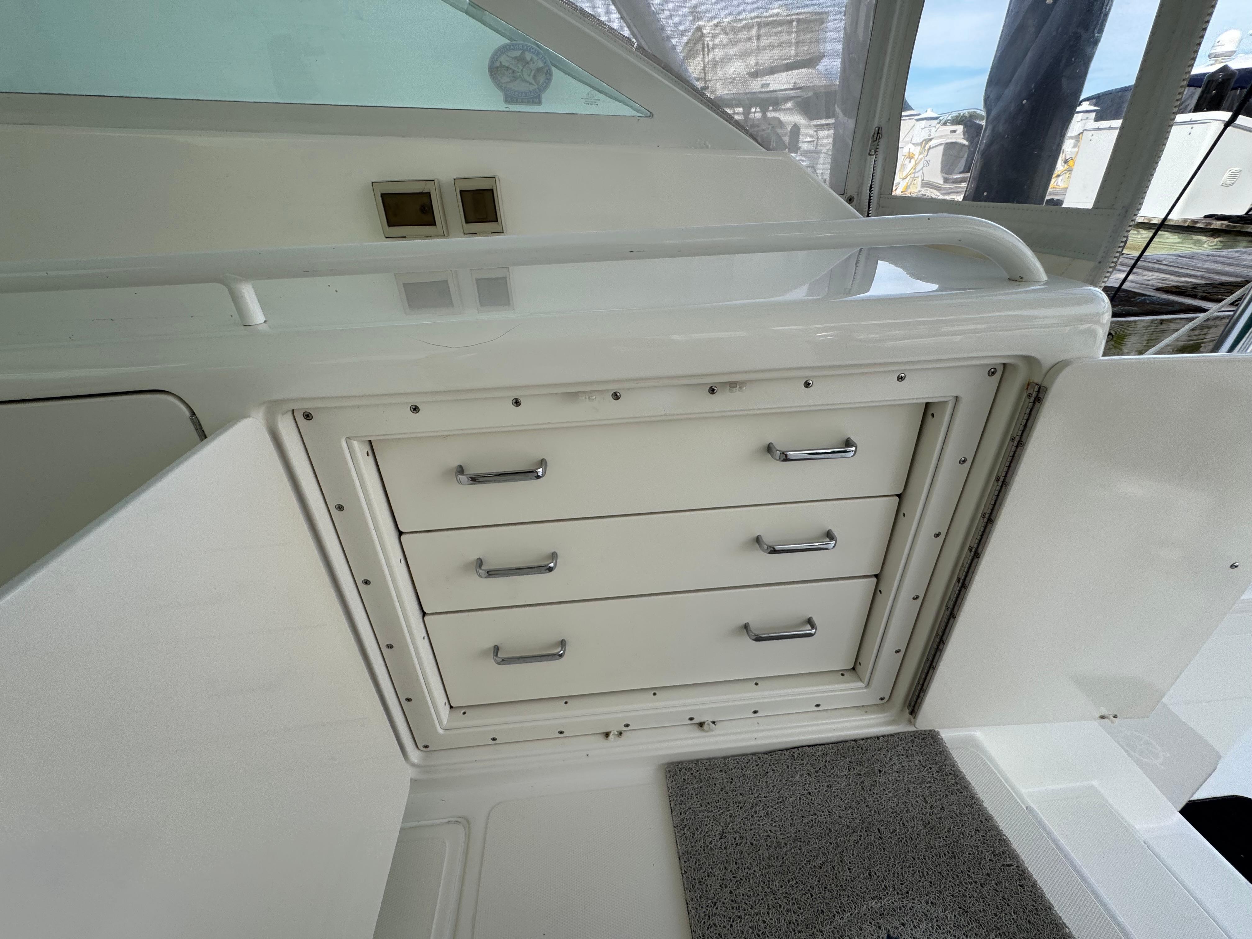 Elected Boating Magazine's 1997 Boat of the Year, the Cabo 45 Express Sportfisher is the epitome of what it is to be Cabo: quality, performance, attention to detail, and dedication to customer satisfaction. Designer and builder Henry Mohrschladt summed up the concept behind the Cabo 45 Express: "More amenities, more room for bait, fish, live bait and rod storage, but with the quality of our smaller boats. That is what our customers told us they wanted." The Cabo 45 Express was introduced to meet the needs of Cabo owners wanting a larger replacement for their smaller Cabos. Because of its added size and its luxurious accommodations, it would be easy to forget that the Cabo 45 Express is a serious sportfisher. The 45 turns on a dime, backs down like no other and even in the roughest of seas, stays right where she's put. And, because of her wide beam, modified-V bottom, and low center of gravity, the Cabo is a fishing platform with stability in all sea conditions. From the fiberglassed and bronze through-bolted hull-to-deck joint to the custom all-fiberglass fuel tanks, the Cabo is designed to easily outlast even the harshest of conditions and cruise away unscathed. The performance of the Cabo 45 Express Sportfisher at sea is smooth and predictable. And with a maximum cruising range of well over 300 statute miles, top speed of 36.6 mph and a cruising speed of nearly 30 mph, it's clear that size has not compromised performance. This seaworthiness is outshined only by this boat's close quarter handling. Superb visibility astern and Cabo's specially designed Mather's electric throttle controls ensure that maneuvering the 45 Express into its slip is effortless. The hull of the Cabo 45 Express Sportfisher is built with the same uncompromising combinations of materials that have won its smaller siblings critical acclaim over the years. Superior ISO - NPG gelcoat and premium vinylester resins throughout reinforce the Cabo trademark philosophy of placing quality above all other considerations. A solid fiberglass bottom consisting of biaxial stitched fiberglass roving assures a solid and secure hull. From the waterline to the rails, the Cabo incorporates Baltek end-grain balsa coring for strength without performance-hindering weight. And to augment the hull's external integrity, Cabo Yachts employs a unique structural module that eliminates tensional flex and makes the entire hull and interior one solid piece that will build confidence even in severe conditions. In the interior of the Cabo 45 Express Sportfisher, the matched woods and blemish-free finishes gleam in the custom designed halogen lighting. Standard leather upholstery and a six-speaker sound system from Bose take the Cabo 45 Express well beyond the spartan fishing machine category. A fore and aft queen-size berth in the forward cabin allows plenty of room on each side to make up the berth as well as to access the signature Cabo rod storage cabinetry. The galley and full head with shower feature Corian countertops with custom sea rails and Moen fixtures. Children or extra guests will appreciate the comfortable extra large settee on the salon's portside. There is even a built-in vacuum system.