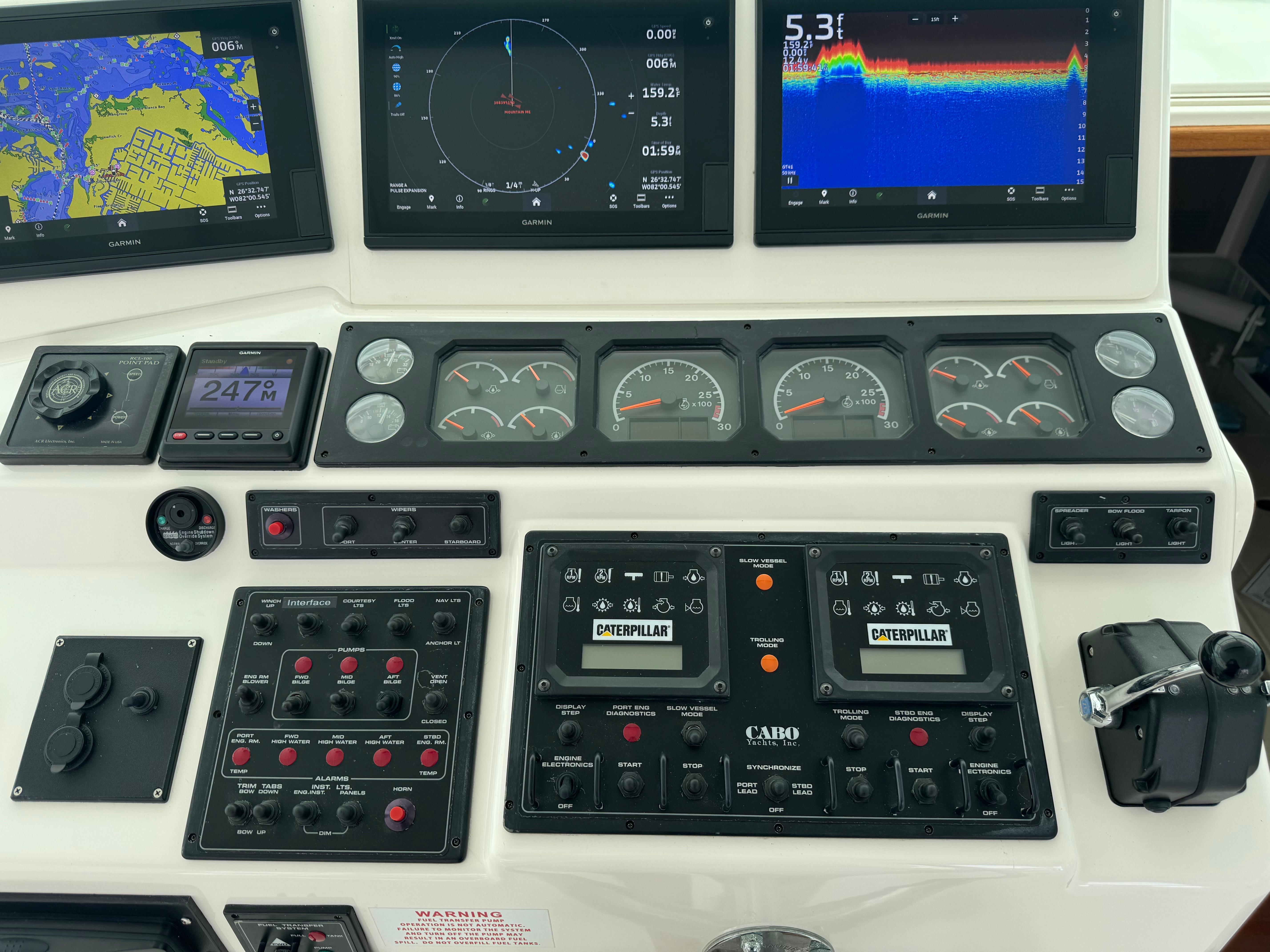 Price Improvement!You will hard pressed to find a nicer Cabo 45 Open! This legendary fishing machine is powered by Caterpillar 3406 800HP diesels! Features include newer canvas and Garmin electronics suite! Three full stations starting with the lower station featuring triple 12” Garmin MFD's, A/C and expansive wraparound seating. True bridge with full controls, twin Garmin 12" MFD's and lounge seating forward of the console. Full control station on upper tuna tower as well as fourth set of cockpit controls. This beauty has been continually maintained/updated and she must be seen to be appreciated. All services up to date and she has just been detailed. Slip at Cape Harbour is assumable. Two Garmin 7612 XSV MFD'sThree Garmin 1242 XSV Touch MFD'sGarmin GMR424 HD Open Array RadarGarmin GHC 20 Autopilot with controls at all stations