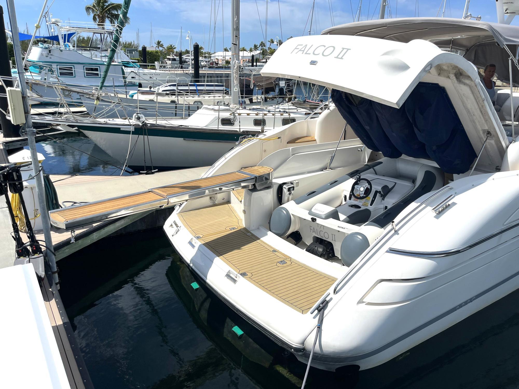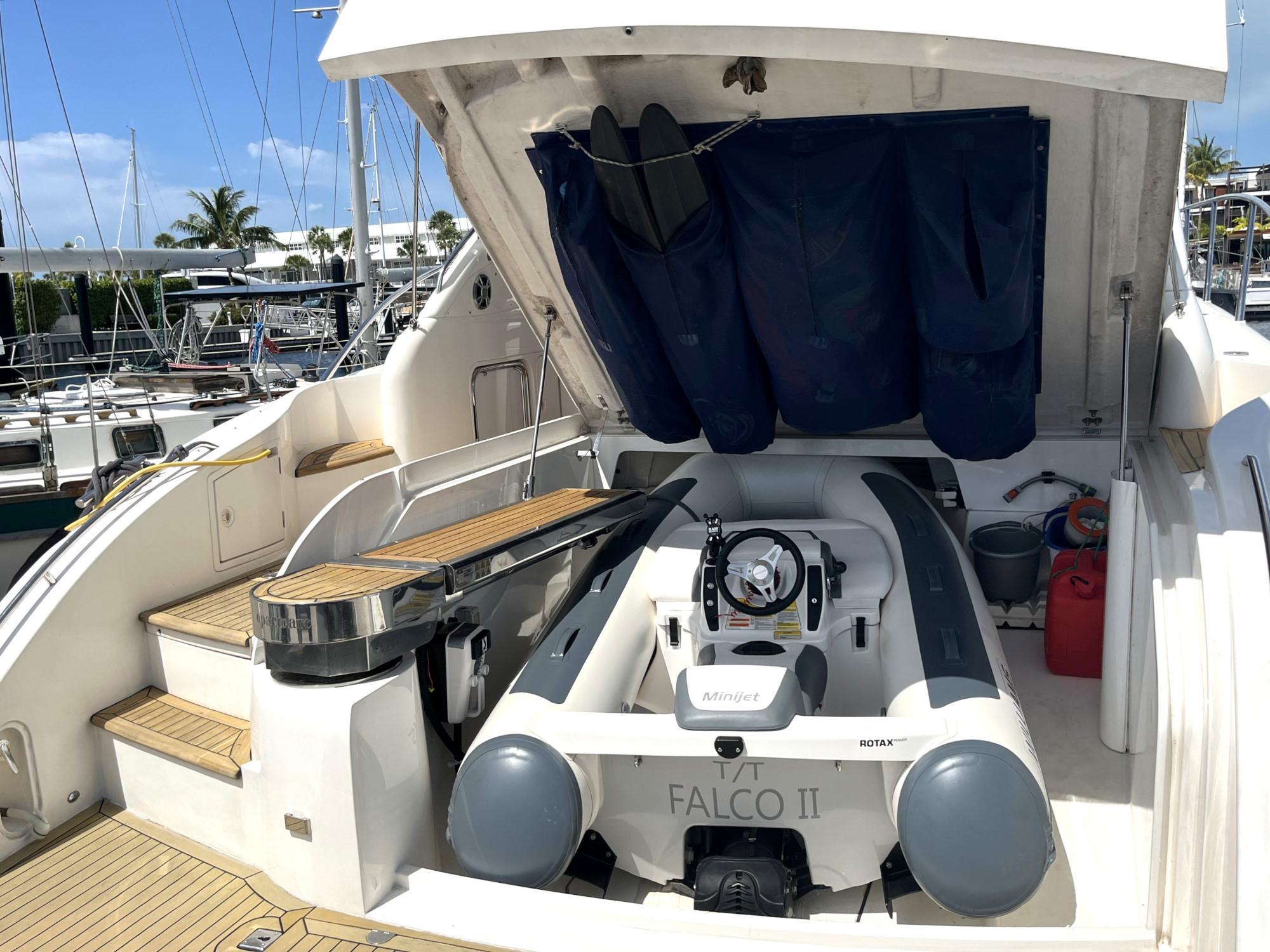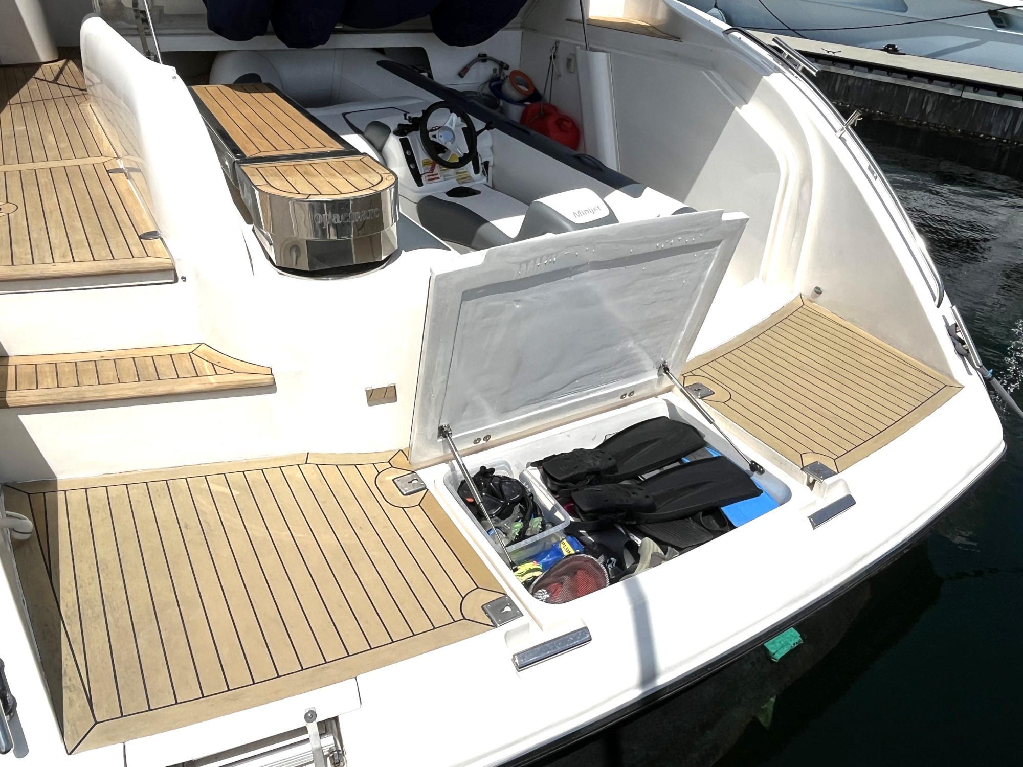 * Dinghy stowage garage beneath sunbed, with hydraulic lift system