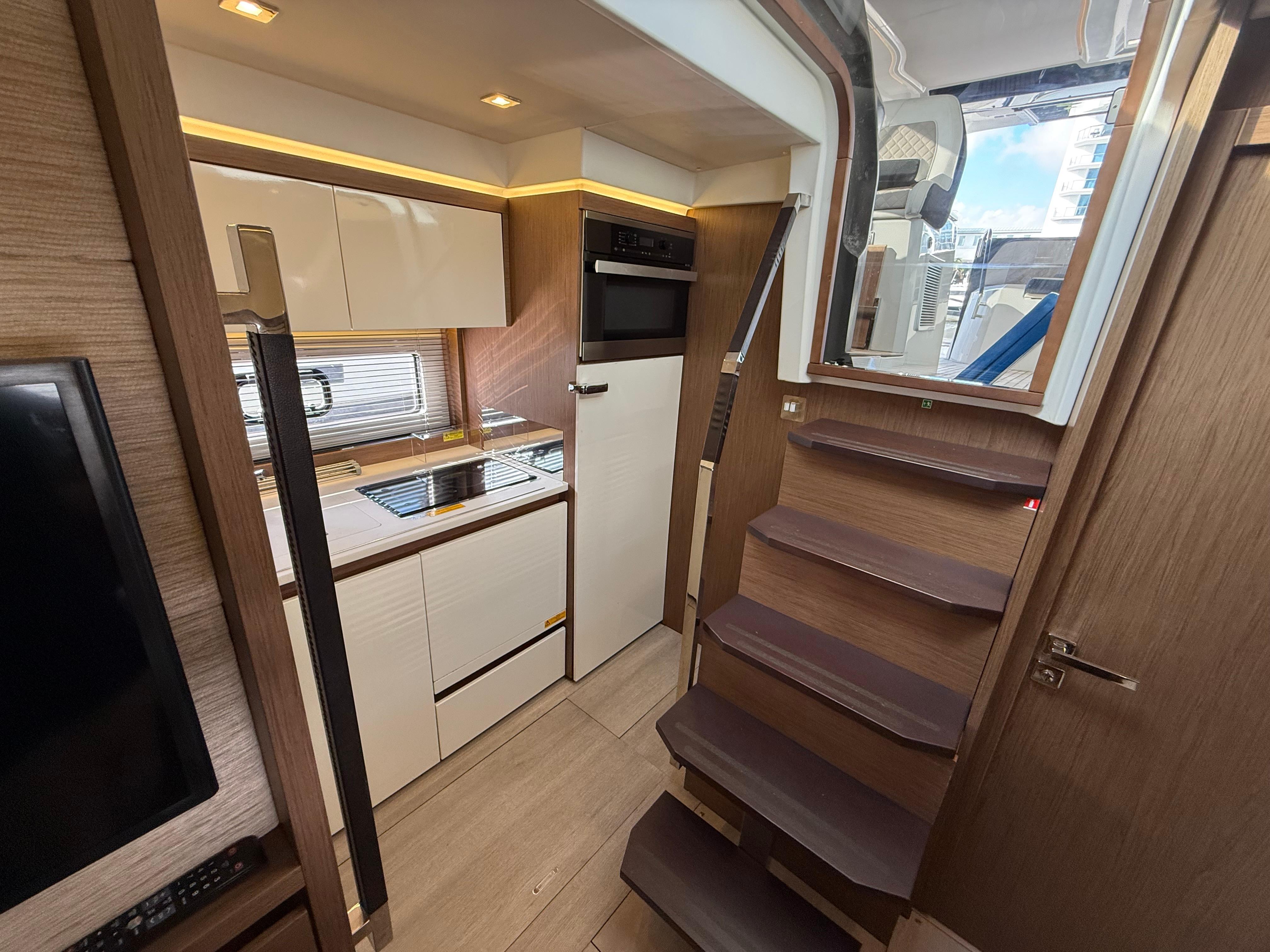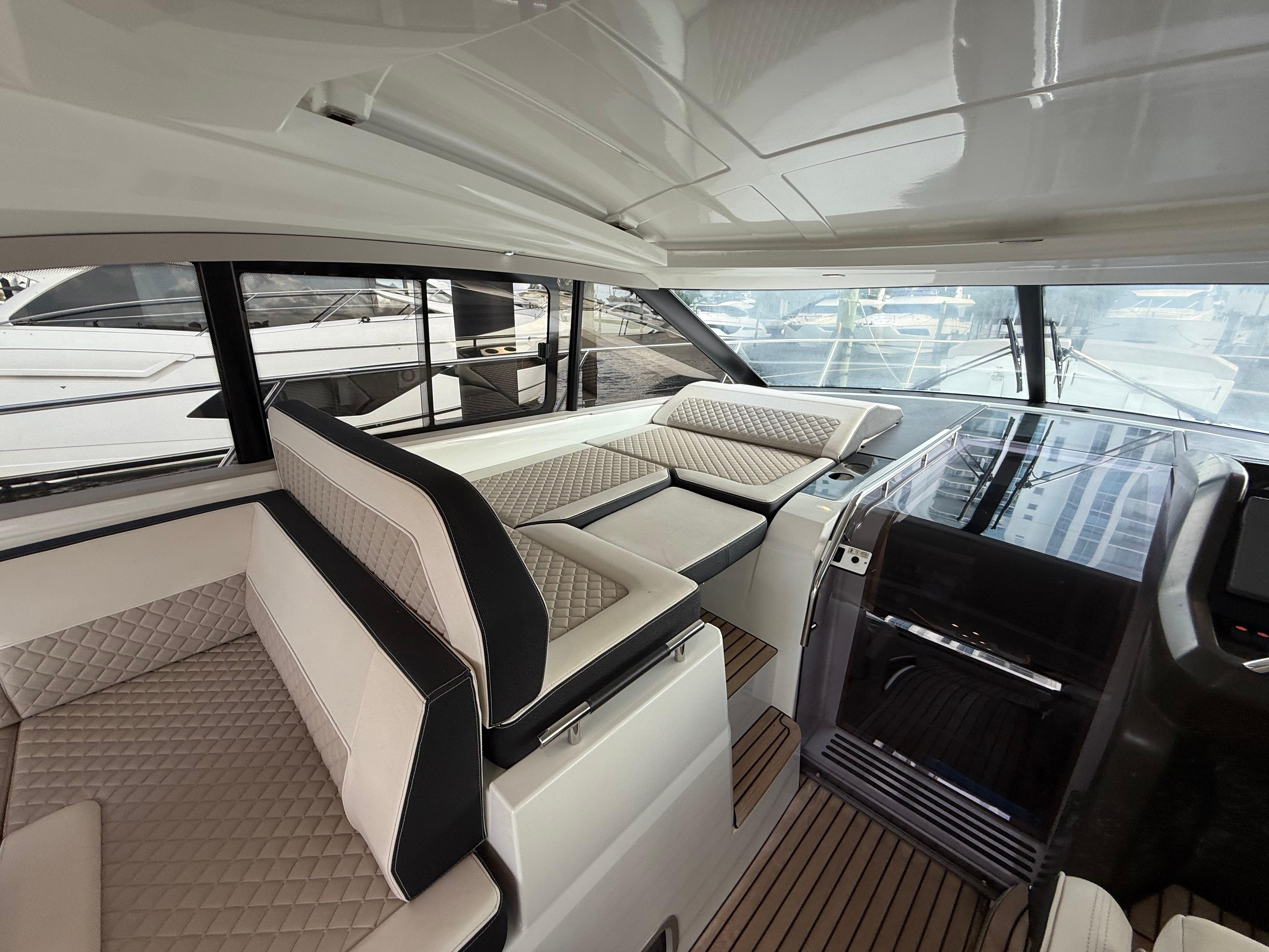 Enjoy thisspacious sport top, laid out entirely on one level, with its large U-shaped saloonto port side, amodular bench seat at the helm that converts into a shelteredsundeck, and a very attractive cockpit galley.