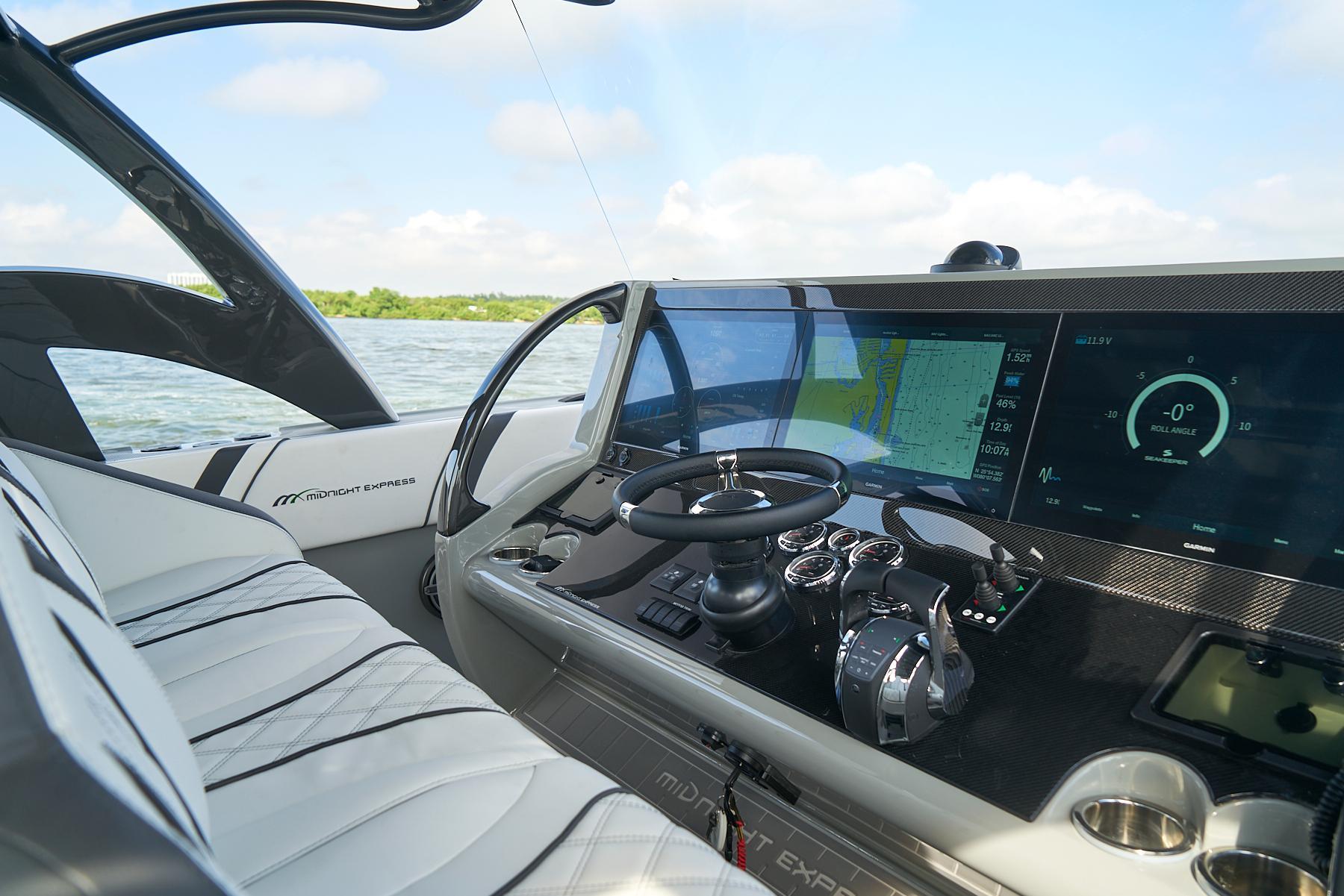 GHOST is the perfect fusion of speed, luxury, and cutting-edge design, setting a new standard for modern center consoles. Built for performance and style, this stunning vessel features a spacious, thoughtfully designed-layout. The aft area boasts a custom lounging space in place of live wells, complemented by the signature wide T-top for ample shade. The open cockpit offers plenty of room for relaxation, while the versatile seating includes an aft U-lounge with storage, a forward fiberglass U-seat with an electric table that transforms into a sunpad, and an upgraded helm with an adjustable electric front seat.