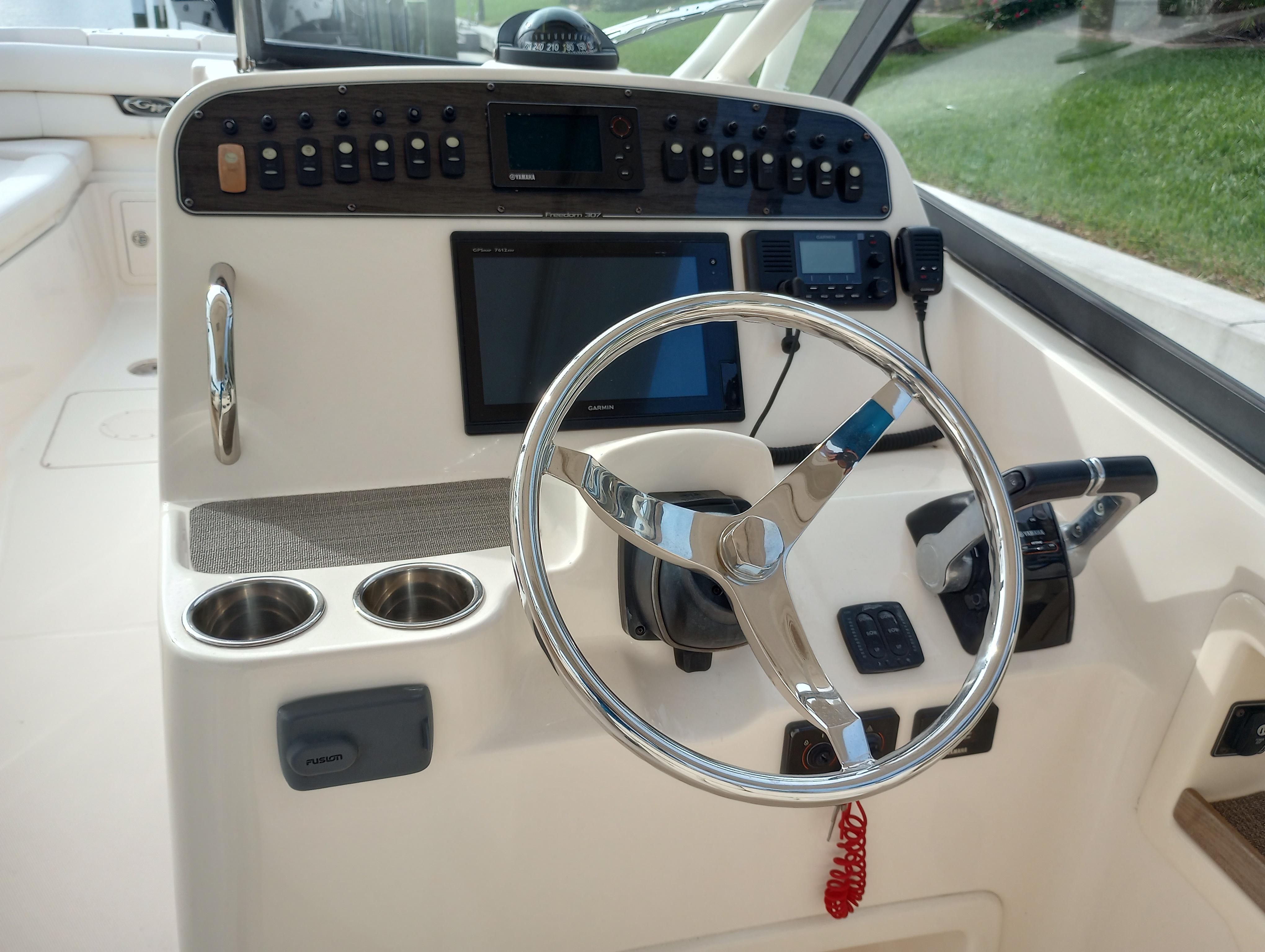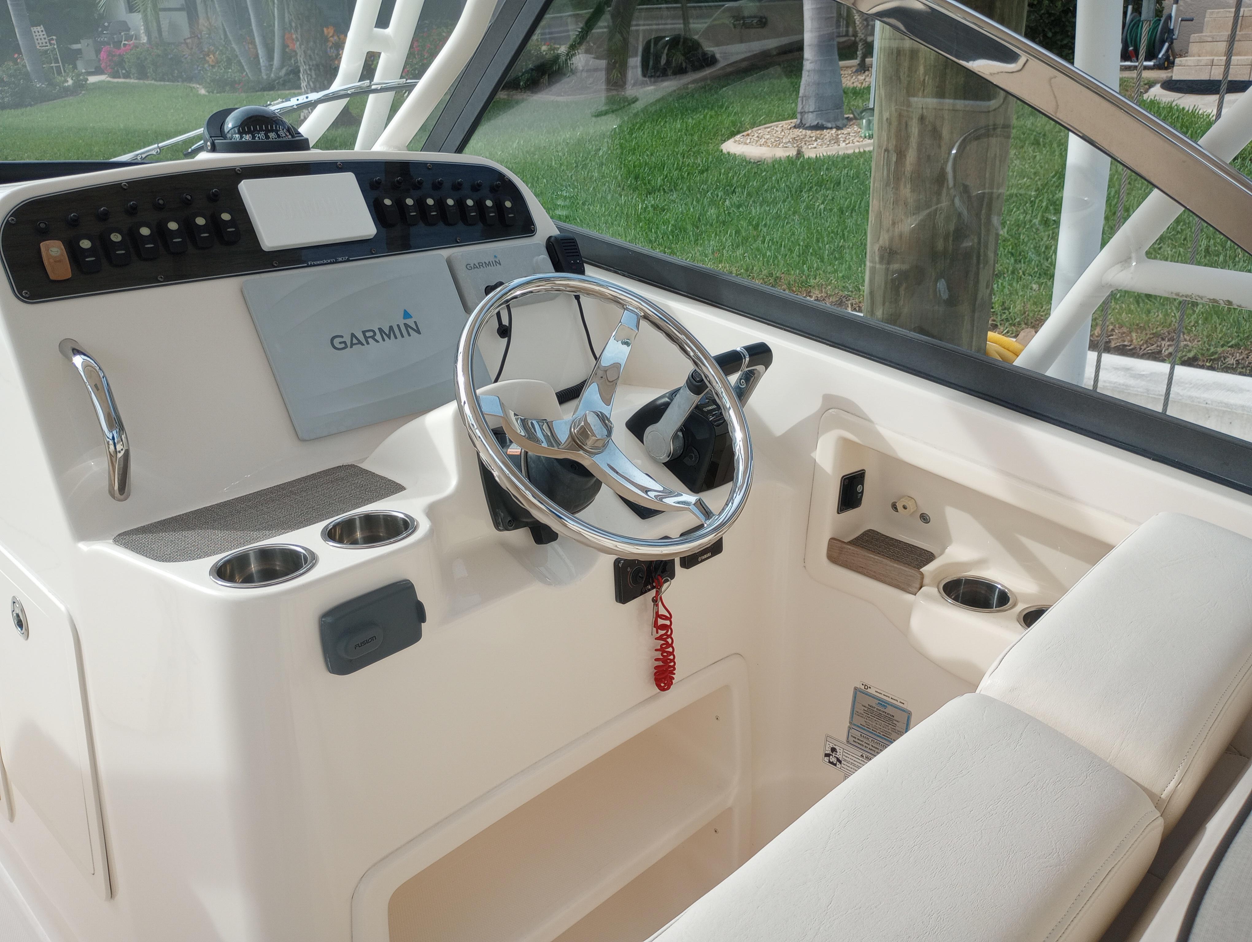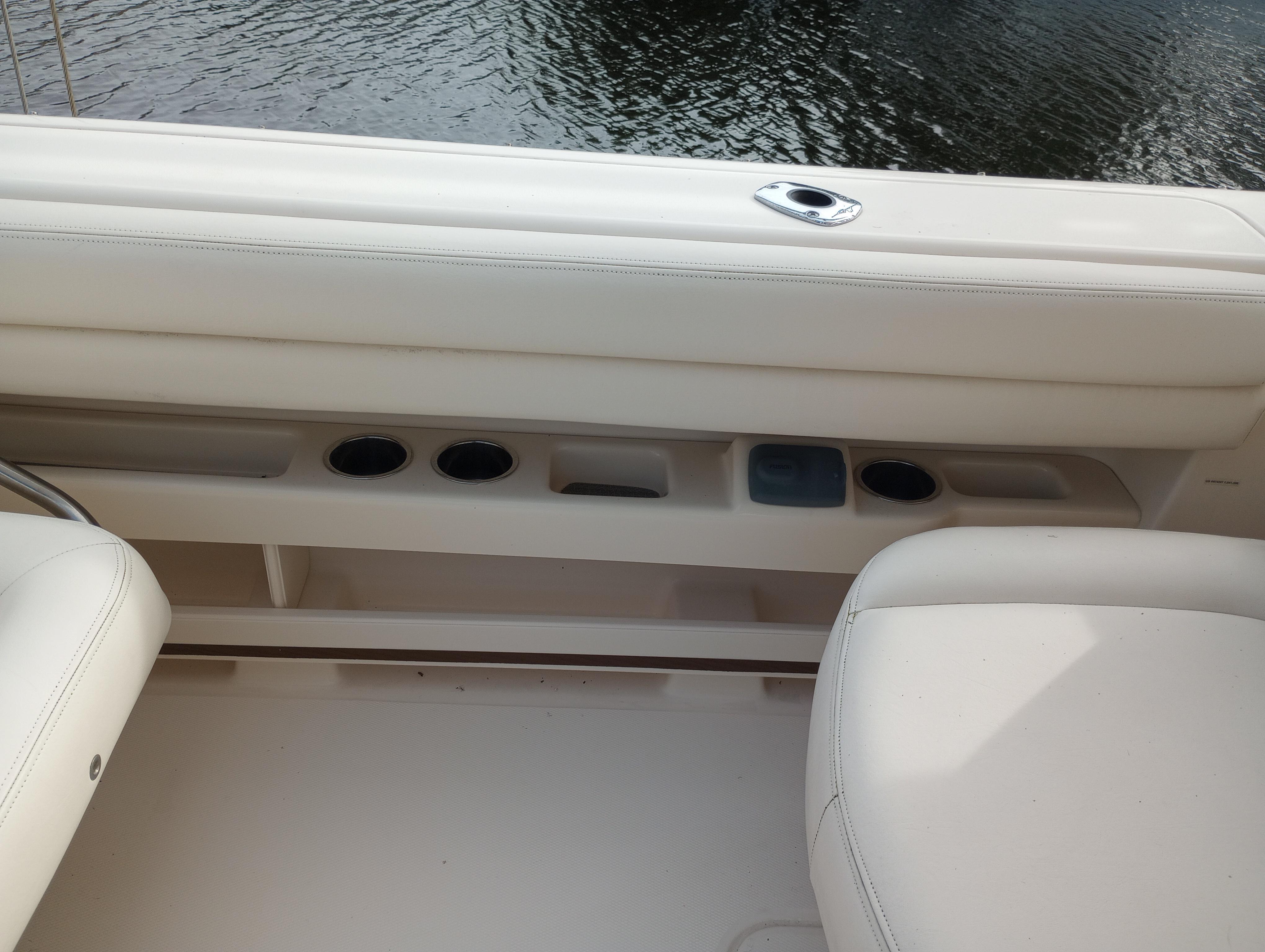 - Wet bar w/sink, storage drawers, trash bin, drink holders (2) & fire extinguisher holder (integrated with electronically adjustable helm seat)