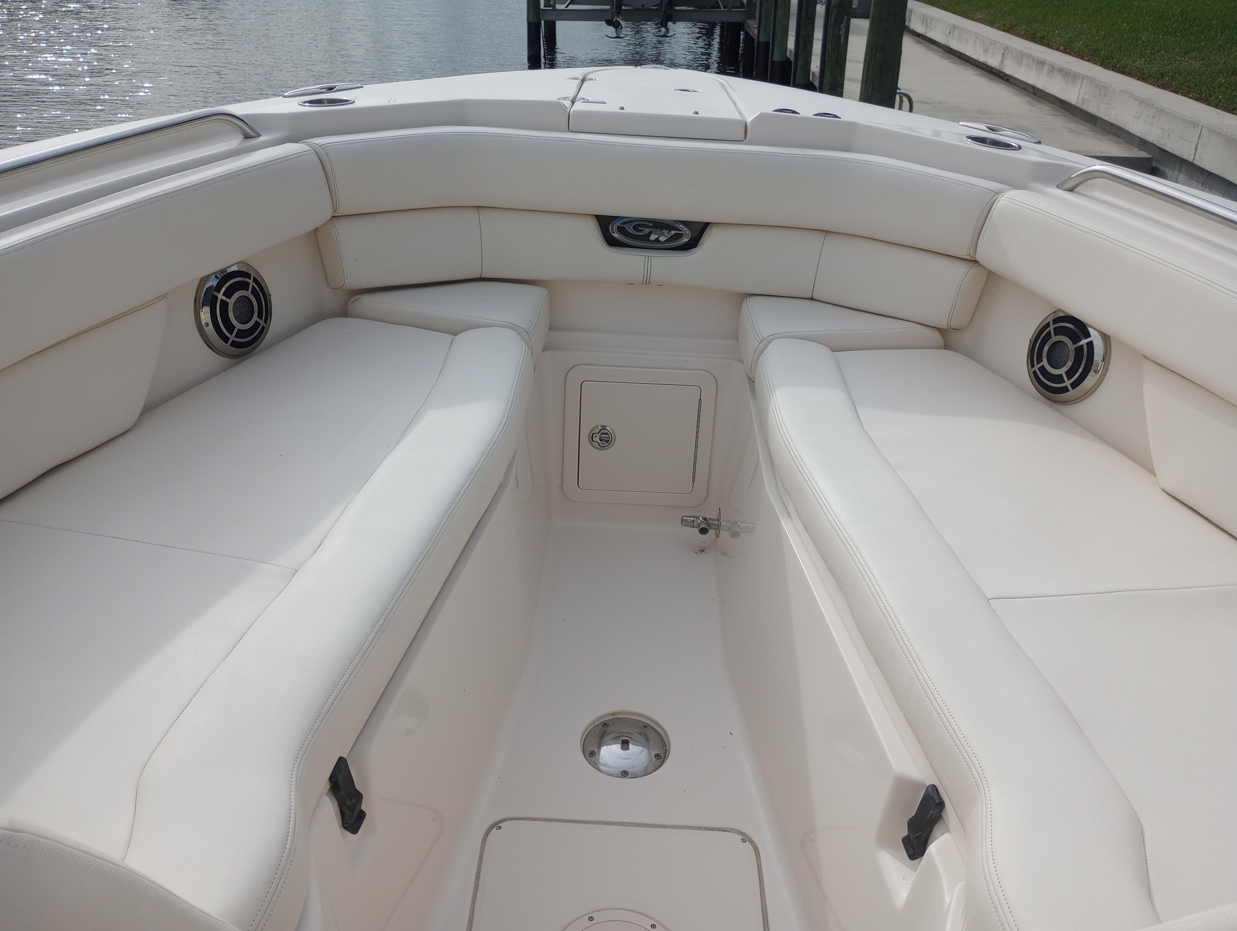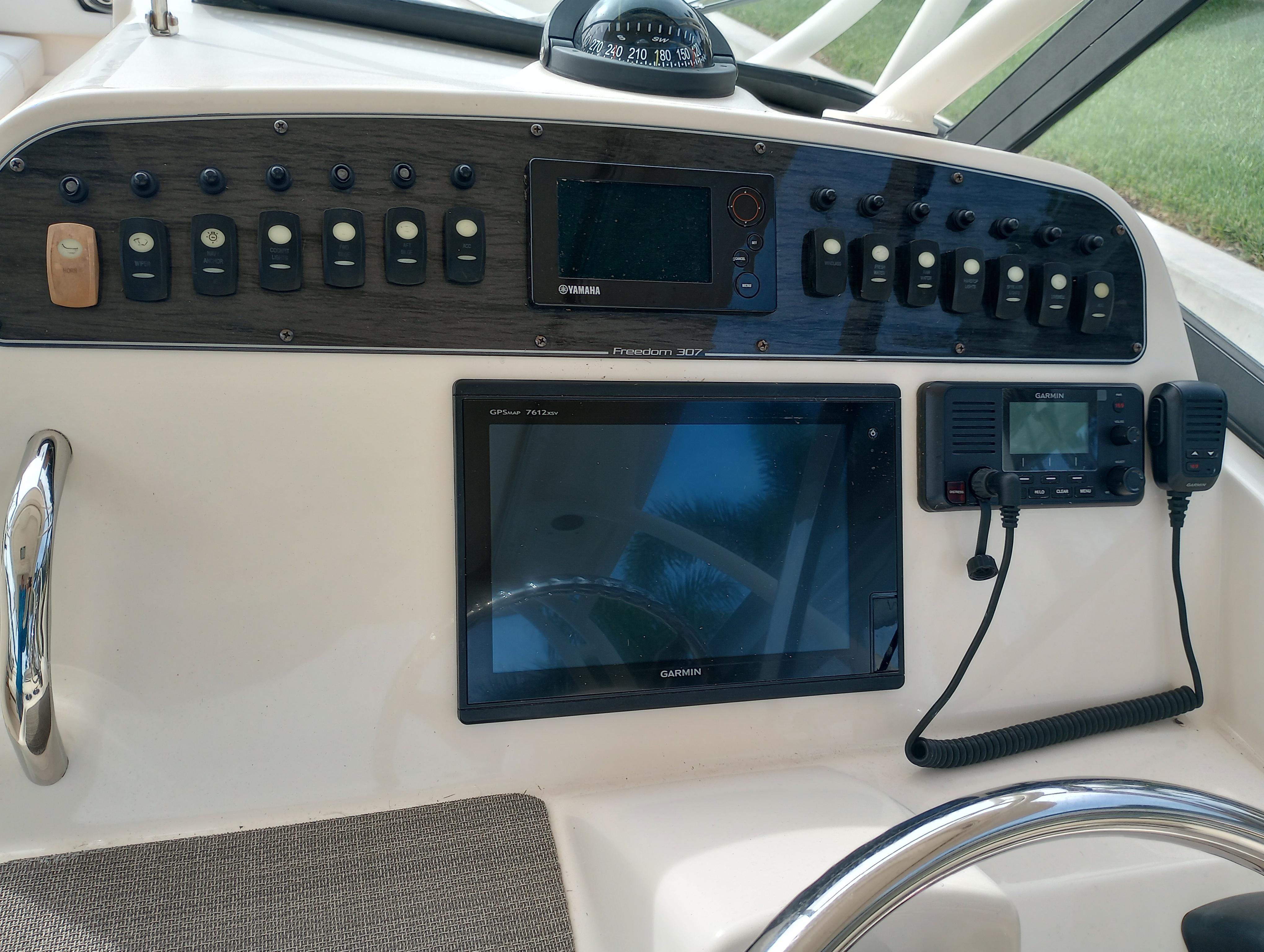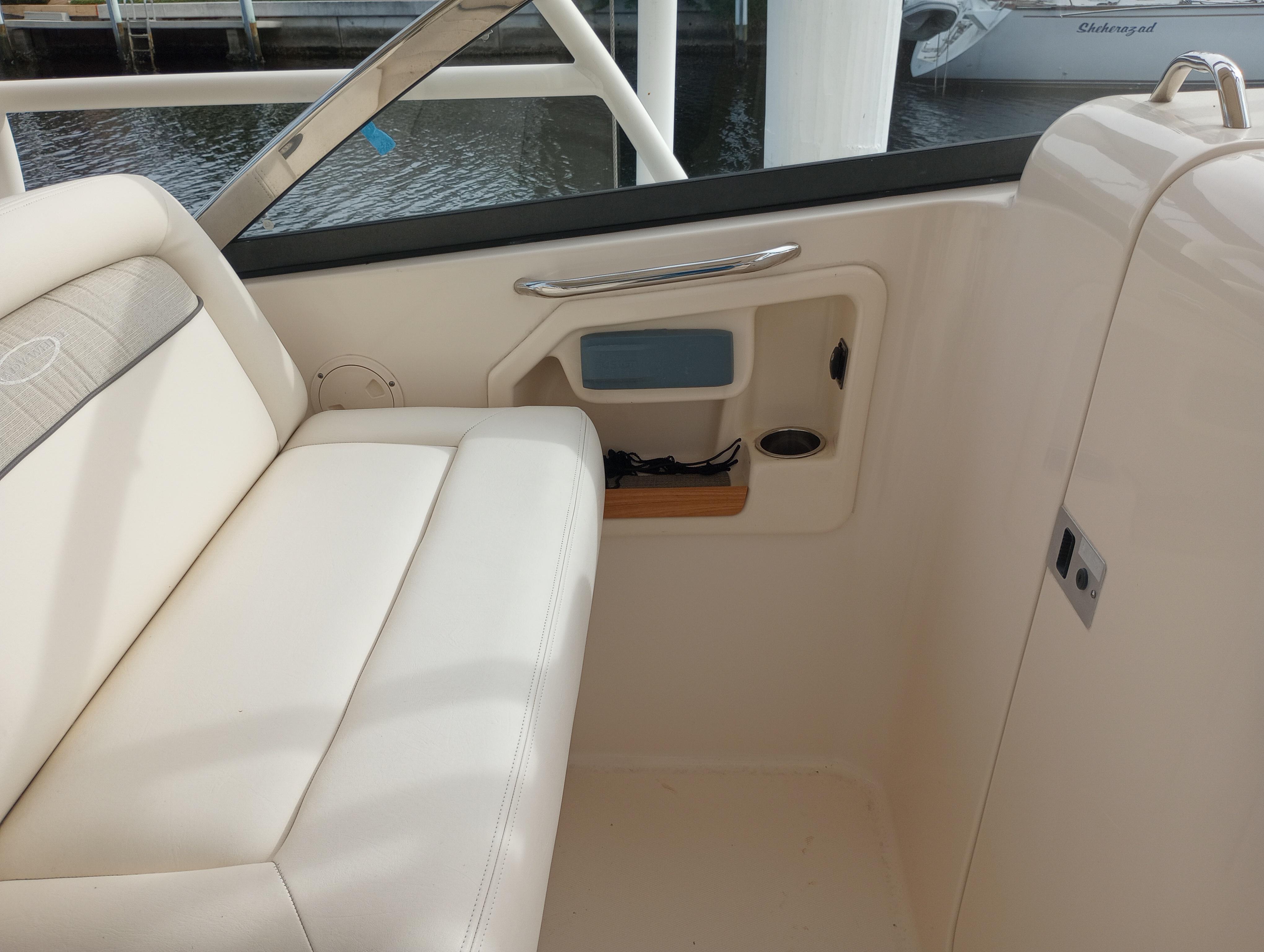 - Wet bar w/sink, storage drawers, trash bin, drink holders (2) & fire extinguisher holder (integrated with electronically adjustable helm seat)